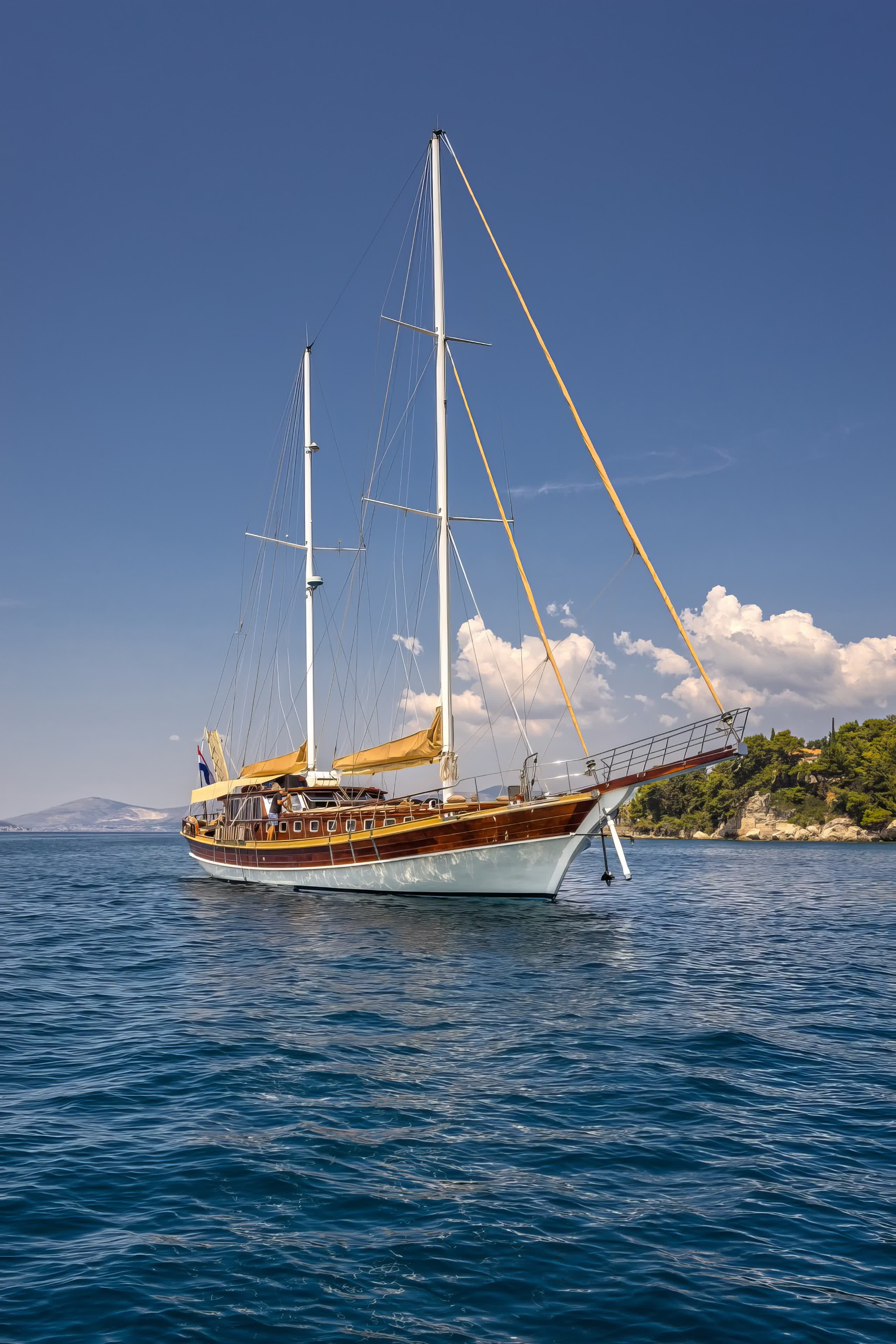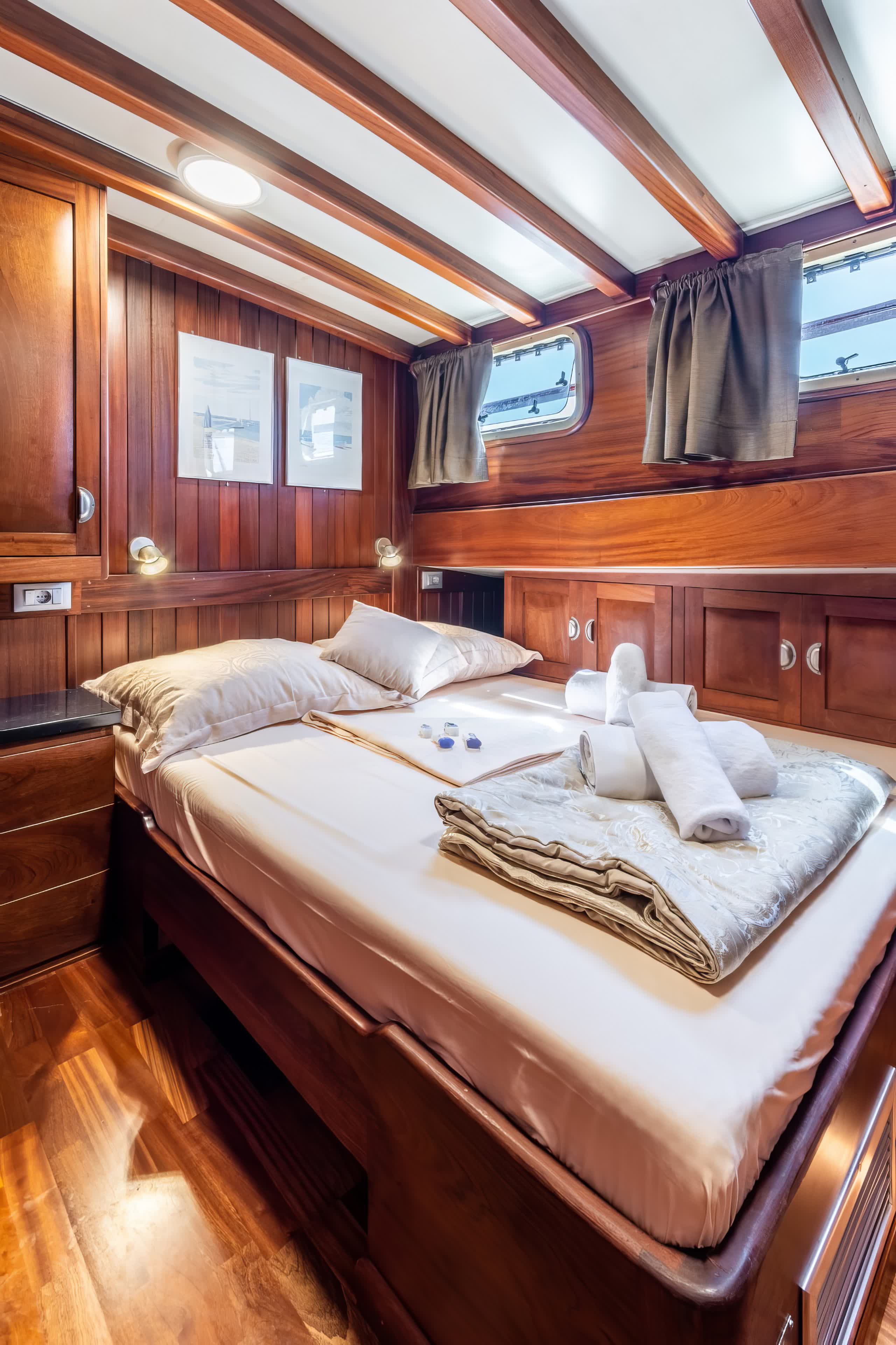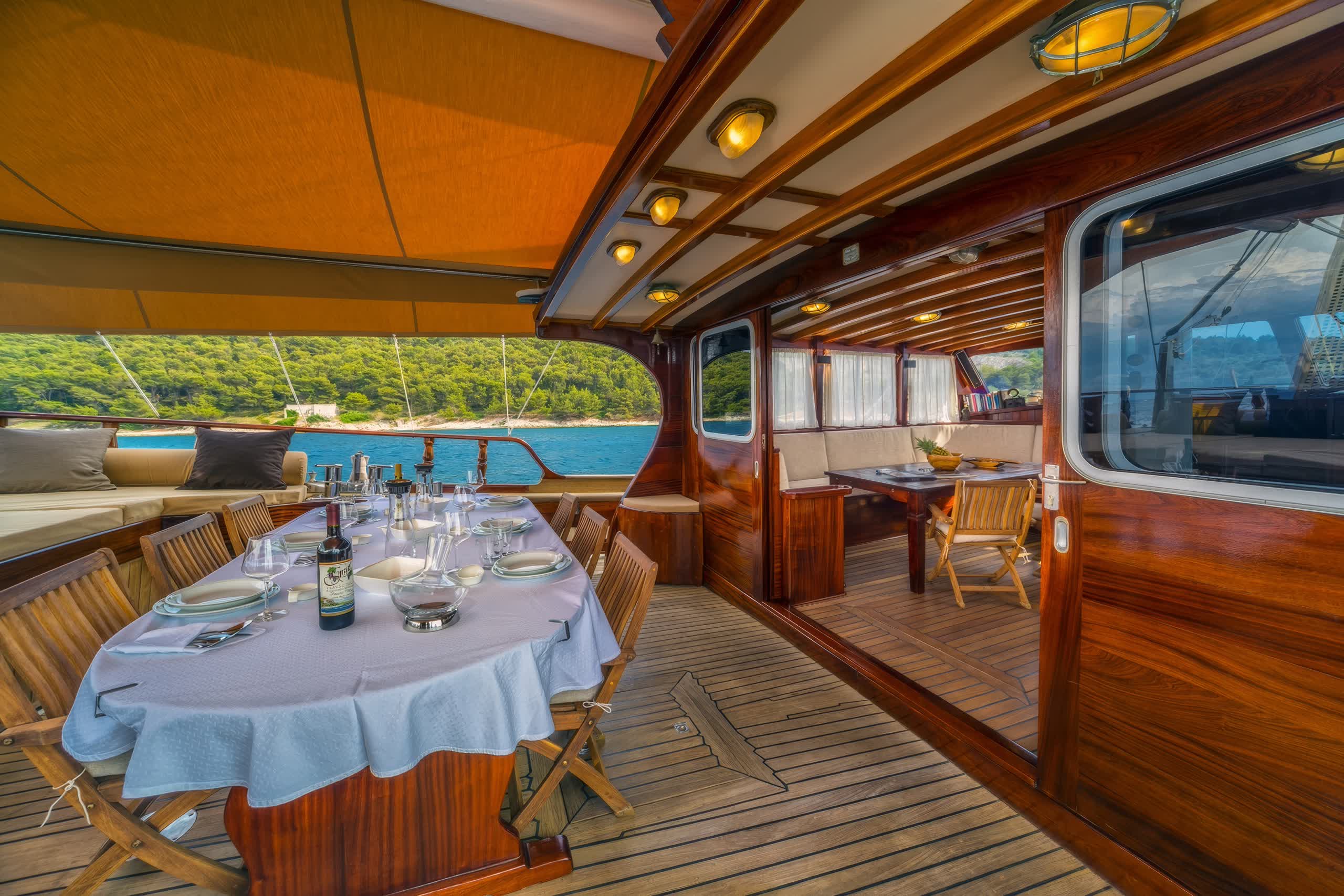 The Angelica welcomes up to 10 guests in 5 beautifully appointed cabins. The three double cabins and two twin cabins all have en-suite bathrooms. The cabins are finely decorated and give a calm and relaxing environment with enough storage space. The Angelica's interior captures a sense of elegance but also relaxing atmosphere as well. The salon is spacious, with couchlike seating going around an open area where passengers can kick back or watch the entertainment system. The salon houses the dining area, offering guests an elegant space to enjoy meals prepared by the yacht’s onboard chef. Its interiors are tasteful, featuring warm woods, soft fabrics and luxurious details that complement the yacht's overall aesthetic. On deck, the Angelica features a range of spaces for outdoor living and relaxation. A large dining table on the aft deck also accommodates al fresco meals with a view, while the forward deck provides a roomy sunbathing area where guests can lounge comfortably under the Mediterranean sun. The expansive decks offer plenty of room to mingle and take in views of the stunning coastline.