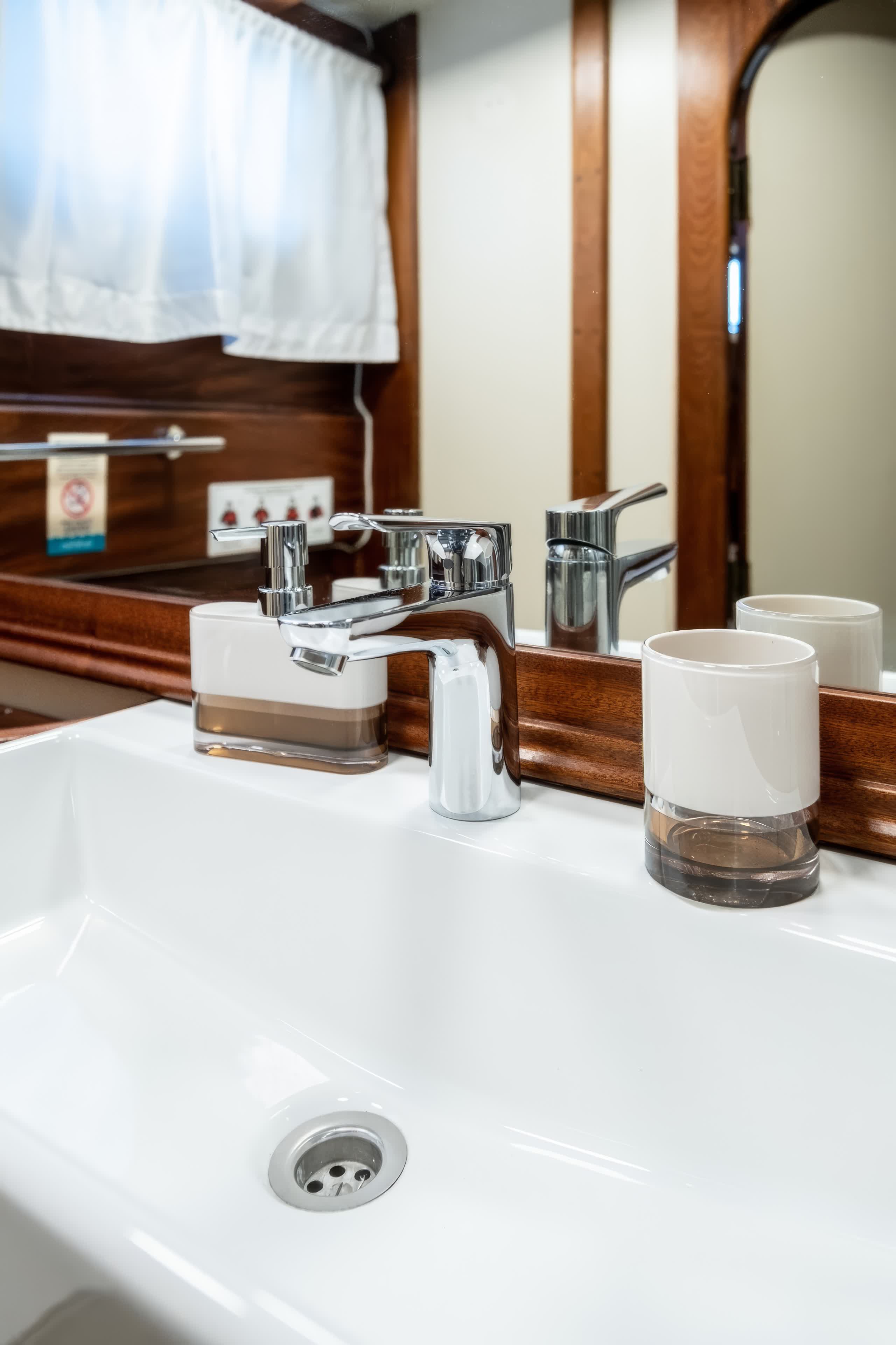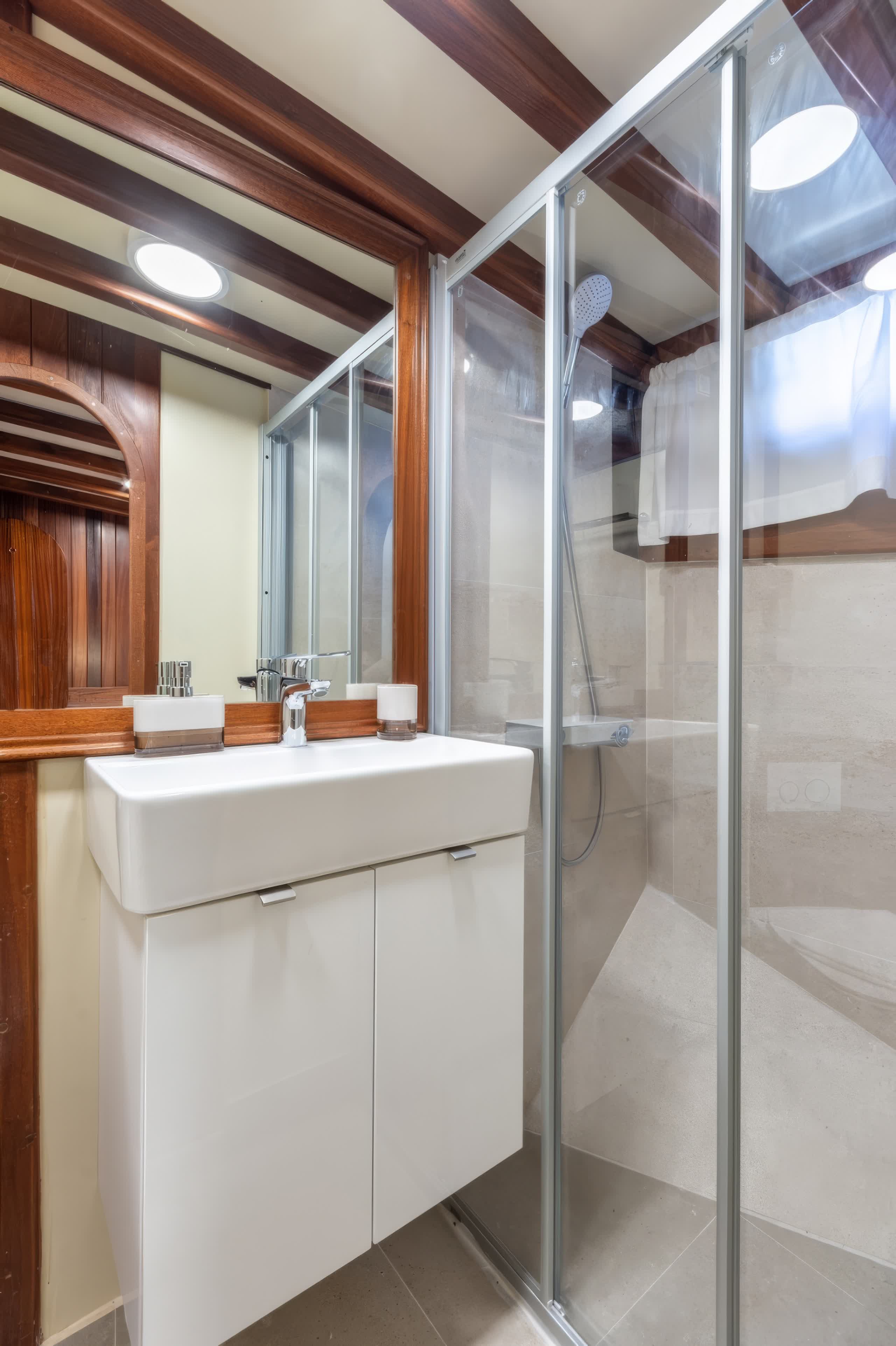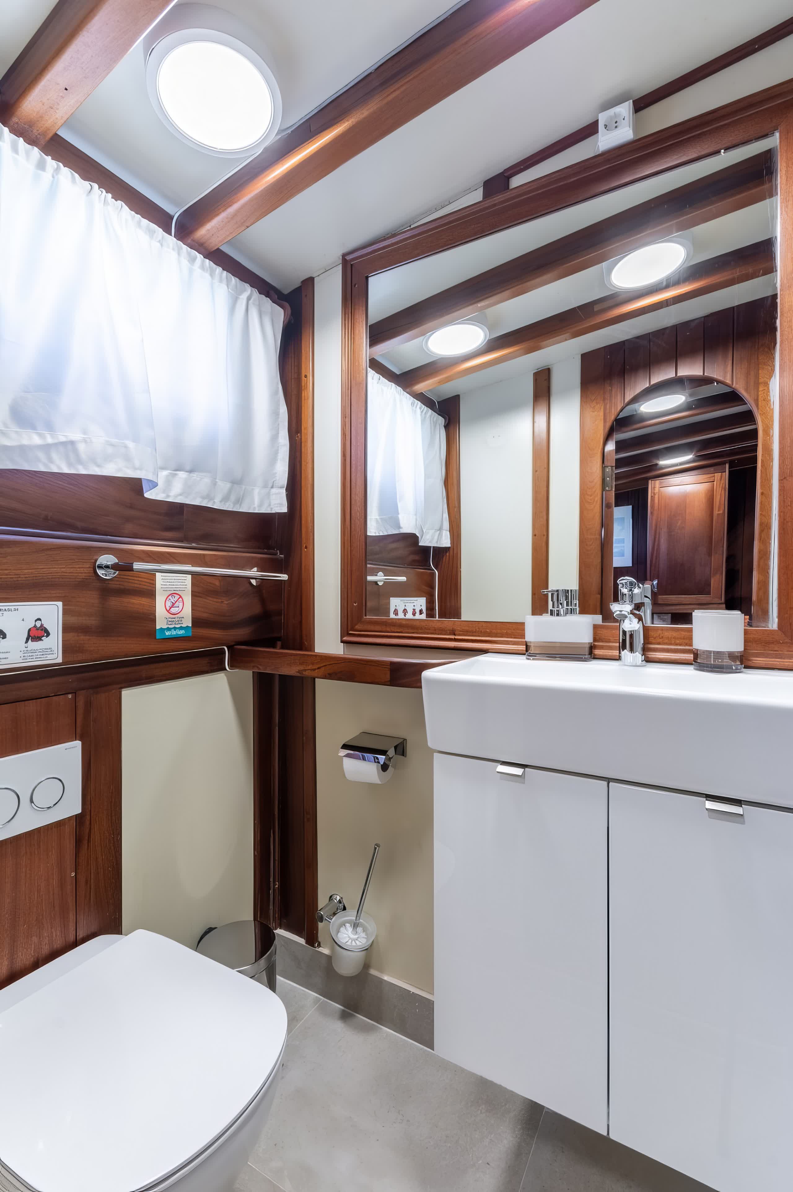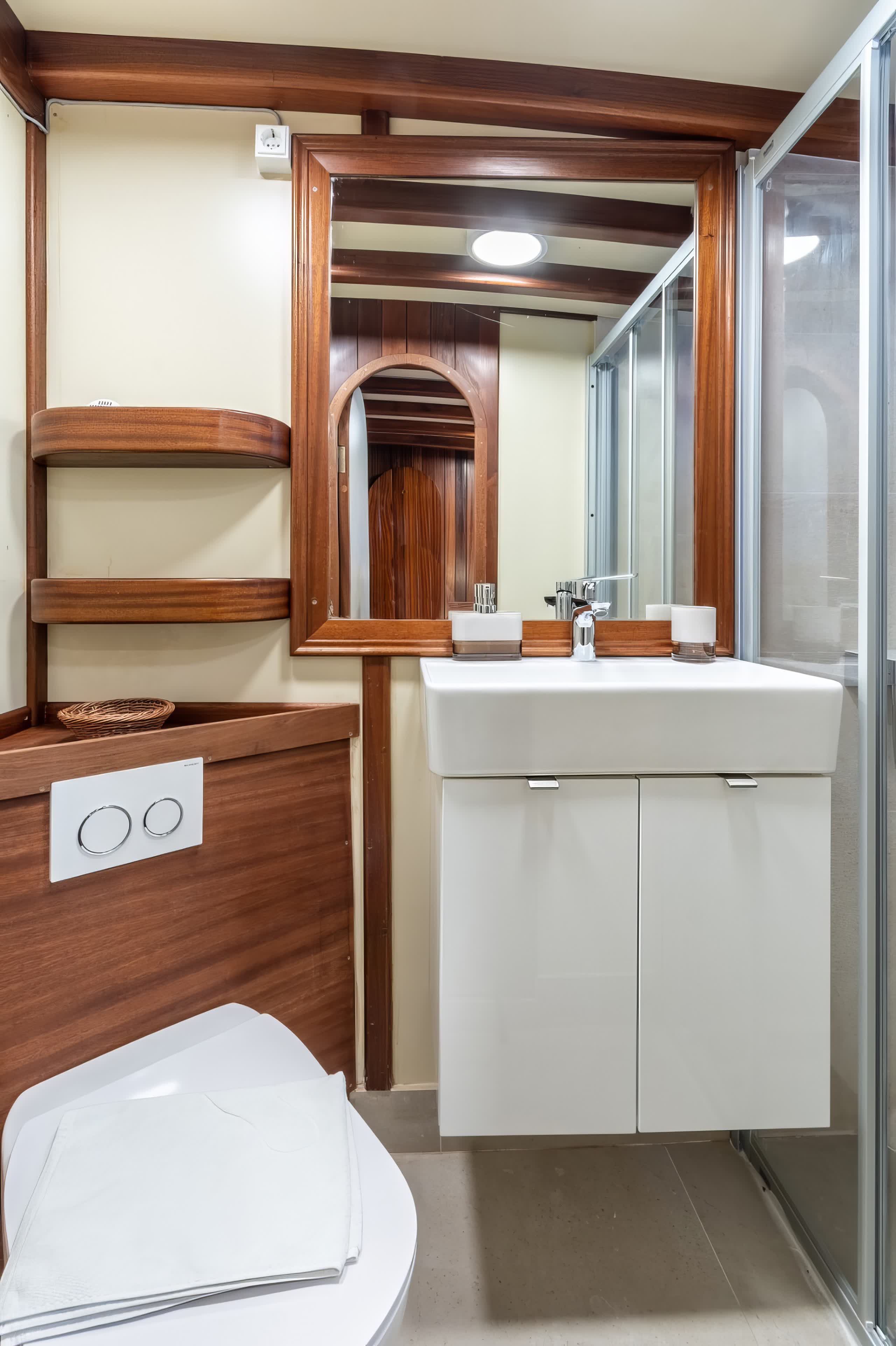 The Angelica welcomes up to 10 guests in 5 beautifully appointed cabins. The three double cabins and two twin cabins all have en-suite bathrooms. The cabins are finely decorated and give a calm and relaxing environment with enough storage space. The Angelica's interior captures a sense of elegance but also relaxing atmosphere as well. The salon is spacious, with couchlike seating going around an open area where passengers can kick back or watch the entertainment system. The salon houses the dining area, offering guests an elegant space to enjoy meals prepared by the yacht’s onboard chef. Its interiors are tasteful, featuring warm woods, soft fabrics and luxurious details that complement the yacht's overall aesthetic. On deck, the Angelica features a range of spaces for outdoor living and relaxation. A large dining table on the aft deck also accommodates al fresco meals with a view, while the forward deck provides a roomy sunbathing area where guests can lounge comfortably under the Mediterranean sun. The expansive decks offer plenty of room to mingle and take in views of the stunning coastline.