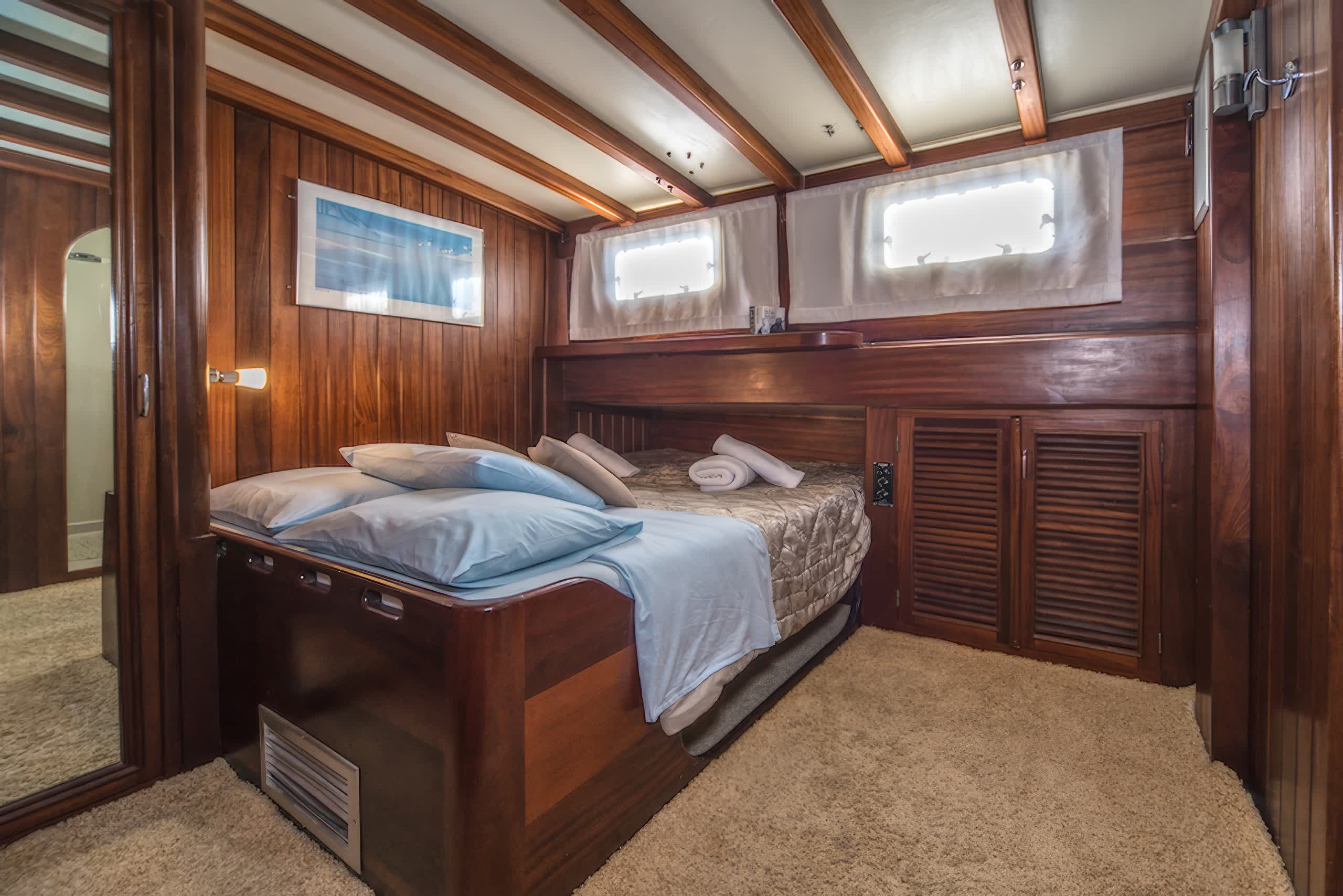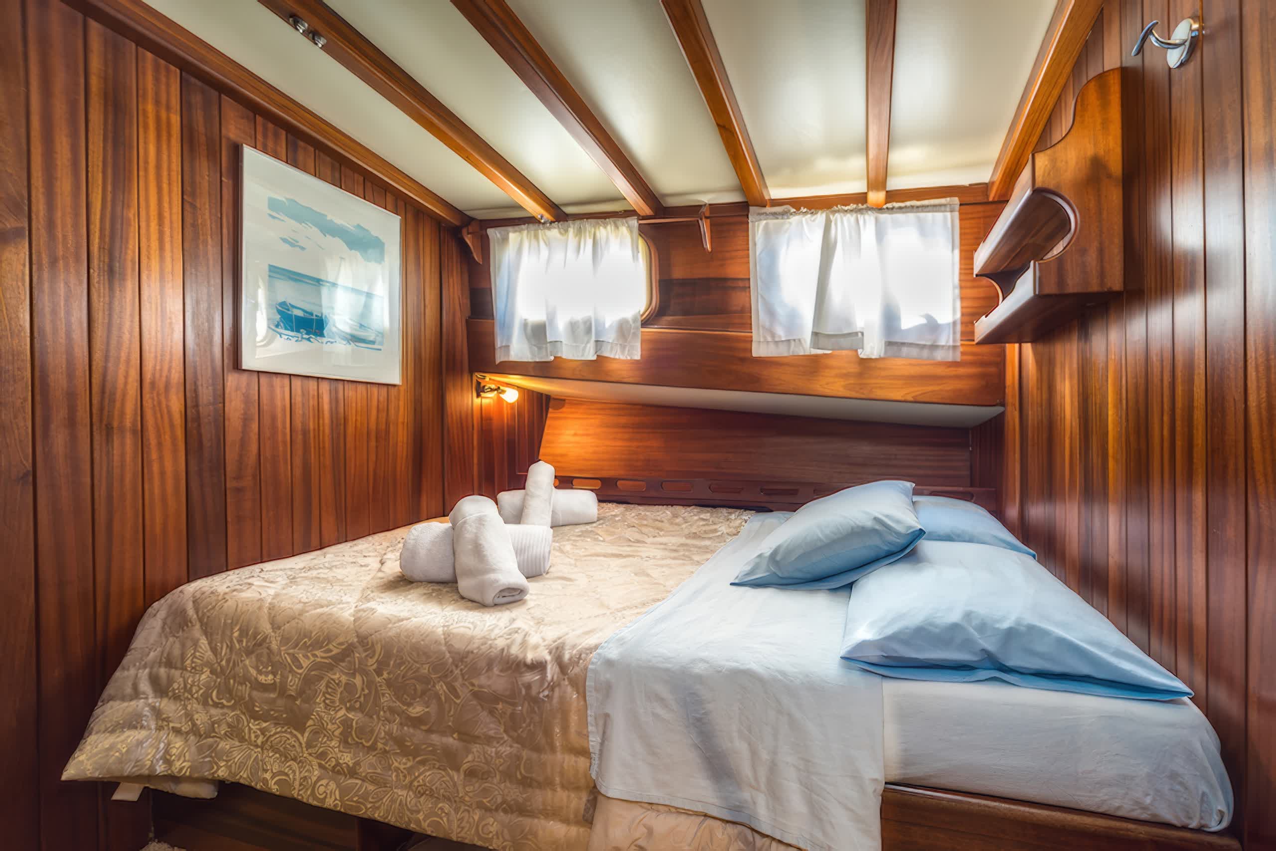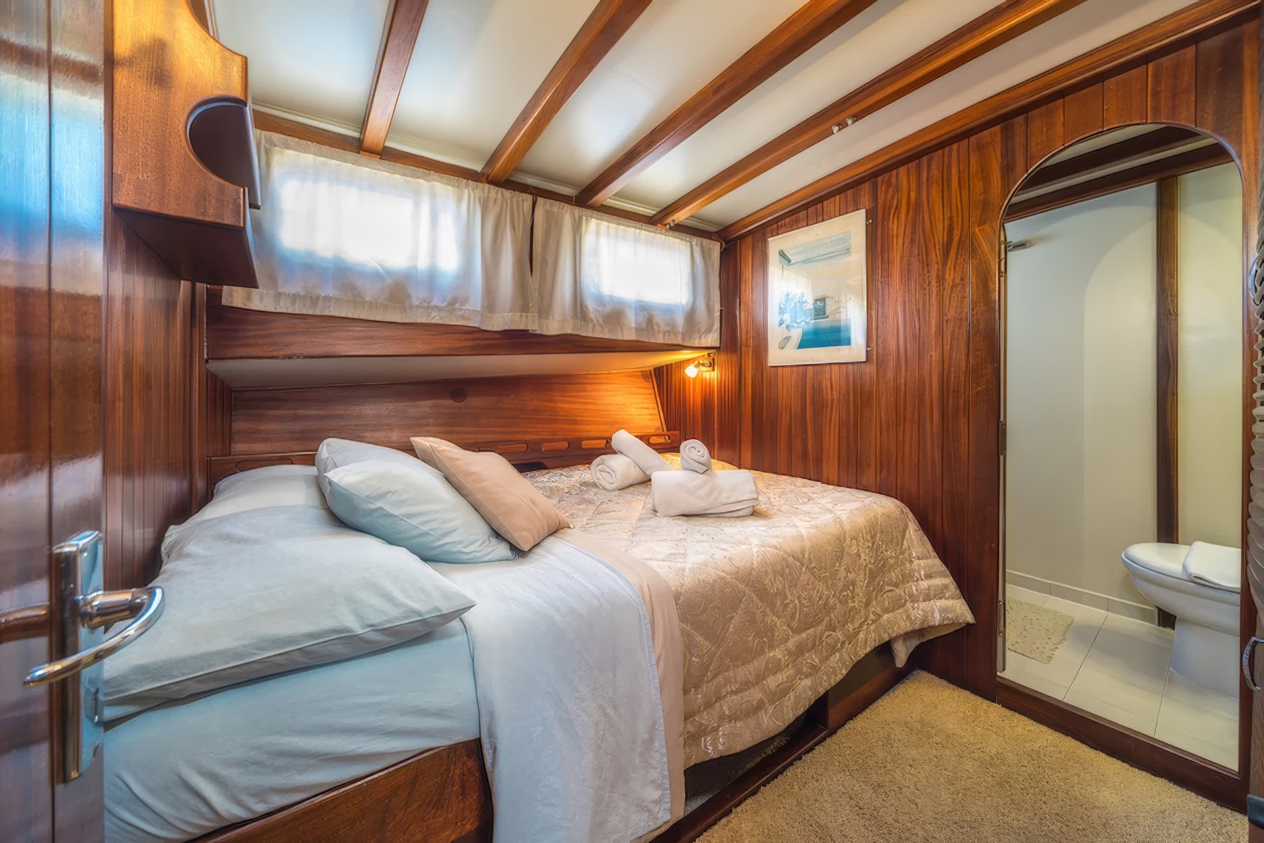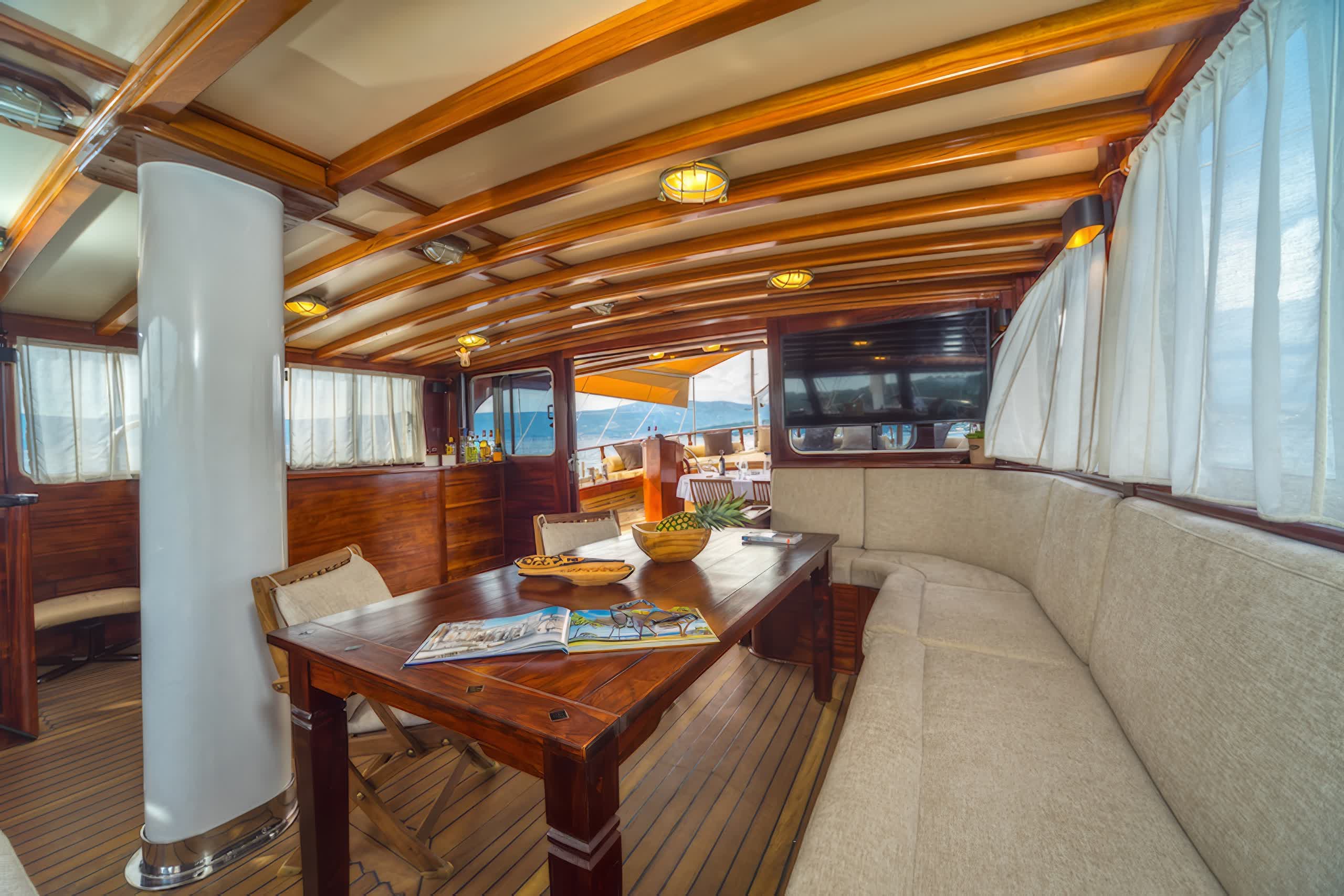 The yacht includes 5 elegantly styled cabins that can host up to 10 people, which in itself comprises of 3 double cabins and 2 twin cabins. All cabins come with air conditioning units, private bathrooms and modern furnishings, providing guests with the utmost comfort and privacy throughout their stay. Large interiors feature luxuriously refined appointments with rich wood paneling, soft lighting, and chic furnishings create an inviting, opulent feeling throughout the yacht.