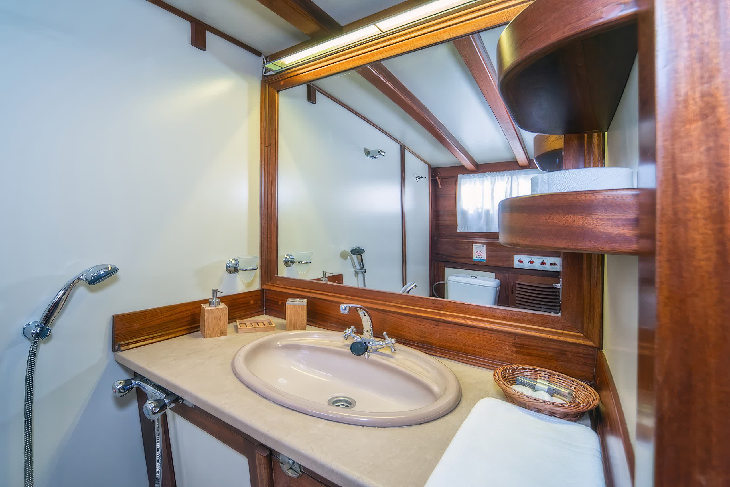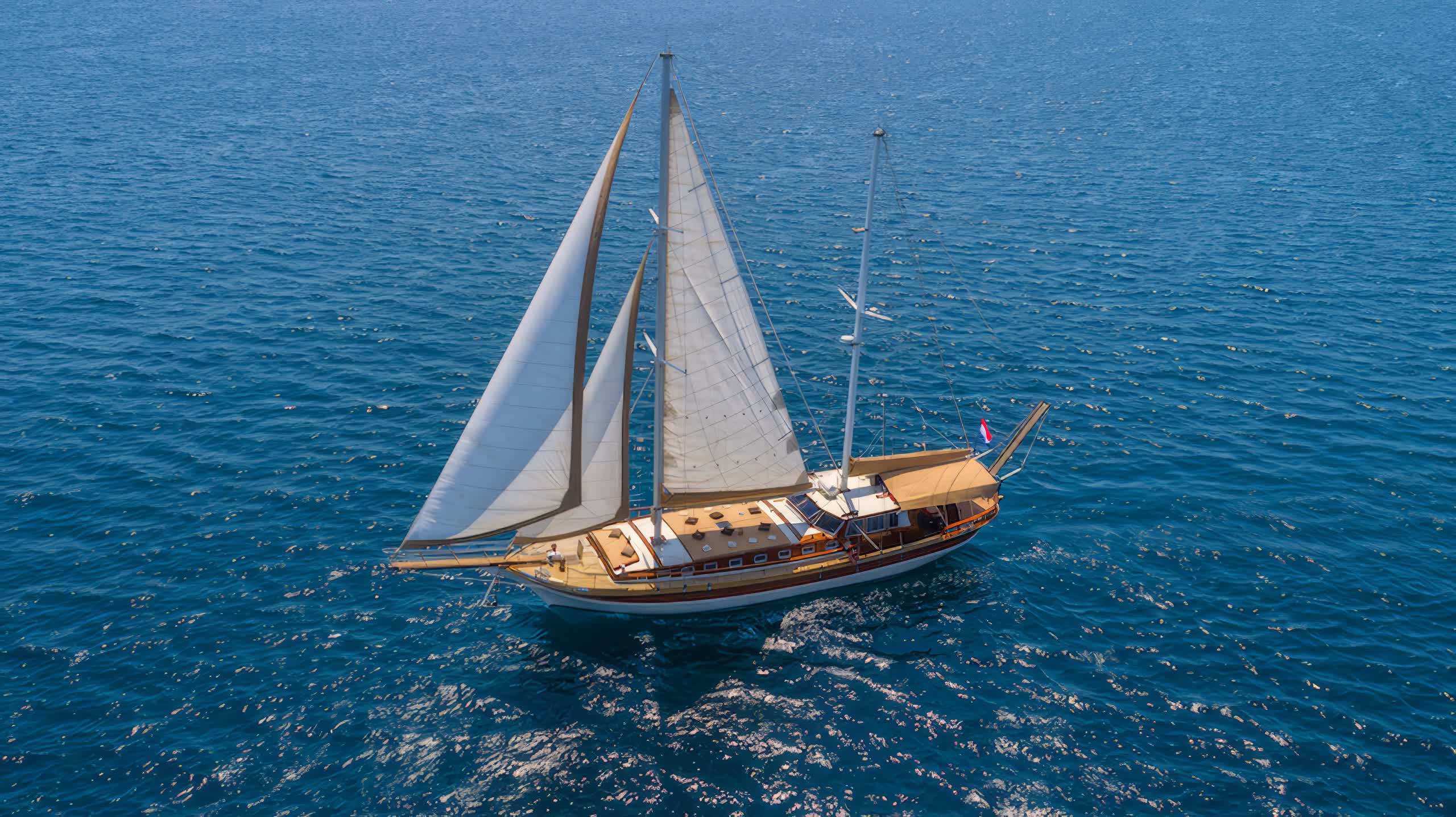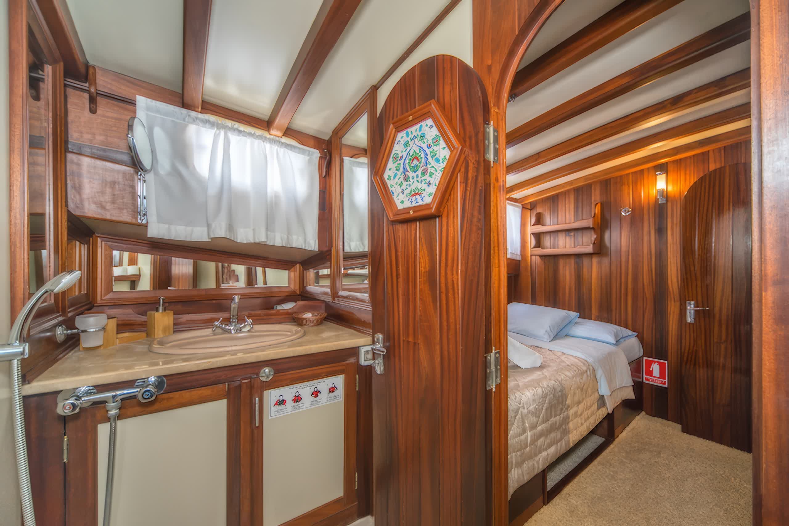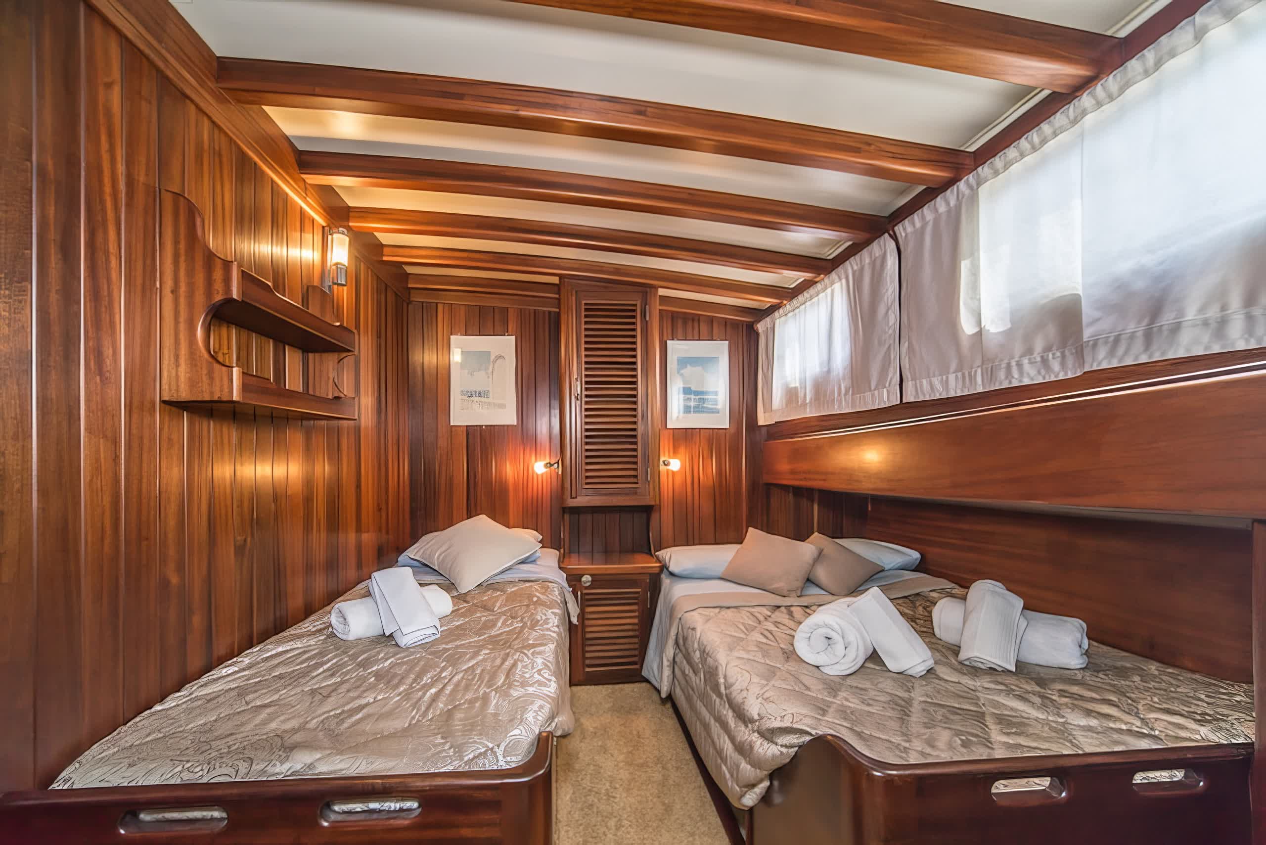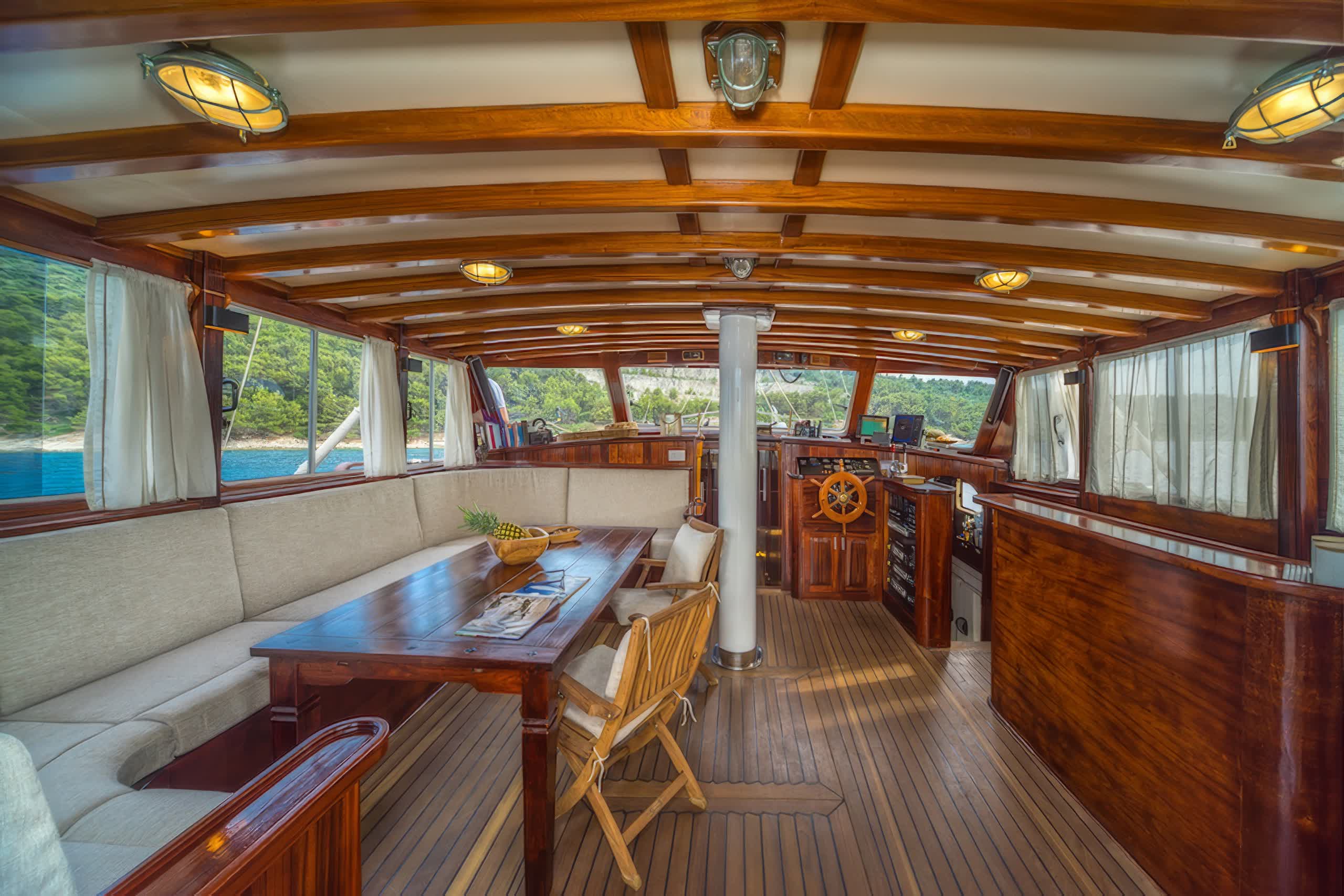 The yacht includes 5 elegantly styled cabins that can host up to 10 people, which in itself comprises of 3 double cabins and 2 twin cabins. All cabins come with air conditioning units, private bathrooms and modern furnishings, providing guests with the utmost comfort and privacy throughout their stay. Large interiors feature luxuriously refined appointments with rich wood paneling, soft lighting, and chic furnishings create an inviting, opulent feeling throughout the yacht.