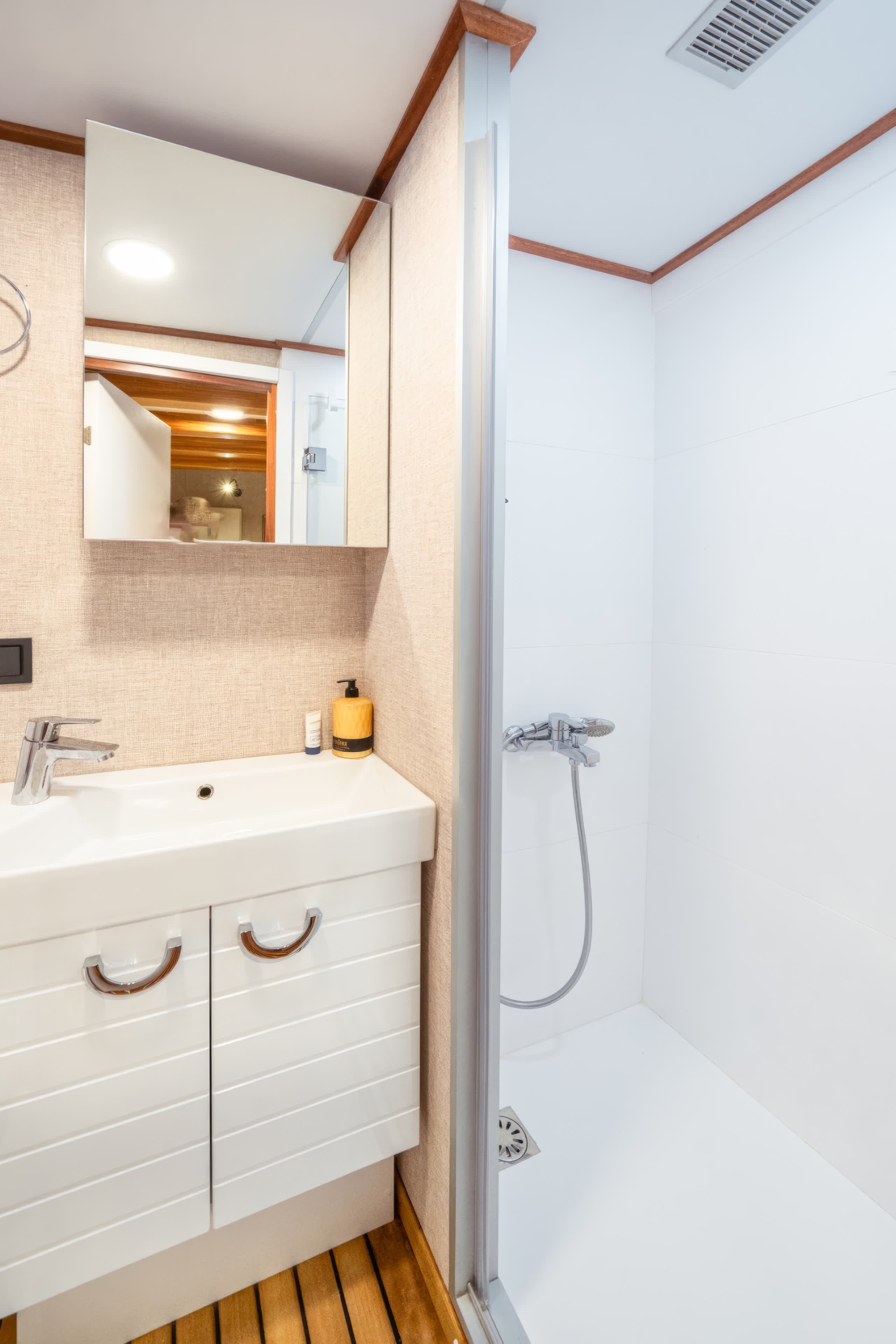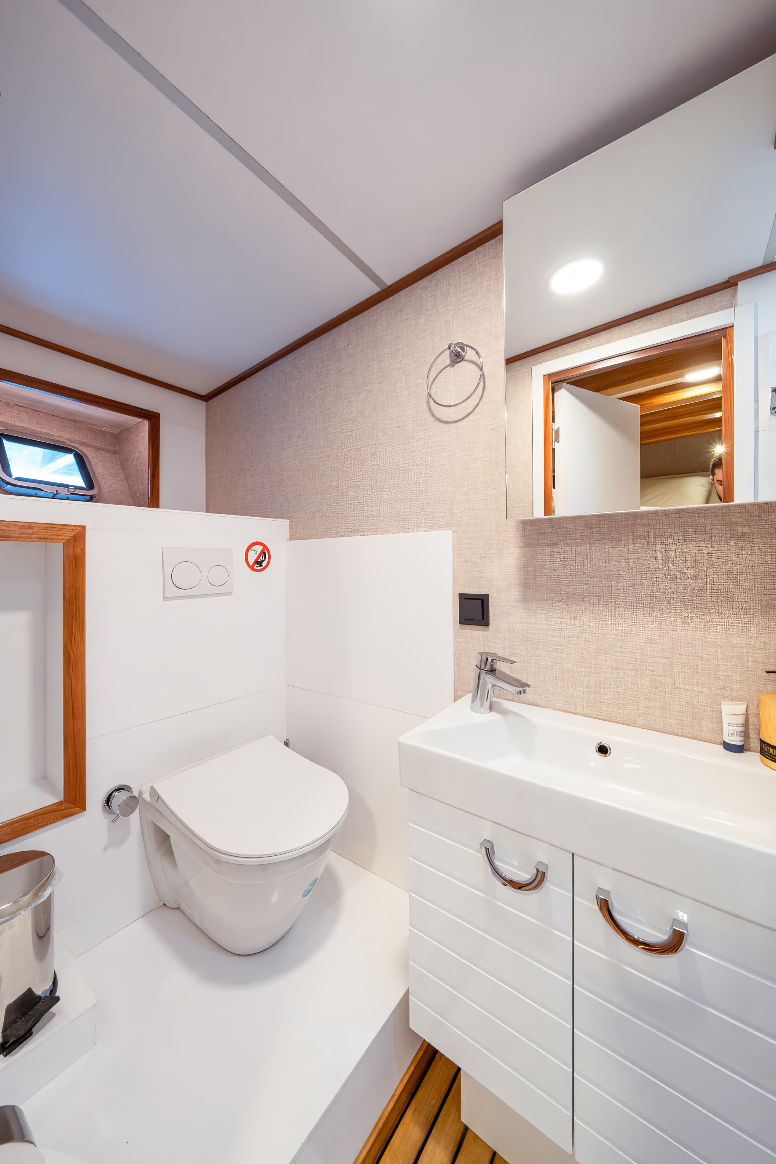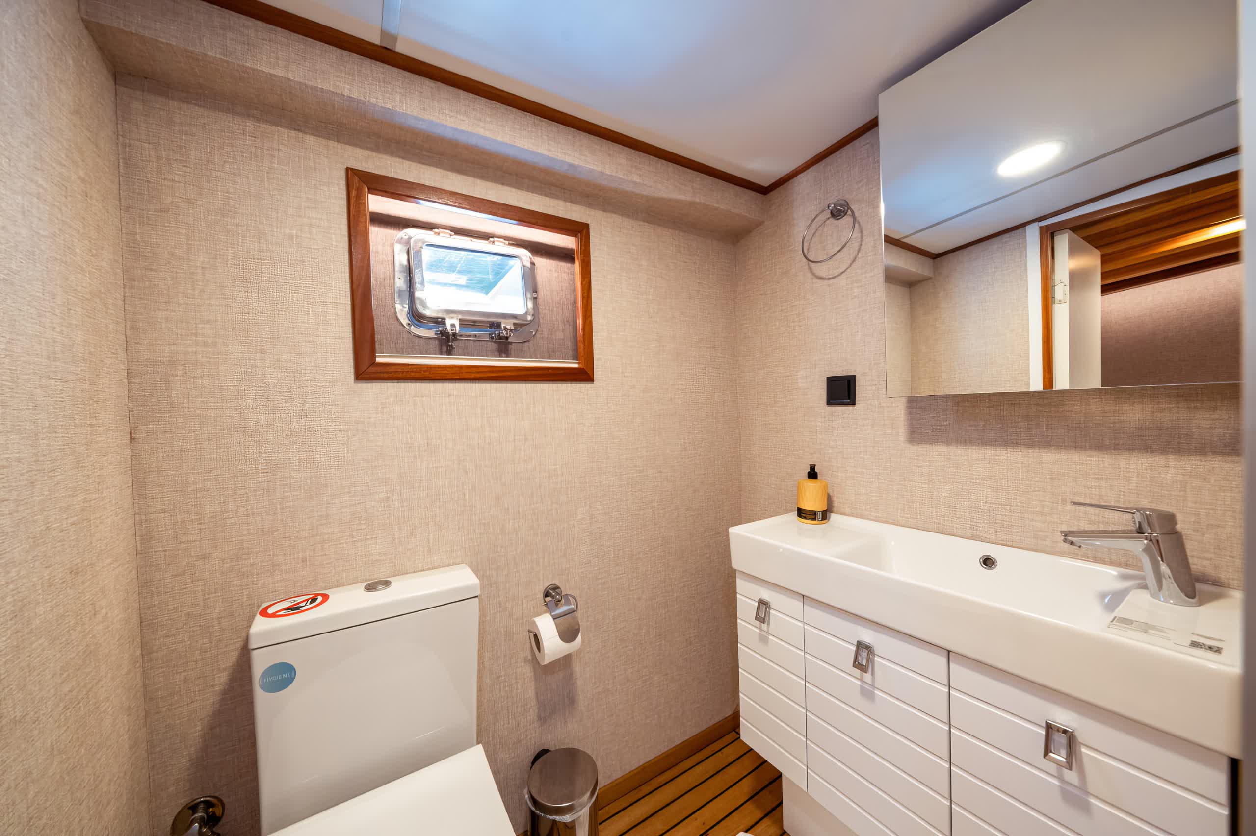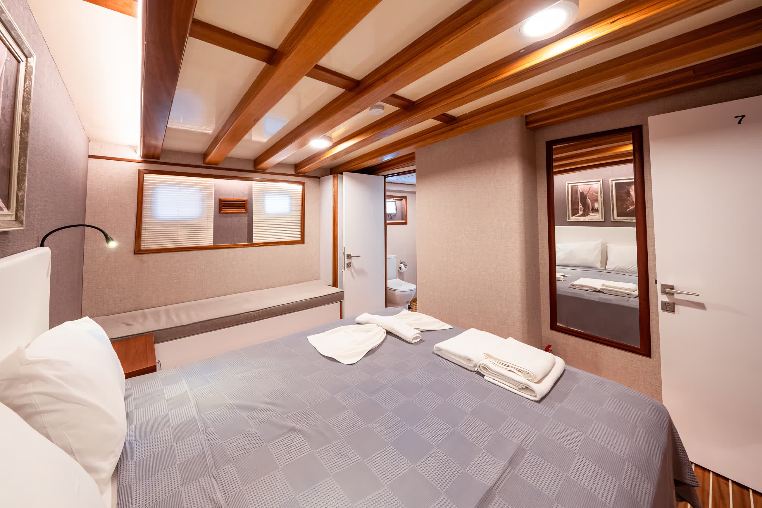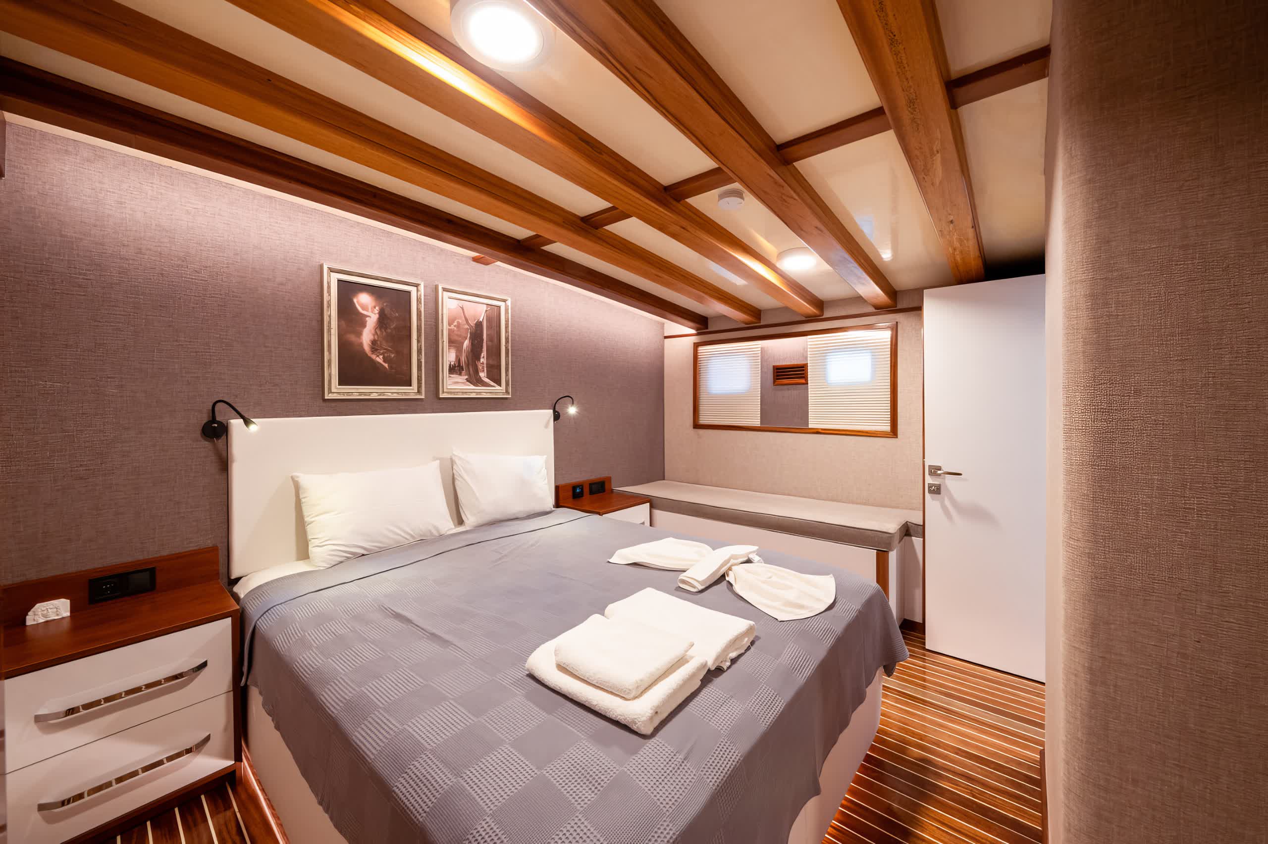 Boreas has a generous upper deck for outdoor living and entertaining. The aft deck has a generous dining area for guests to enjoy meals prepared by the talented onboard chefs. The large front deck has sun beds with ample space to enjoy the views of Turkey’s beautiful coast. There are also shaded spots where guests can relax and take in the surroundings in comfort.