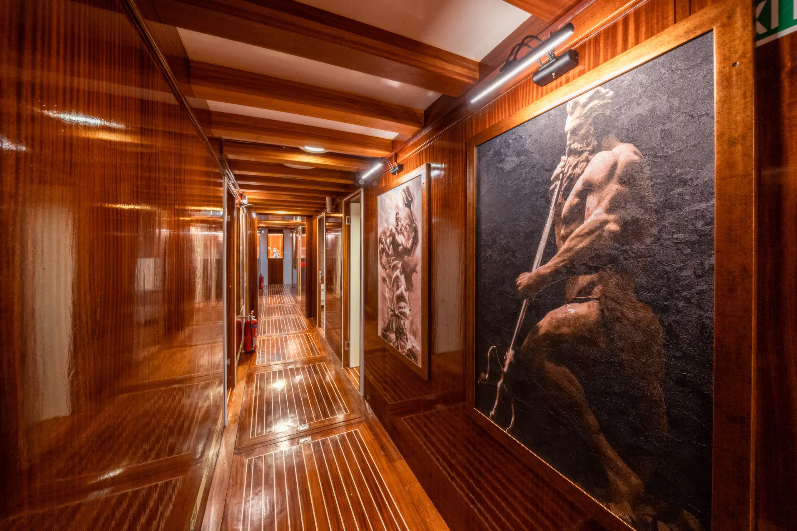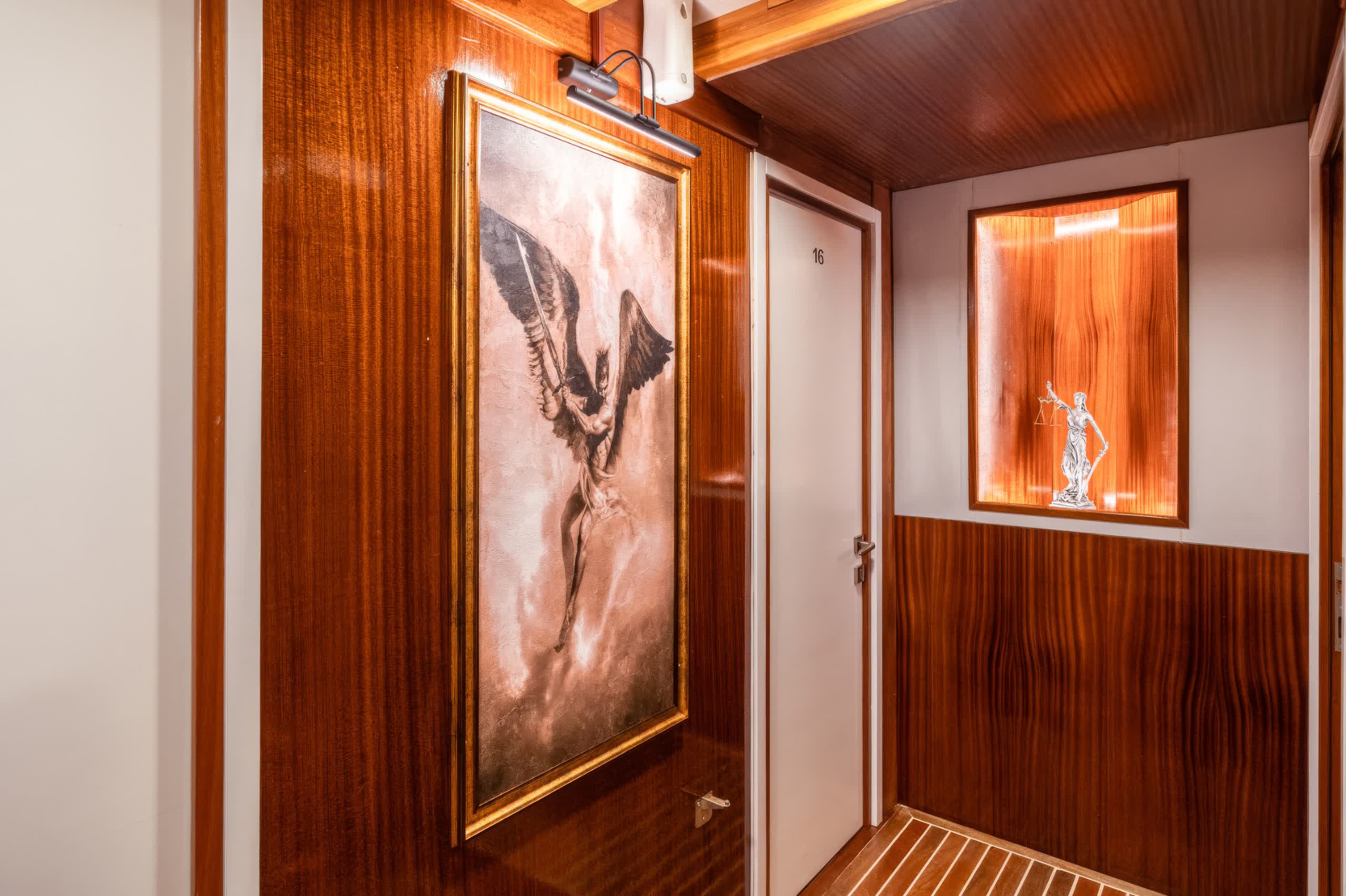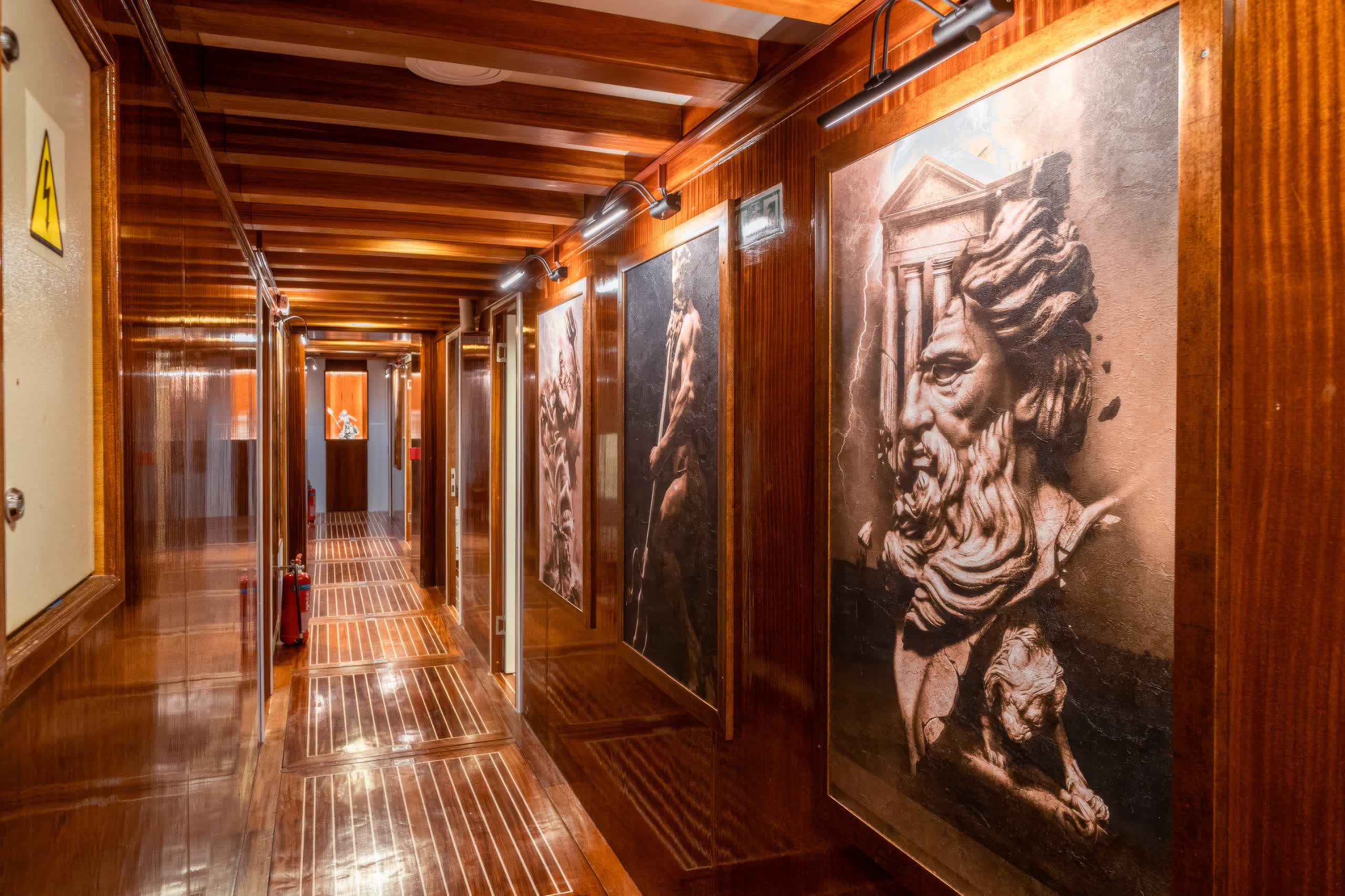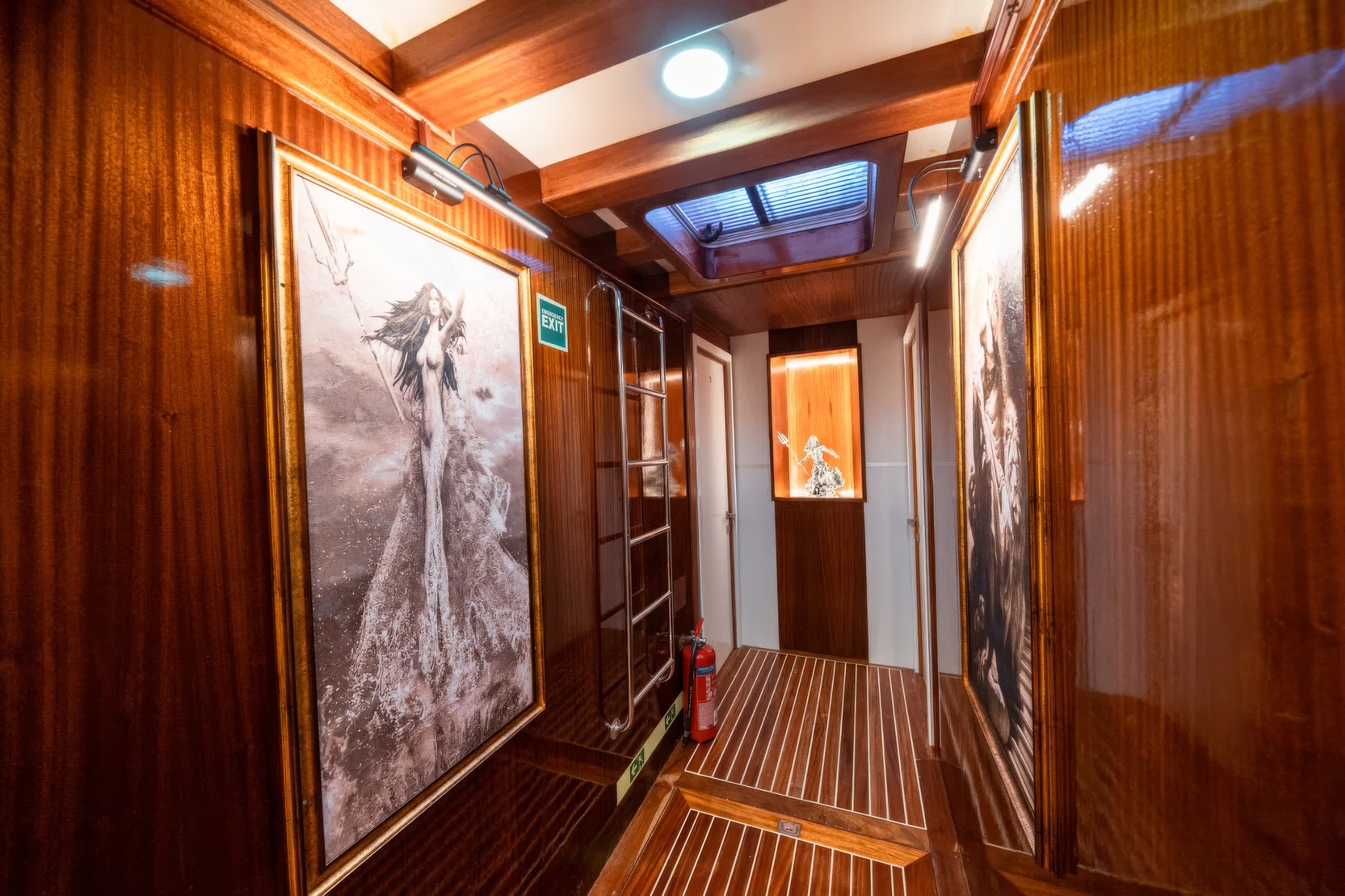 The yacht can host a total of 12 guests across 16 tastefully decorated cabins. Every cabin has en-suite bathrooms, lavish air conditioning, and handsome furnishings, a comfortable private retreat for guests. Inside Boreas, the look melds classic and contemporary, with wood paneling, large windows, and high-end finishes for a warm embrace.