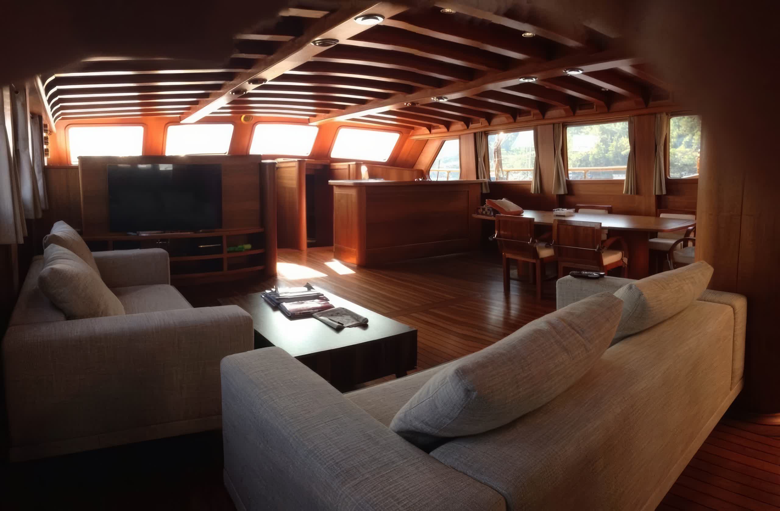 Inside, the Cakiryildiz provides both comfortable and stylish accommodations. The yacht sleeps up to 10 guests in six airy cabins, a mix of double and twin configurations. These cabins are all air-conditioned with private bathrooms, so guests can enjoy a high degree of comfort and privacy. Interior decorations mix traditional wood paneling with modern furniture, producing an elegant yet comfortable environment. Area rugs and furniture break up the salons and cabins into living quarters, and large windows allow lots of natural light into the spaces, creating a feeling of expanded space.