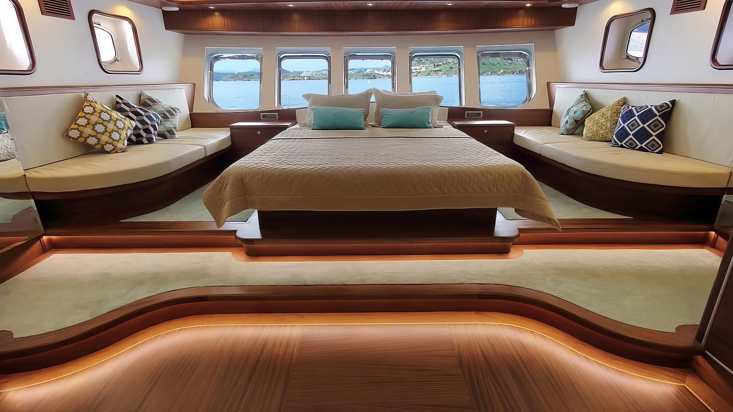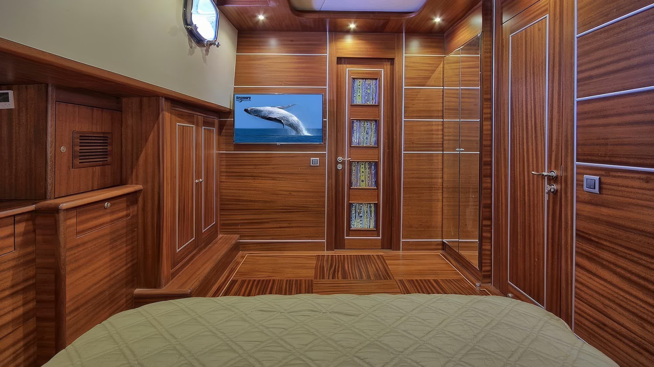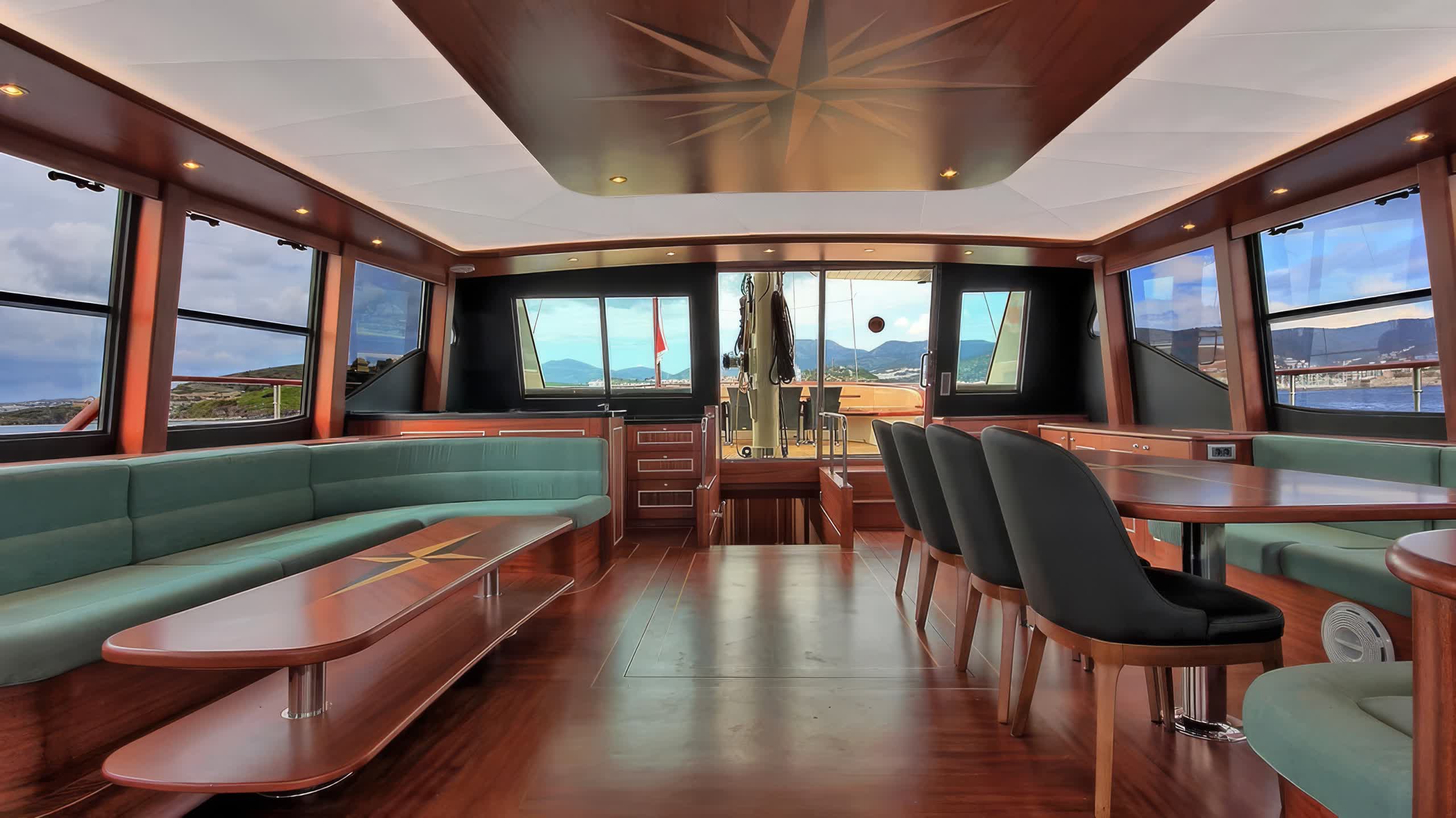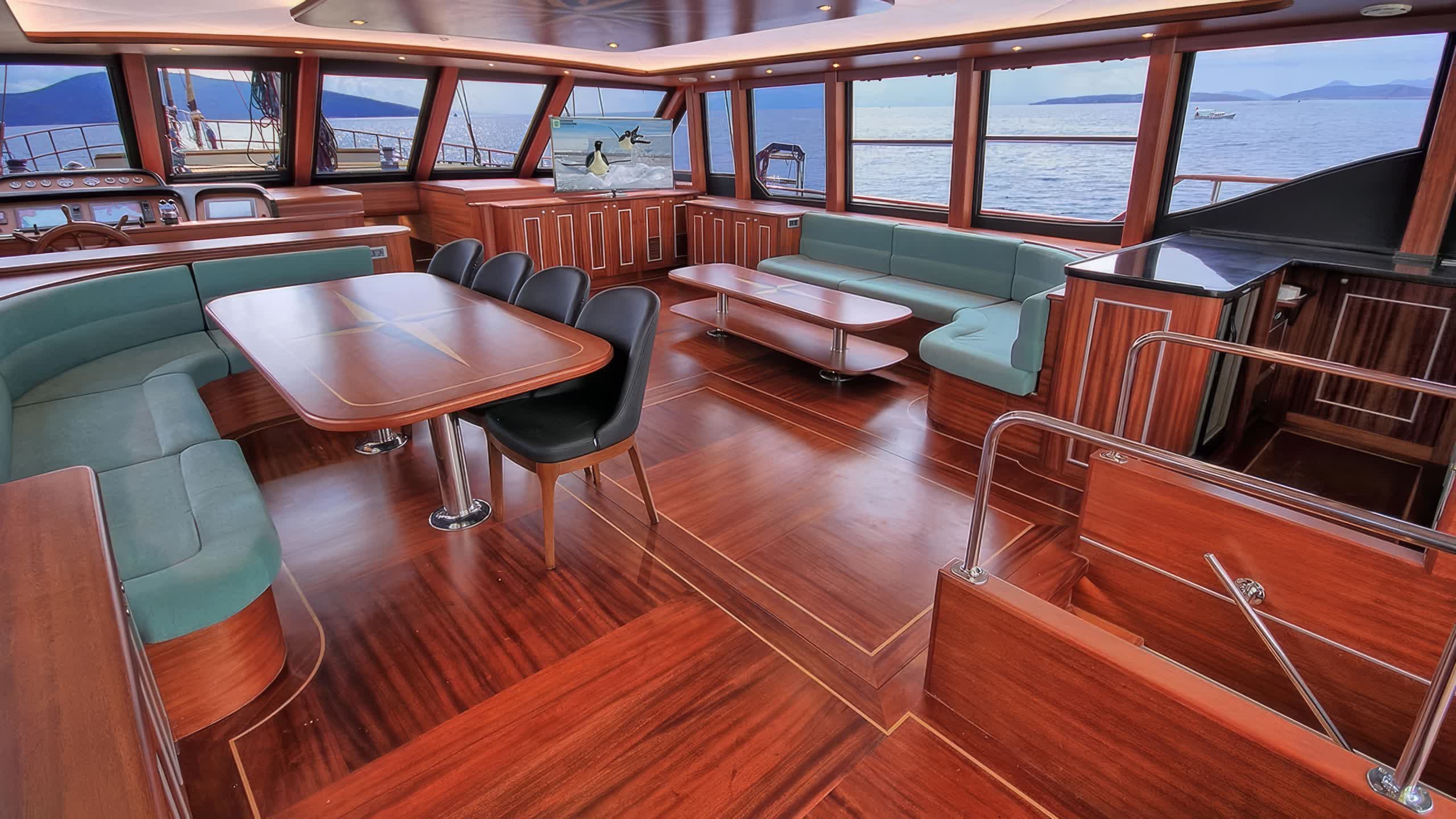 The yacht can host up to 10 guests in 5 spacious and well-decorated cabins, comprised of a master suites, 2 double cabins, and 2 twin cabins. The cabins come well-appointed with air conditioning, en-suite bathrooms, and the features to ensure comfort and privacy. Inside, old wood paneling meets contemporary touches for a warm, inviting space that suits the natural beauty of the surroundings.