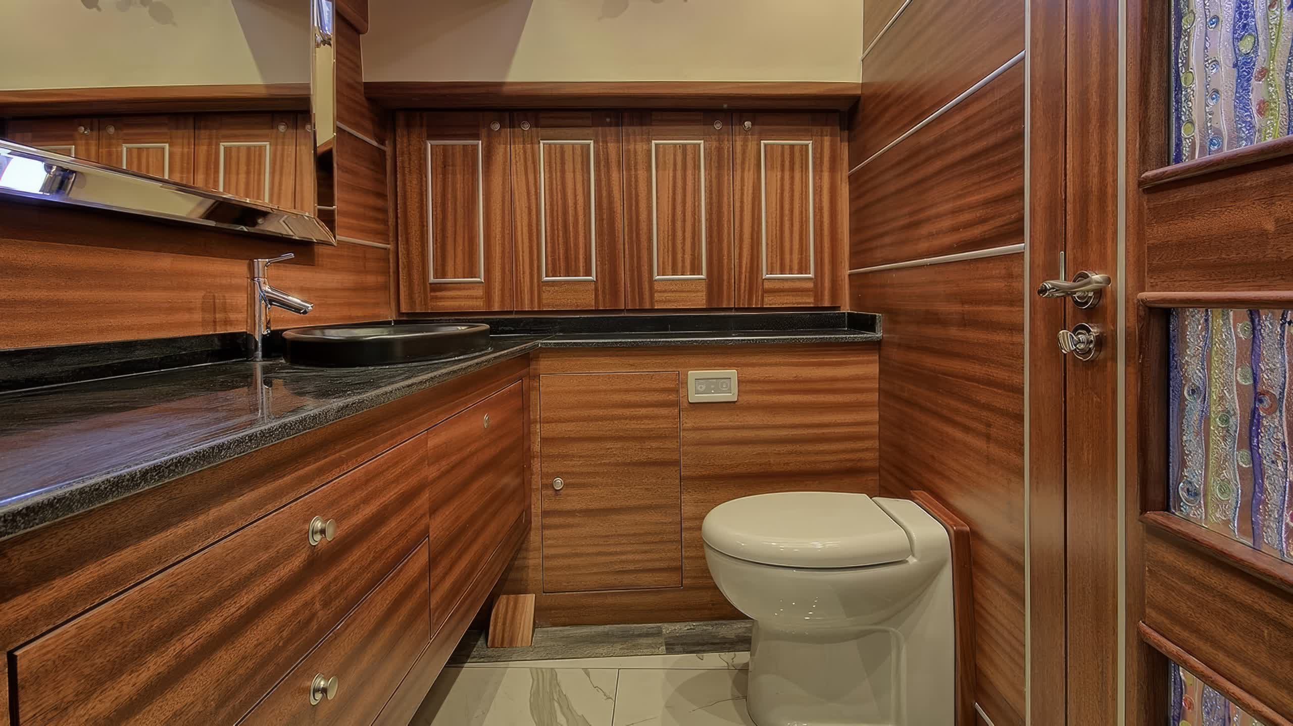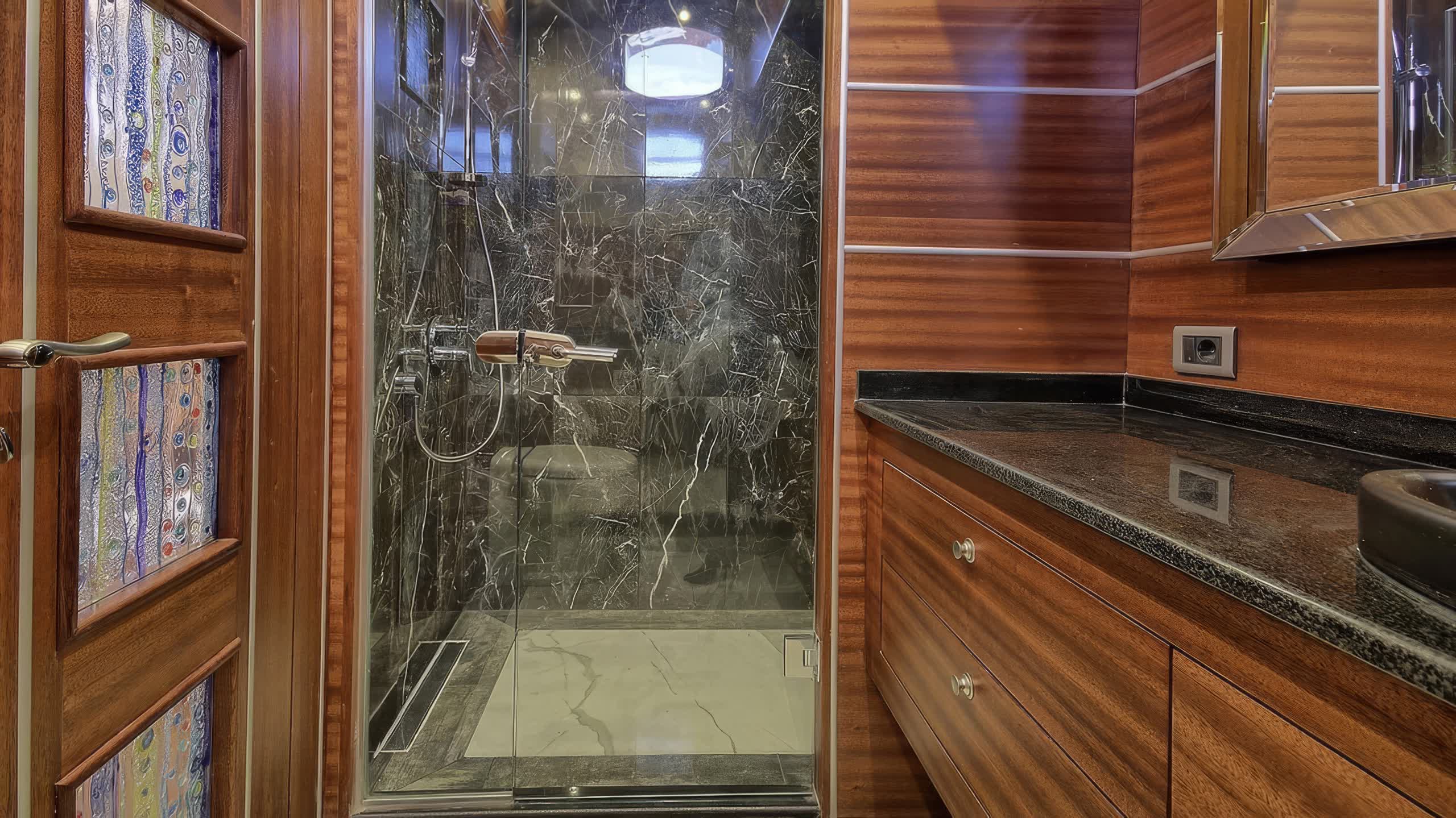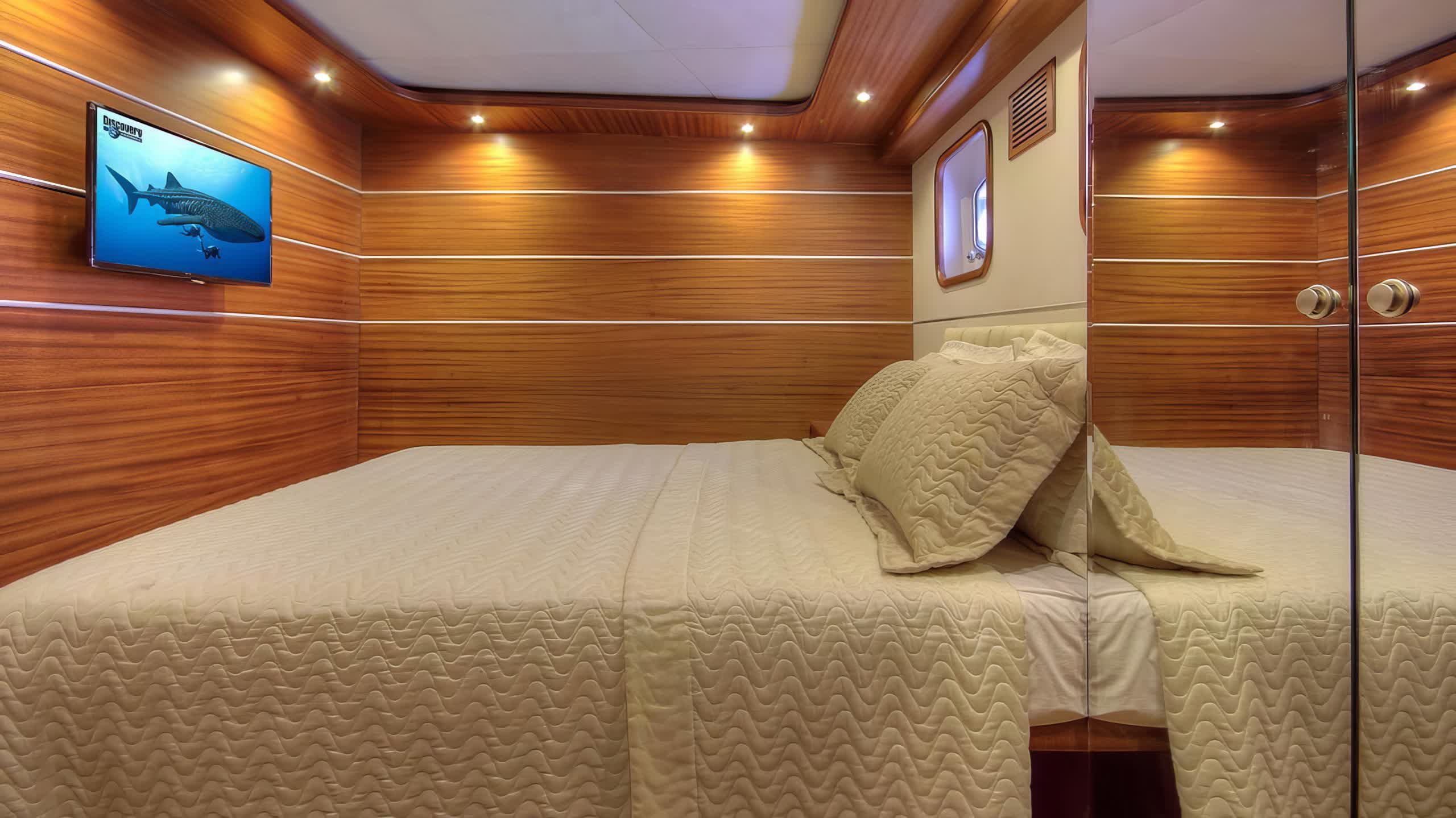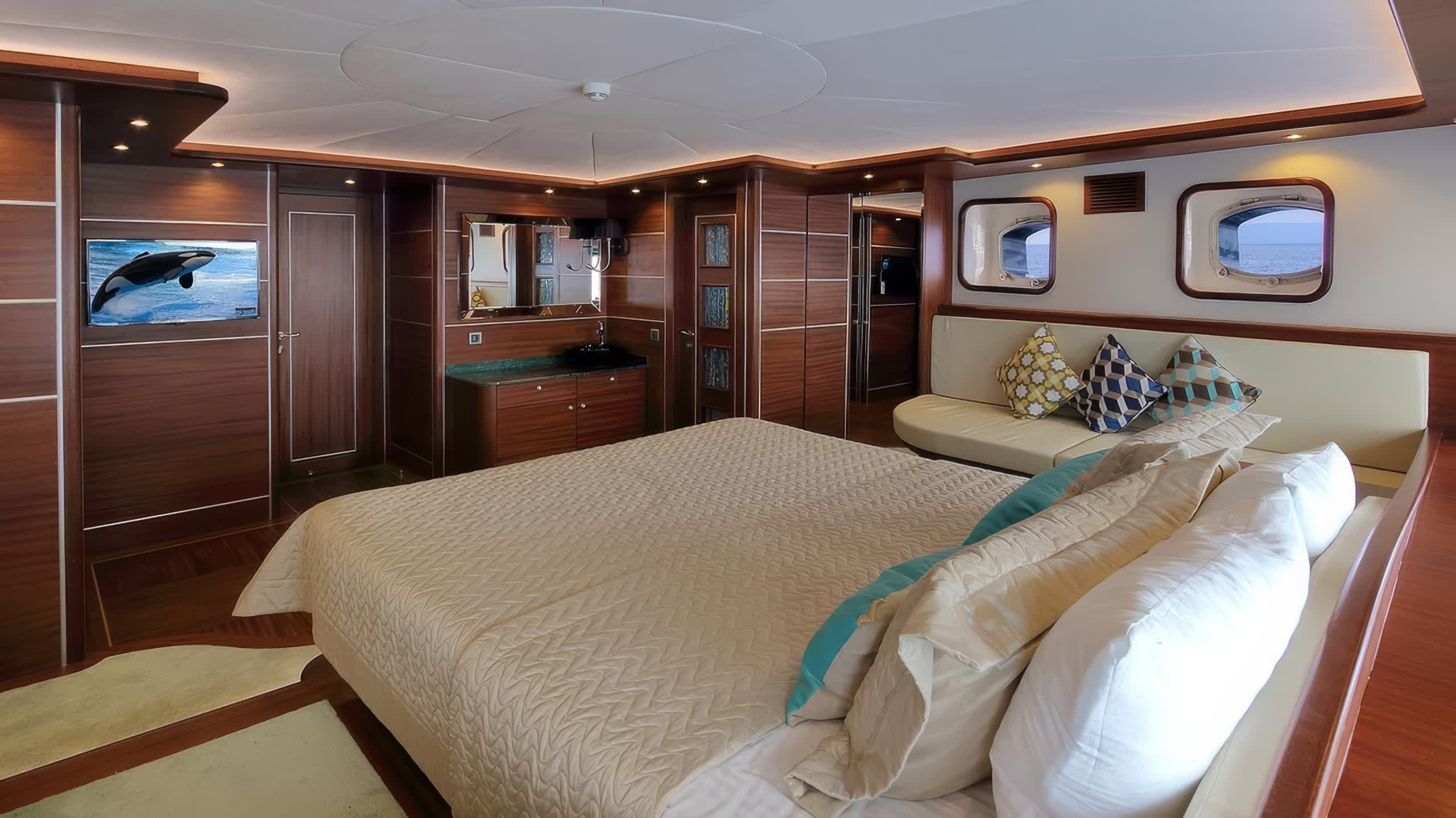 The yacht can host up to 10 guests in 5 spacious and well-decorated cabins, comprised of a master suites, 2 double cabins, and 2 twin cabins. The cabins come well-appointed with air conditioning, en-suite bathrooms, and the features to ensure comfort and privacy. Inside, old wood paneling meets contemporary touches for a warm, inviting space that suits the natural beauty of the surroundings.