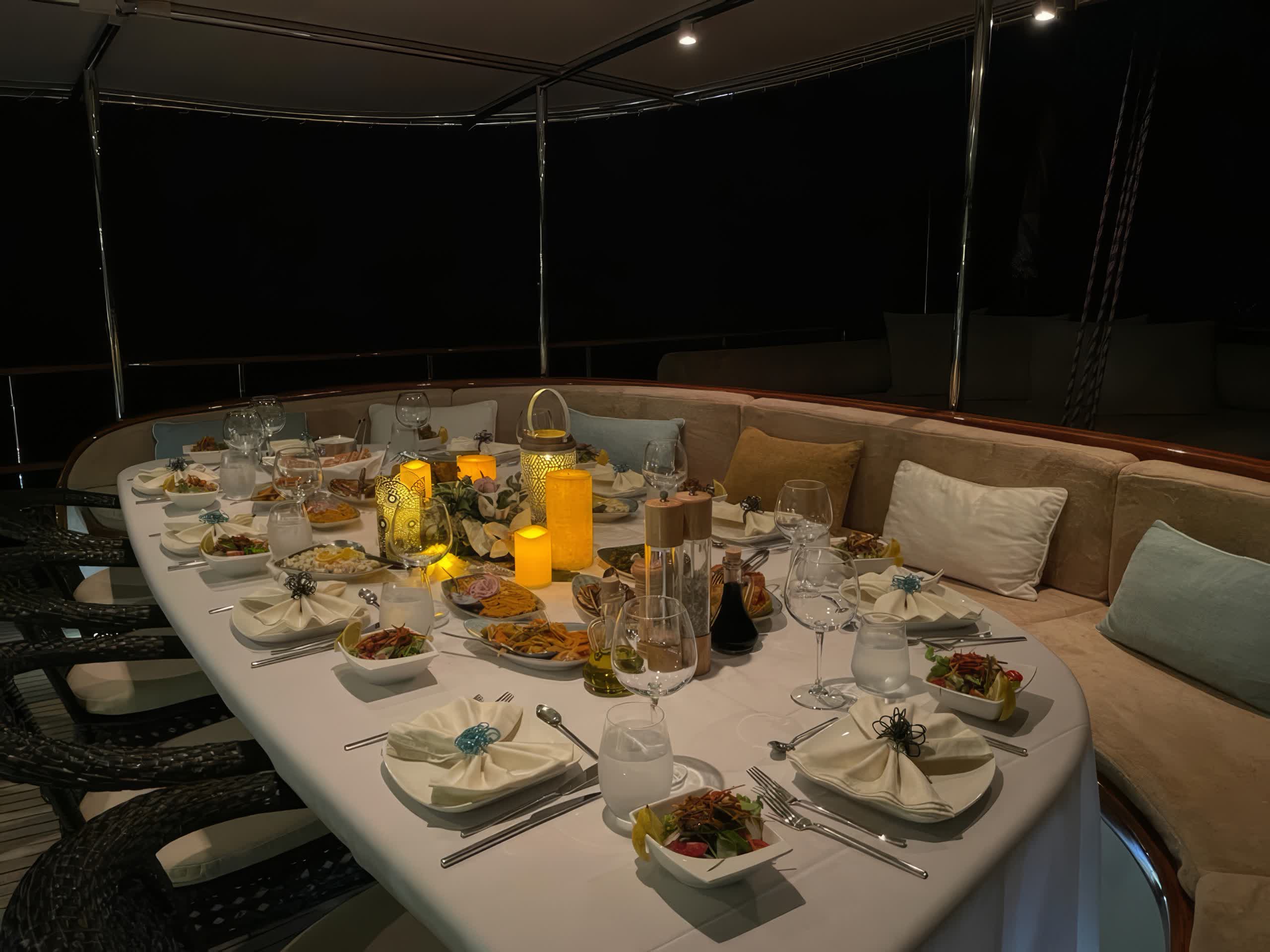 On deck are ample spaces for outdoor living — perfect for relaxing or socializing. The aft deck has a large dining area – ideal for enjoying gourmet meals prepared by the onboard chef, while the forward deck has sunbeds where guests can lounge and soak up the sun. There is also a shaded seating area for guests who wish to unwind out of the sun but still take in views of Turkey’s stunning coastline. Dragon Fly carries a wealth of water toys, including a tender, canoes and snorkeling gear for exploring the region's crystal-clear waters and hidden bays. The yacht's tender is perfect for reaching the shore, so guests can visit local beaches or coastal towns. The yacht is manned by a professional crew, consisting of a captain, a cook, and experienced deckhands, to guarantee top tier service and make the charter as memorable and seamless as possible for any guests on board.