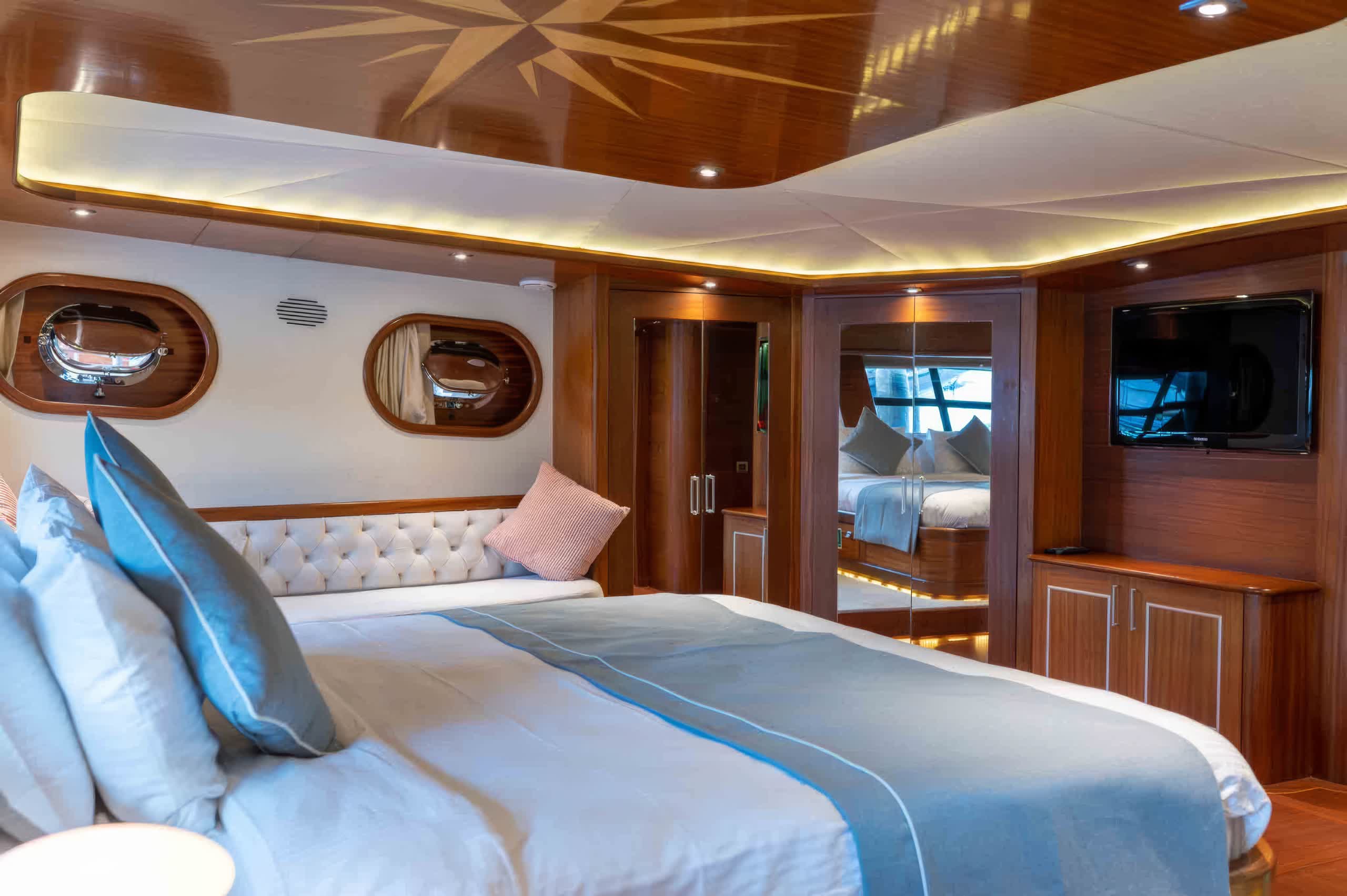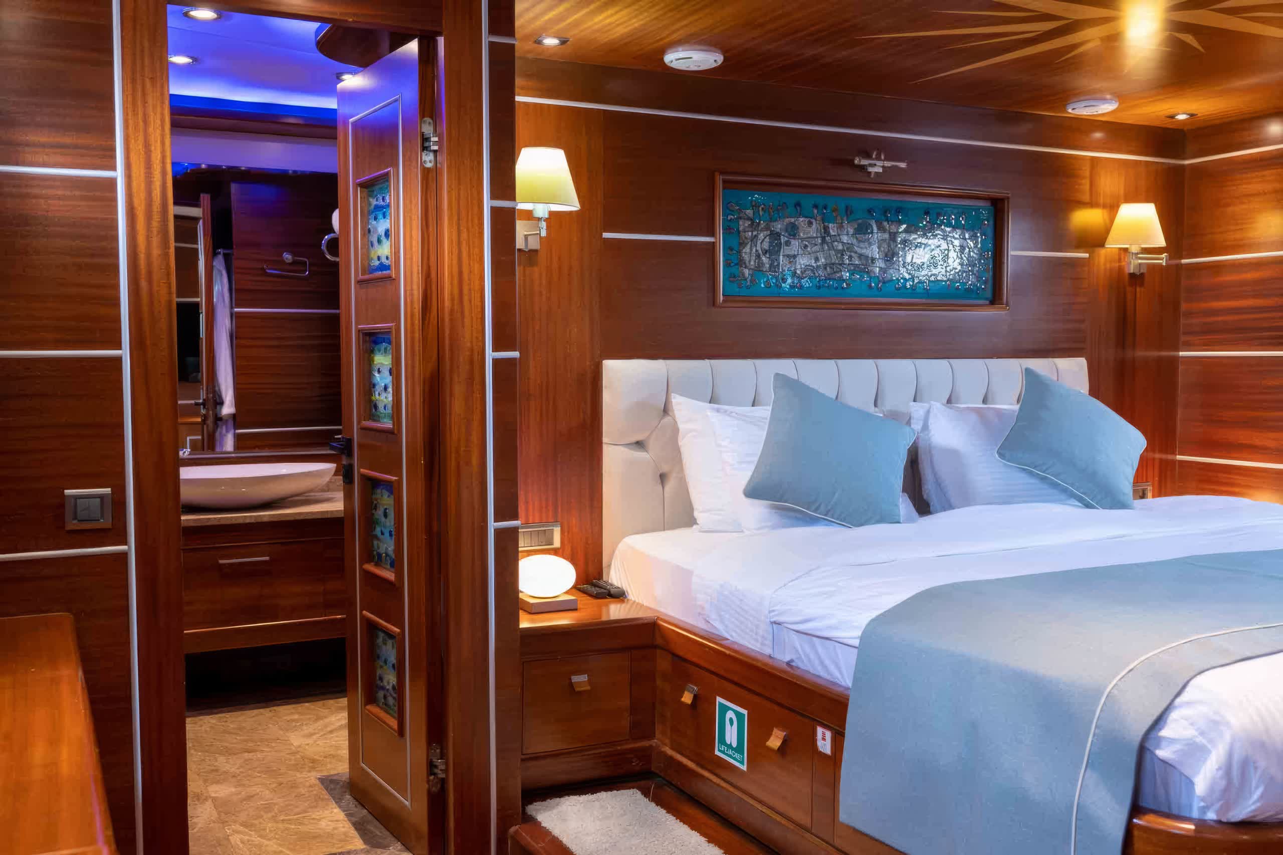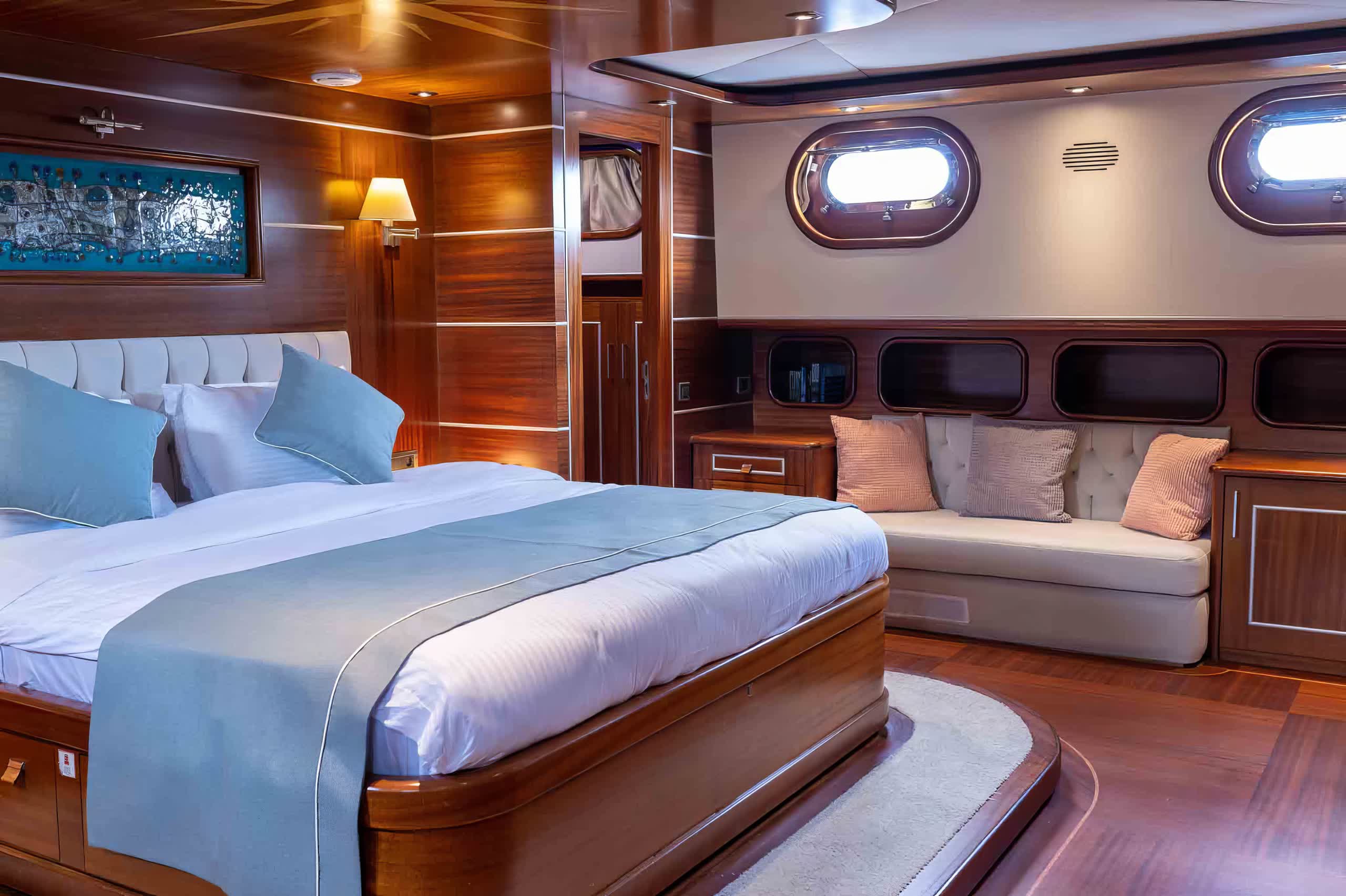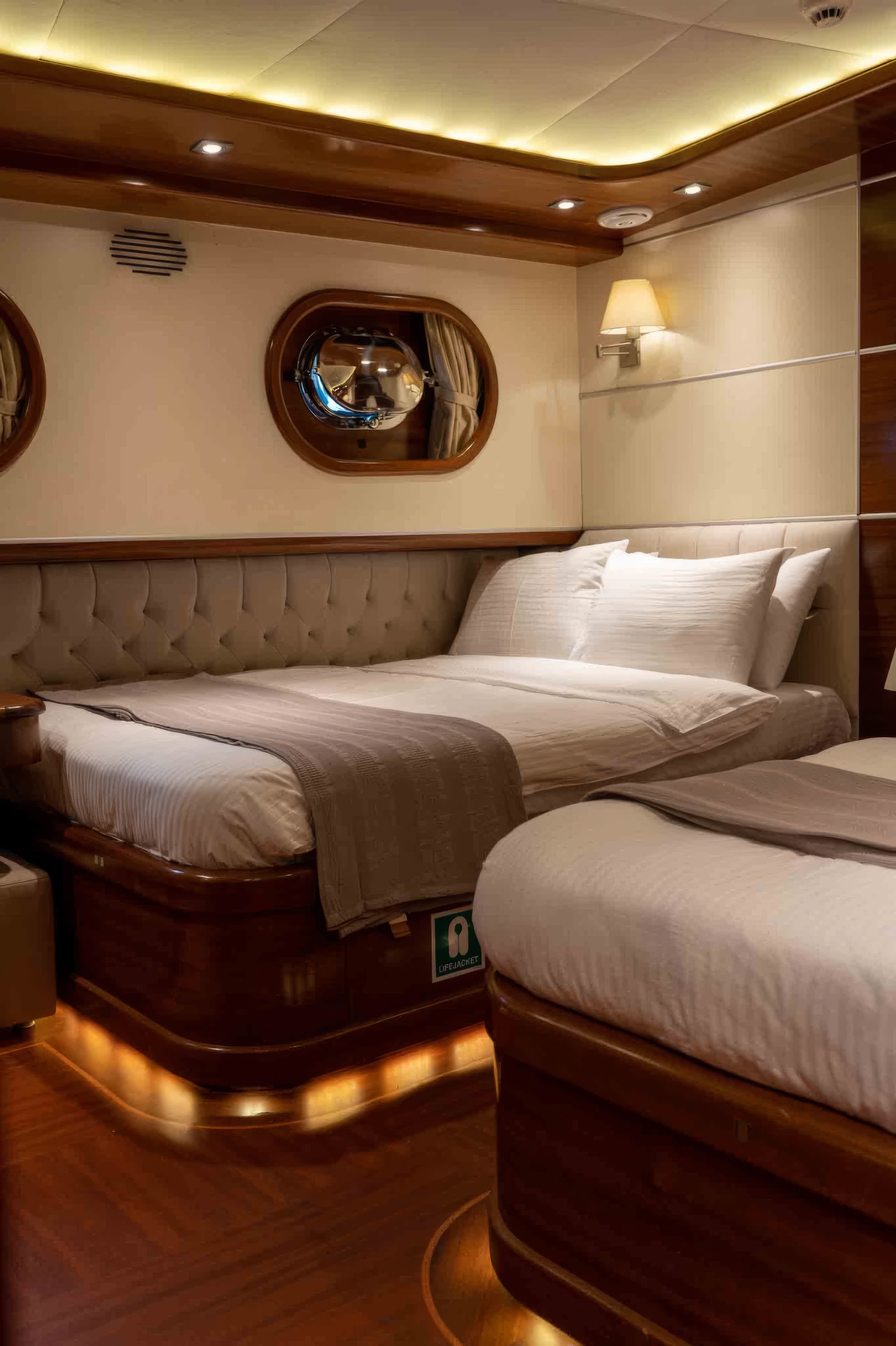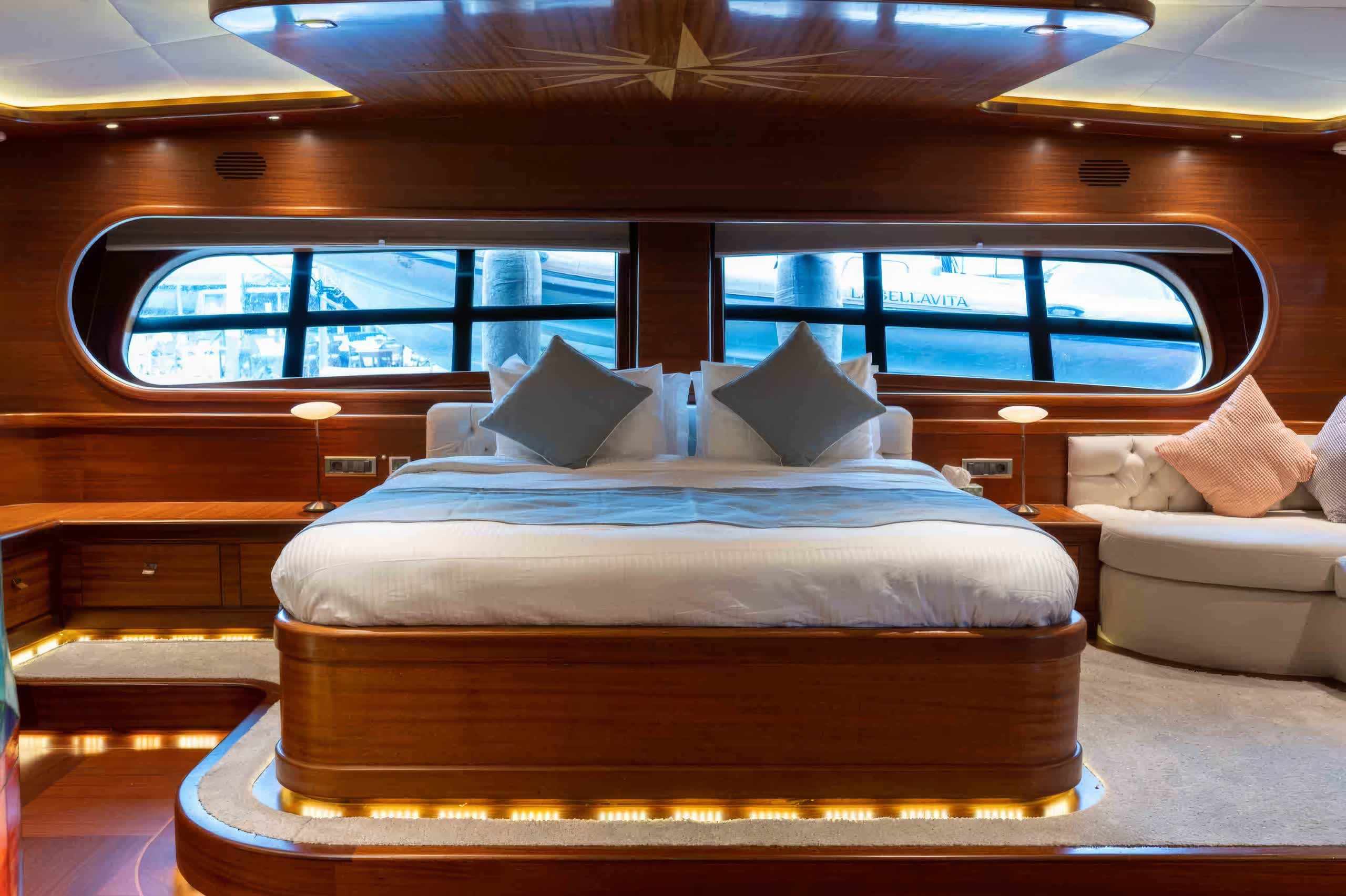 At 47m in length, La Bella Vita is a spacious and elegant yacht with artful detail and craftsmanship. Of particular note is its classic lines and traditional gulet but with a modern twist offering unrivalled hospitality. That rich wood paneling and plush furniture gives La Bella Vita a warm and welcoming feel. The yacht has six superbly-appointed cabins — two master suites, two double cabins and two twin cabins, all with en-suite bathrooms and modern amenities — for up to 12 guests. Cabins are spacious, comfortable, and tastefully decorated, offering a restful retreat after a day of exploring.