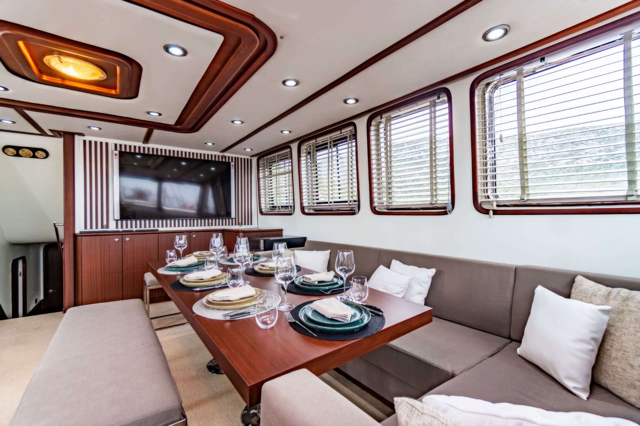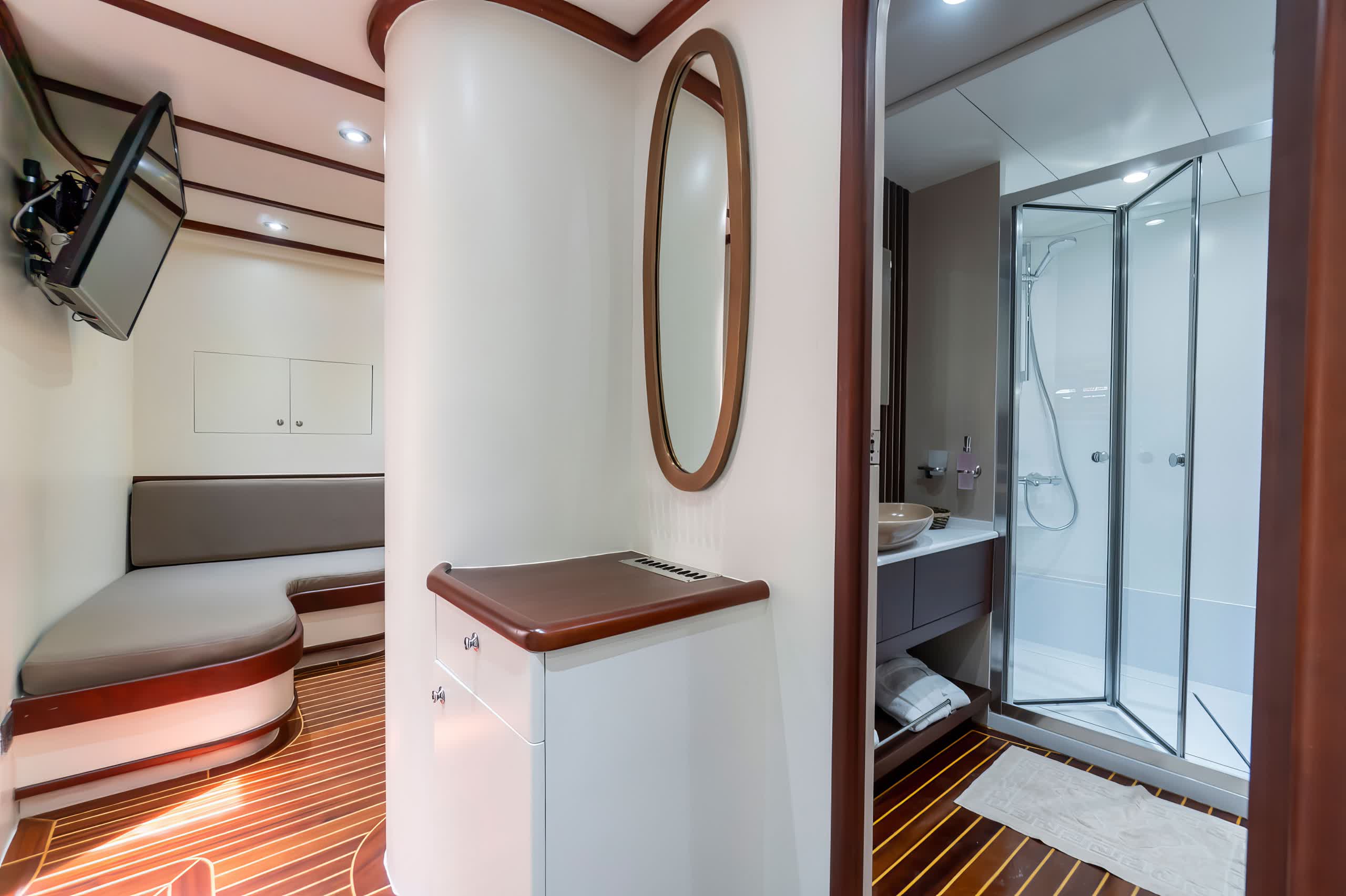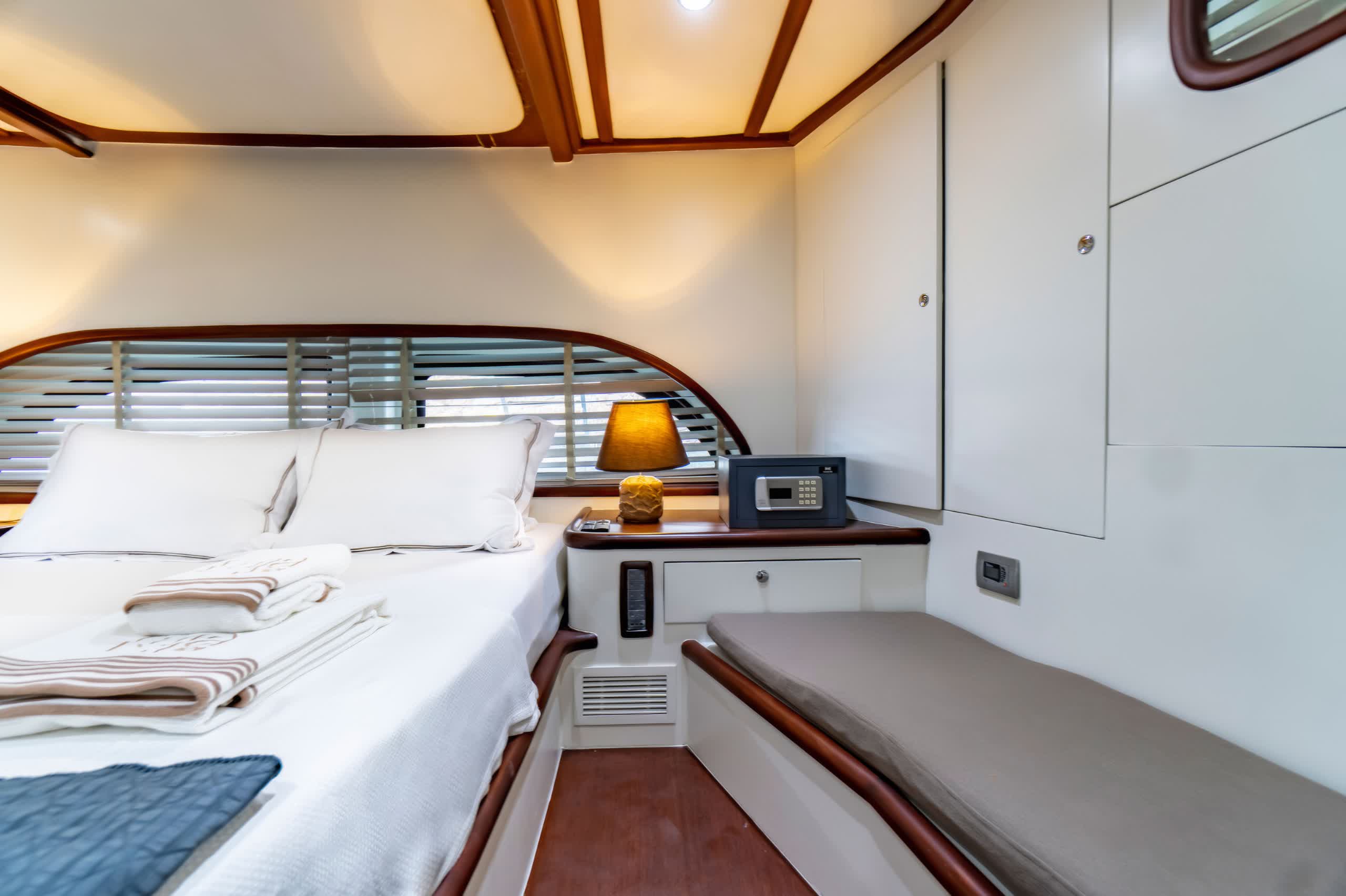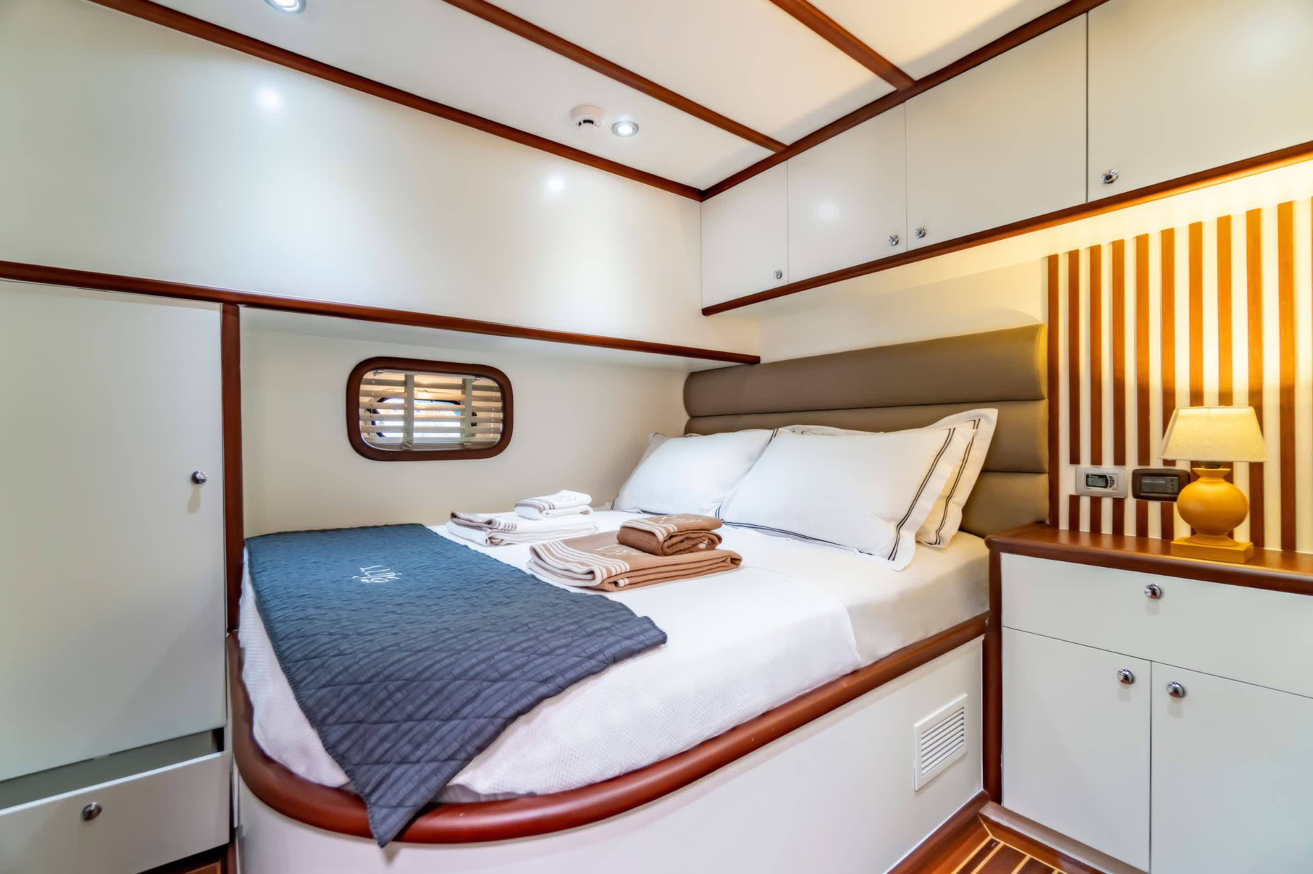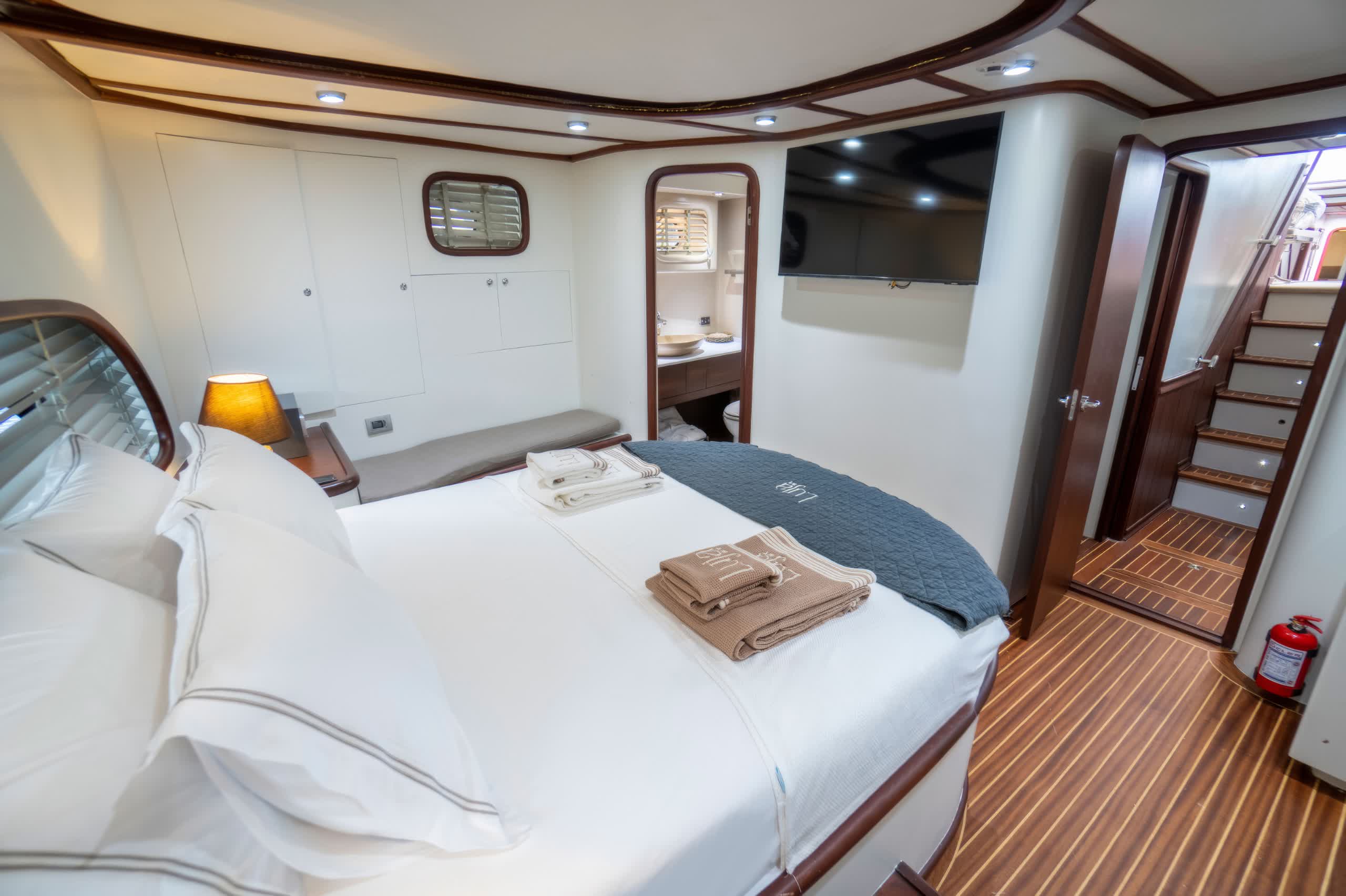 The yacht features lots of deck space and chic interior arrangements. Luja can host up to 8 guests in 4 expansive cabins. Featuring an ample amount of storage and en-suite bathroom facilities are the spacious and luxurious master cabins. The two remaining cabins are doubles, all with en-suite bathrooms and providing guests with privacy and comfort during their stay.