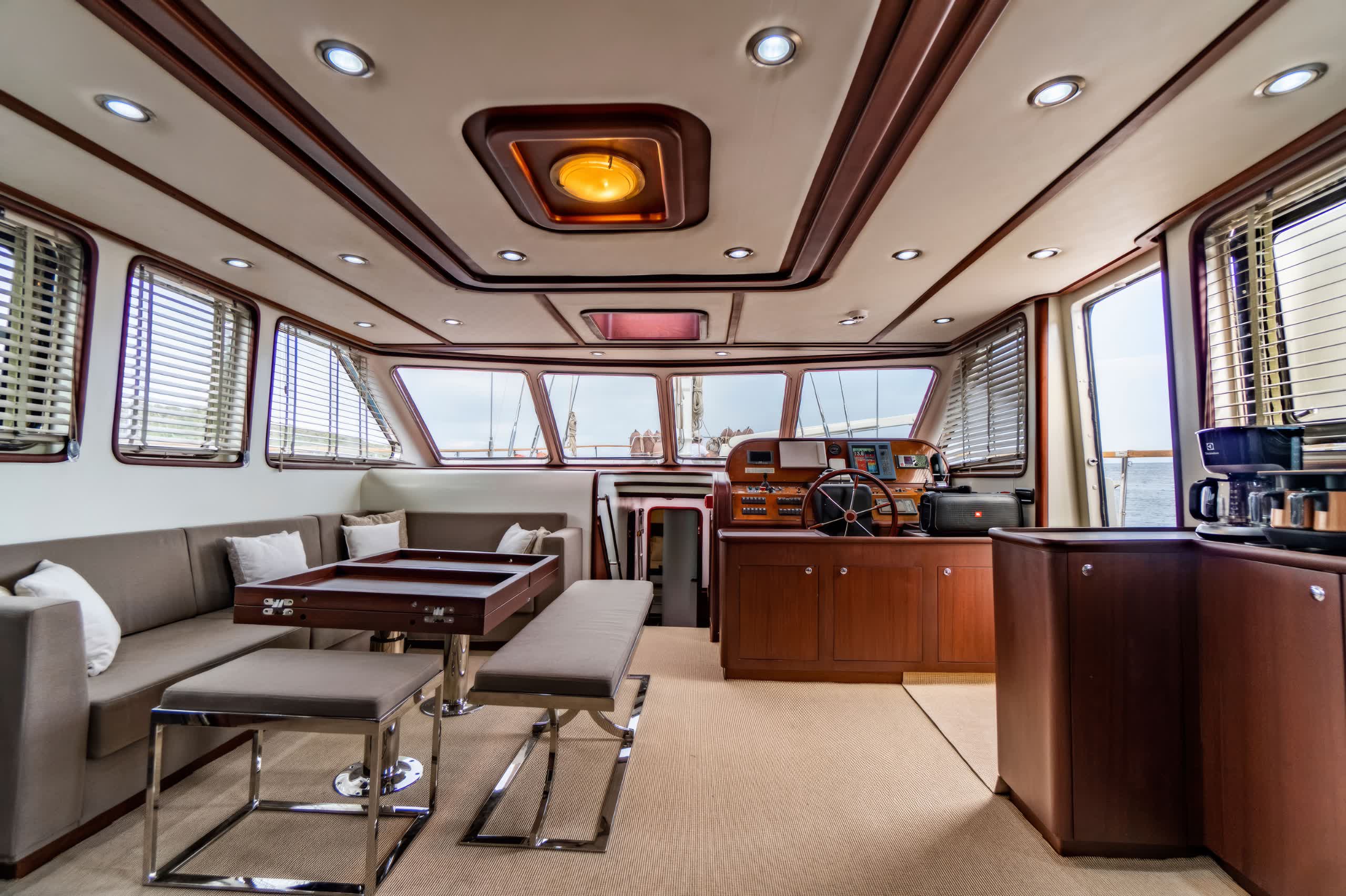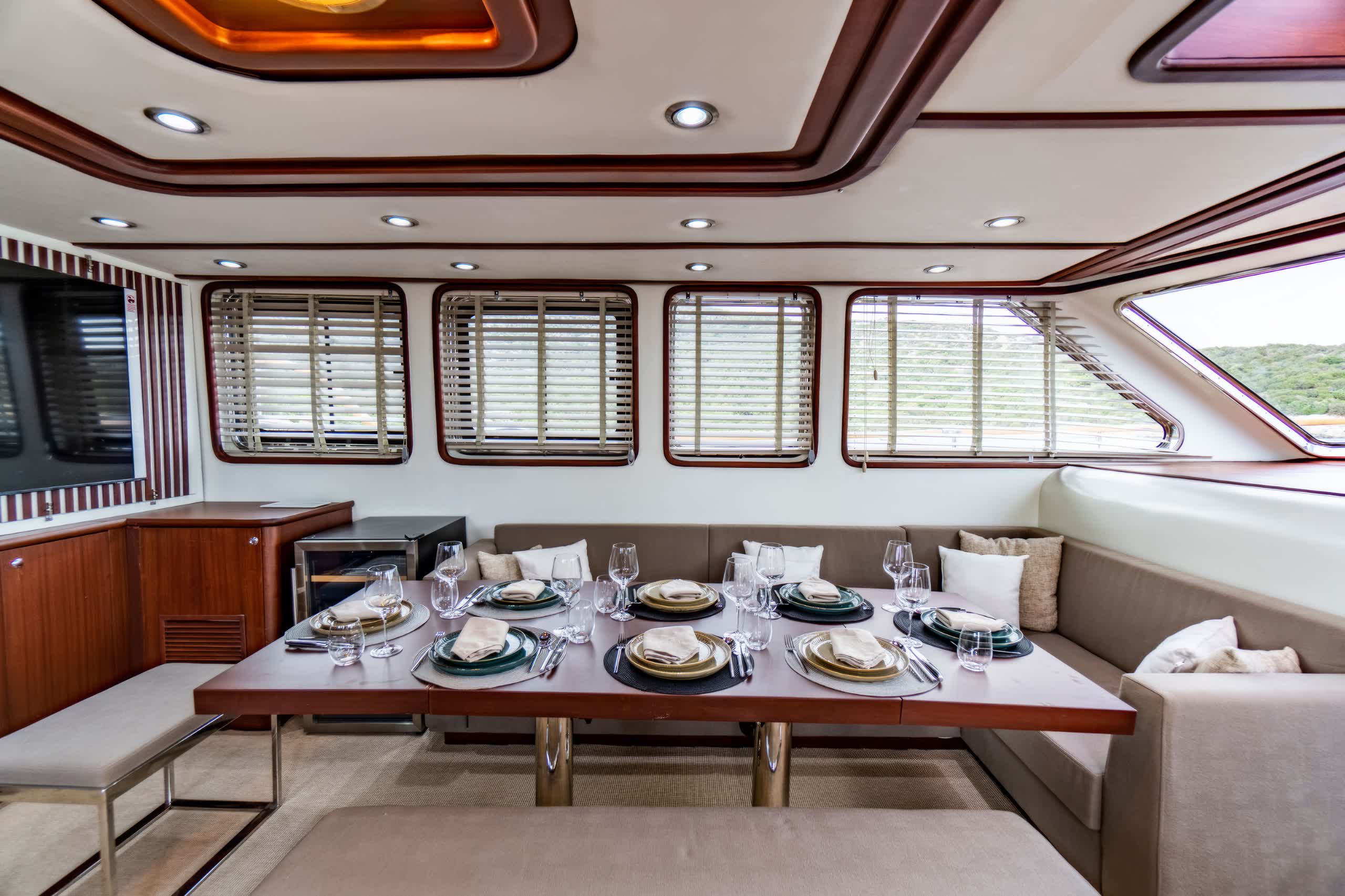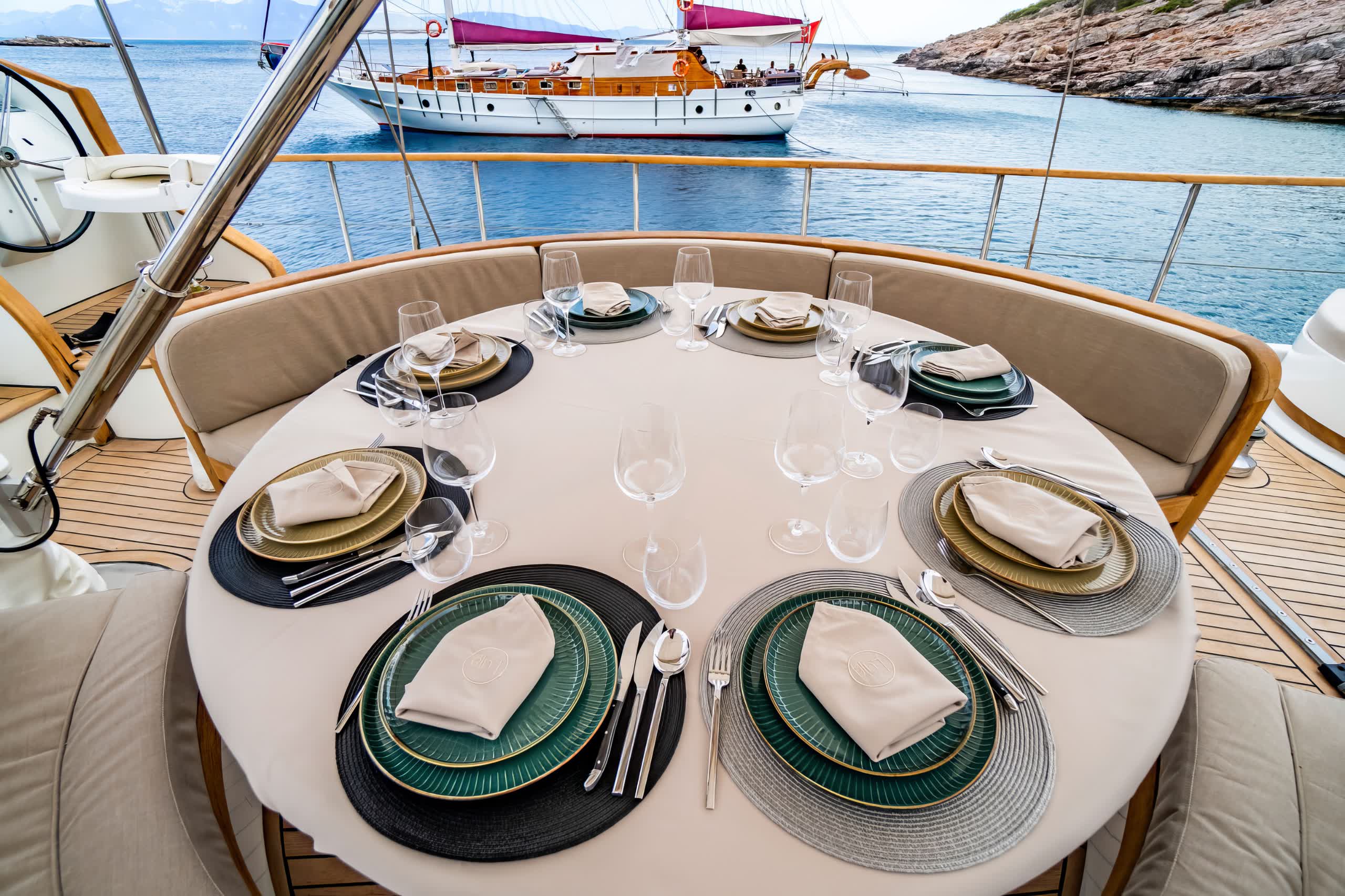 The main salon is an intimate but elegant place to relax with plush seating, a dining space and entertainment equipment. Luja also has plenty of space to unwind or entertain on deck. The aft deck has a big dining table so that guests can eat alfresco meals prepared by an on-board chef. The rear deck has a casual sunbathing area, perfect for lounging in the Mediterranean sun. The design of the yacht allows for ample guest space for socialization and to enjoy the scenery in comfort.