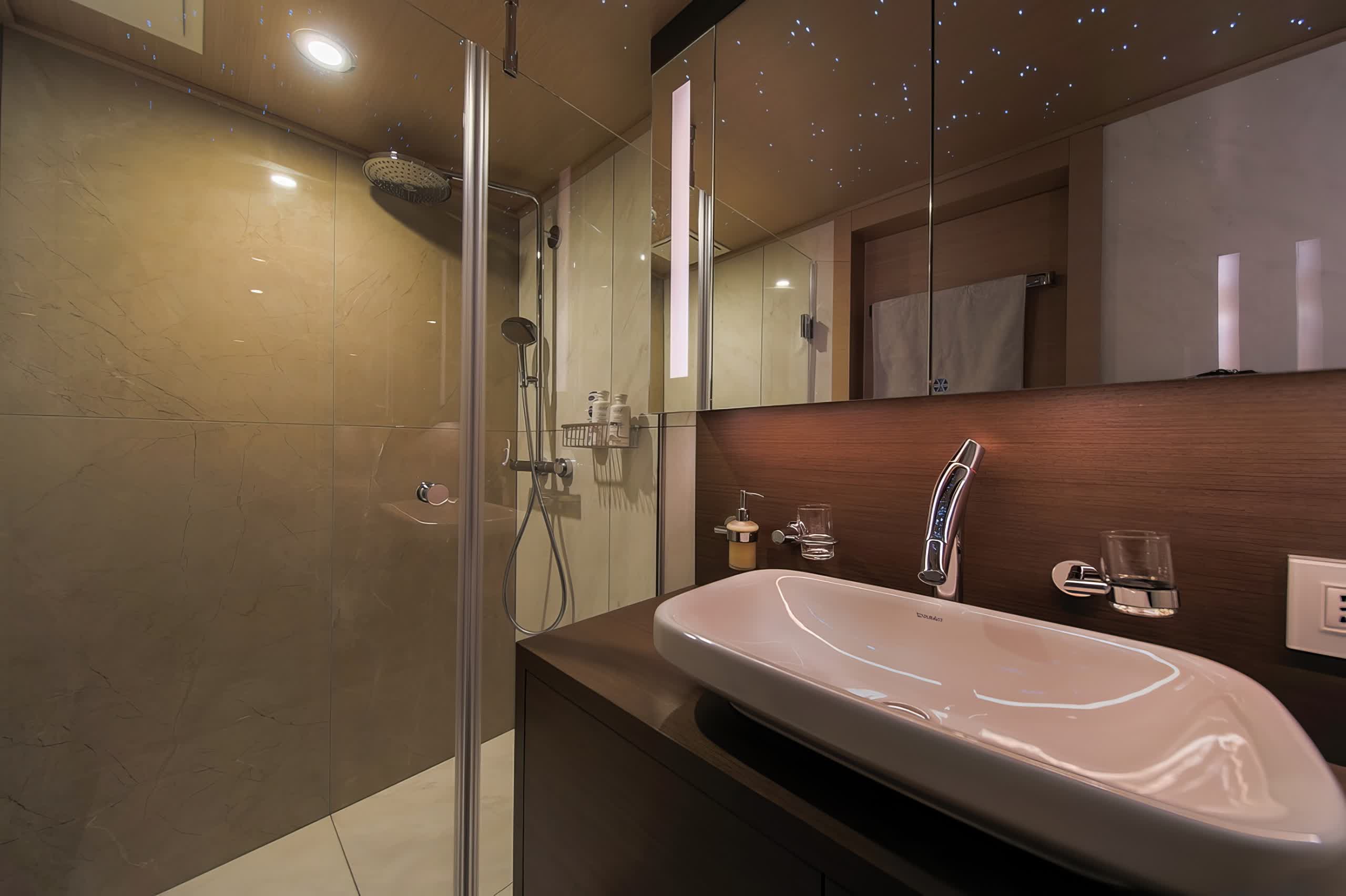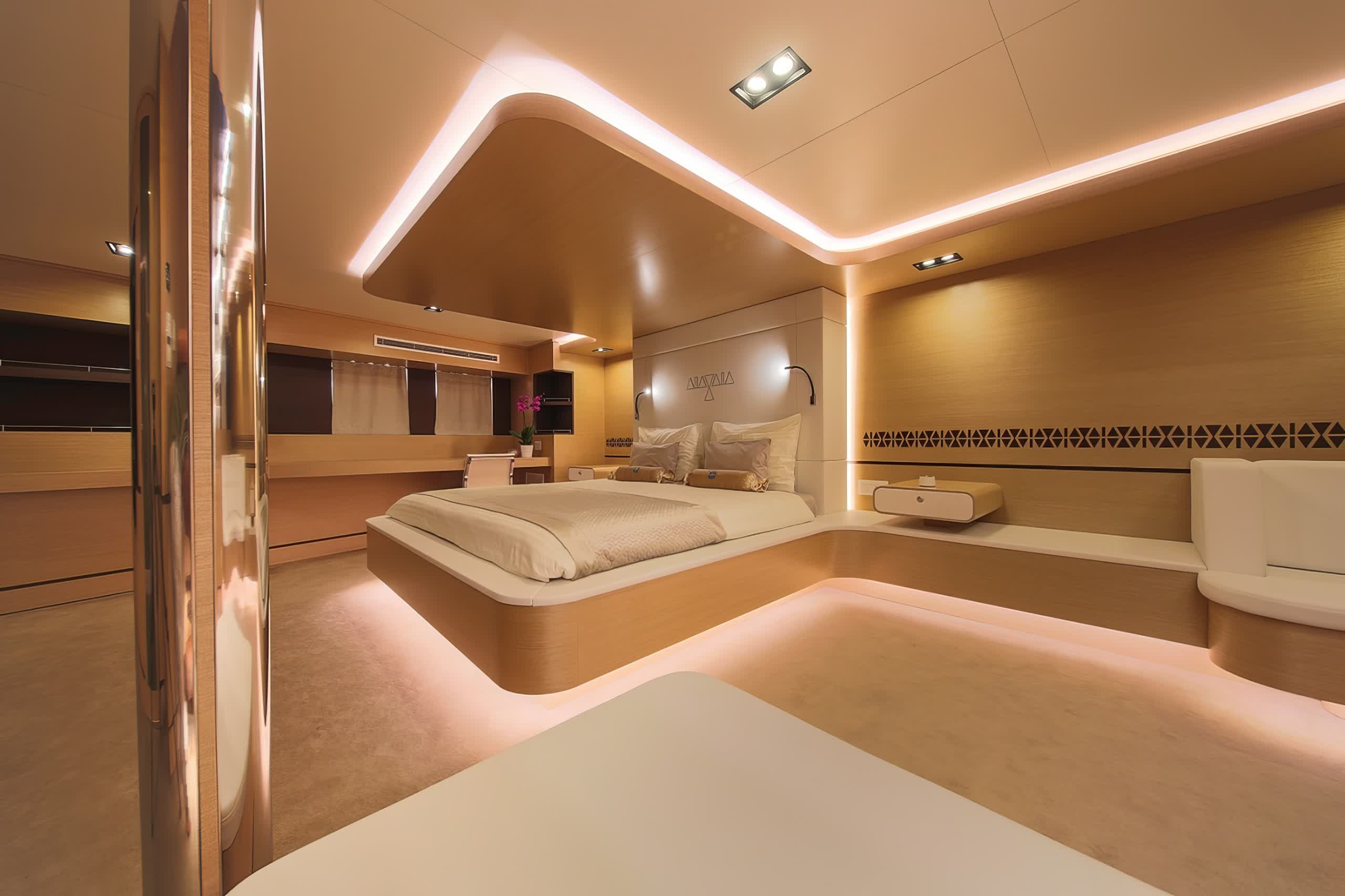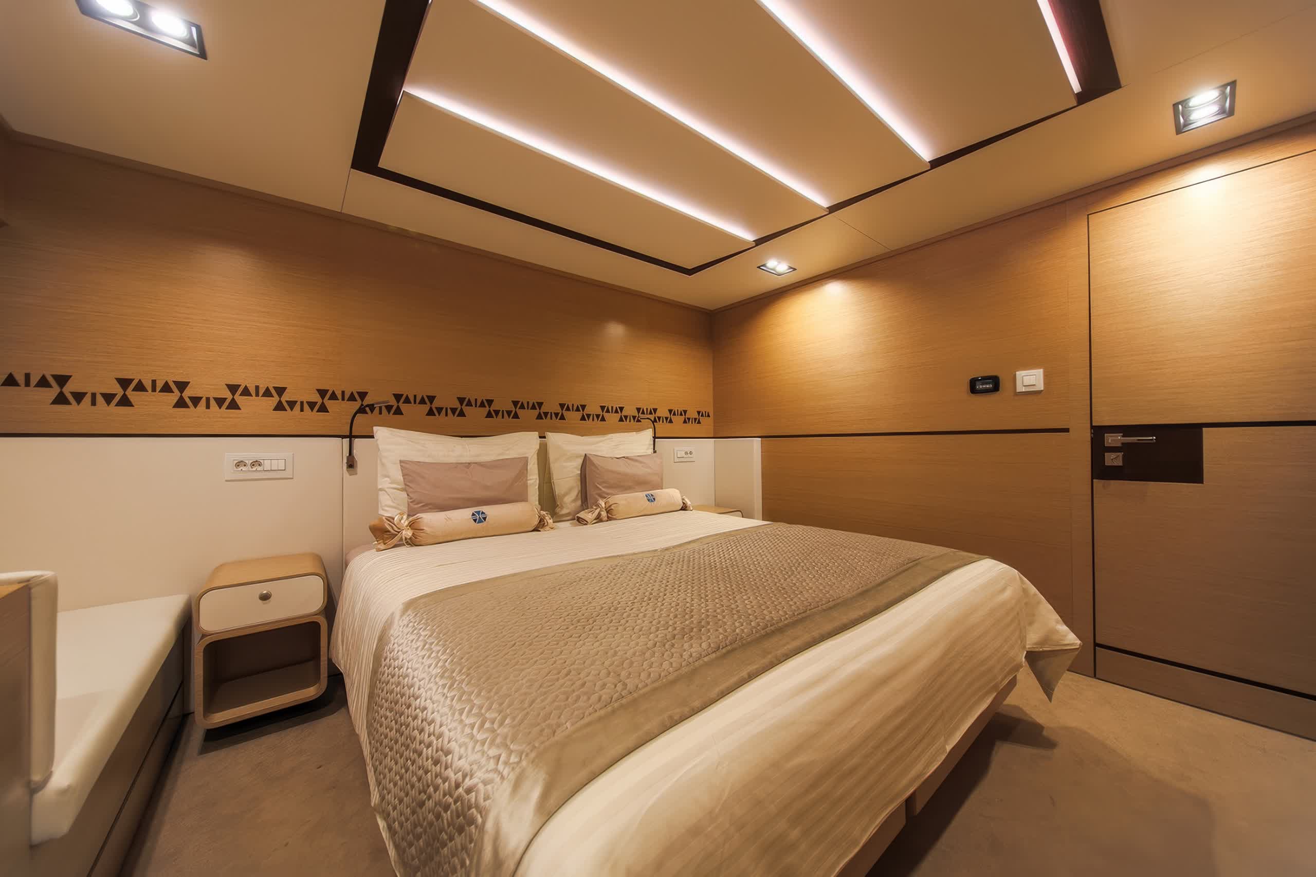 She can accommodate 12 guests across 6 stunning cabins, including a master suite, VIP suite, 2 double cabins and 2 twin cabins. The en-suite bathrooms, air conditioning, and quality furnishing of each cabin allow all the passengers to retreat in comfort and privacy. They include modern structures and warm, inviting interiors with rich wood paneling and contemporary finishes for both luxury and relaxation. Omnia features generously spacious outdoor spaces for all to sit above the water and soak in the scenery. The aft deck includes a huge al fresco dining space, ideal for taking in meals cooked by the professional onboard chef. She boasts an extensive forward deck for sunbathing with sunbeds and a shaded dining area, perfect for enjoying the view over the Turkish coast.