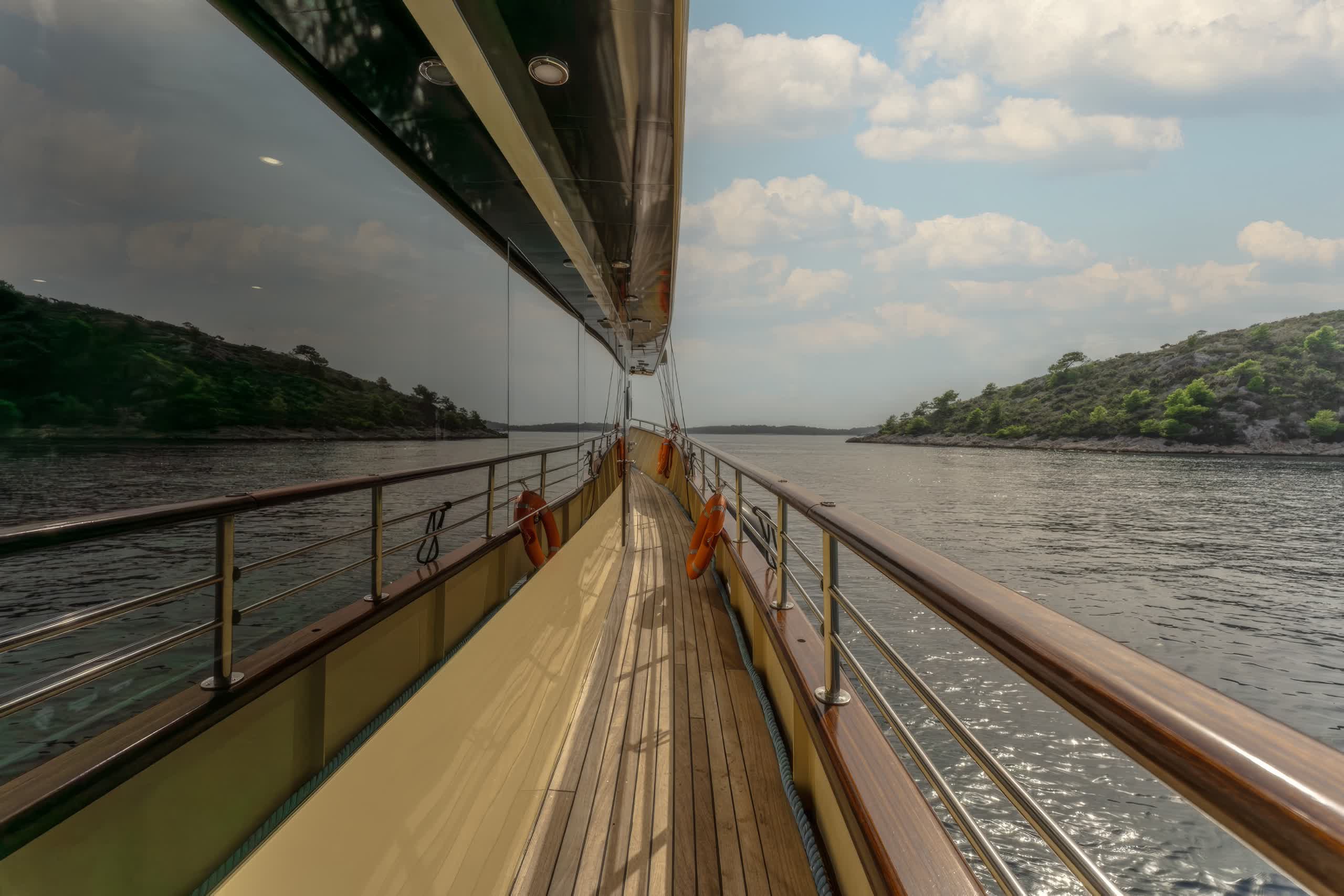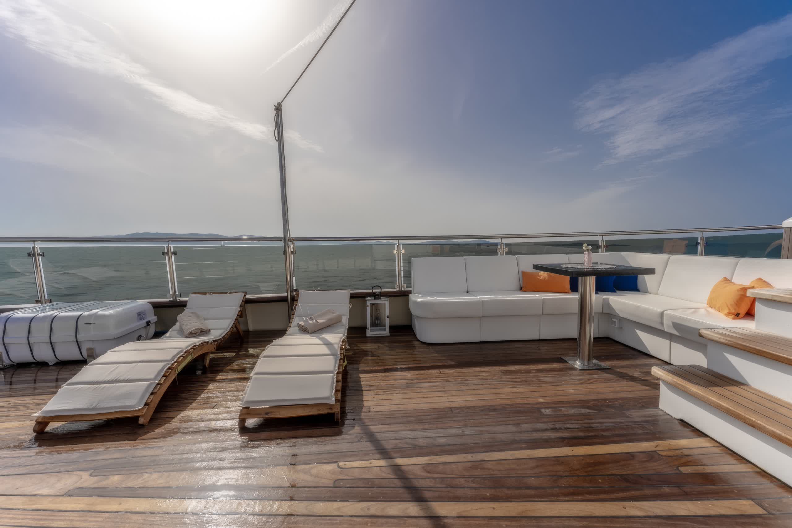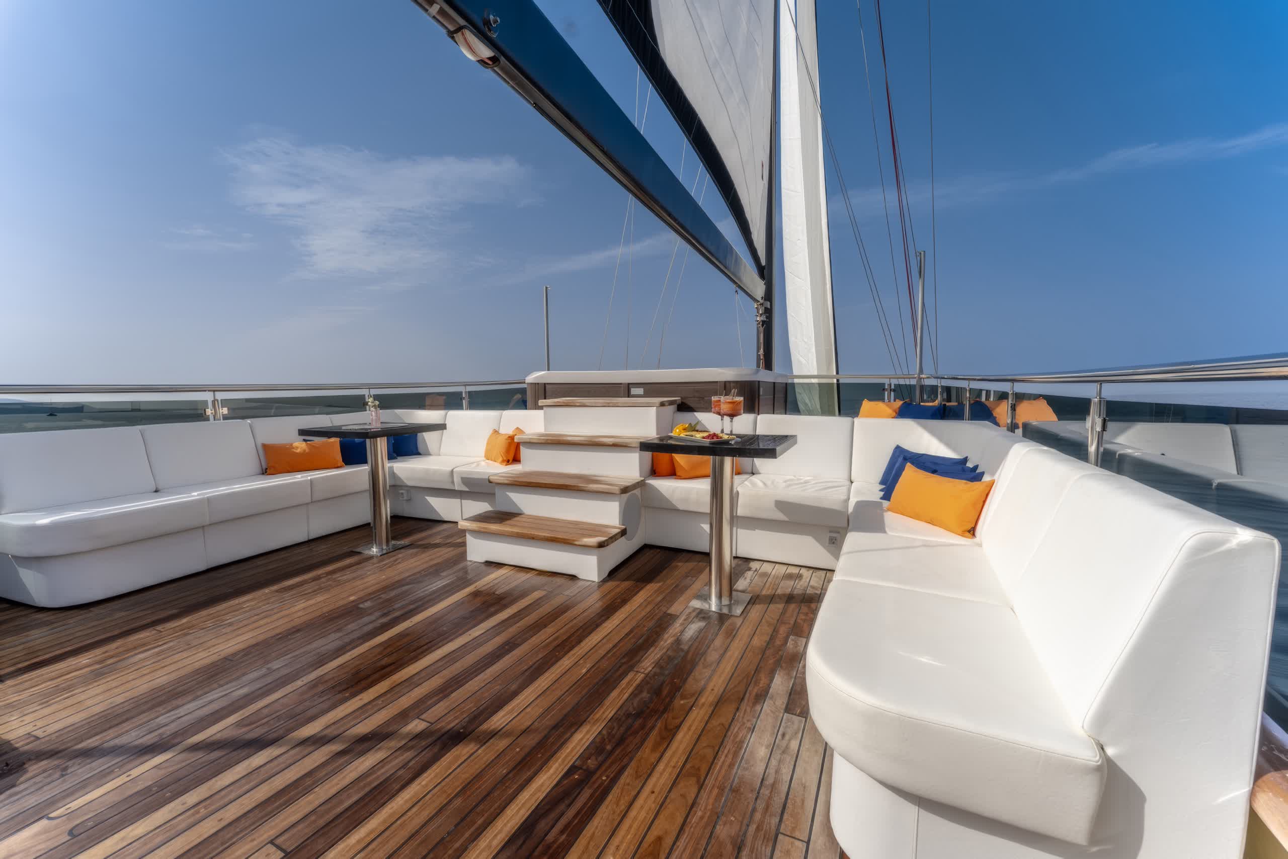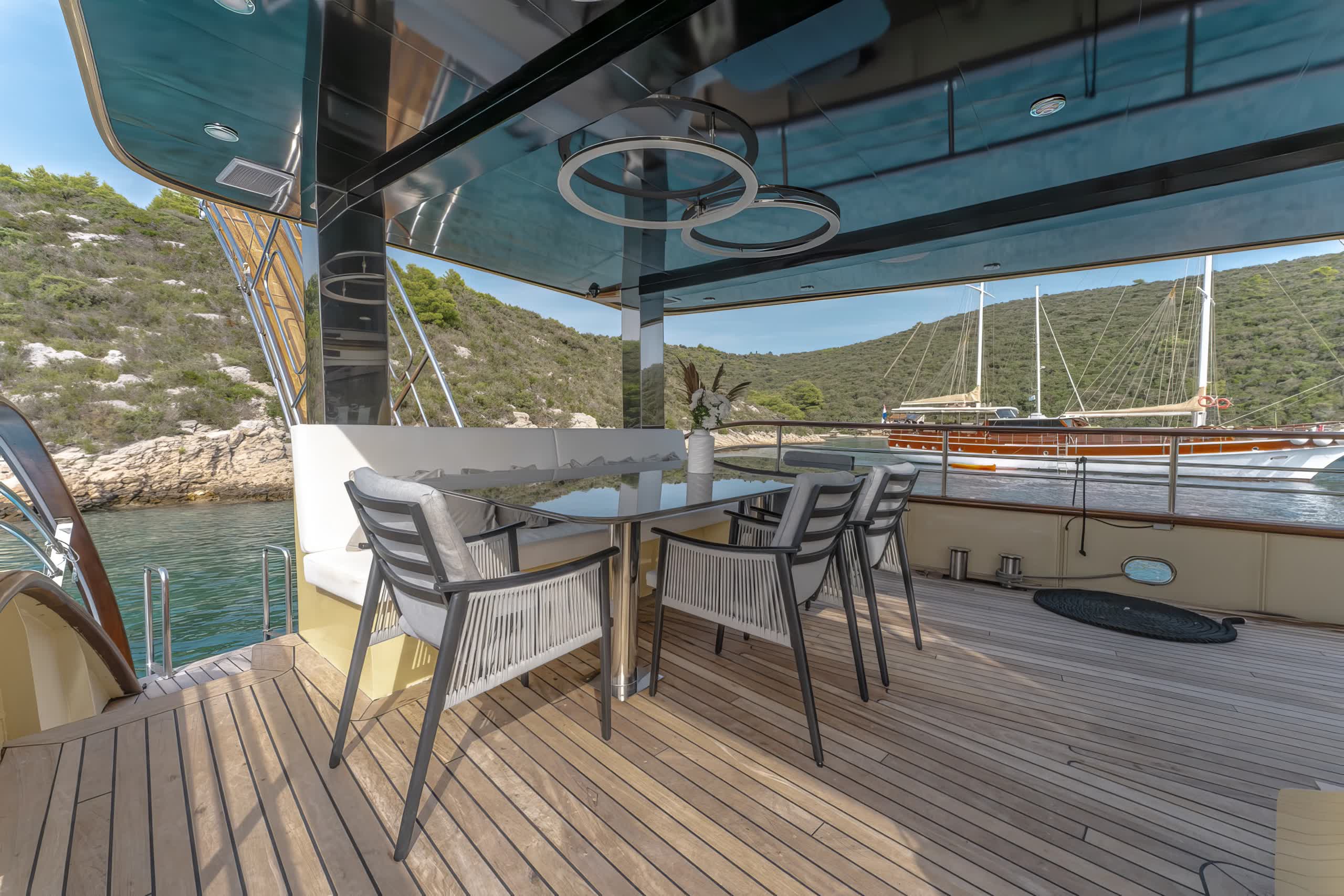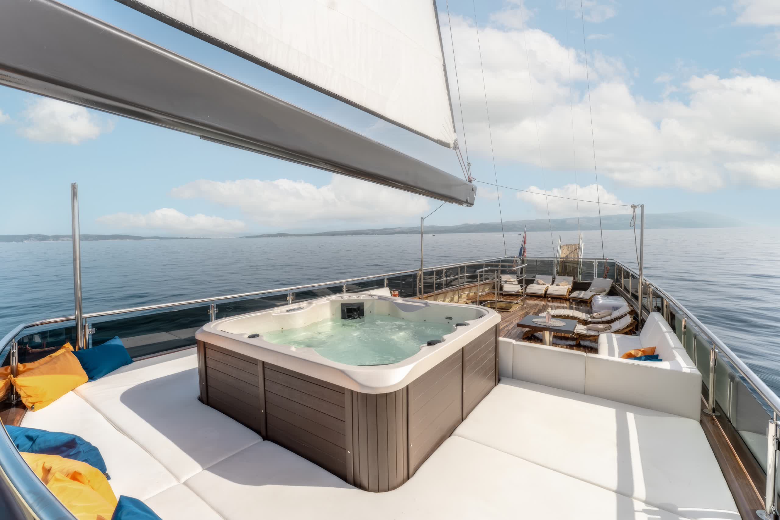 On deck, Santa features an abundance of outdoor living areas, ideal for sunbathing, or simply just lounging and enjoying the scenery of Croatia’s islands and coastal terrain. The aft deck has a al fresco dining option in addition to plenty of space on the forward deck to relax after enjoying gourmet meals made by the onboard chef. A cozy sitting area is also nice to relax, with shade for the warmest hours of the day.
