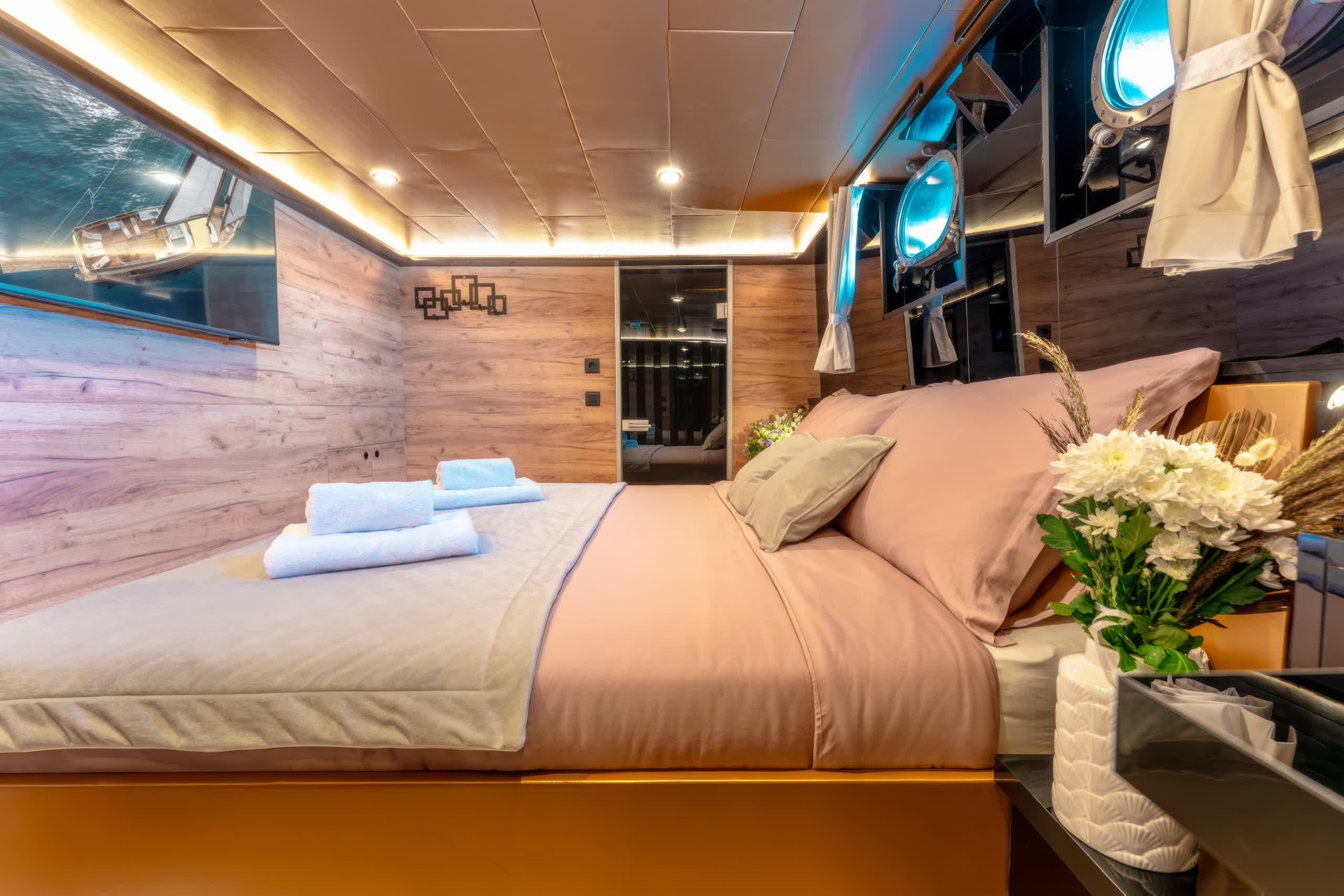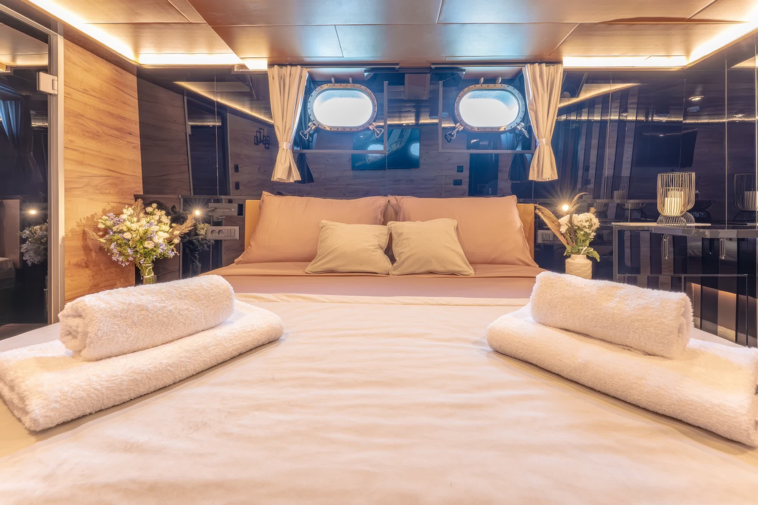 With a length of 27 meters, the Santa accommodates up to 8 guests and boasts plenty of room for them to relax and unwind. The yacht has four stylish cabins, comprising of one twin cabins and three double cabins. Designed for comfort, each cabin is fitted with stylish wood paneling, air conditioning, and en-suite bathrooms with plenty of storage, making for a restful and relaxing atmosphere for all guests.