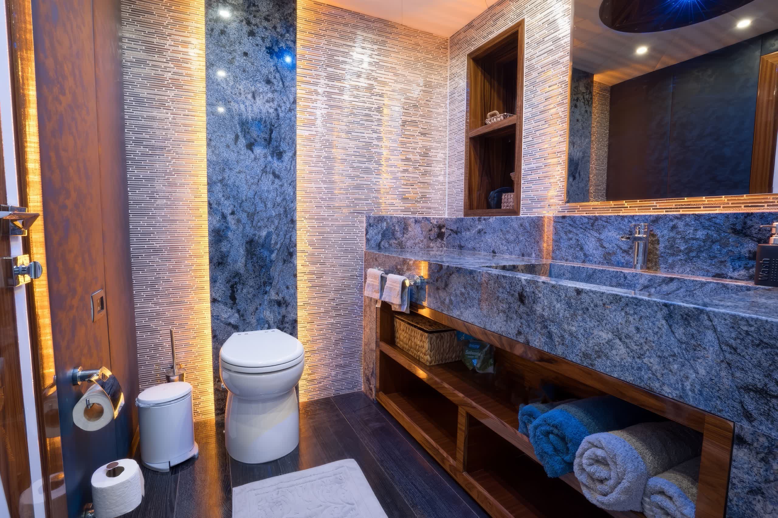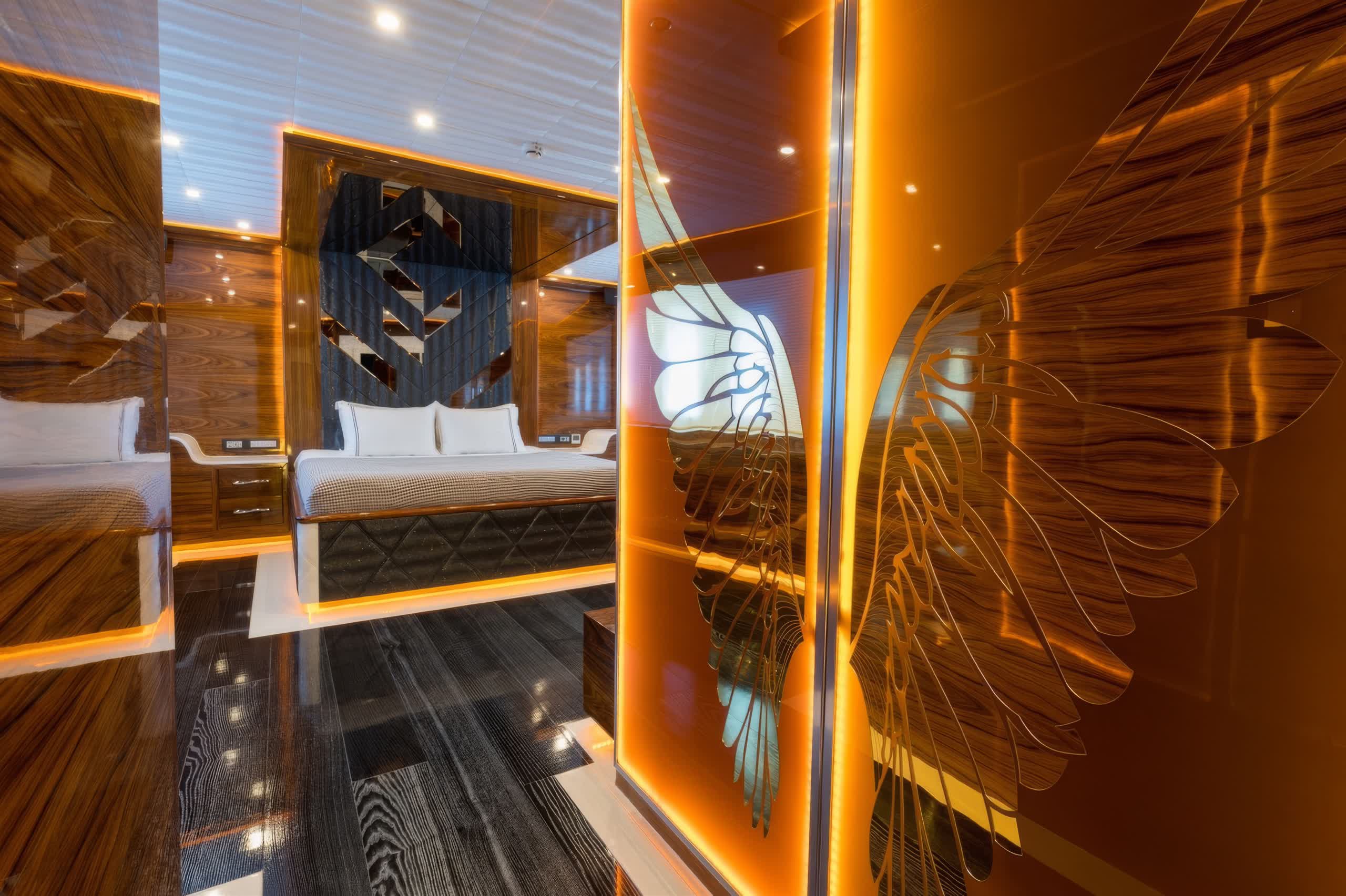 The Son of Wind has five luxurious cabins, with a capacity for 10 guests. All cabins feature modern comforts, including en-suite bathrooms, air-conditioning and high-quality linens. Interiors are refined and cozy, with wood paneling, soft furnishings and an open-plan saloon, which fosters a warm atmosphere in which guests can mingle.
