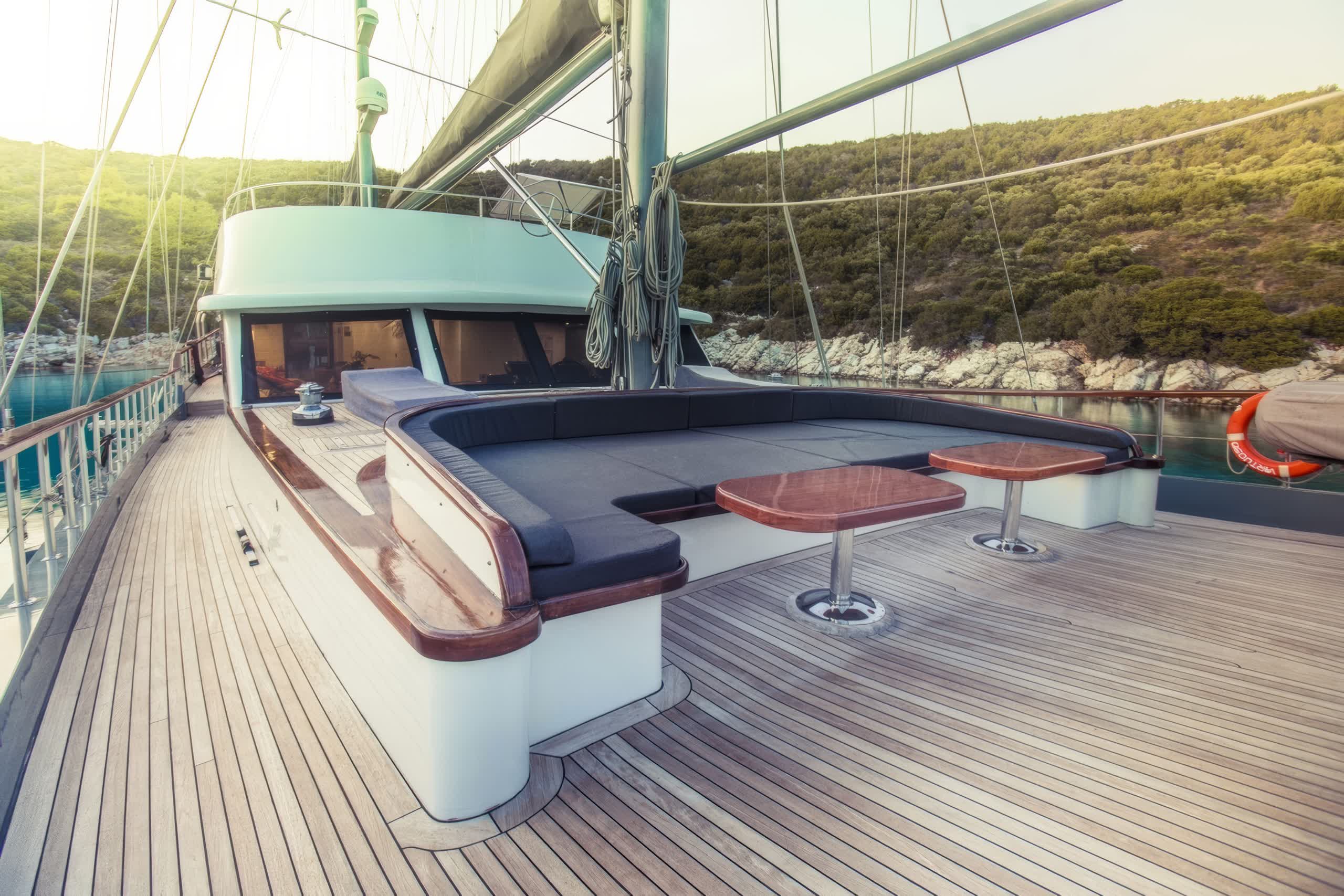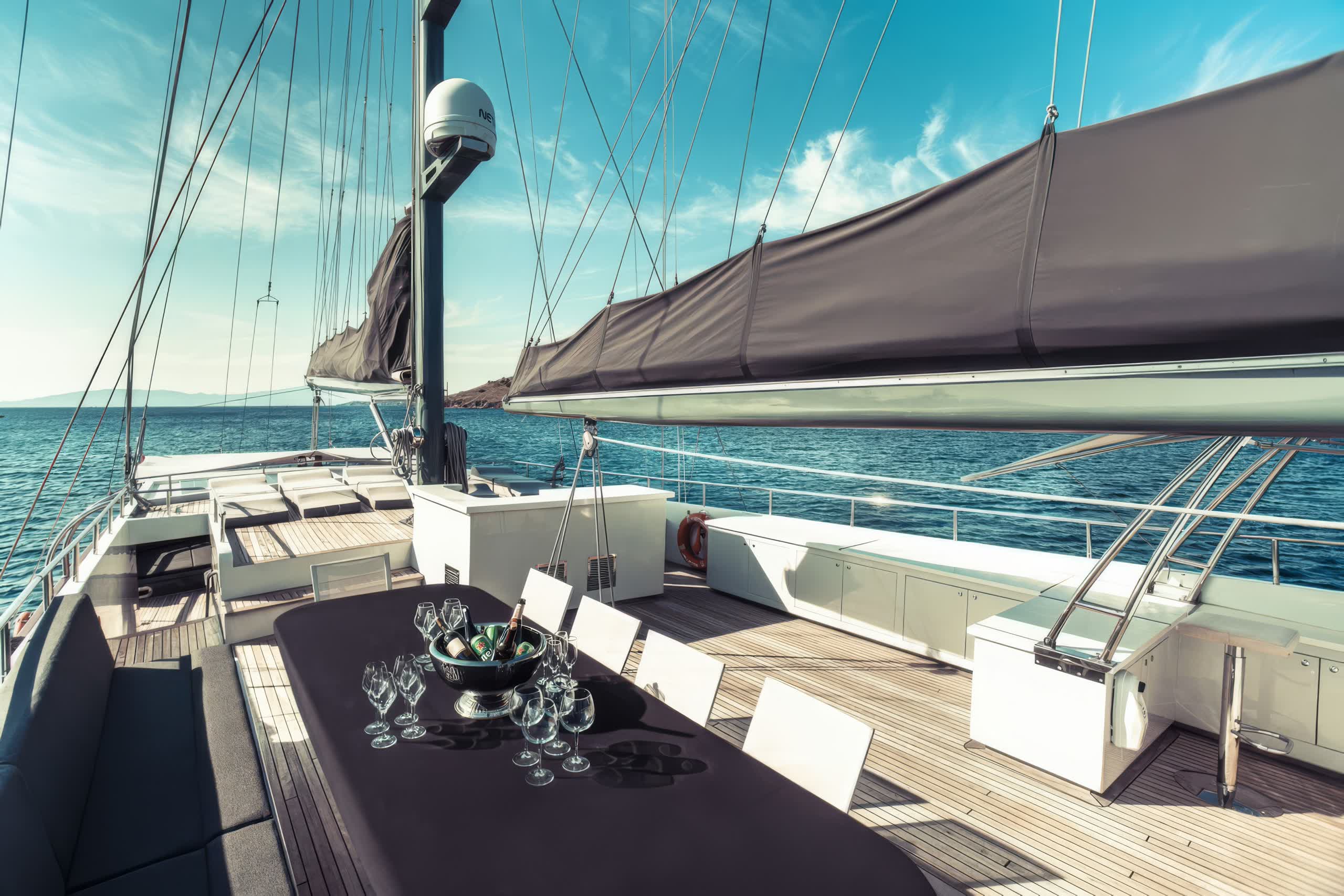 The yacht's interior features a roomy saloon with sweeping windows that fill the room with natural light and provide stunning views. The lounge and dining space are stylishly furnished, creating a casual yet elegant atmosphere. On deck, there are several alfresco dining and lounging opportunities, including an expansive aft deck with a covered dining space, and a forward sun-baked deck for lounging or enjoying the breeze off the water. Virtuoso is also equipped for a variety of water sports such as snorkeling, kayaking and stand-up paddleboarding. Guests can enjoy the crystal-clear waters, with a tender for accessing secluded beaches or islands.The trained staff includes a captain, a chef, and a team of seasoned deckhands, who ensure extraordinary service, from design gourmet meals to organizing bespoke itineraries and events. Maine — whether on a quiet escape or one filled with adventure — the Virtuoso is the perfect backdrop for an unforgettable Mediterranean charter.