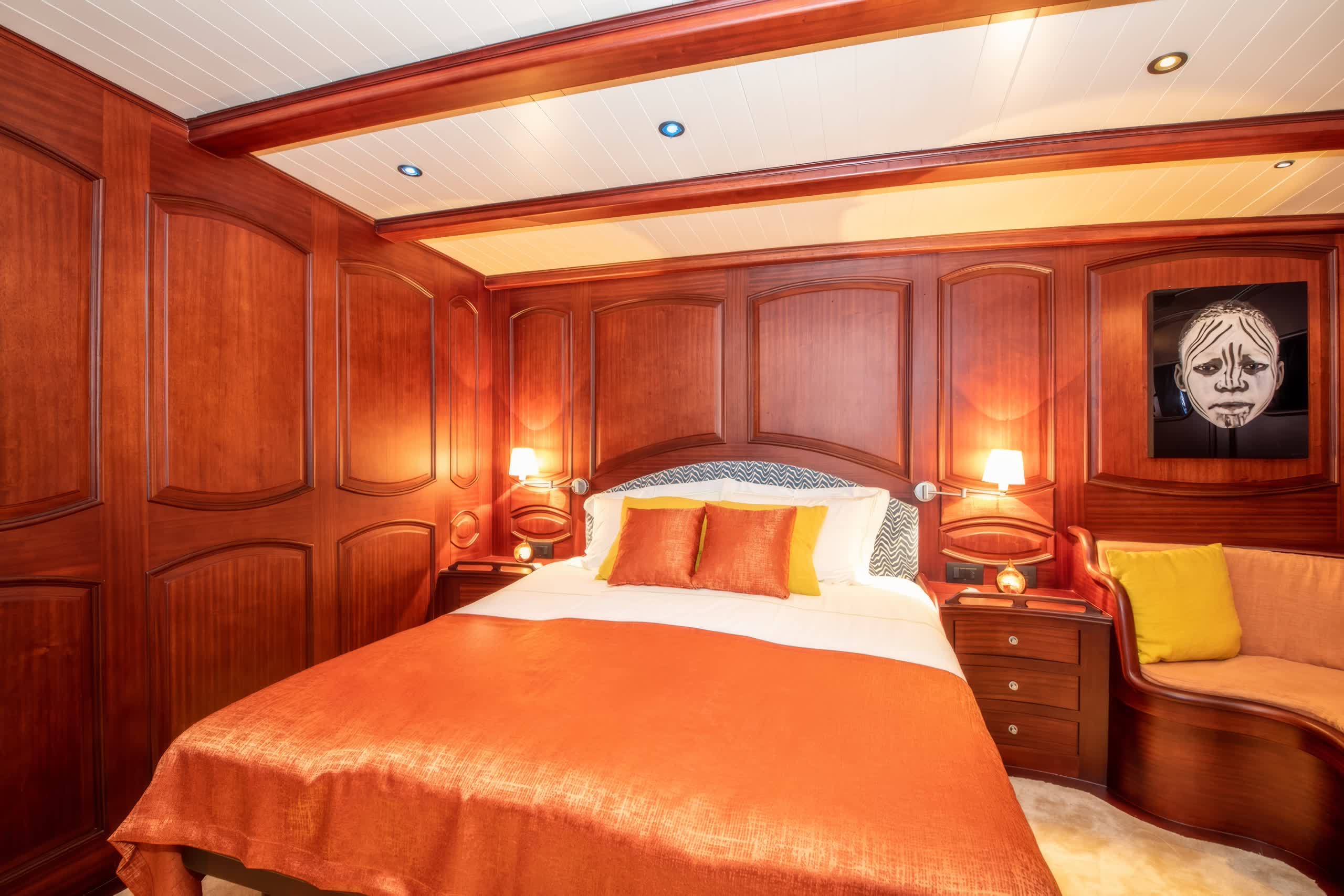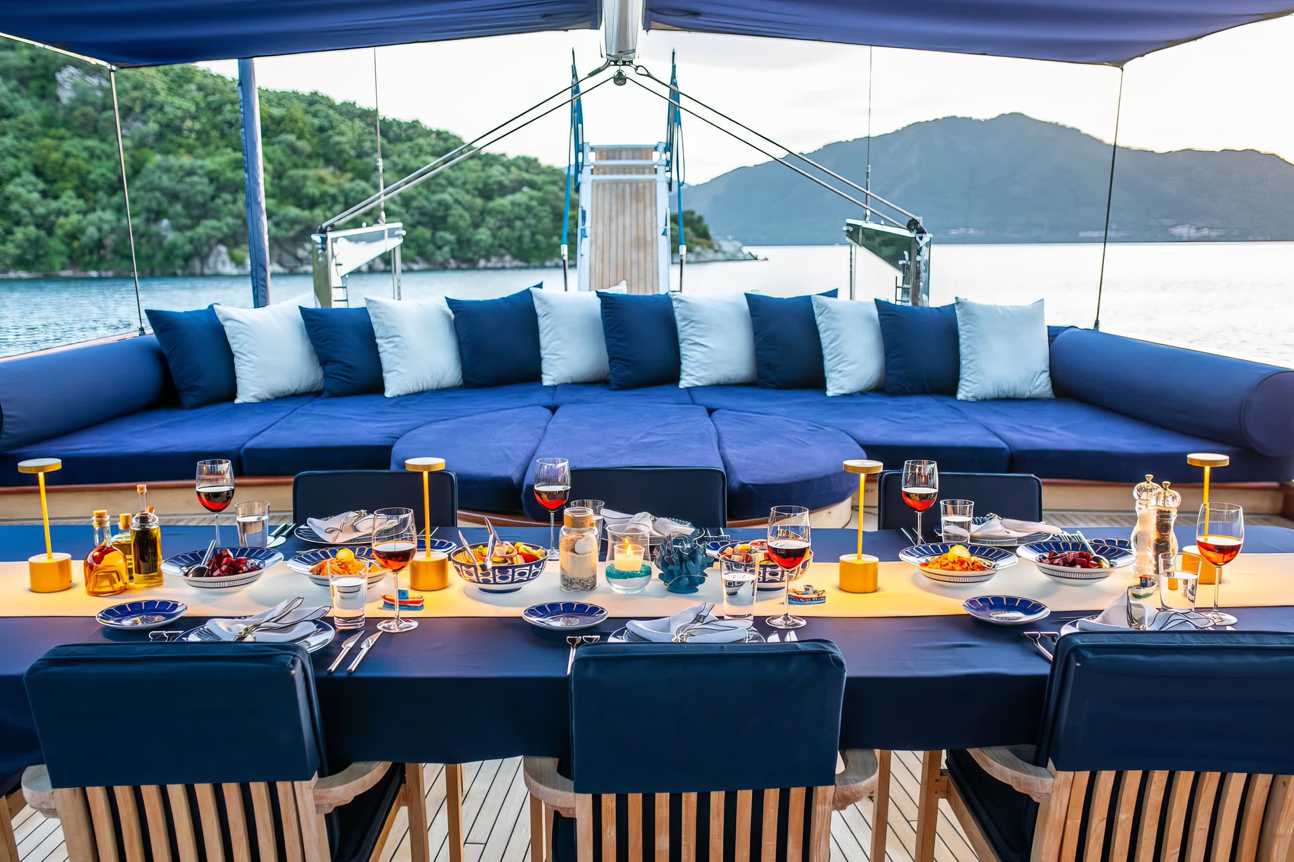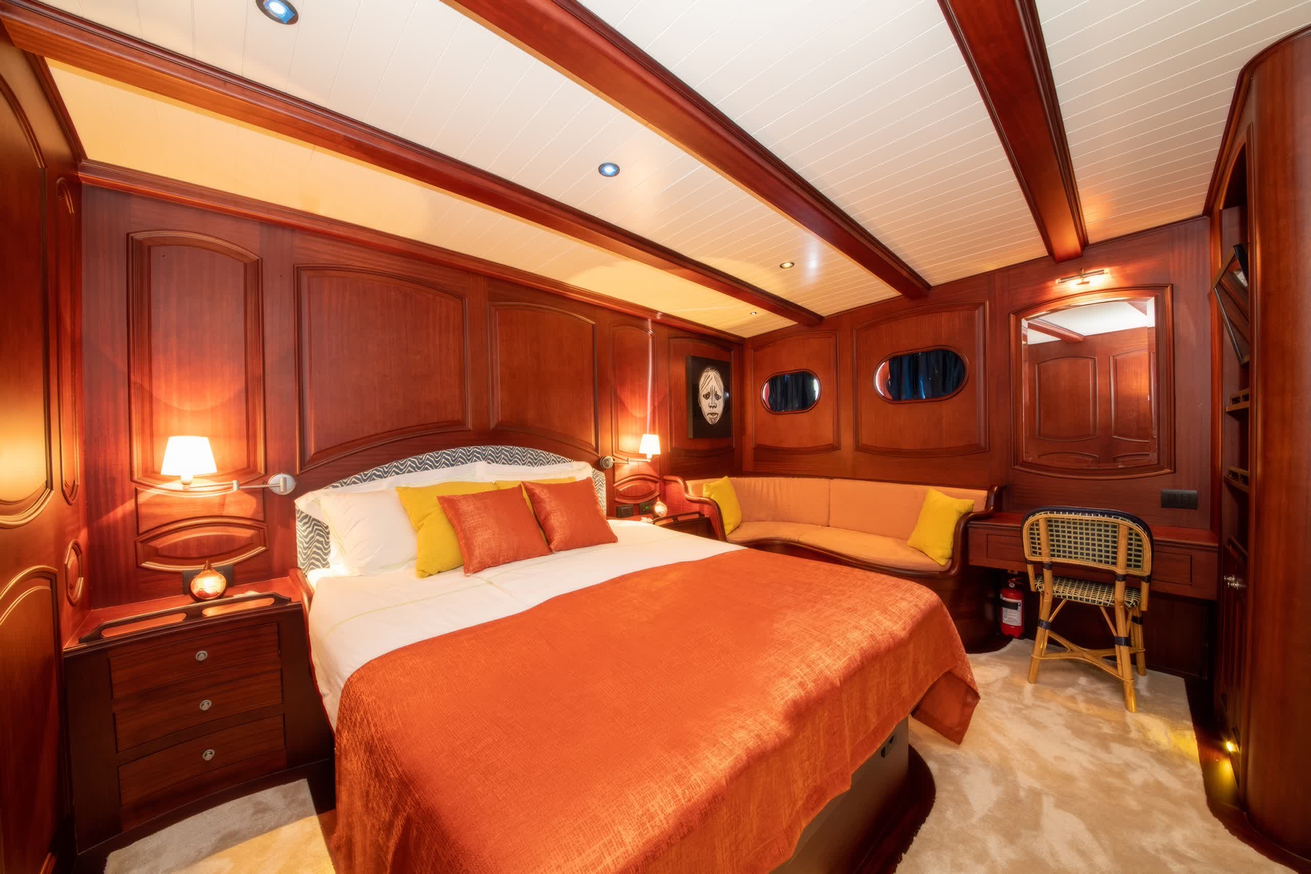 Accommodation is for up to 10 in 5 passenger cabins consisting of a master suite, 2 double cabins and 2 twins. All cabins are air-conditioned with en-suite bathrooms and modern furnishings, providing a comfortable and private environment for guests to relax after a day on the water. The interiors, for instance, are outfitted in a classic nautical style, with warm wood paneling and oversized windows with stunning views of the surrounding sea. There is plenty of room on deck to relax and visit with friends on Voyage. Encompassing a large dining area, the aft deck serves as a prime dining spot for guests to savor the dishes of the yacht's excellent chef. There are comfortable sunbeds on the forward deck and plenty of space available for lounging and sunbathing while enjoying the surrounding views. There’s also an area with shade for guests who want to relax out of the sun.