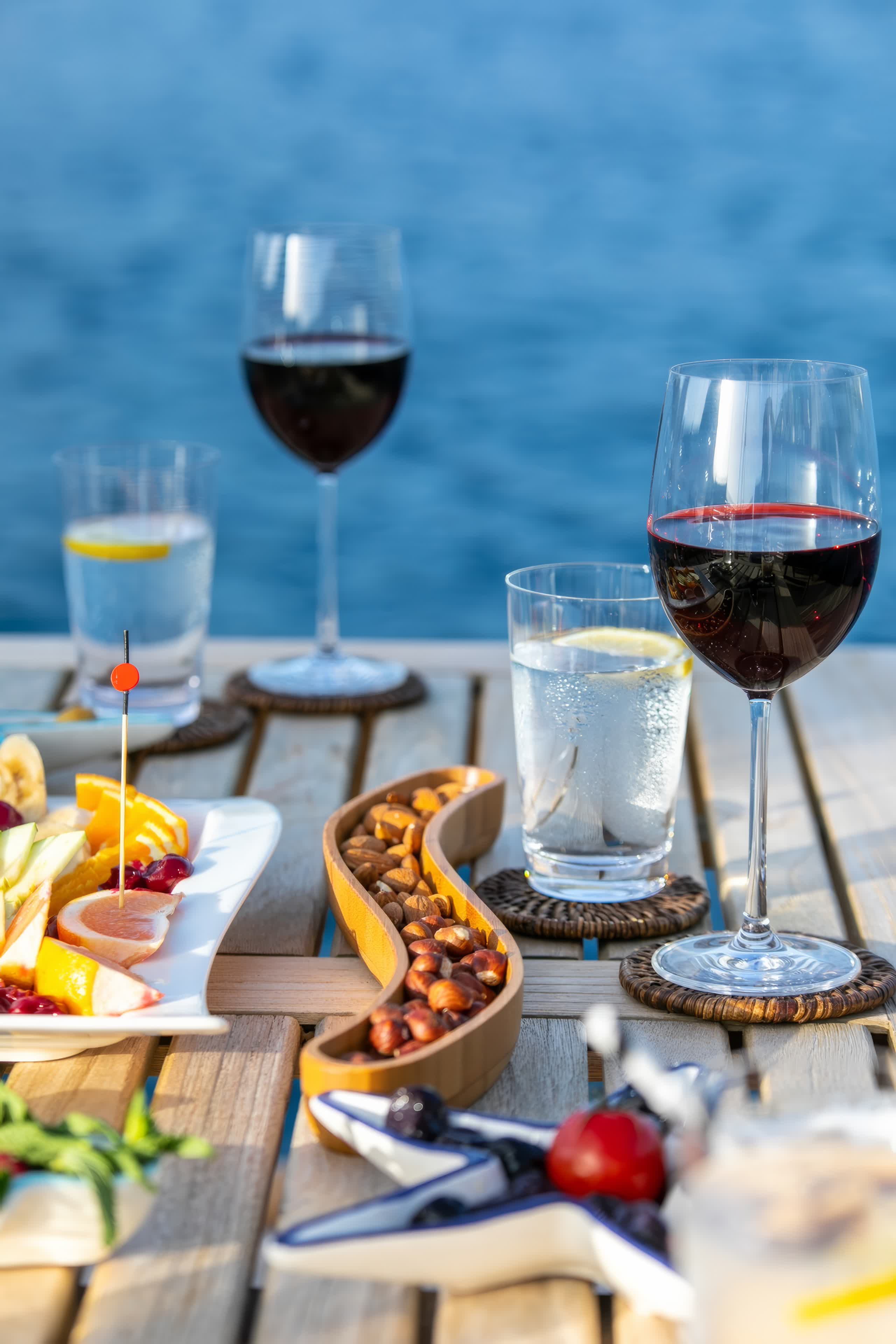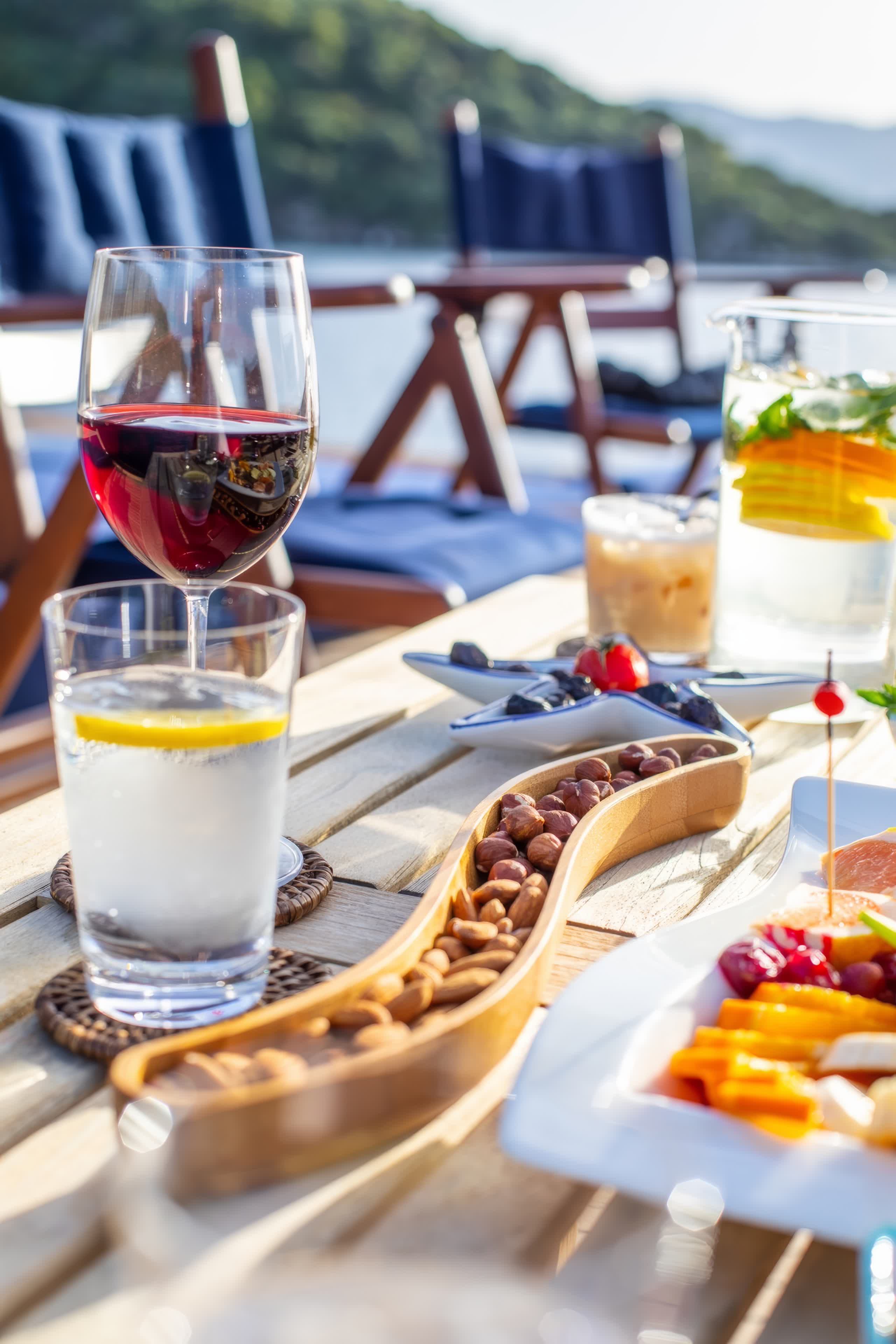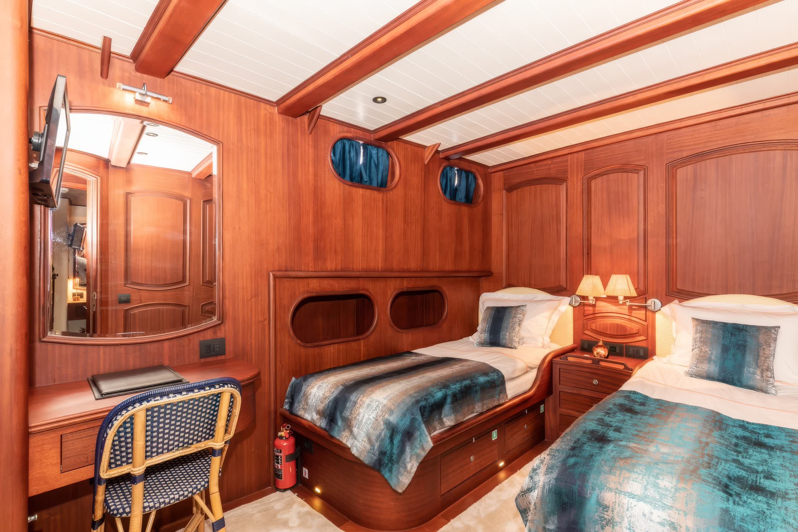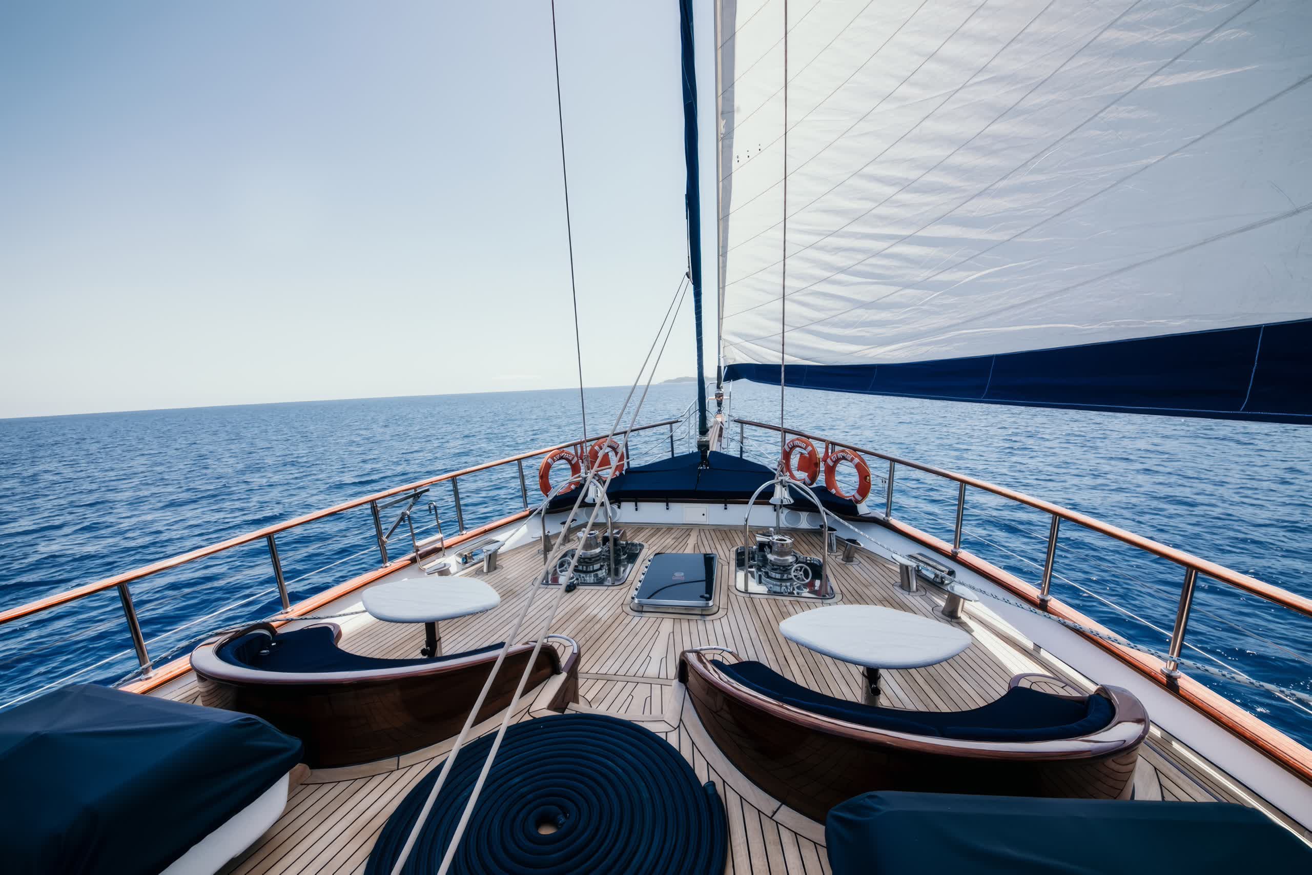 Accommodation is for up to 10 in 5 passenger cabins consisting of a master suite, 2 double cabins and 2 twins. All cabins are air-conditioned with en-suite bathrooms and modern furnishings, providing a comfortable and private environment for guests to relax after a day on the water. The interiors, for instance, are outfitted in a classic nautical style, with warm wood paneling and oversized windows with stunning views of the surrounding sea. There is plenty of room on deck to relax and visit with friends on Voyage. Encompassing a large dining area, the aft deck serves as a prime dining spot for guests to savor the dishes of the yacht's excellent chef. There are comfortable sunbeds on the forward deck and plenty of space available for lounging and sunbathing while enjoying the surrounding views. There’s also an area with shade for guests who want to relax out of the sun.