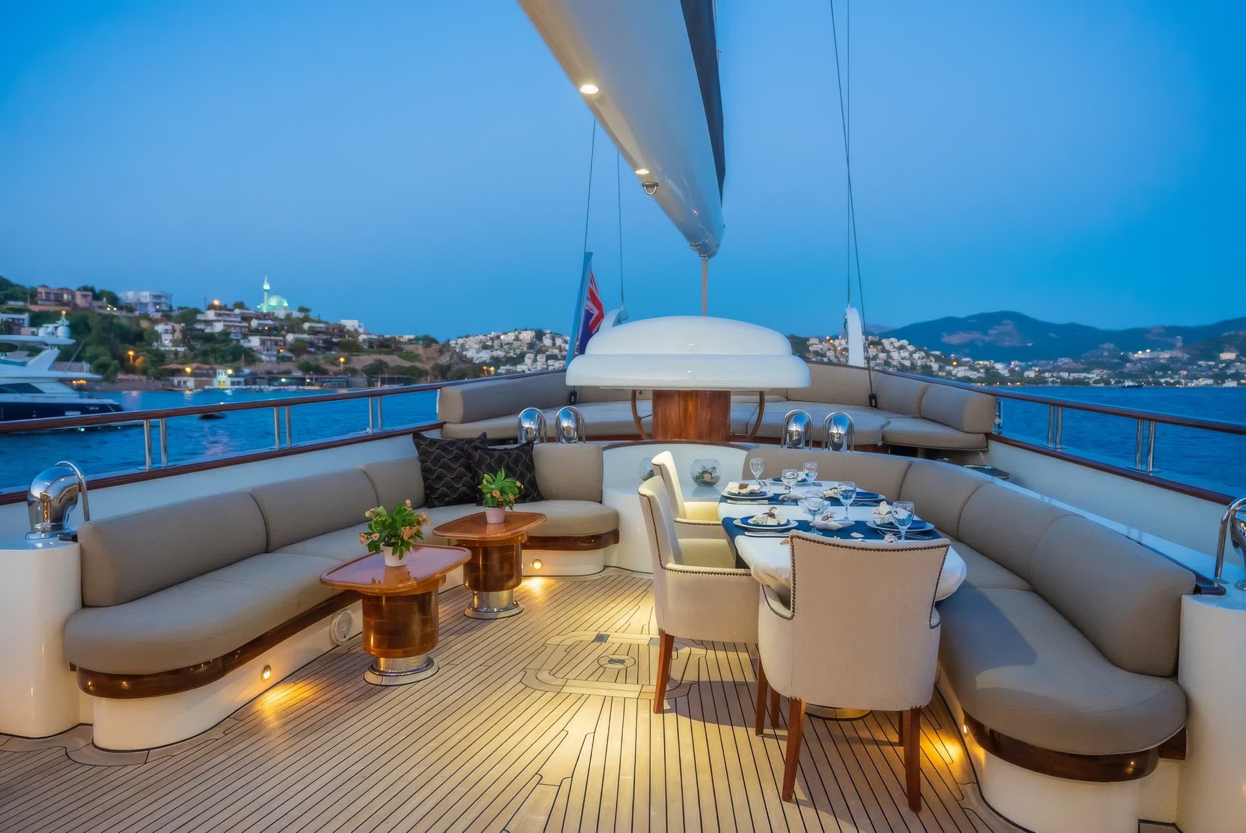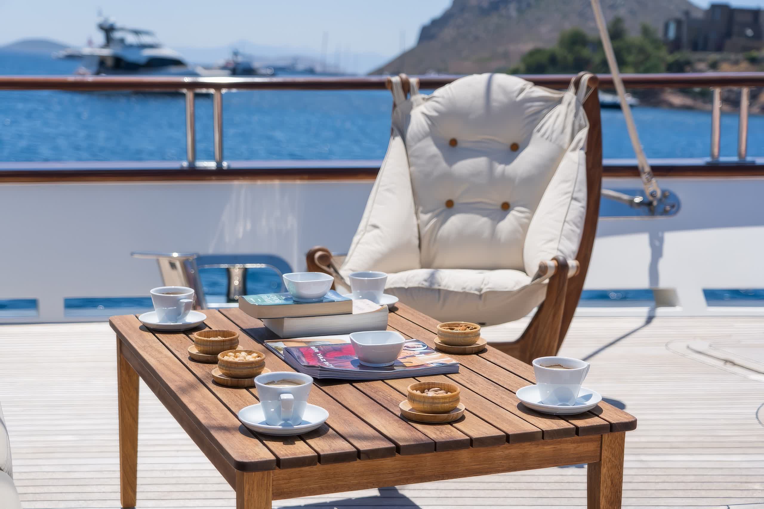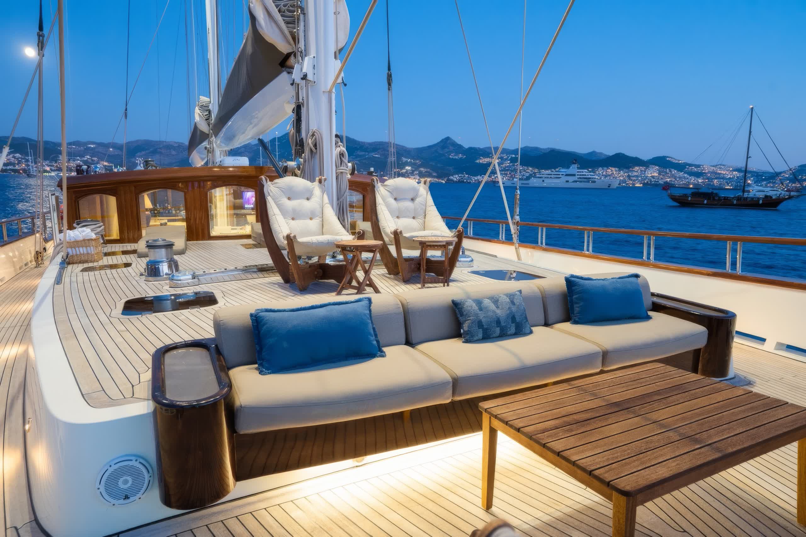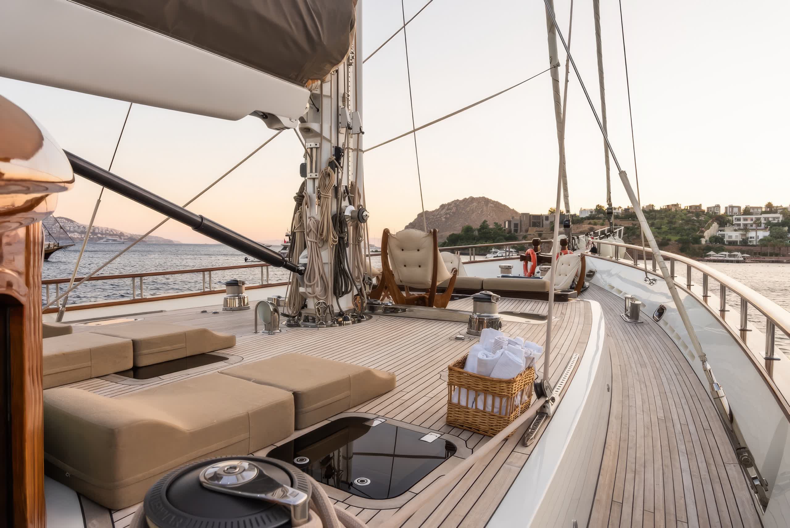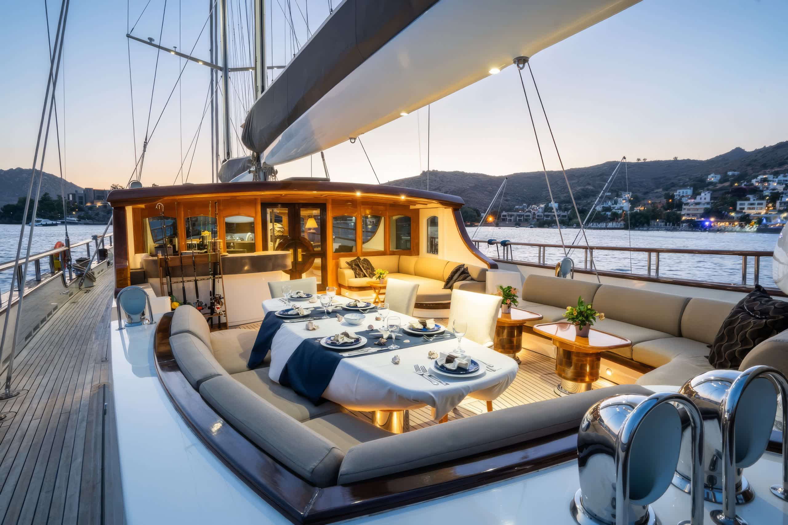 6 gorgeous cabins can accommodate up to 12 guests on the yacht, including a master suite, 2 double cabins, and 3 twin cabins. All cabins also feature en suite bathrooms, air conditioning and modern conveniences, ensuring the ultimate comfort and privacy for guests. Interiors are richly appointed with sumptuous wood paneling, soft lighting and understated but elegant furnishings, providing a warm, welcoming environment on board. Zanziba also has ample space for relaxing and entertaining on deck. There is also an expansive dining area on the aft deck where guests may enjoy meals prepared by the onboard chef. The forward deck features plenty of sunbeds for basking in the Mediterranean sunshine, along with a shaded area for those who enjoy something cooler. Ample deck spaces allow guests to lounge and soak up Turkey’s stunning coastline and crystal-blue waters.