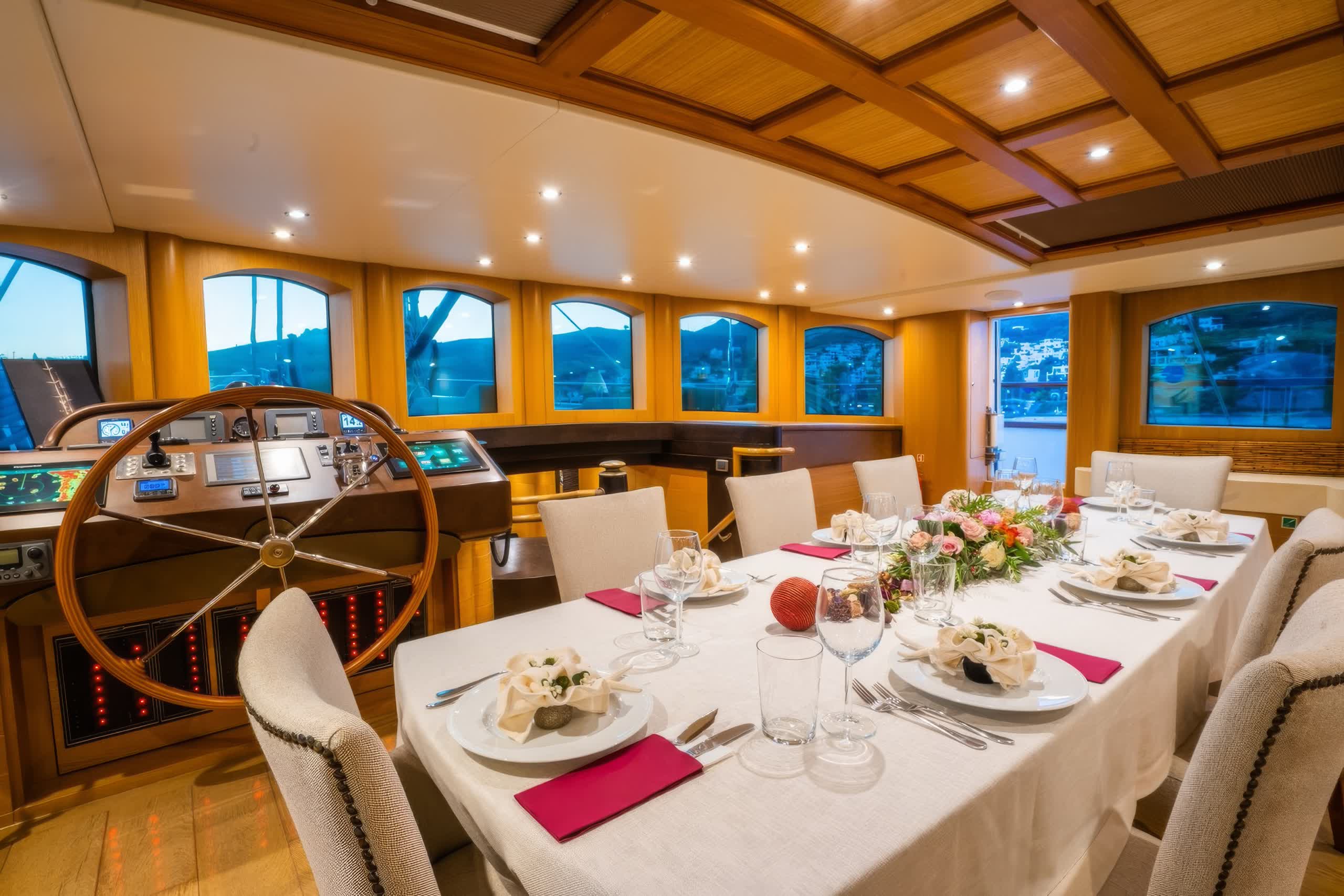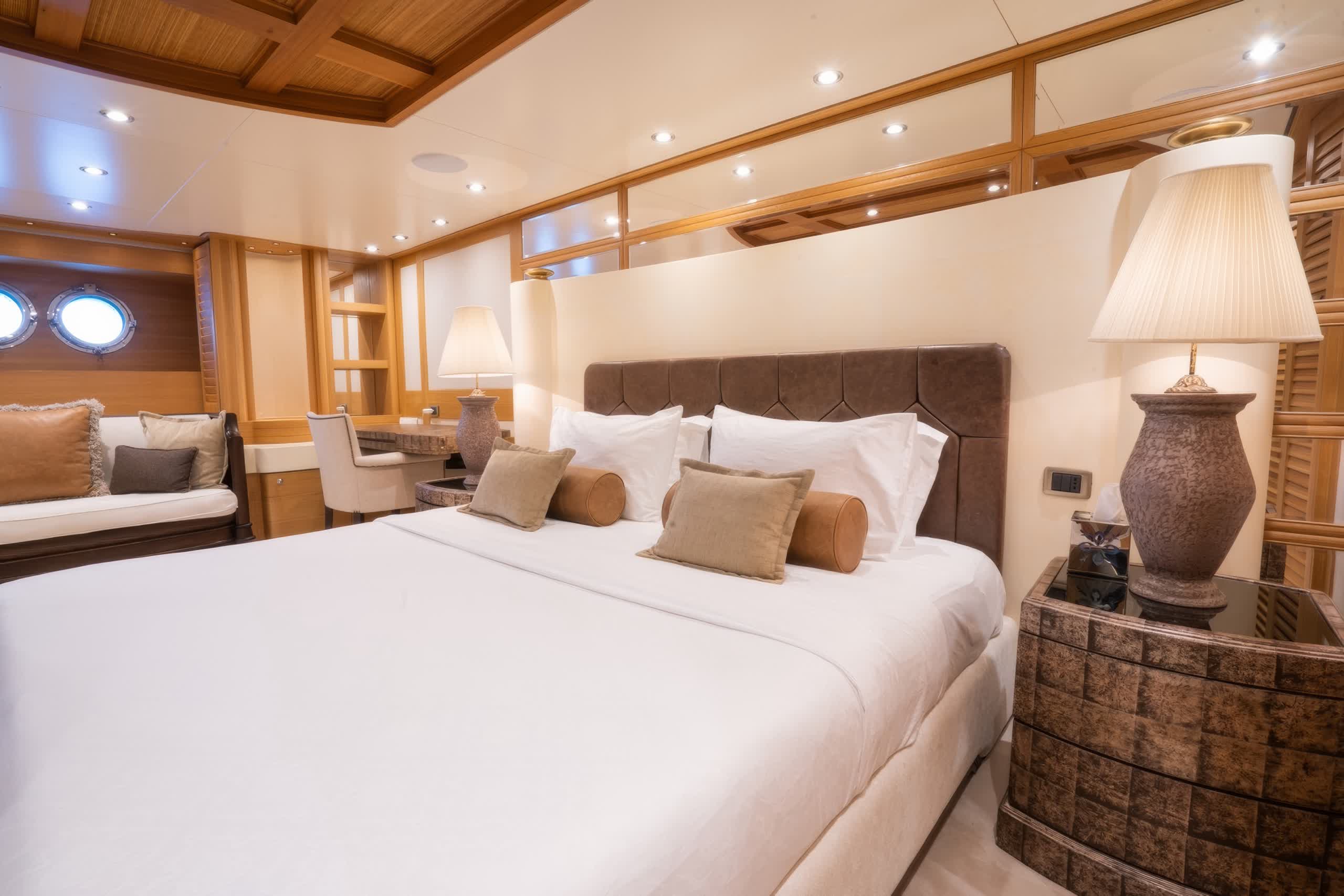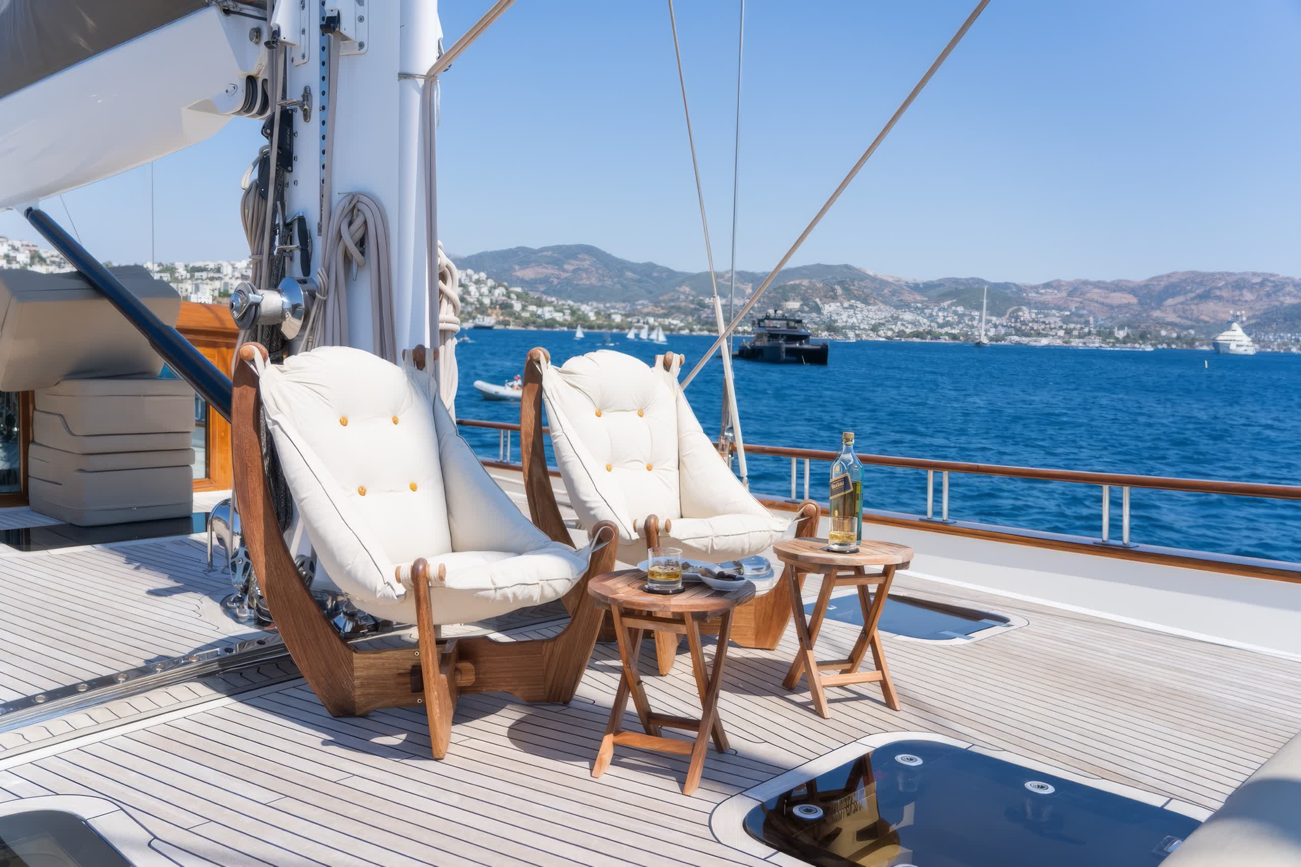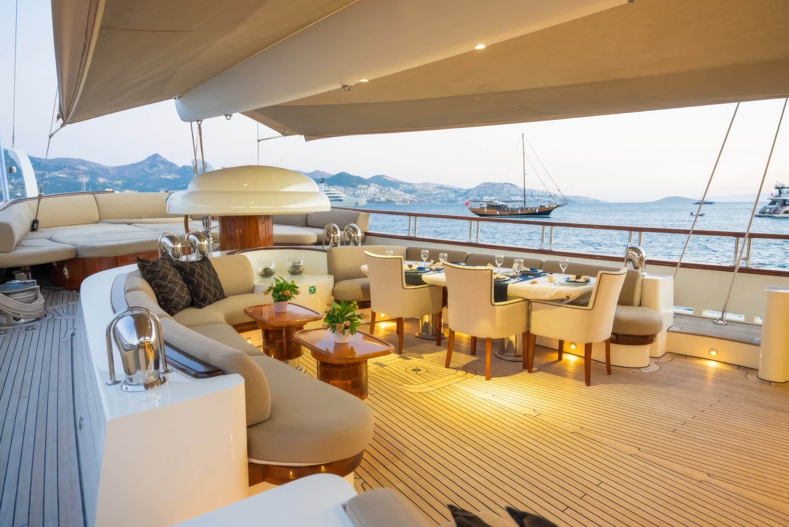6 gorgeous cabins can accommodate up to 12 guests on the yacht, including a master suite, 2 double cabins, and 3 twin cabins. All cabins also feature en suite bathrooms, air conditioning and modern conveniences, ensuring the ultimate comfort and privacy for guests. Interiors are richly appointed with sumptuous wood paneling, soft lighting and understated but elegant furnishings, providing a warm, welcoming environment on board. Zanziba also has ample space for relaxing and entertaining on deck. There is also an expansive dining area on the aft deck where guests may enjoy meals prepared by the onboard chef. The forward deck features plenty of sunbeds for basking in the Mediterranean sunshine, along with a shaded area for those who enjoy something cooler. Ample deck spaces allow guests to lounge and soak up Turkey’s stunning coastline and crystal-blue waters.