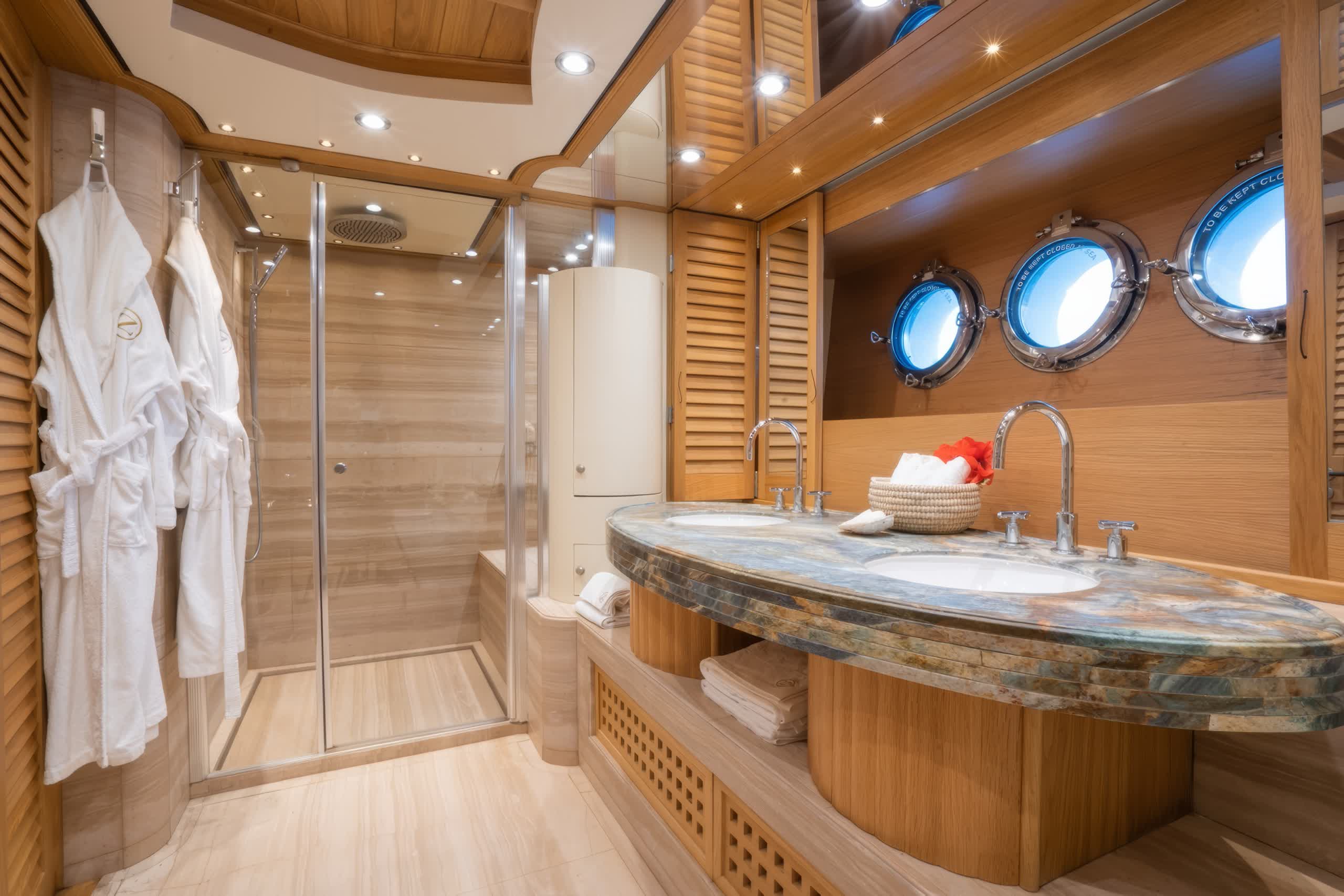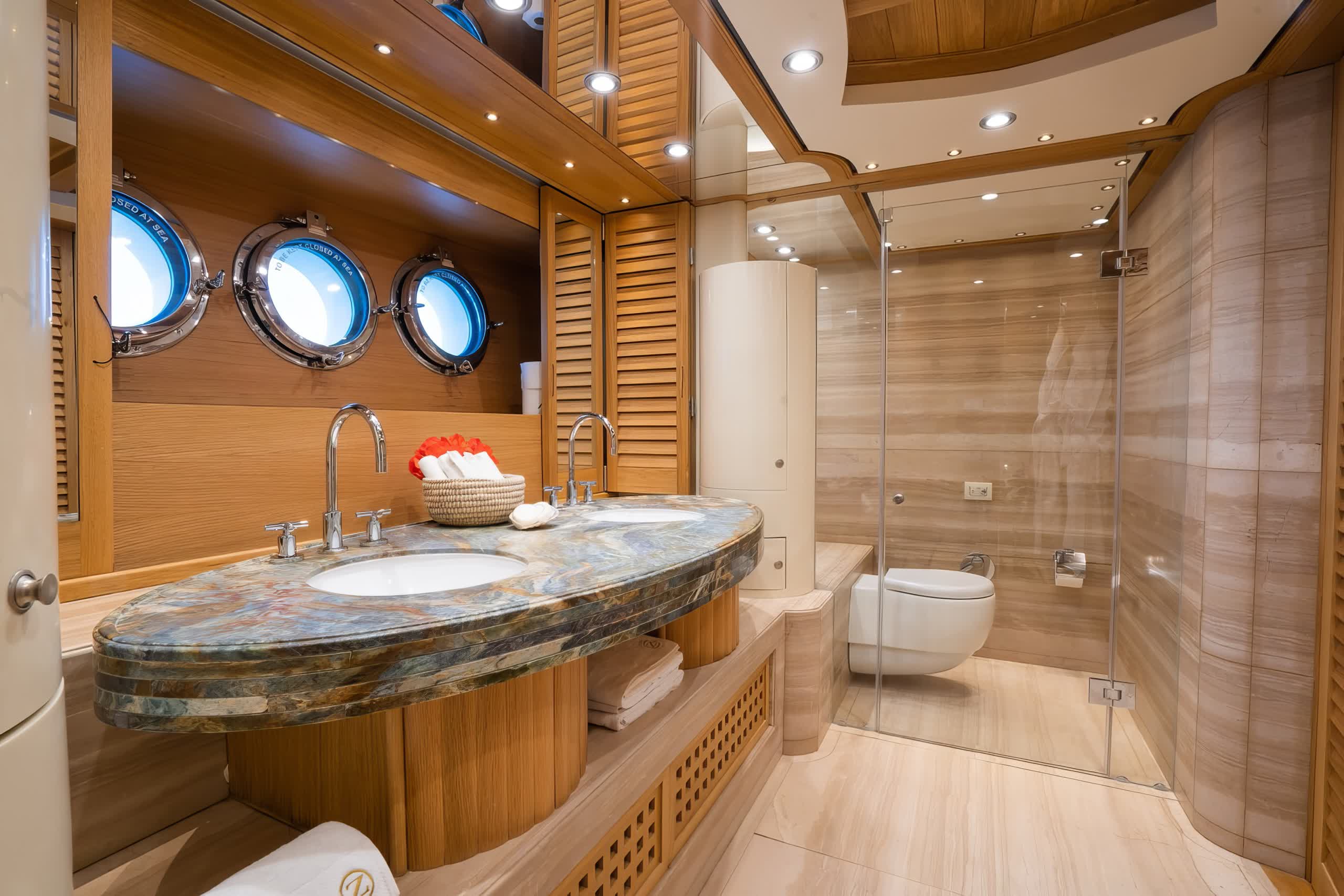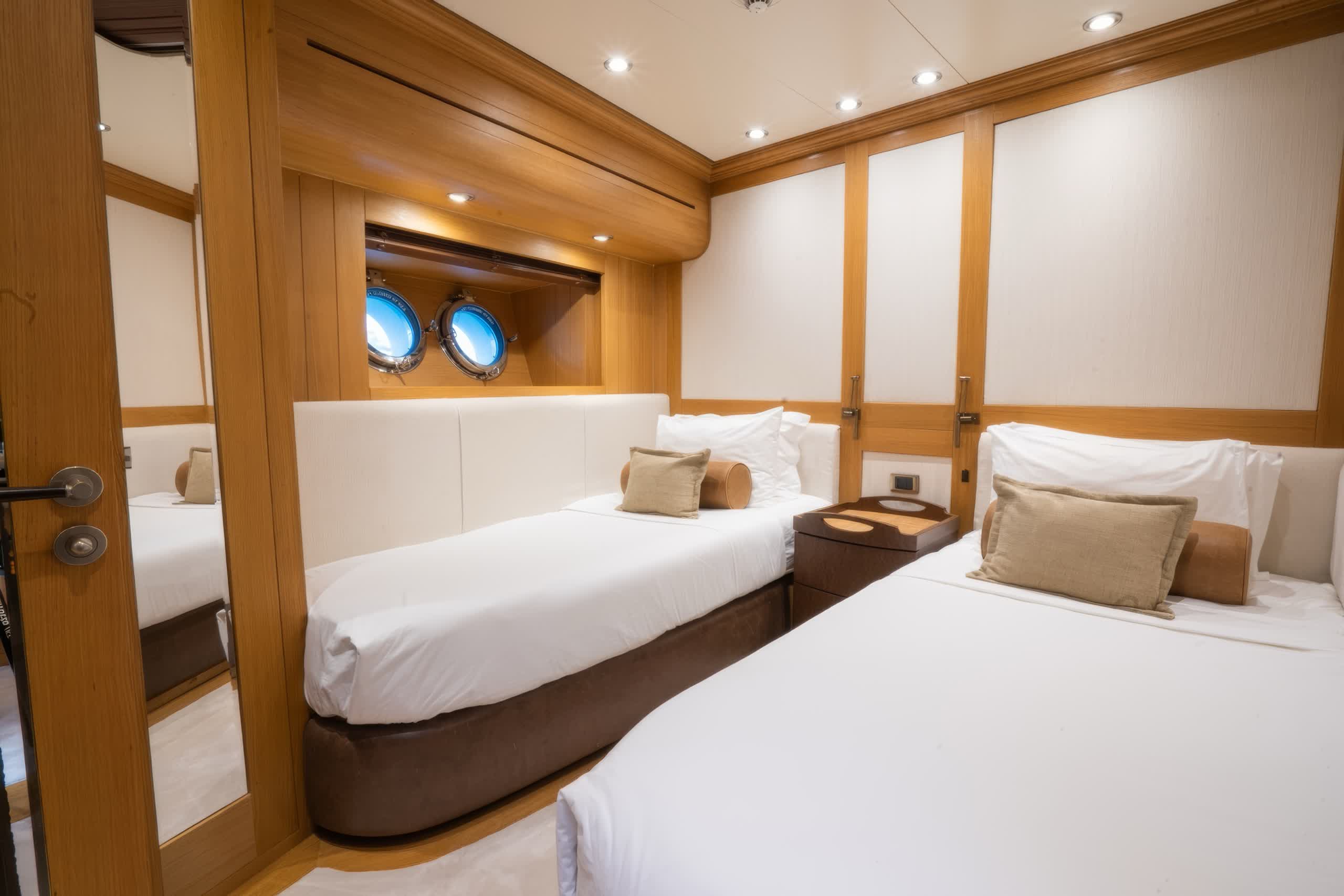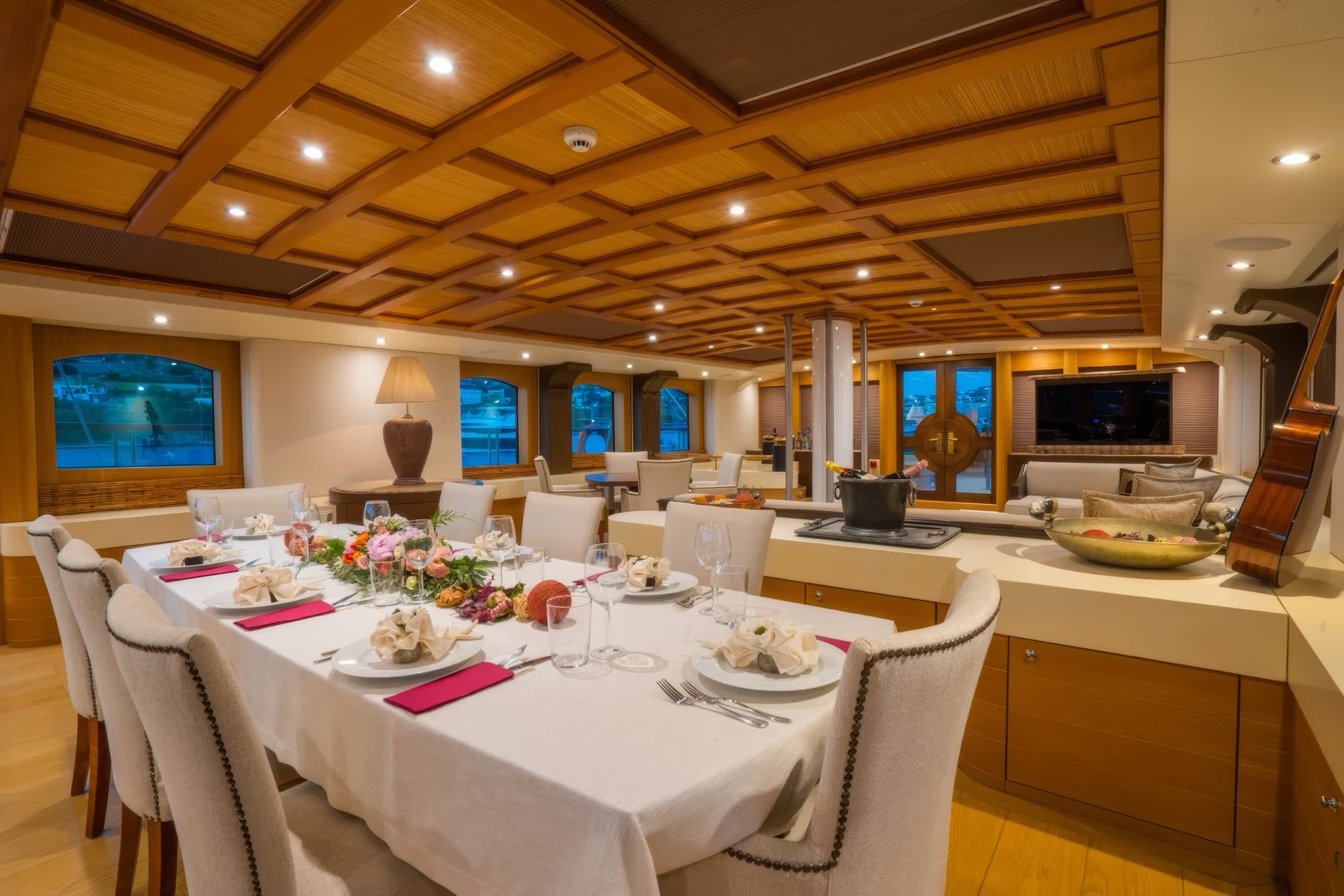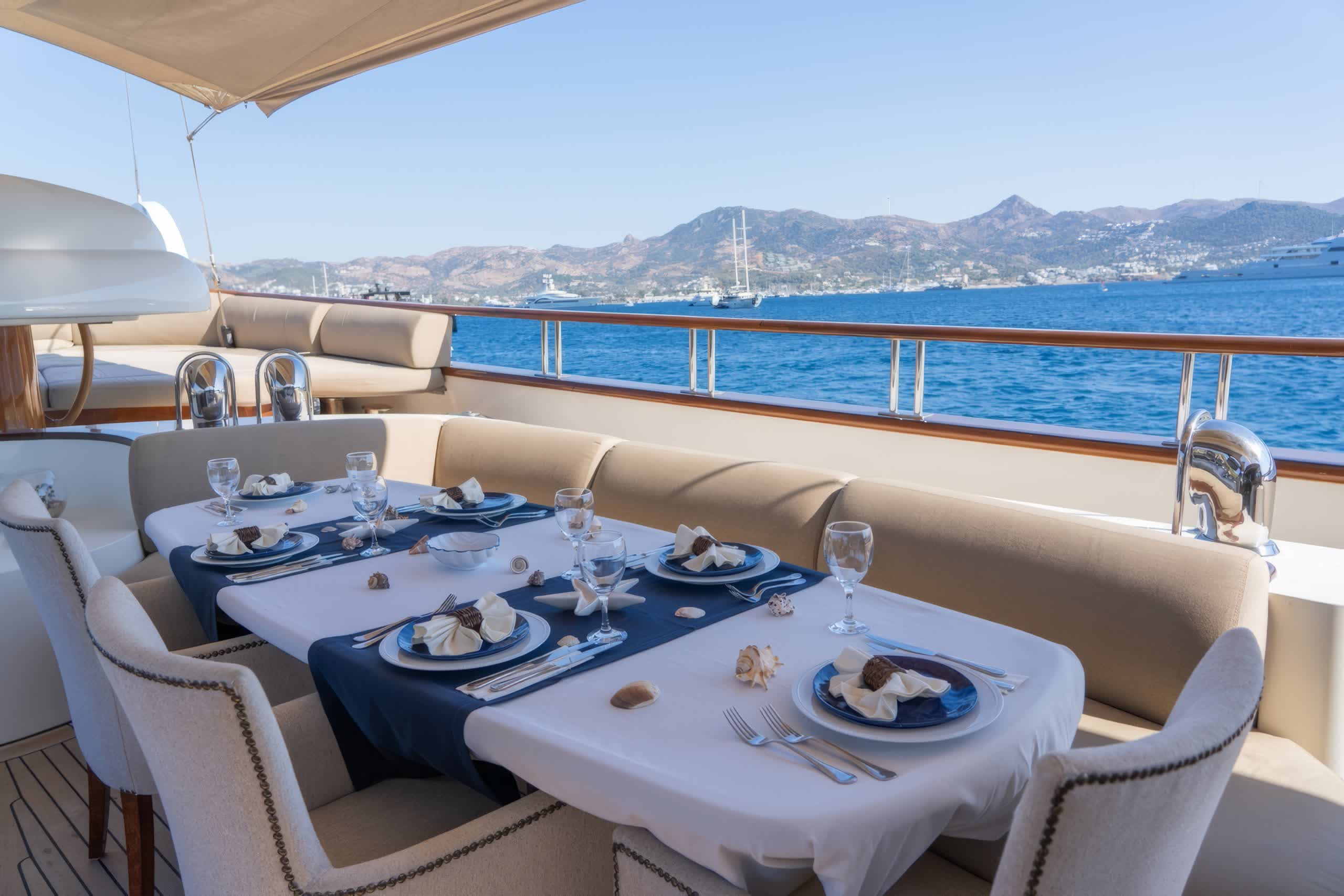 6 gorgeous cabins can accommodate up to 12 guests on the yacht, including a master suite, 2 double cabins, and 3 twin cabins. All cabins also feature en suite bathrooms, air conditioning and modern conveniences, ensuring the ultimate comfort and privacy for guests. Interiors are richly appointed with sumptuous wood paneling, soft lighting and understated but elegant furnishings, providing a warm, welcoming environment on board. Zanziba also has ample space for relaxing and entertaining on deck. There is also an expansive dining area on the aft deck where guests may enjoy meals prepared by the onboard chef. The forward deck features plenty of sunbeds for basking in the Mediterranean sunshine, along with a shaded area for those who enjoy something cooler. Ample deck spaces allow guests to lounge and soak up Turkey’s stunning coastline and crystal-blue waters.