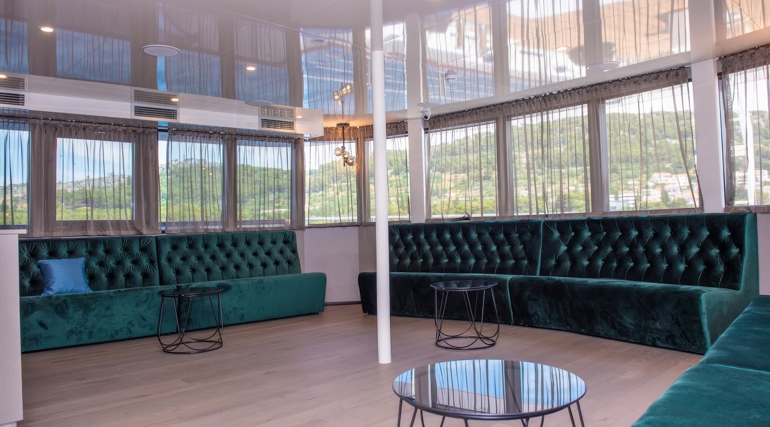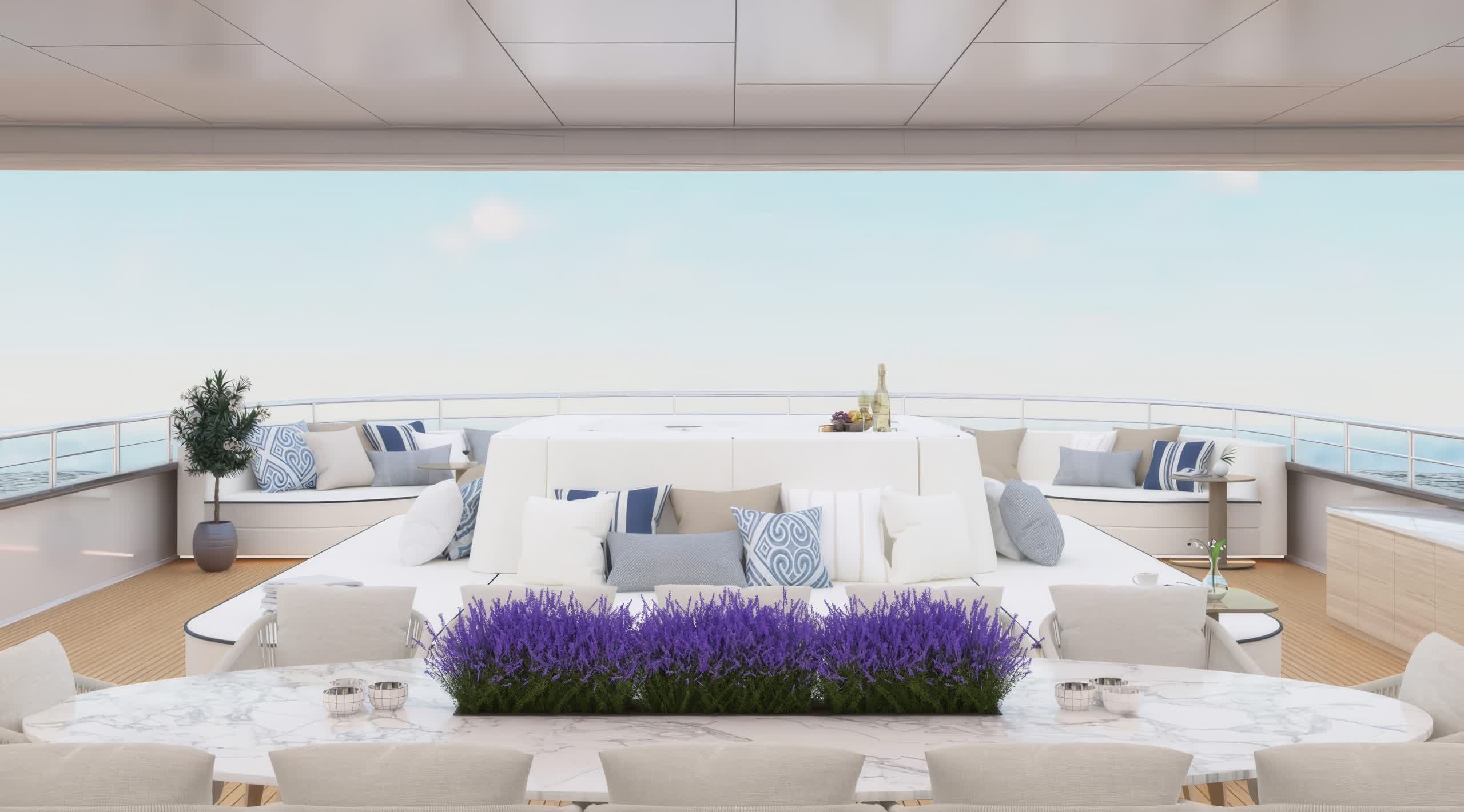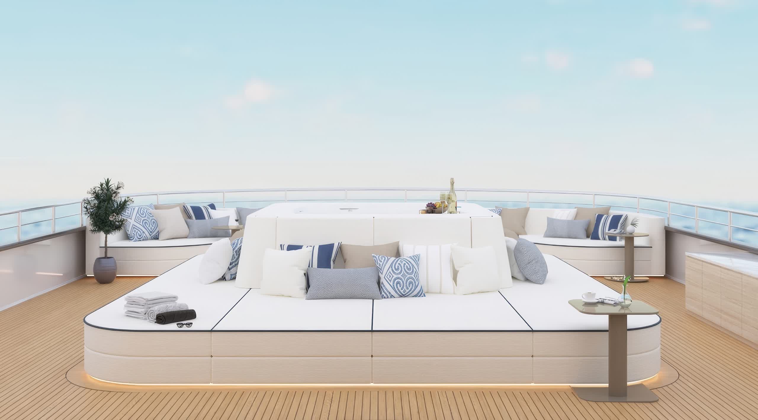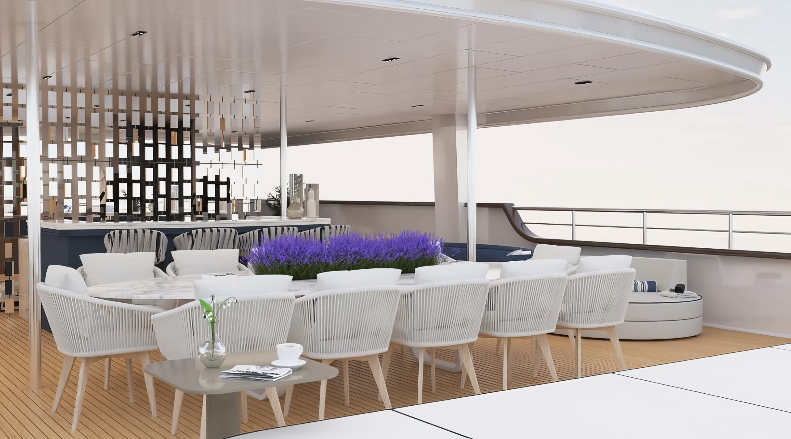 To enhance guest comfort and entertainment, the yacht features an array of amenities. Guests will have access to a jacuzzi, sunbathing chairs and bar on the sundeck. A lounge bar with a piano and a salon bar on the main deck encourage guests to mingle in a relaxed atmosphere. Other amenities include a cinema room, outdoor gym, sauna and outdoor swimming pool, providing a wide range of relaxation and entertainment options on site.