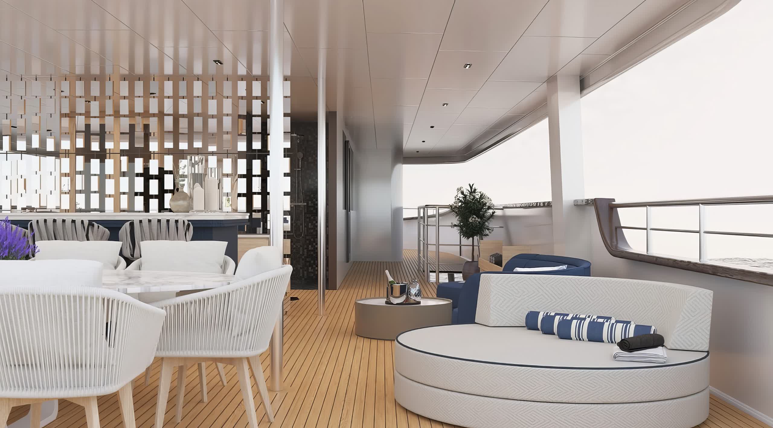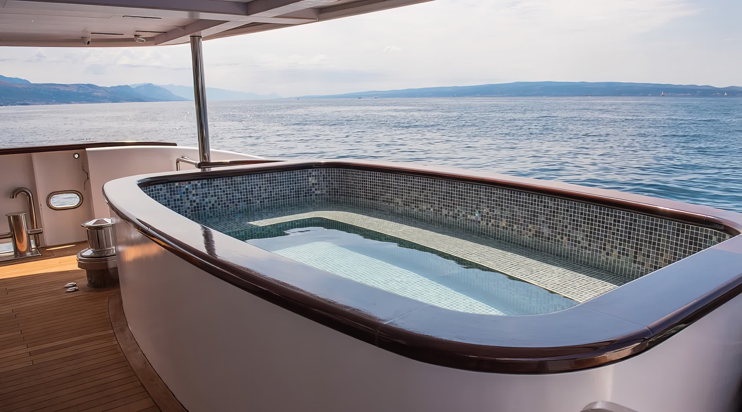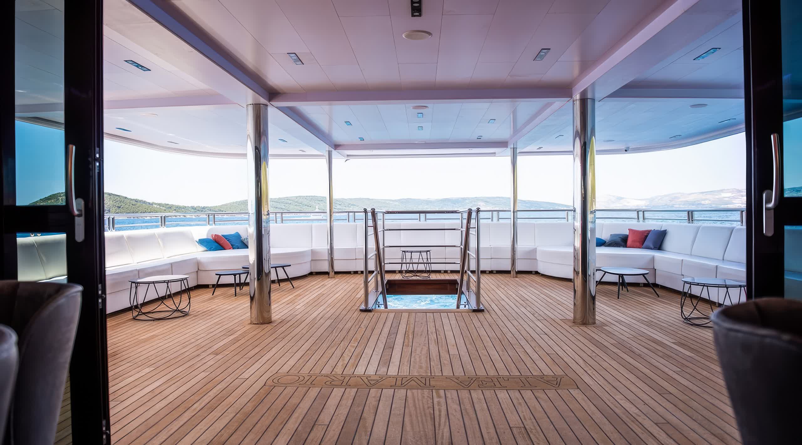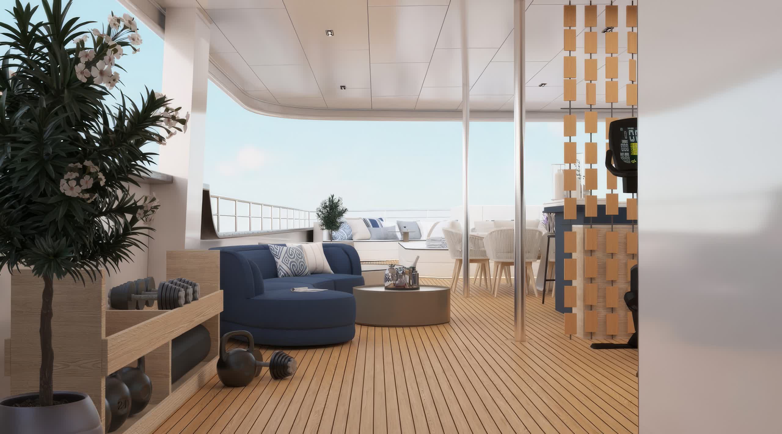 To enhance guest comfort and entertainment, the yacht features an array of amenities. Guests will have access to a jacuzzi, sunbathing chairs and bar on the sundeck. A lounge bar with a piano and a salon bar on the main deck encourage guests to mingle in a relaxed atmosphere. Other amenities include a cinema room, outdoor gym, sauna and outdoor swimming pool, providing a wide range of relaxation and entertainment options on site.