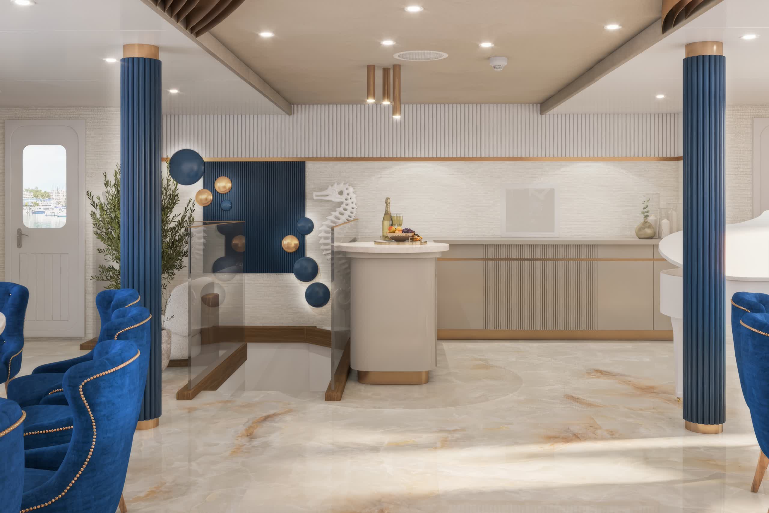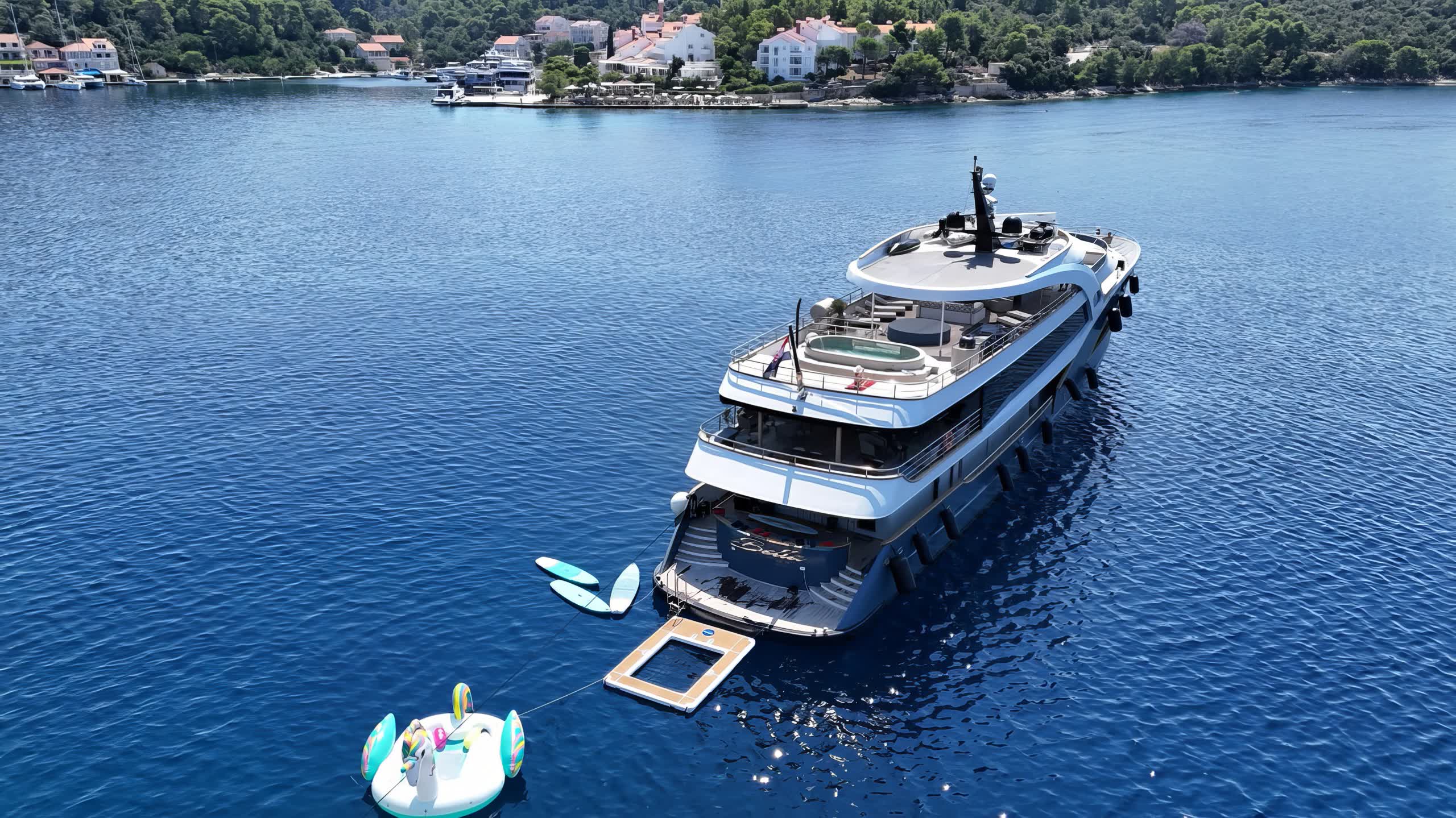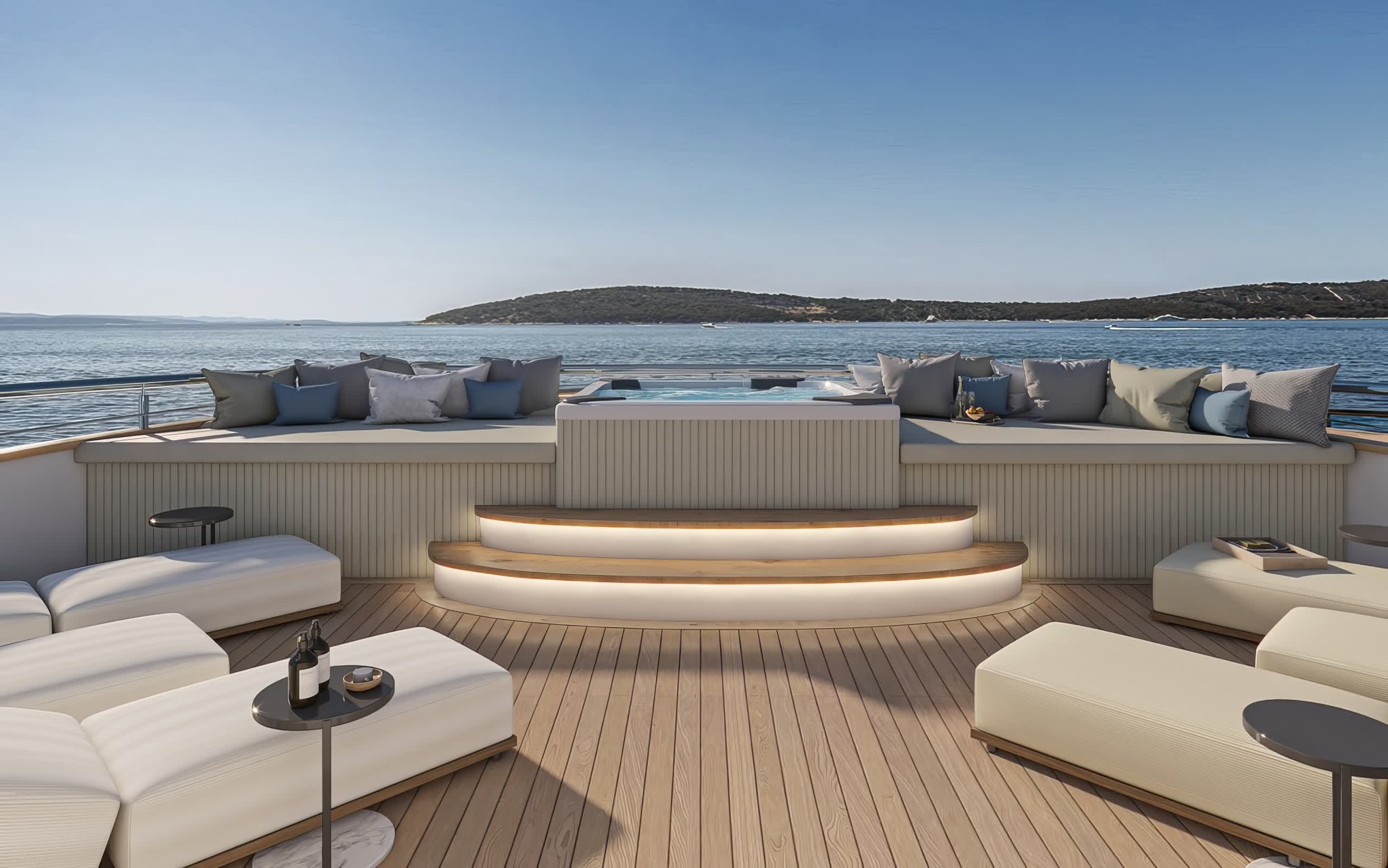 On the sundeck, there is a Jacuzzi along with cushioned sun loungers for relaxation. Next to the gym are an aft-deck hot tub and bar that add more places to unwind. The yacht’s large swim platform makes it easy to access the water and includes a tender garage loaded with a variety of water toys, including Seabobs, personal watercraft and scuba gear, along with a nitrox compressor.