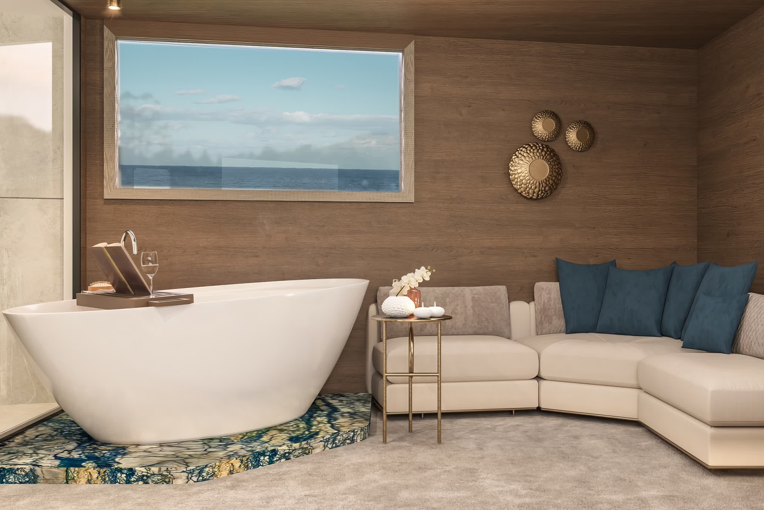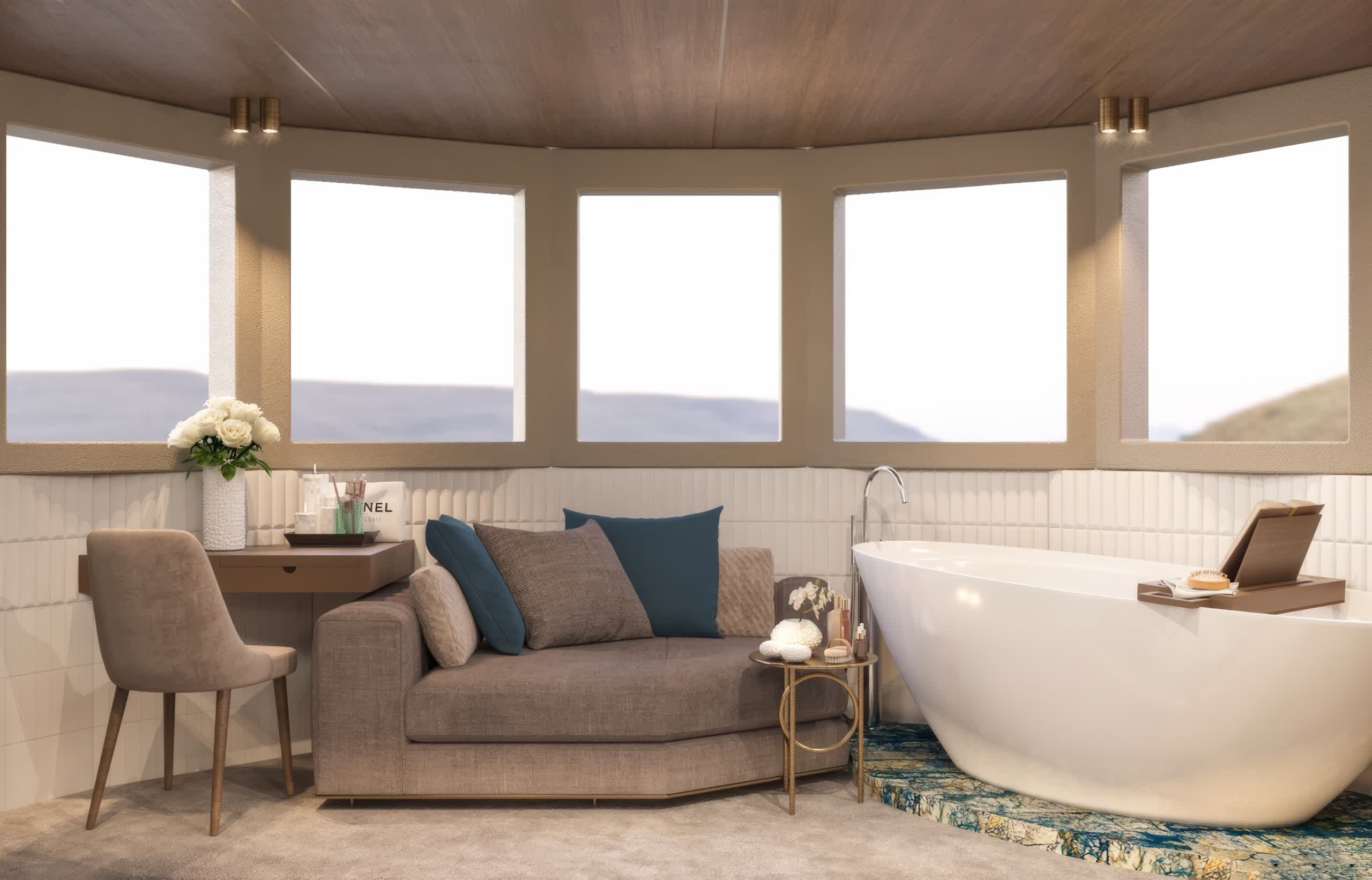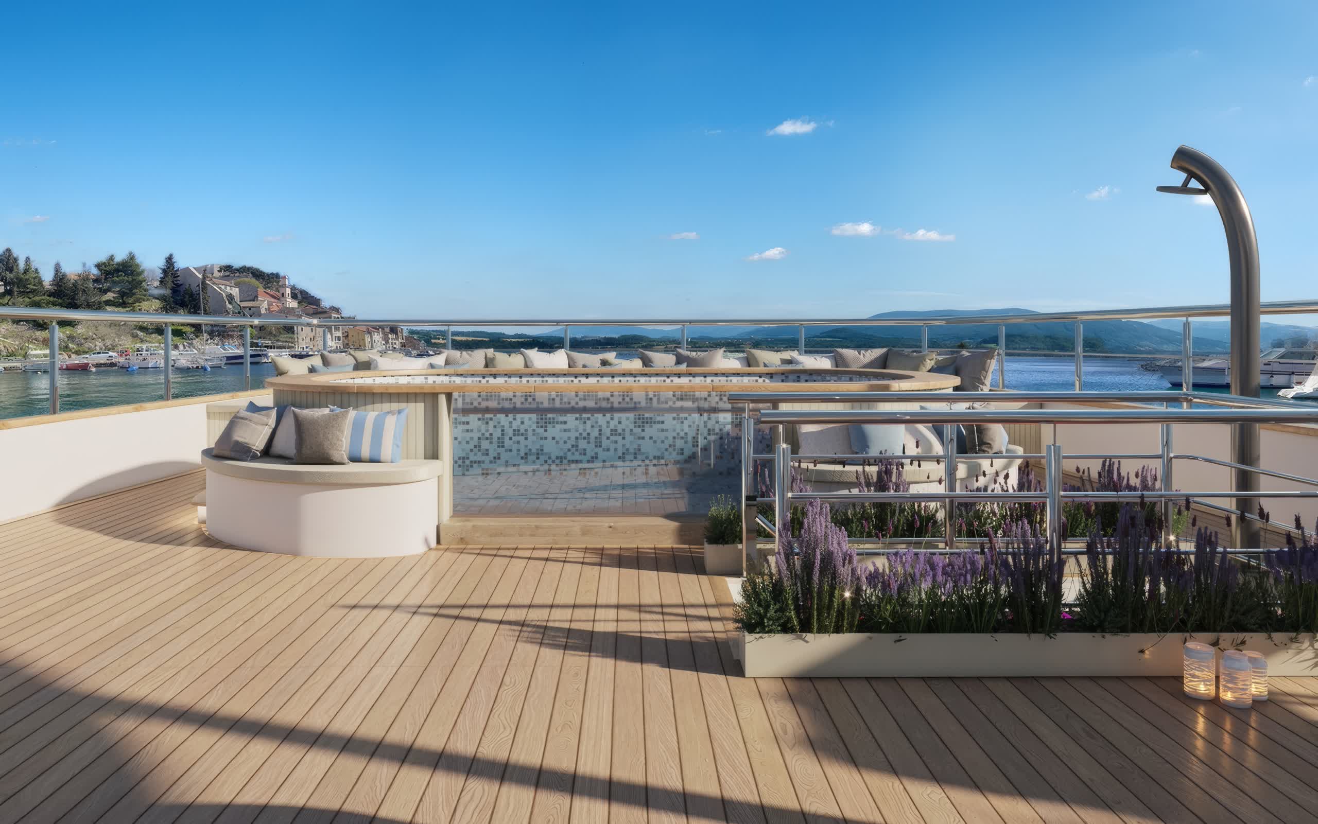 On the sundeck, there is a Jacuzzi along with cushioned sun loungers for relaxation. Next to the gym are an aft-deck hot tub and bar that add more places to unwind. The yacht’s large swim platform makes it easy to access the water and includes a tender garage loaded with a variety of water toys, including Seabobs, personal watercraft and scuba gear, along with a nitrox compressor.
