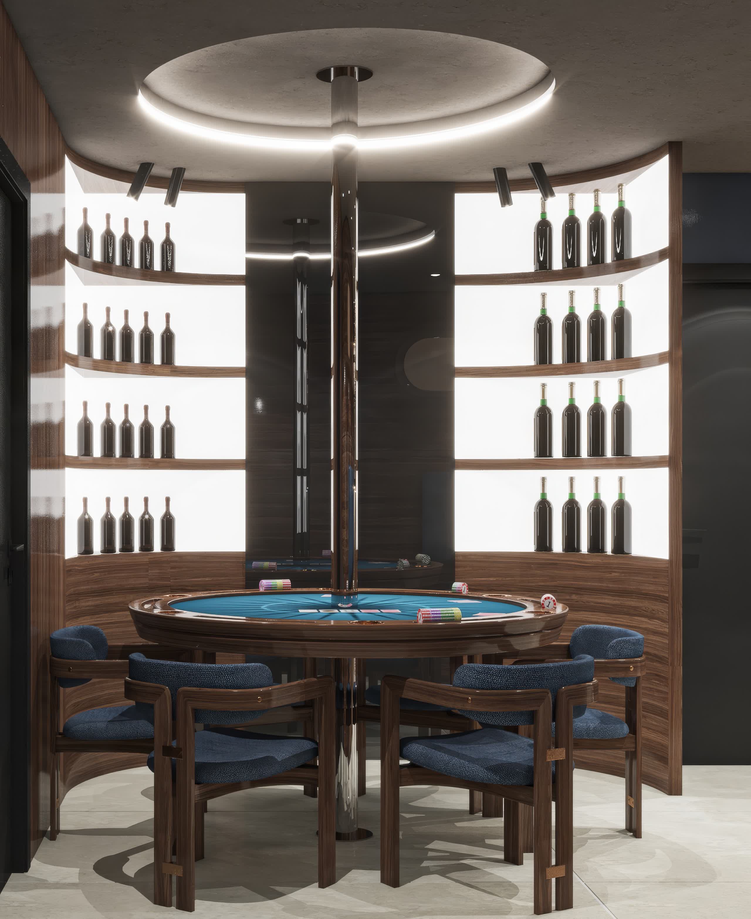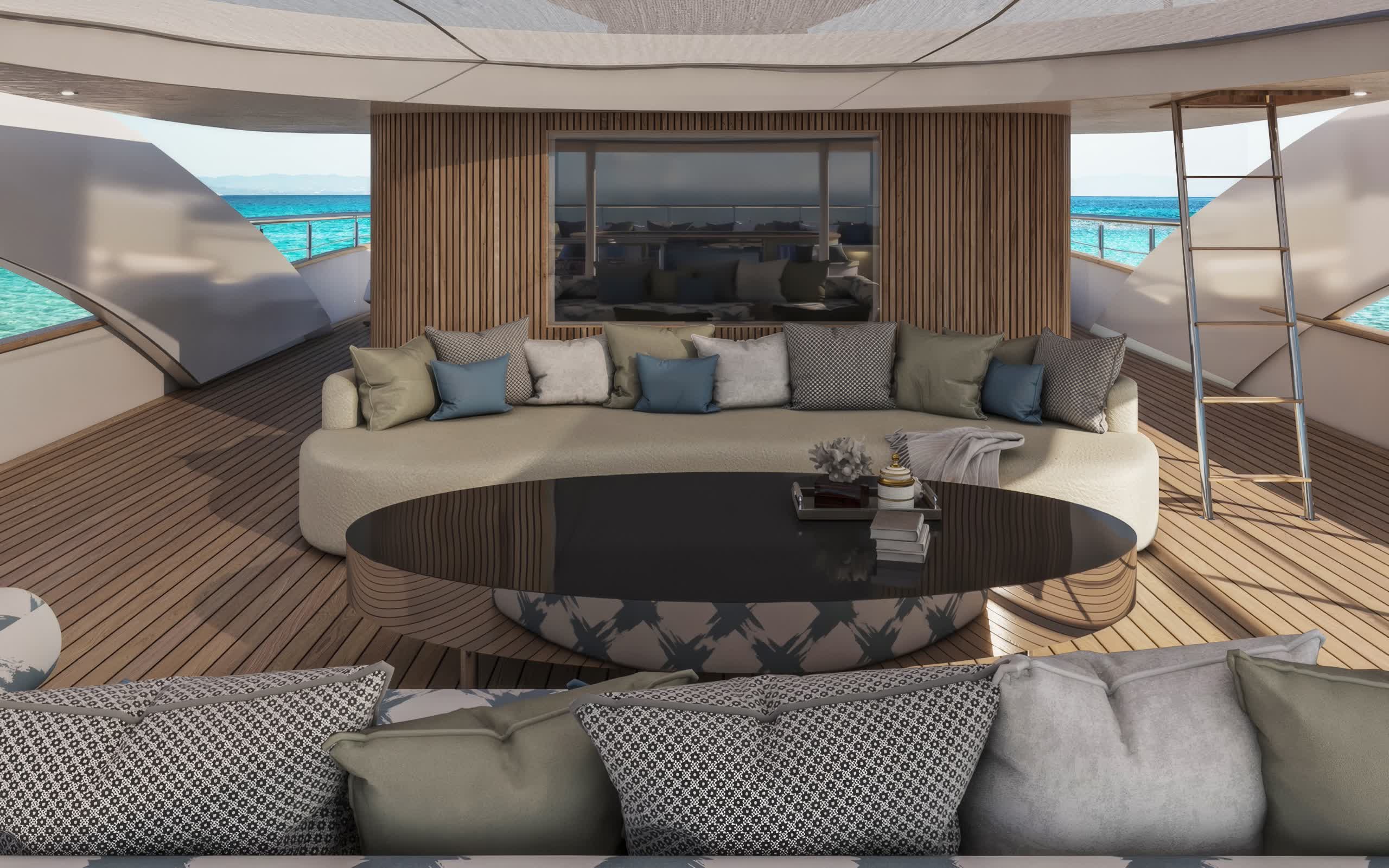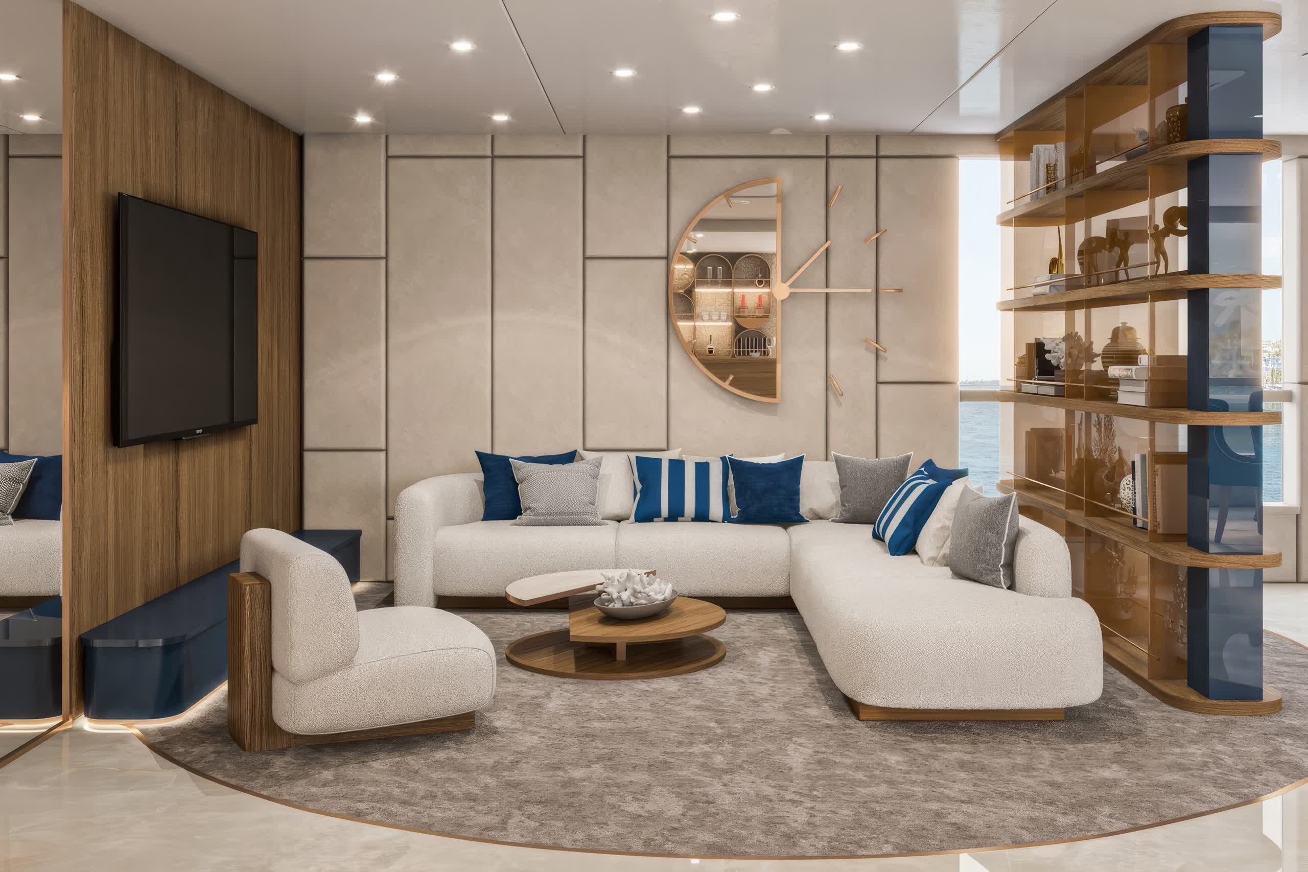 The main deck has a spacious salon with large seating areas, a full bar, and a dining room with a large table. The area ahead of the salon is open, with a large square table and comfortable sofas around it. The bridge deck skylounge has a more casual feel with a lounge area and game table for four. The yacht boasts a neutral color scheme throughout, partnered with natural wood detailing for an inviting feel.