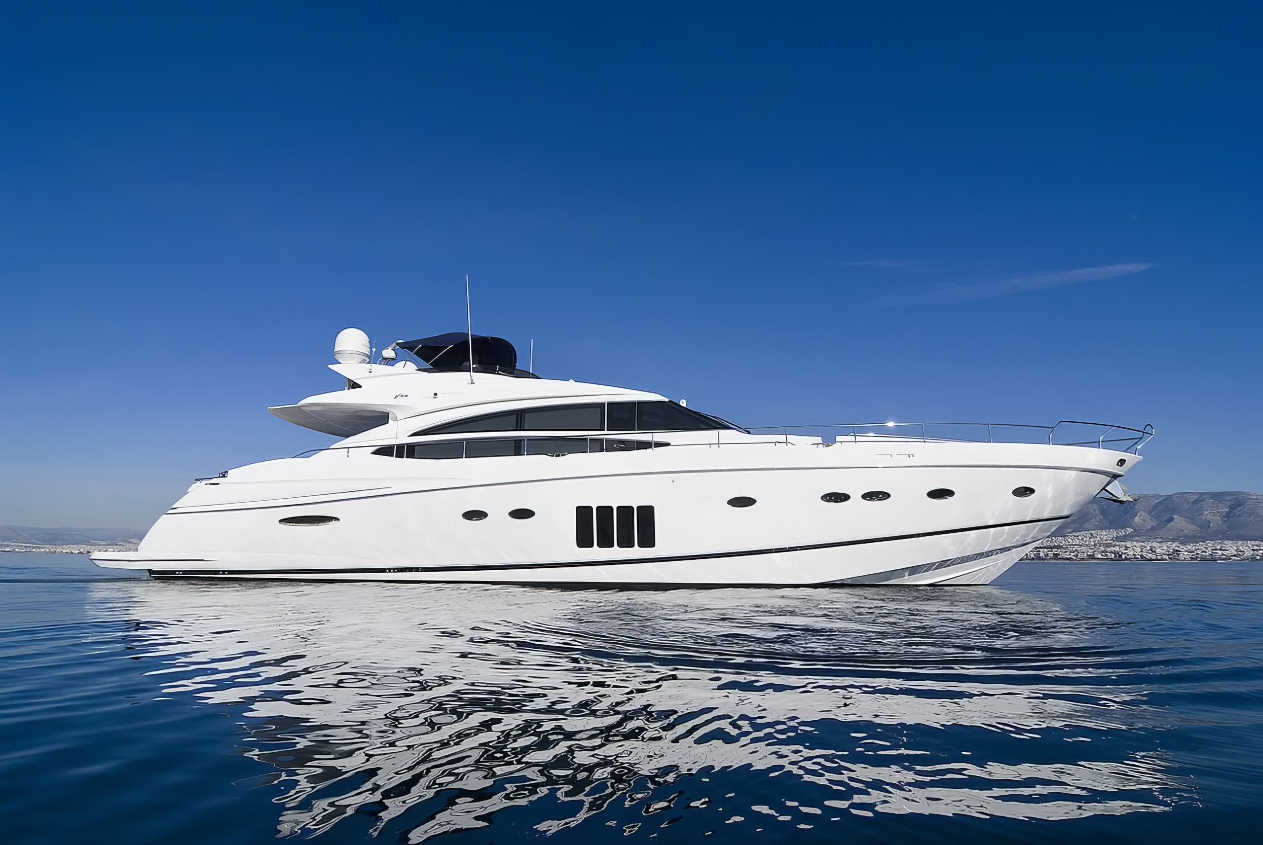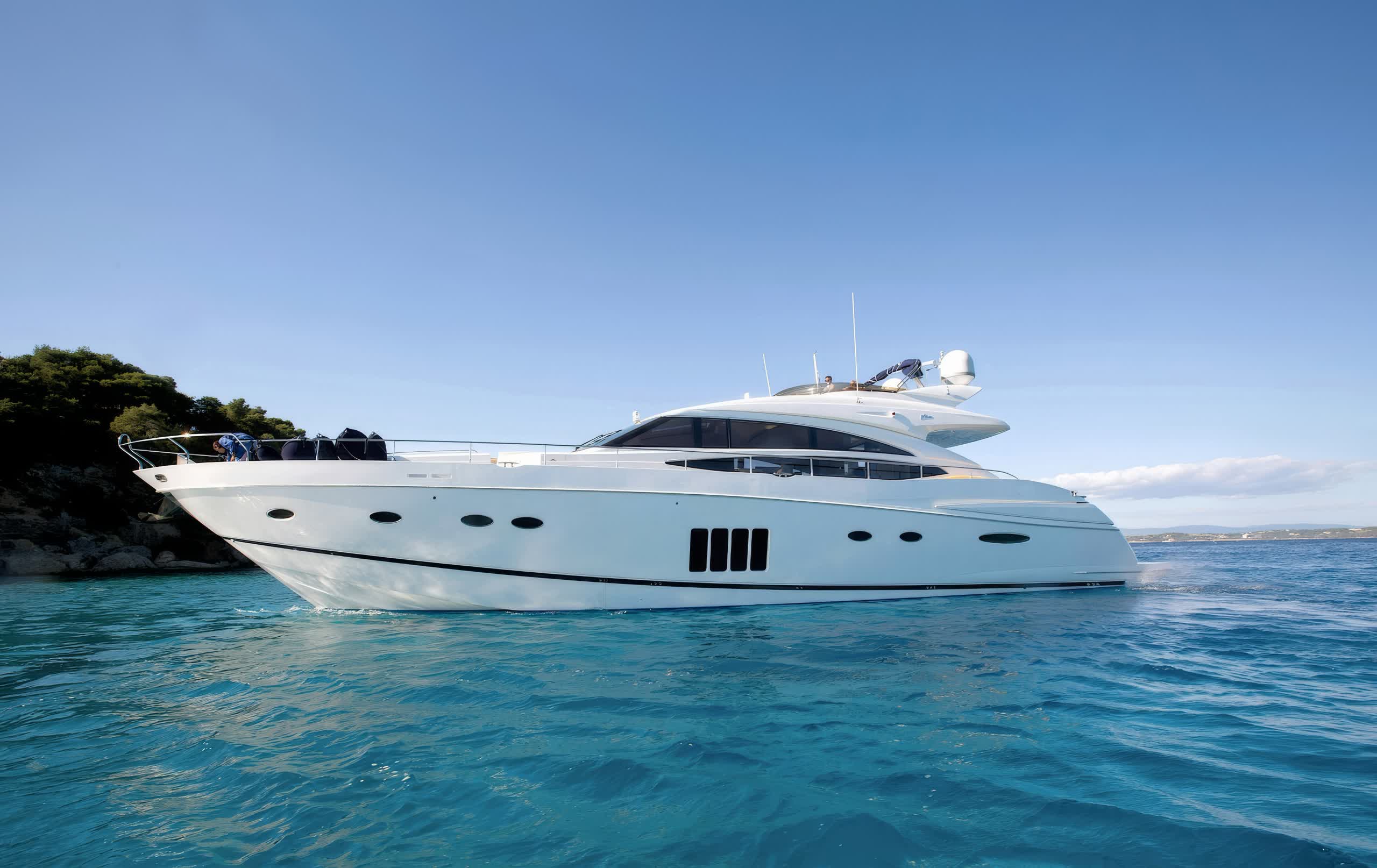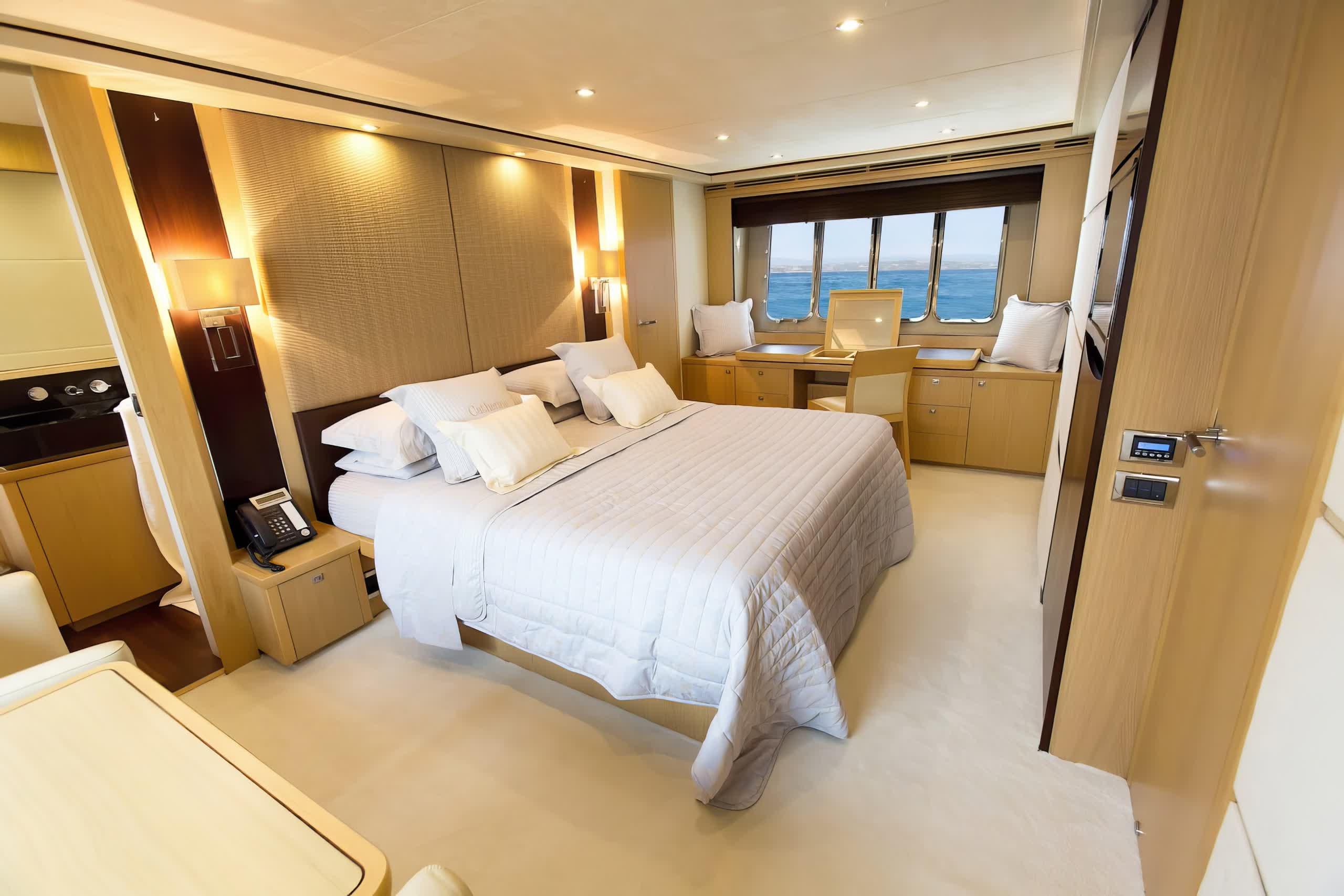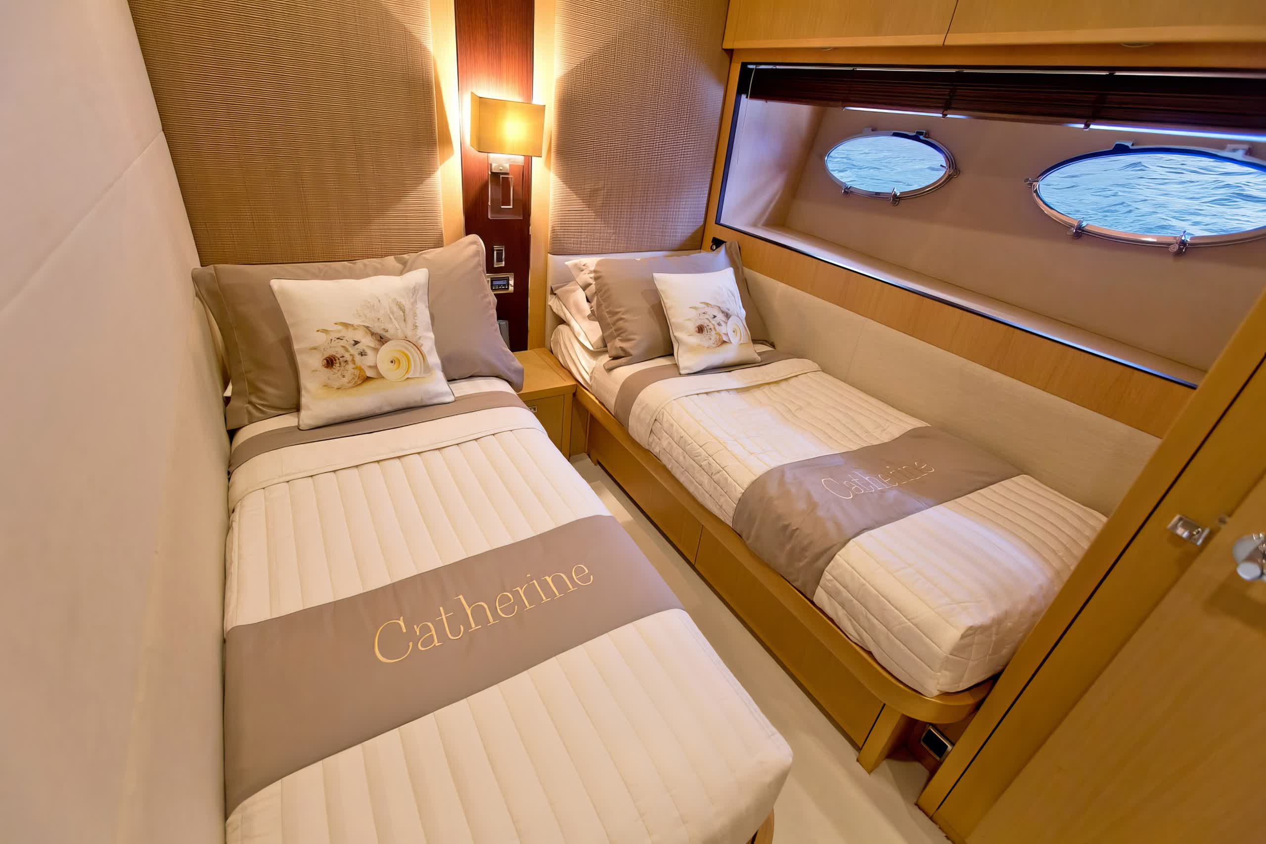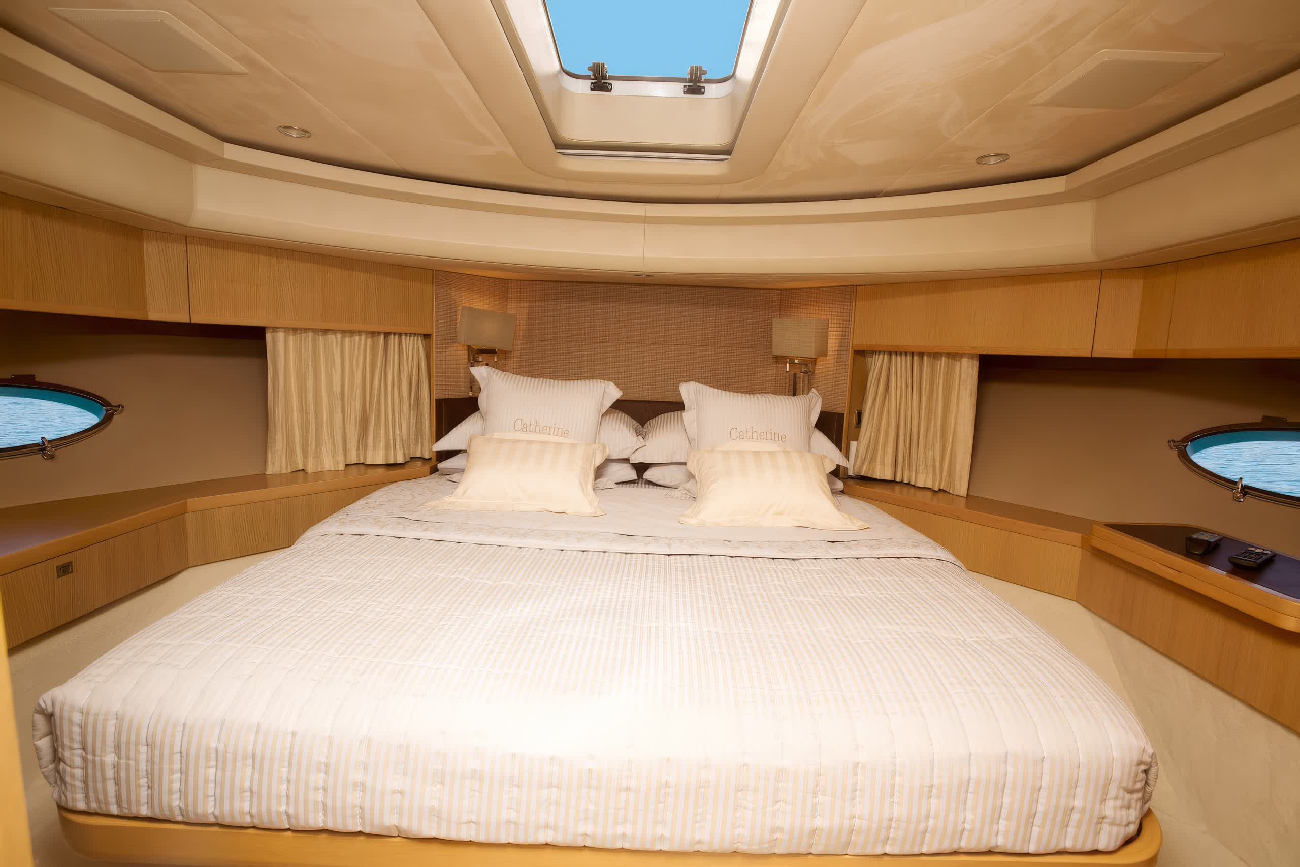 Catherine is a motor yacht 26 meters in length, produced by Princess Yachts in 2010, and is a splendid instance of upper-class and performance. The yacht sleeps eight guests in four spacious cabins, including a full-beam, midship master stateroom with a king-size bed, lounge area, vanity, and custom vertical windows that flood the room with natural light. The forward VIP cabin, meanwhile, runs the full beam, and has a queen-size bed, while the twin accommodation in the two cabins port and starboard has side-by-side twins convertible to doubles if needed. All cabins have LED TVs and DVD players.