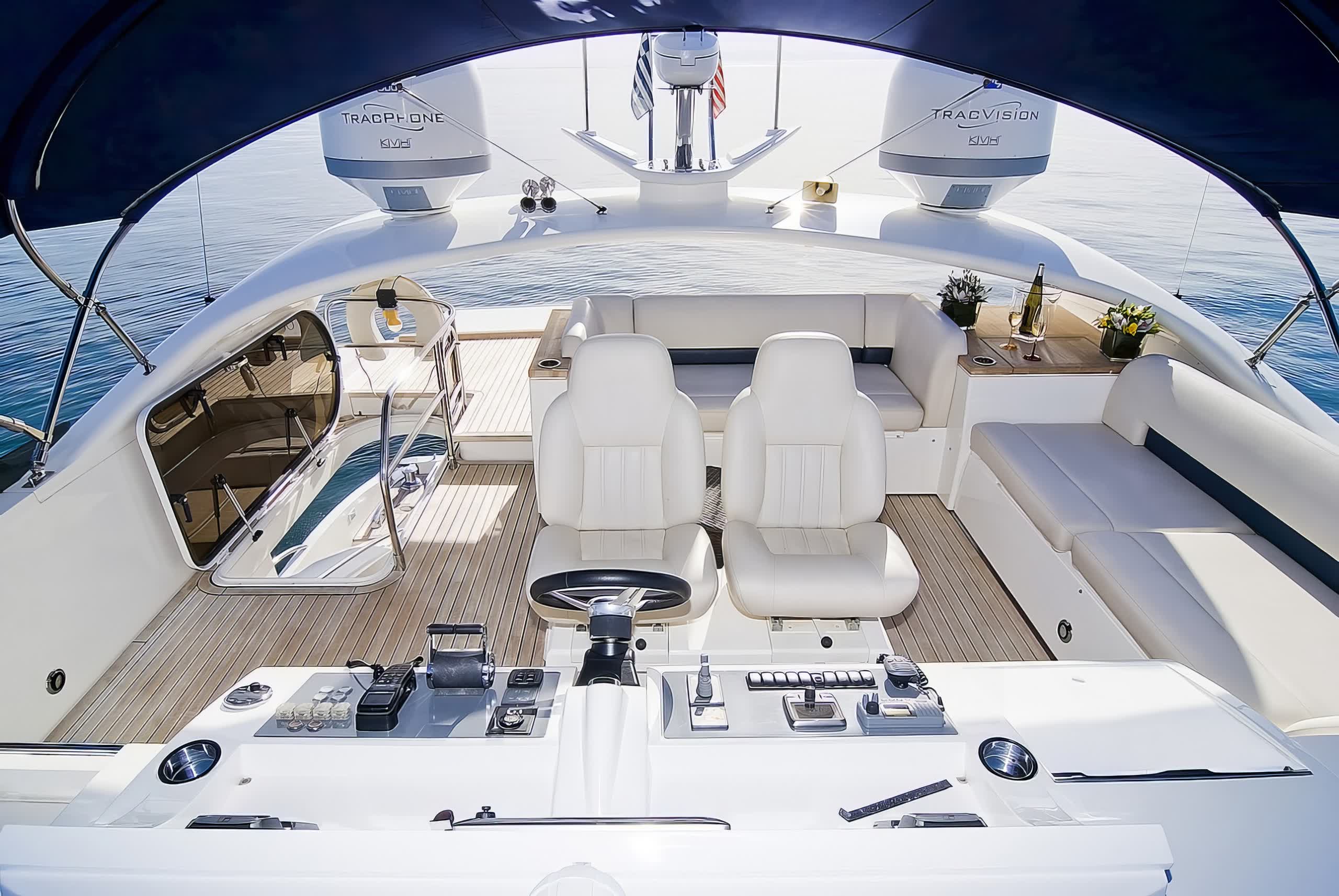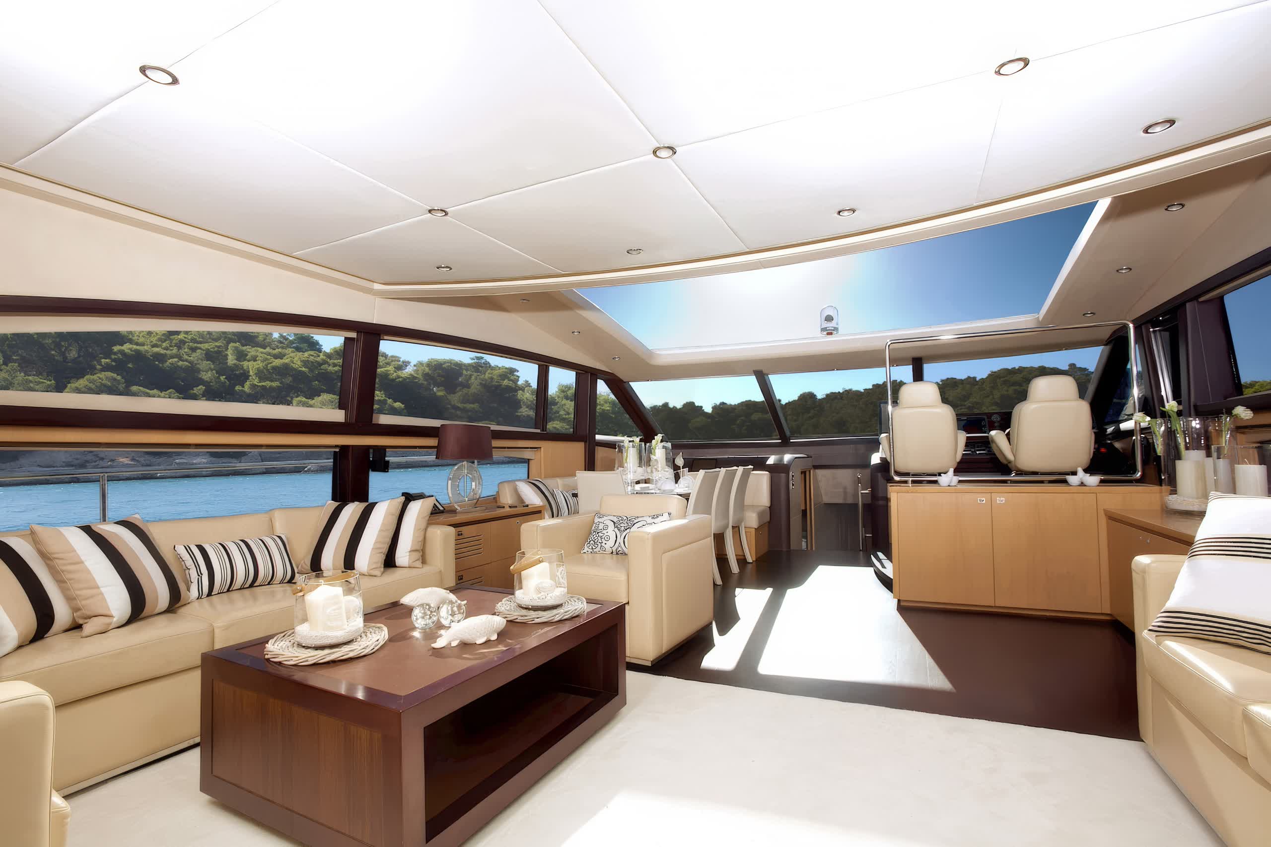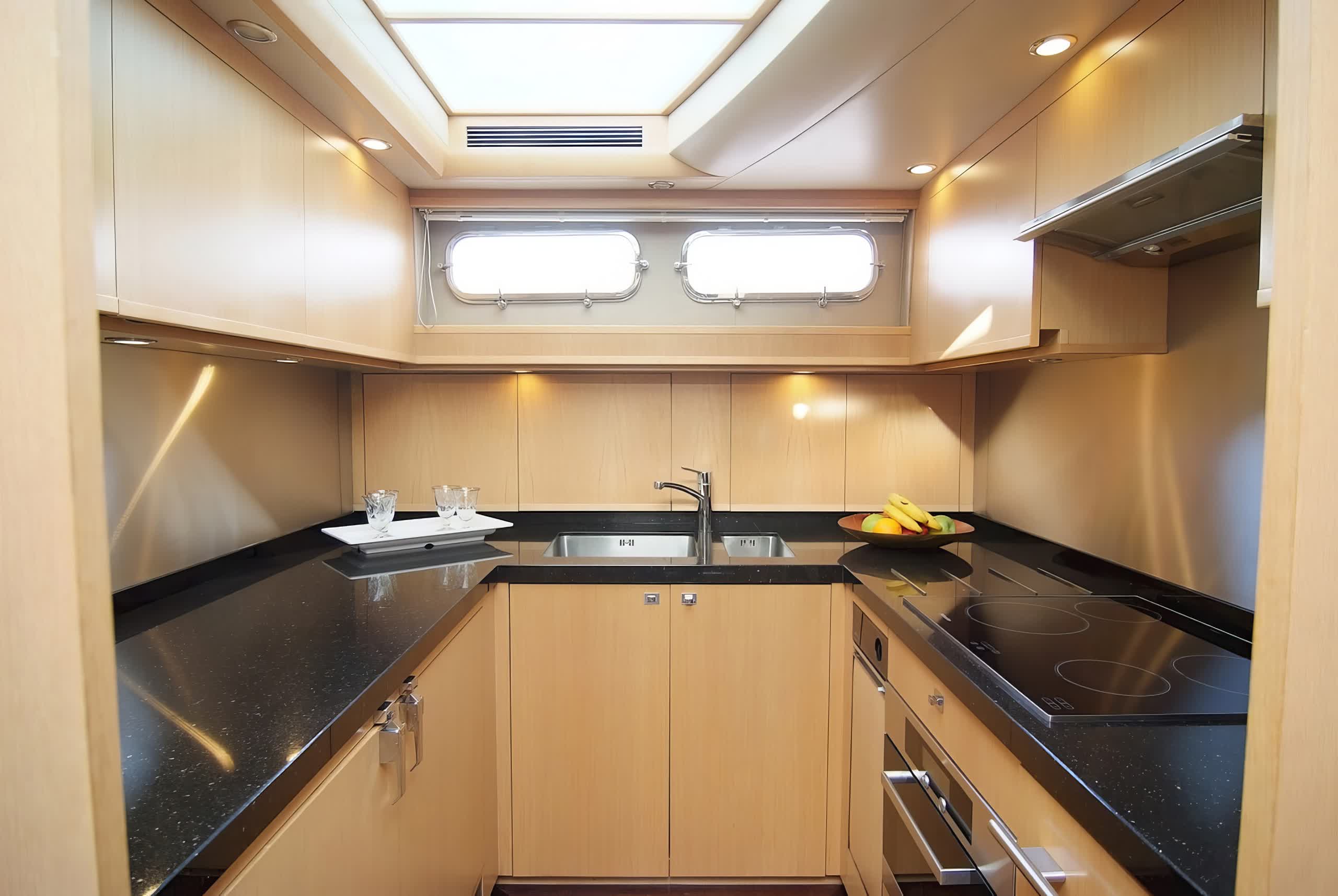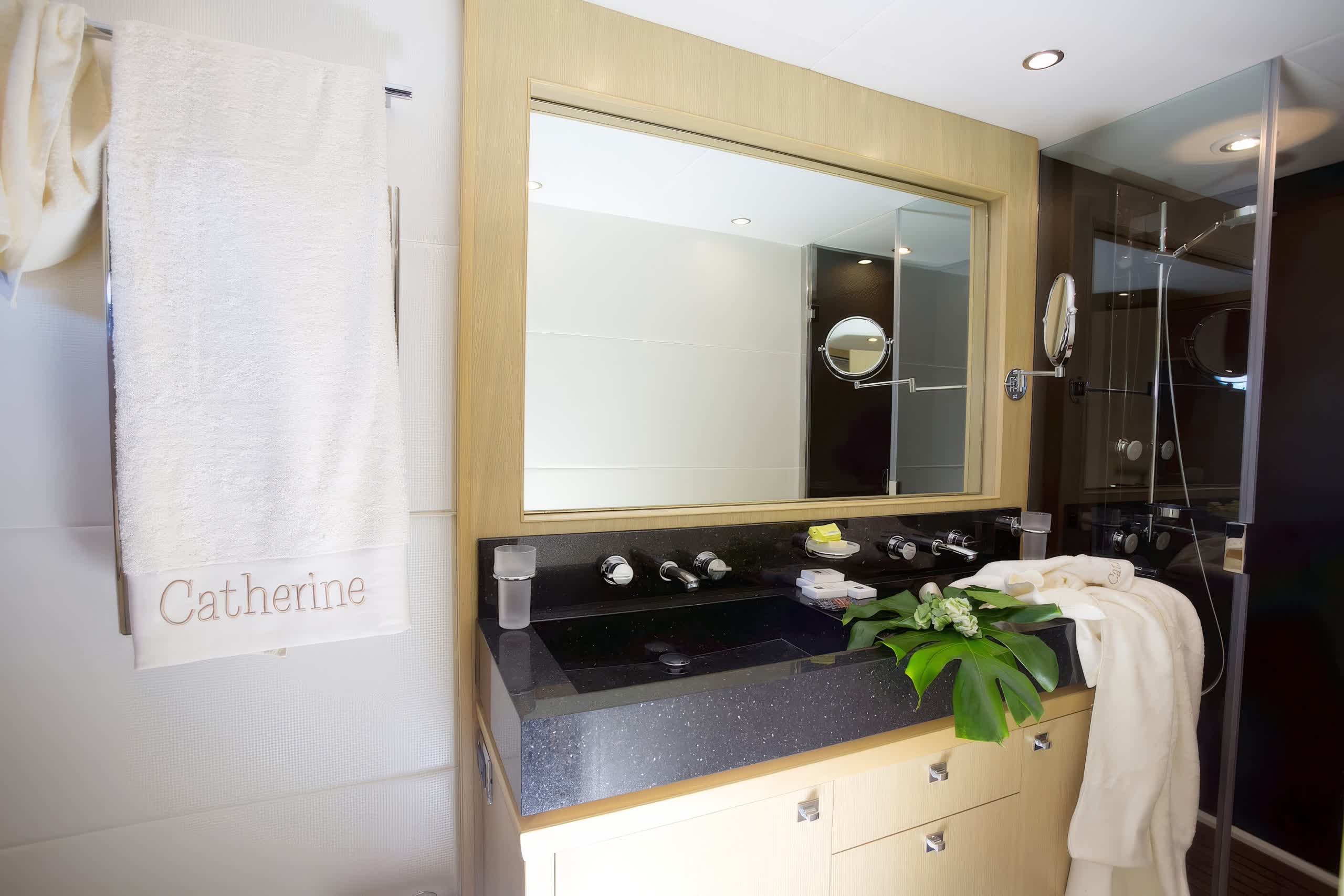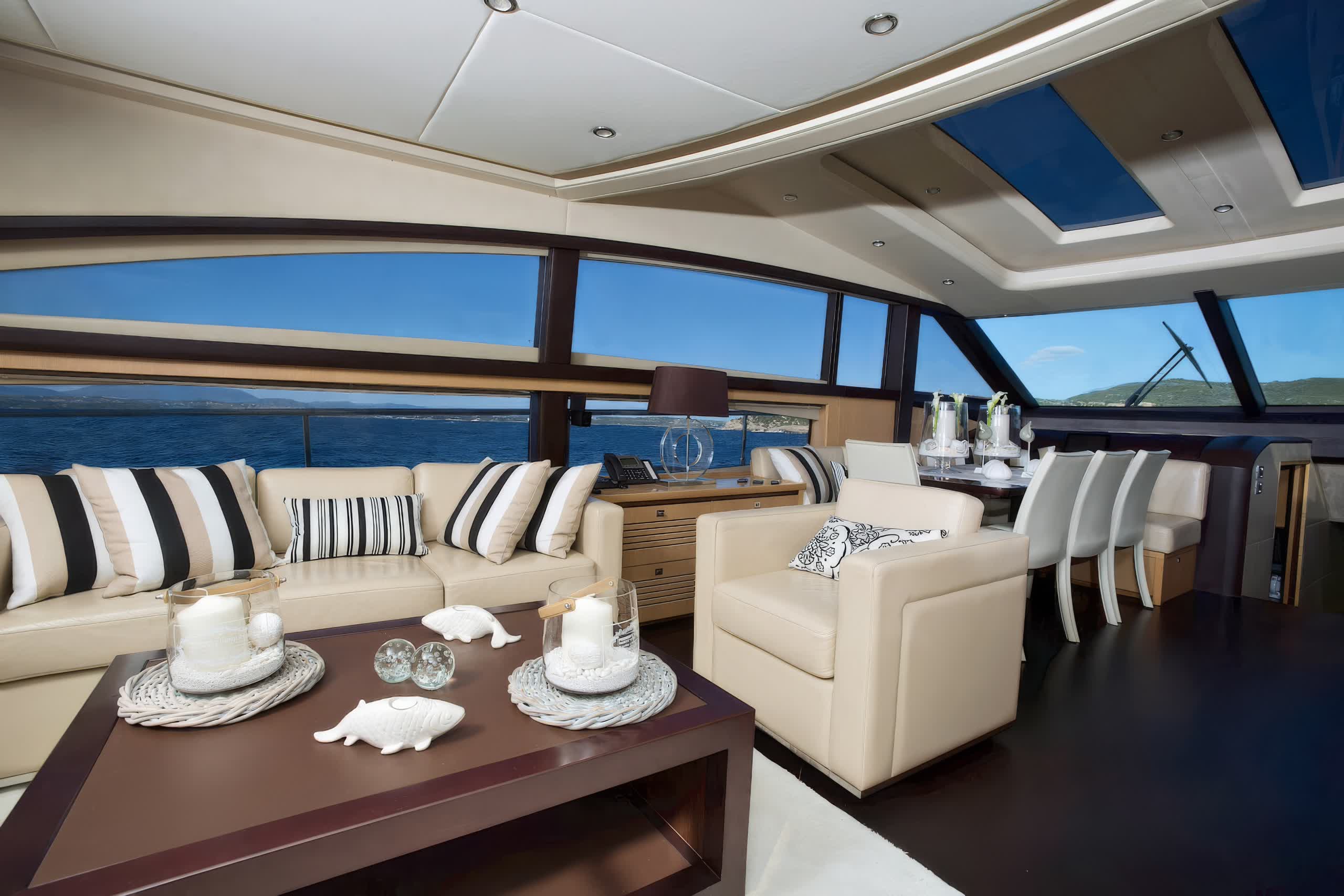 Catherine is a motor yacht 26 meters in length, produced by Princess Yachts in 2010, and is a splendid instance of upper-class and performance. The yacht sleeps eight guests in four spacious cabins, including a full-beam, midship master stateroom with a king-size bed, lounge area, vanity, and custom vertical windows that flood the room with natural light. The forward VIP cabin, meanwhile, runs the full beam, and has a queen-size bed, while the twin accommodation in the two cabins port and starboard has side-by-side twins convertible to doubles if needed. All cabins have LED TVs and DVD players.