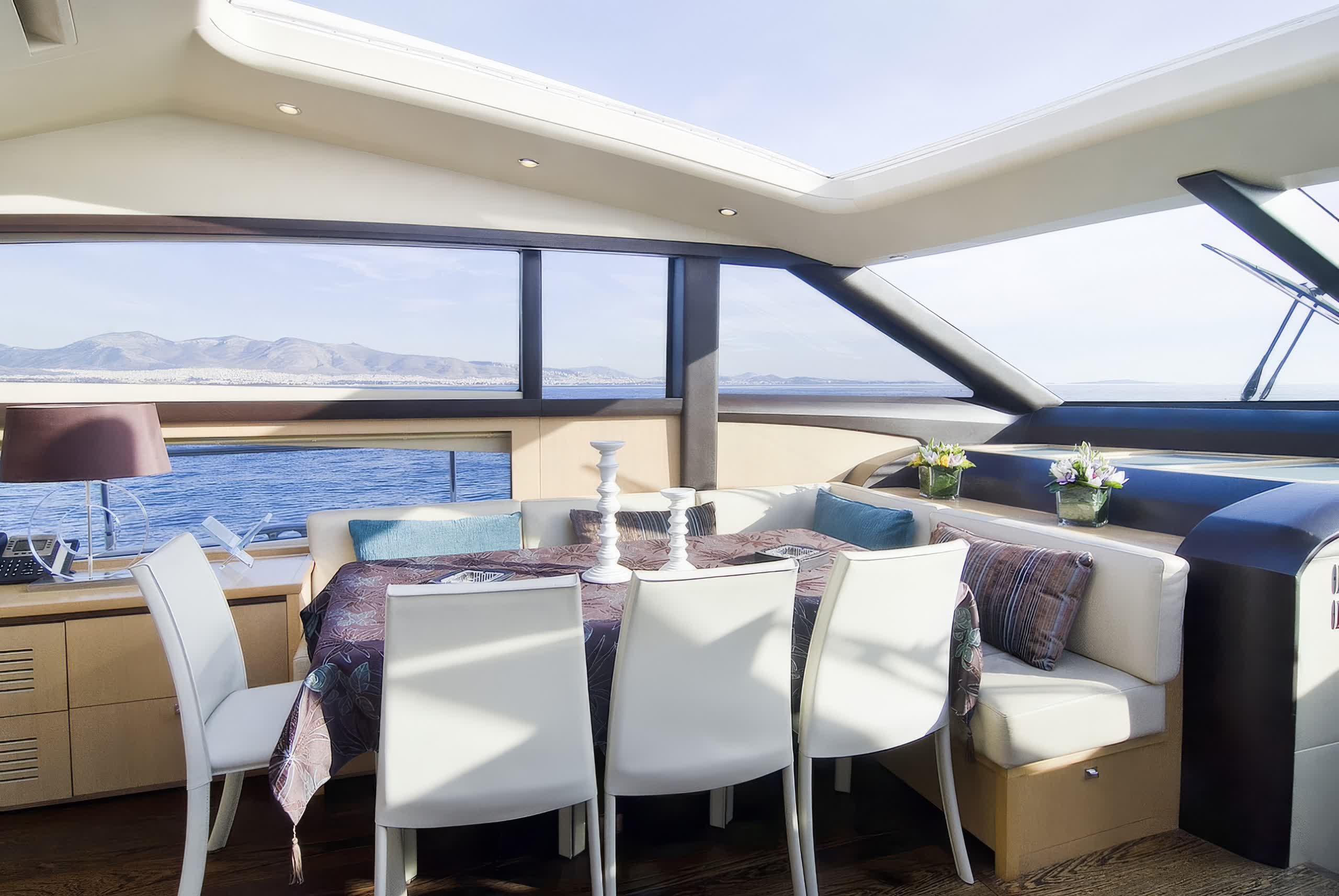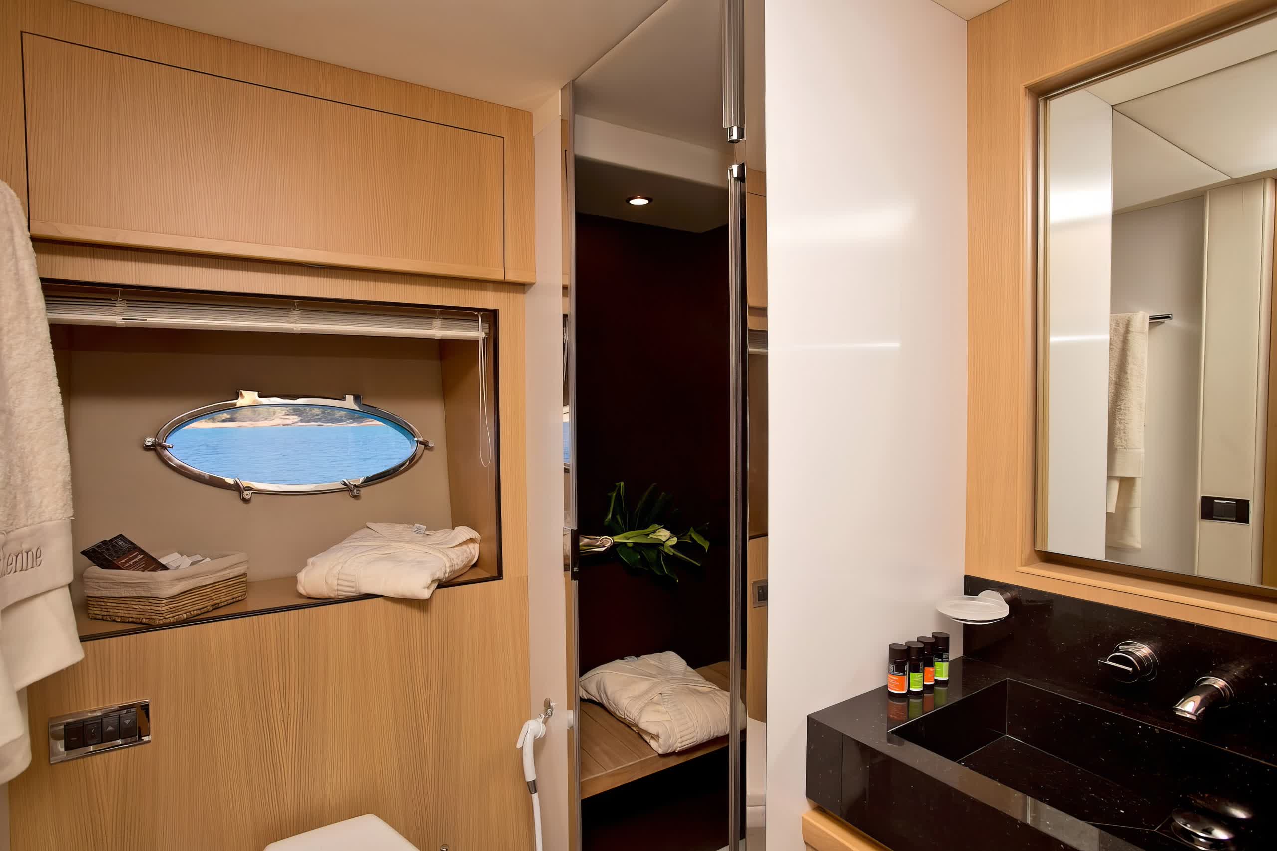 Modern yet cozy, with attractive furniture and a layout conducive to combining peacefulness with social interaction. It has a saloon with ample seating and a dining area where meals can be prepared by an onboard chef in a formal setting. The exterior spaces of Catherine are designed for comfort and conviviality. The spacious aft deck has lounge seating, sunpad and alfresco dining area —ideal for outdoor meals. Outdoor deck spaces include the foredeck, with more alfresco dining and sunbathing areas, but also the flybridge, which has plenty of seating and options for shade.