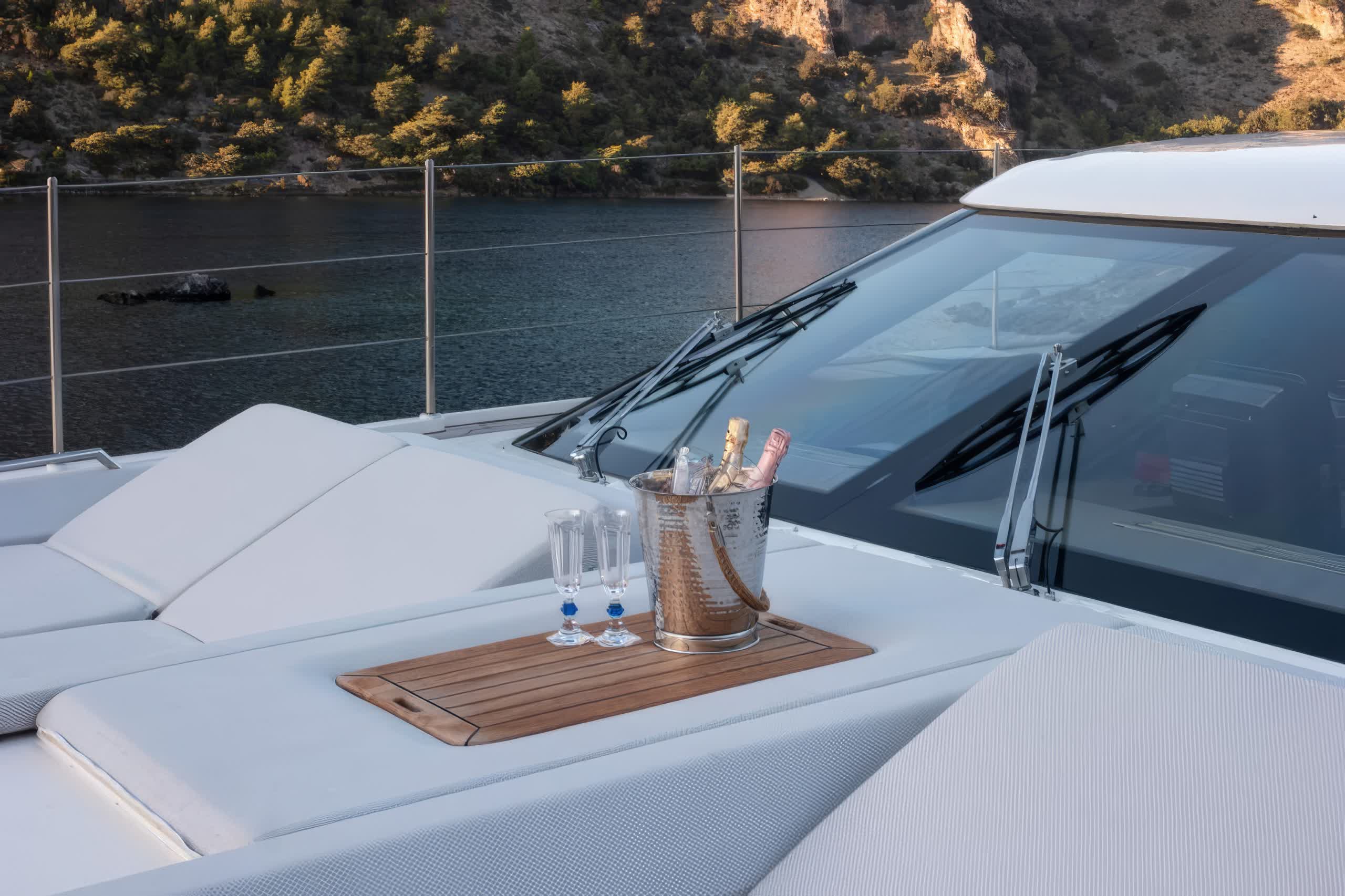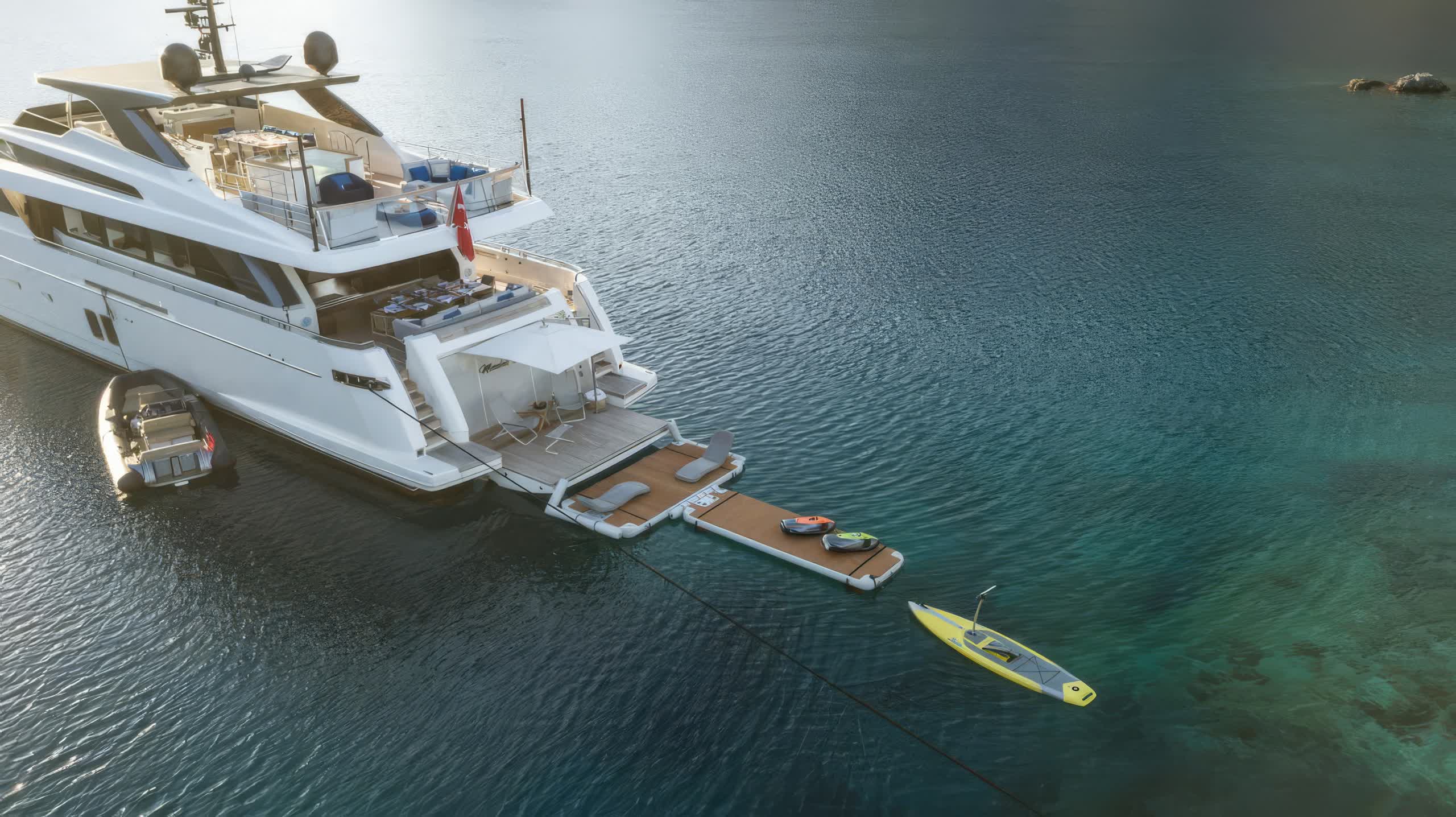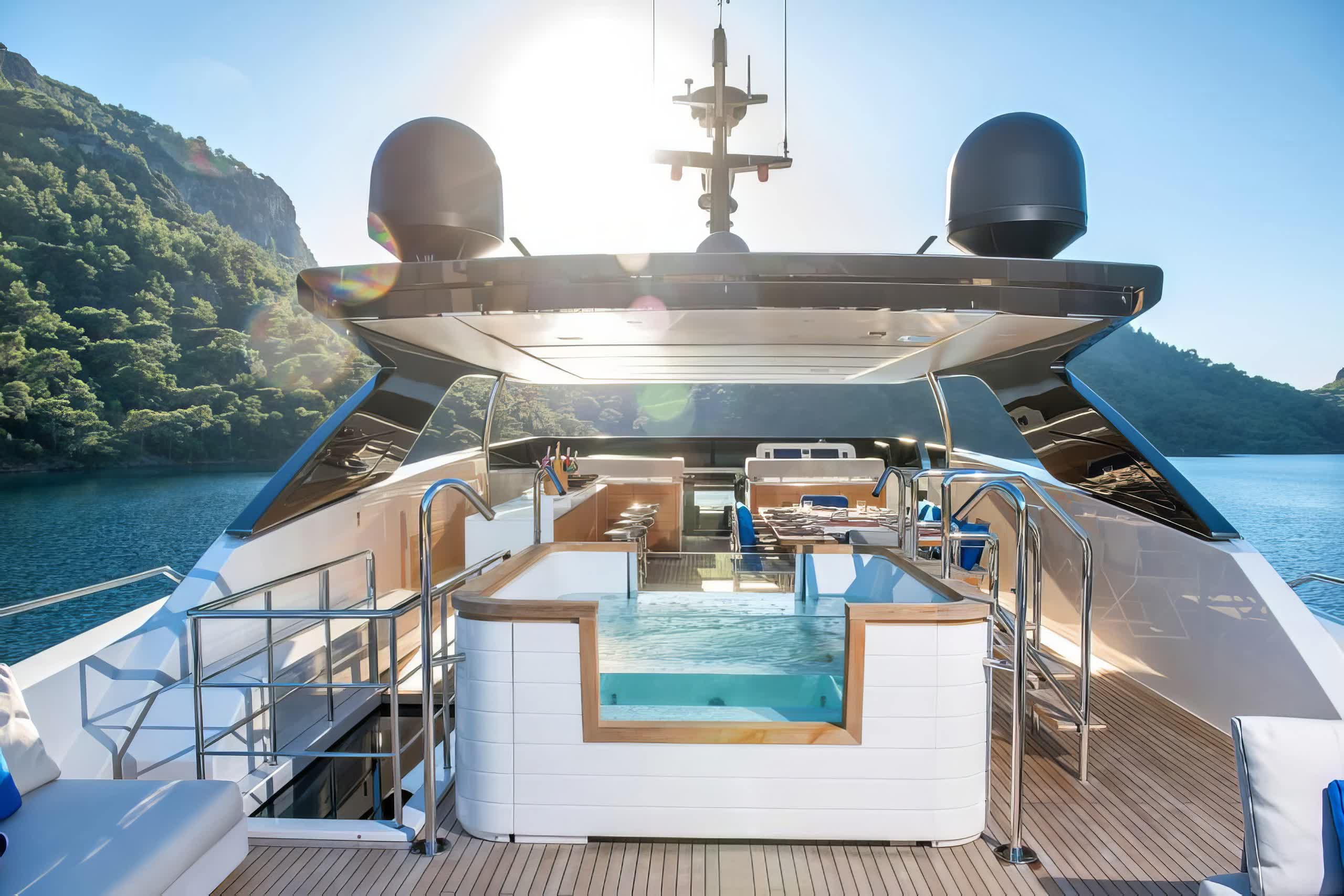 When deployed, the extended swim platform makes access to water toys simple and enables the launching of several tenders. There is a Jacuzzi on sundeck for a relaxing place to take in the panoramic views. The main deck aft offers alfresco dining with a raised table sheltered by the overhang from the flybridge for an inviting setting for outdoor meals. Side walkways lead around to the foredeck, more double sunbeds with adjustable headrests are arranged forward of the raised pilothouse for additional lounge space.