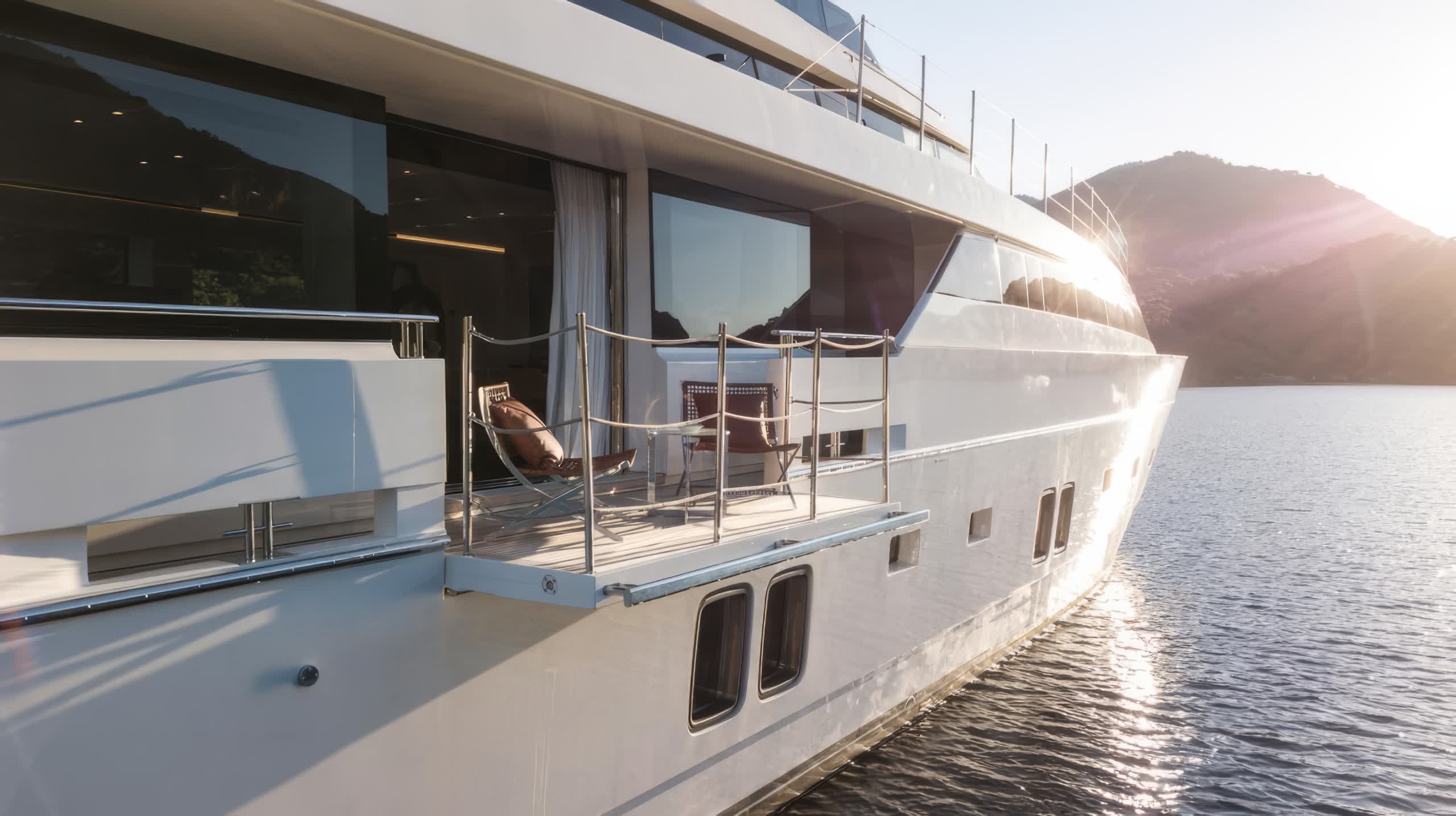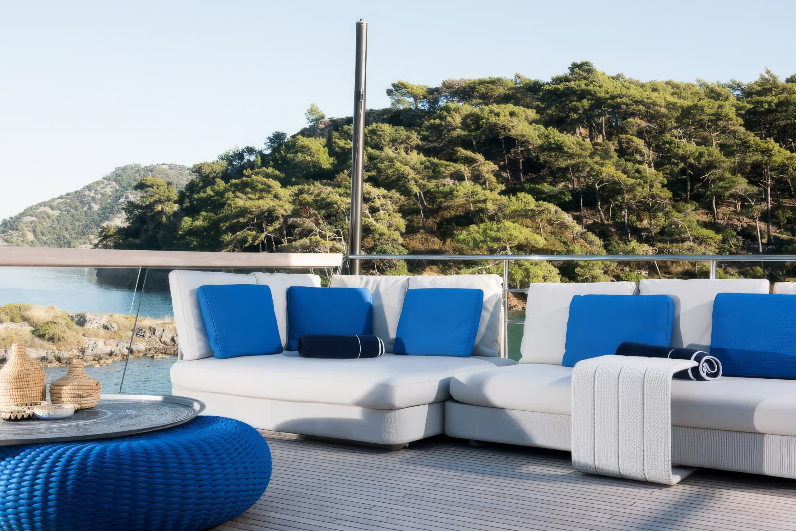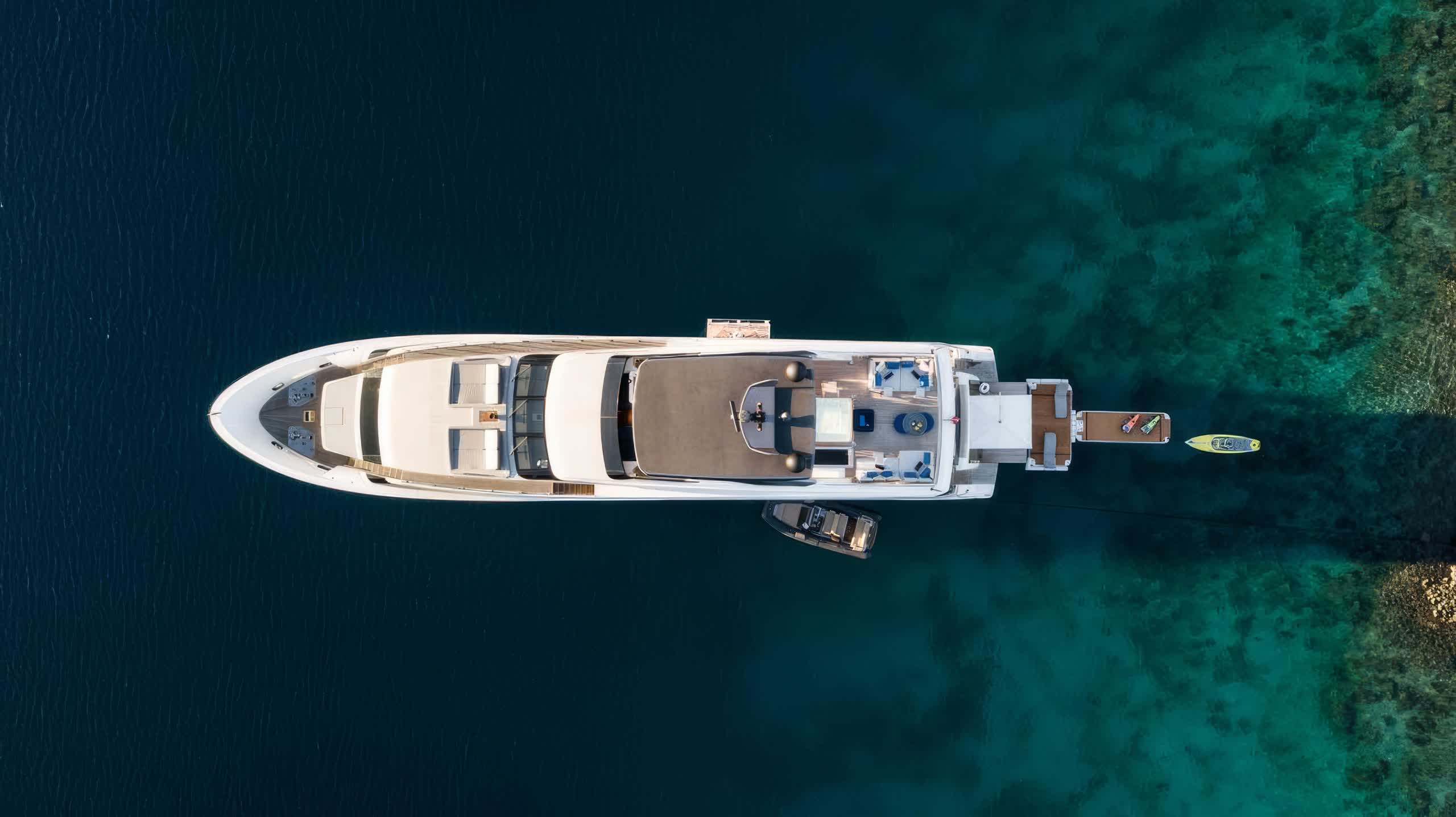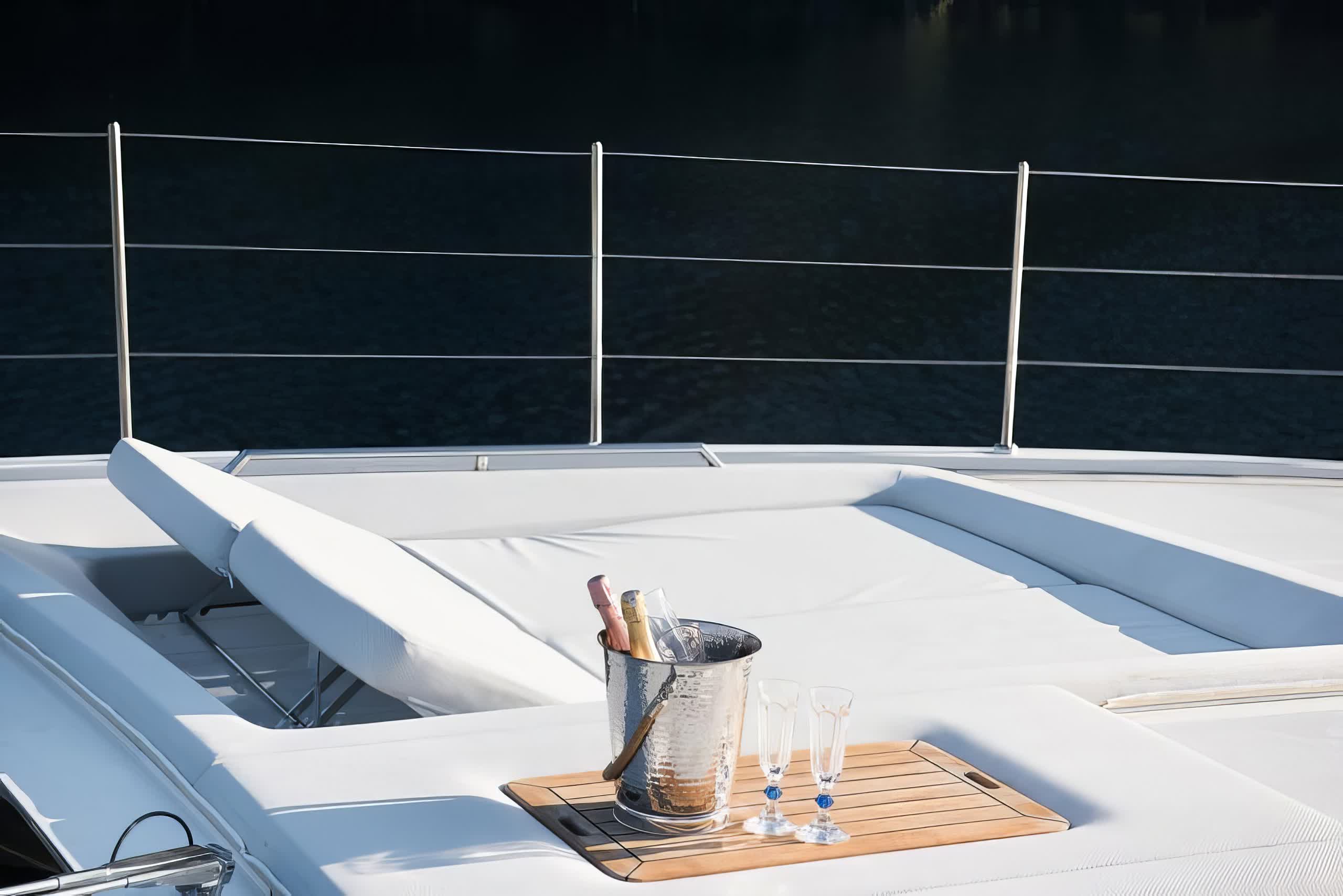 When deployed, the extended swim platform makes access to water toys simple and enables the launching of several tenders. There is a Jacuzzi on sundeck for a relaxing place to take in the panoramic views. The main deck aft offers alfresco dining with a raised table sheltered by the overhang from the flybridge for an inviting setting for outdoor meals. Side walkways lead around to the foredeck, more double sunbeds with adjustable headrests are arranged forward of the raised pilothouse for additional lounge space.