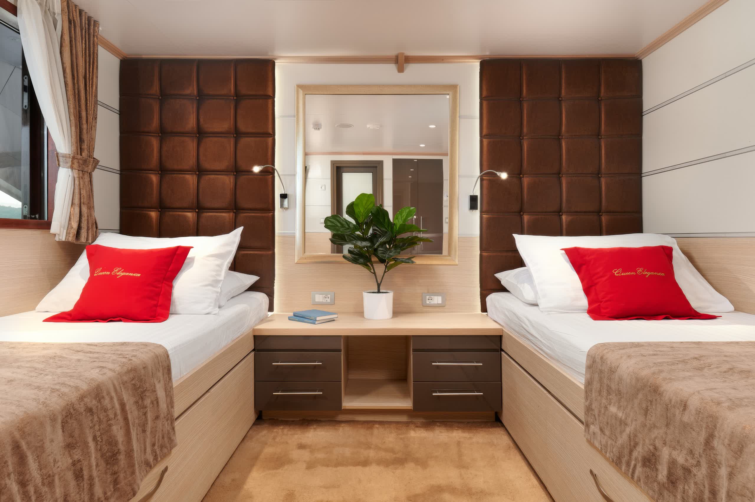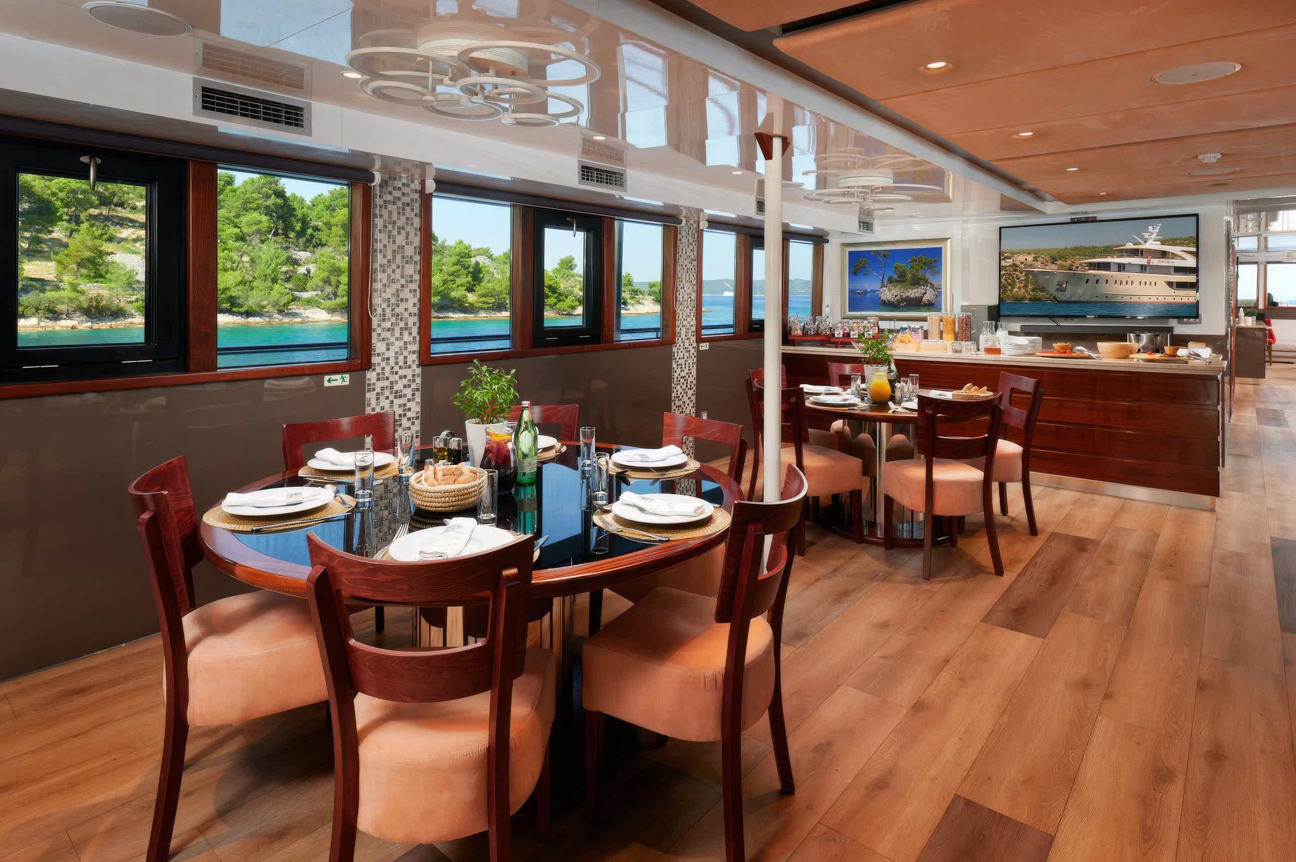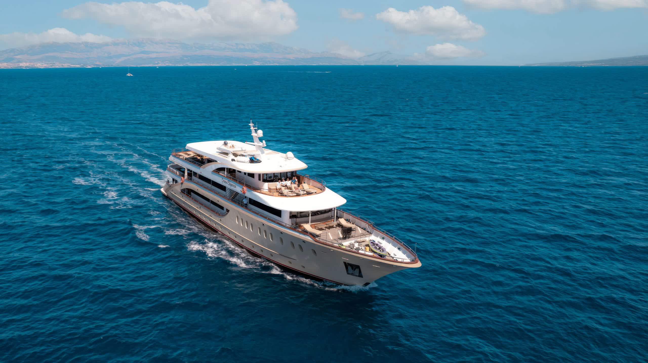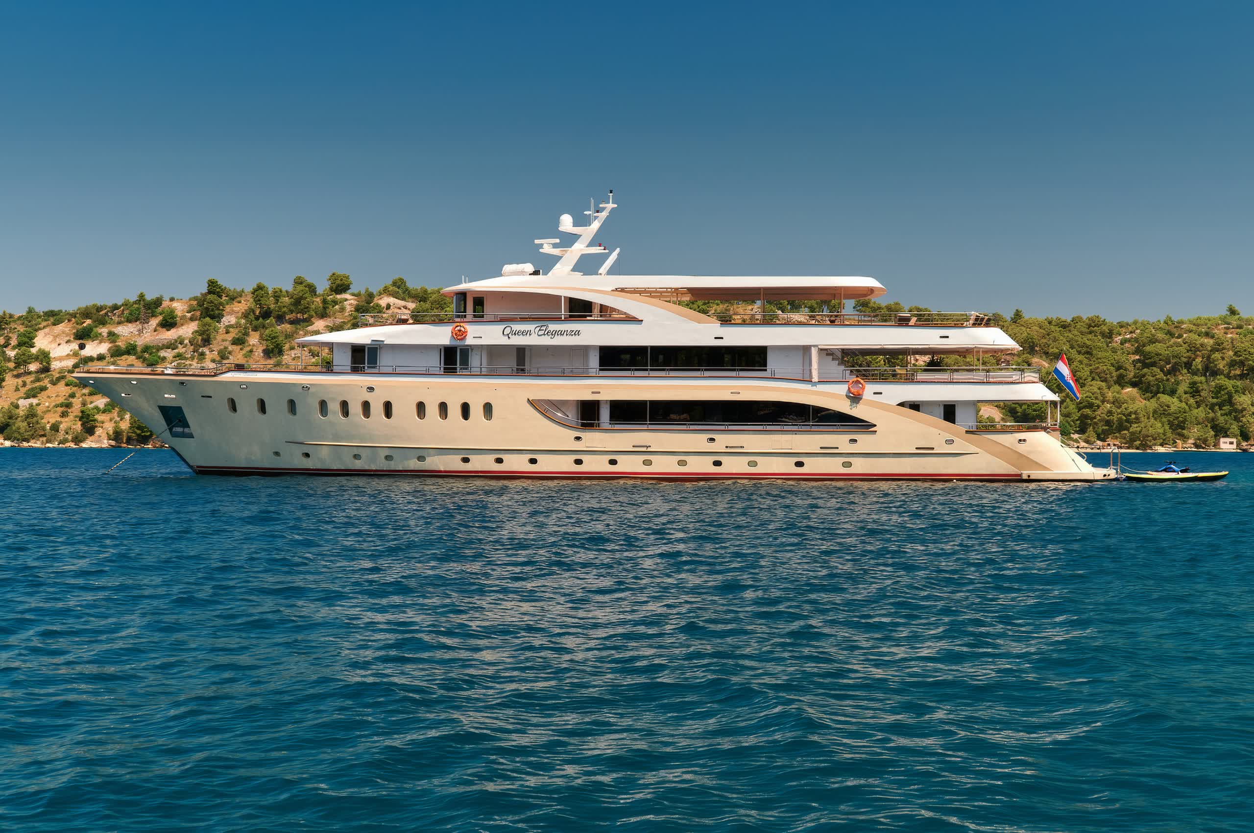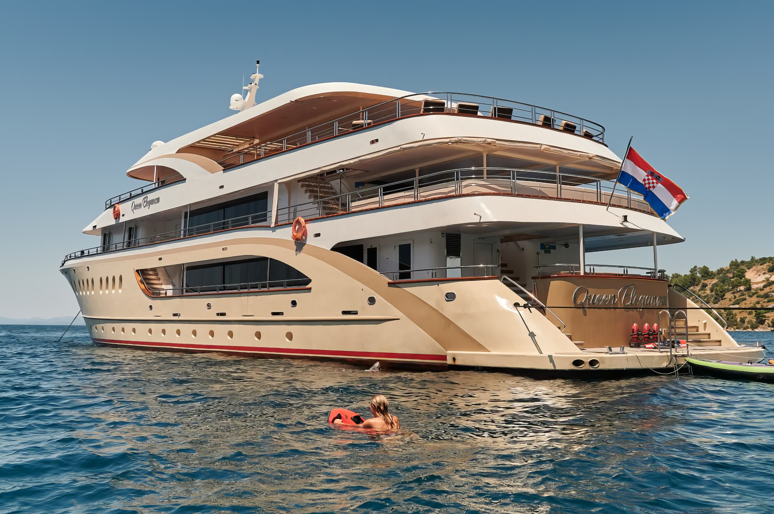Queen Eleganza is a 49-meter motor yacht built in 2018 by Radez Shipyard and fully refitted in 2024. She features lavish accommodations for as many as 34 guests in 17 staterooms, making her a great choice for large groups looking for an outstanding cruise along the Adriatic coastline. Her exterior lines are a steel hull with aluminum superstructure providing her with very solid stability as well as large deck areas. “Her full-displacement hull provides more stability at anchor for socially distancing and kicking back. A new jacuzzi has been installed on the large sundeck, while an open air cinema provides the perfect way to relax and watch movies after dark. Extra points for the open kitchen featuring lava grill, great to see the action and for the interactive feeling. Queen Eleganza provides accommodations designed for the comfort and privacy of all guests on board. The 18 staterooms are tastefully decorated in neutral tones and contemporary design, with an en-suite bathroom in every space. Stateroom layout includes 7 double cabins with queen-sized beds, 11 twin cabins with single beds.