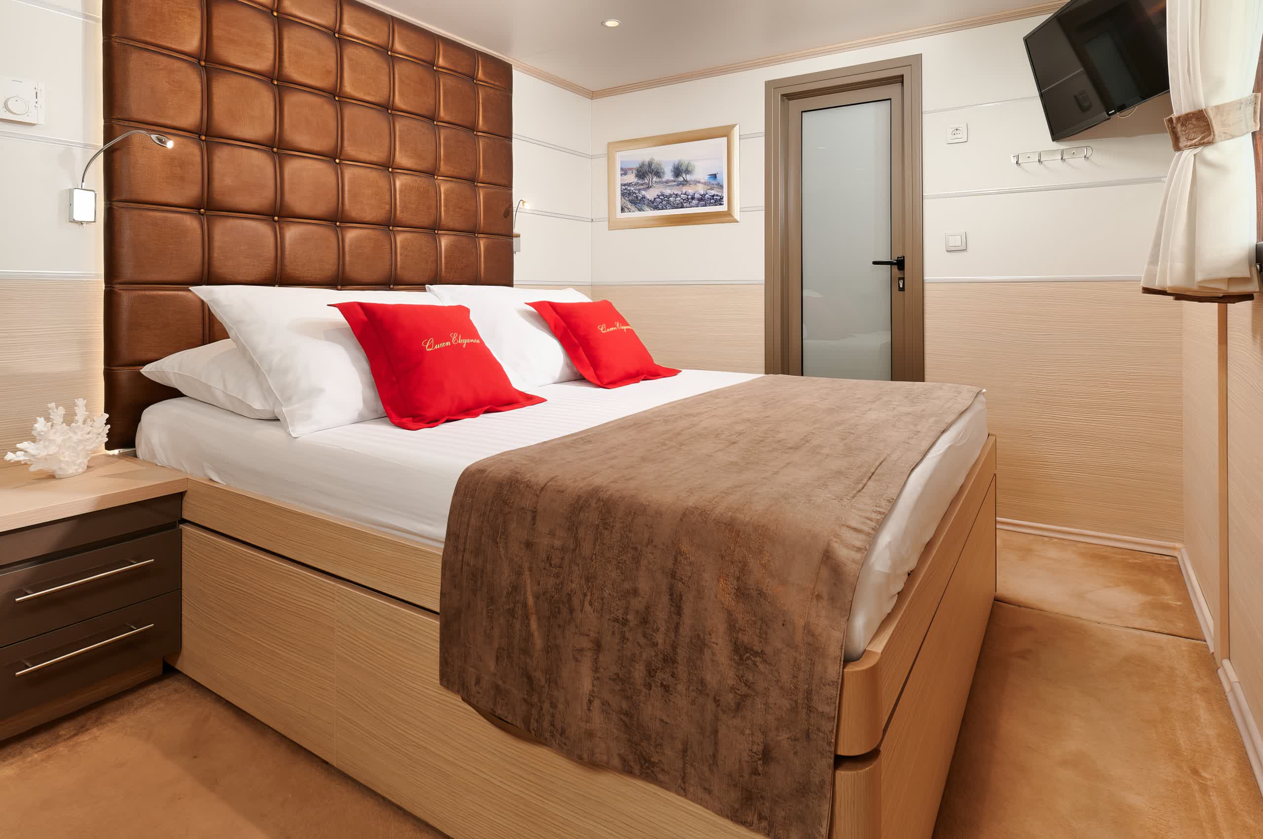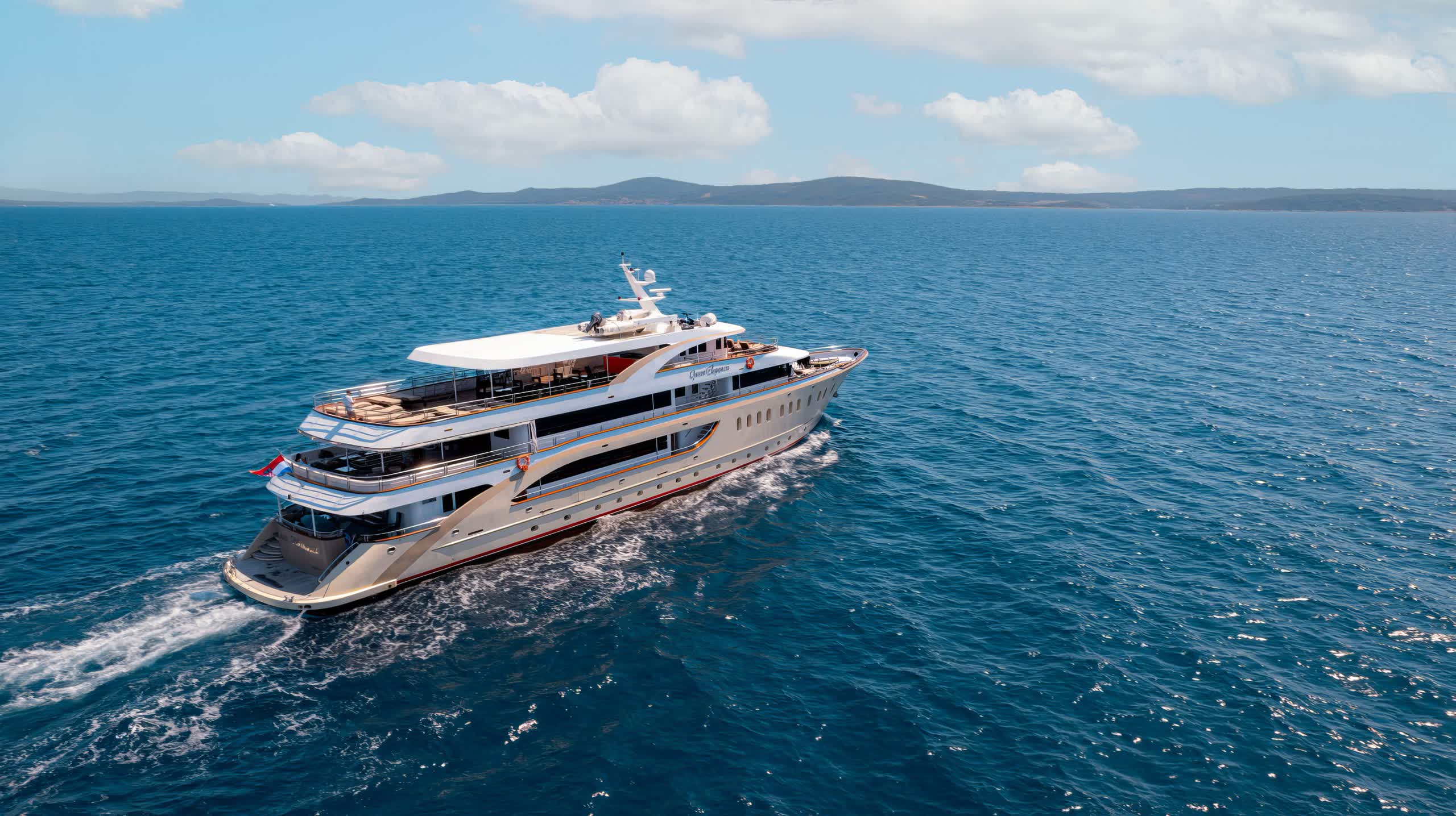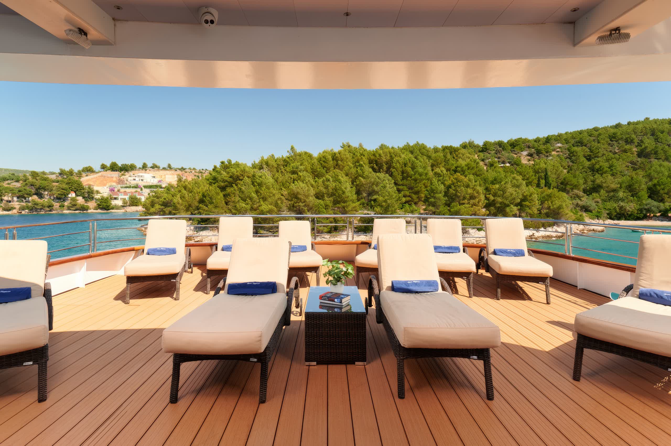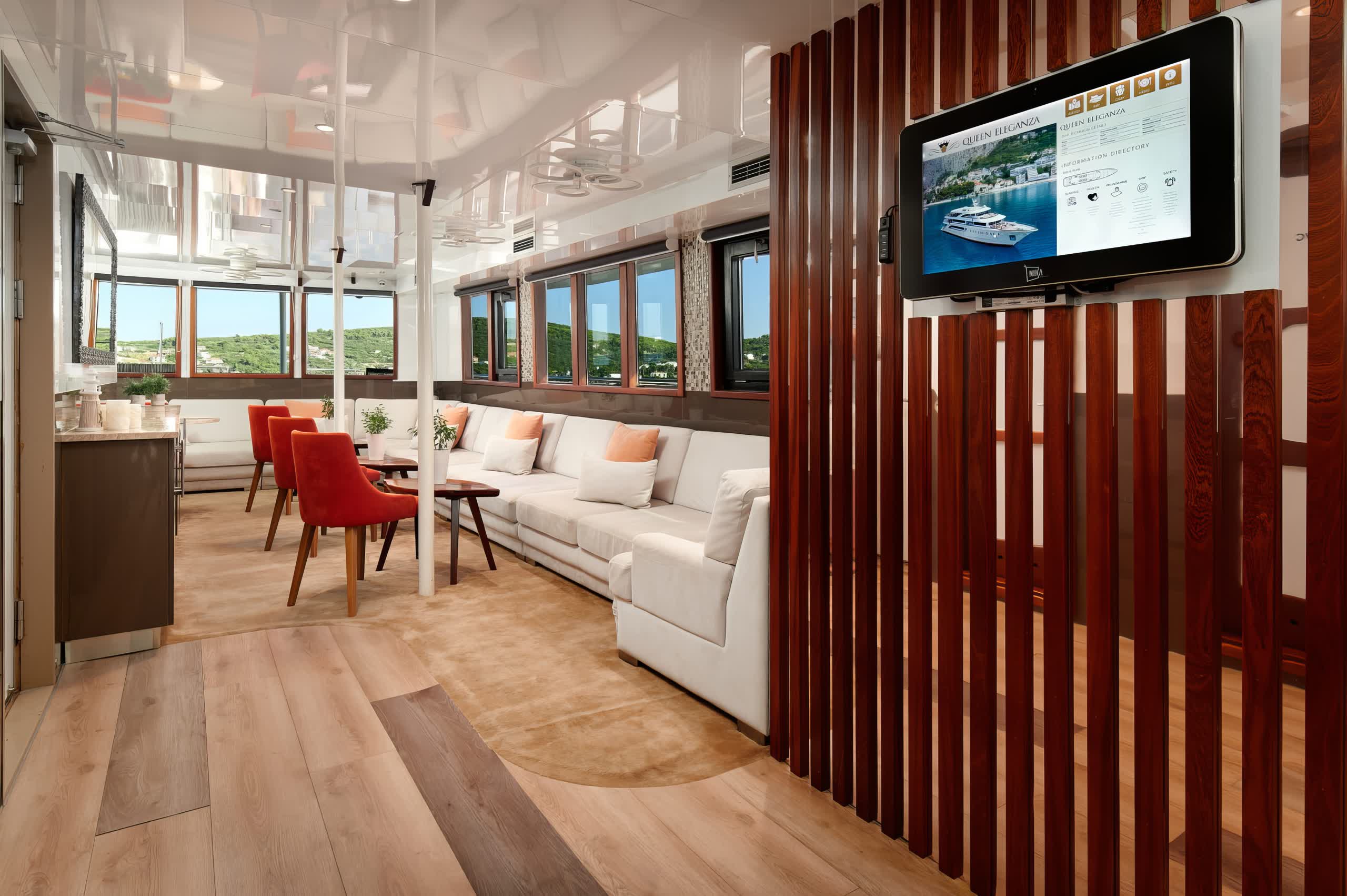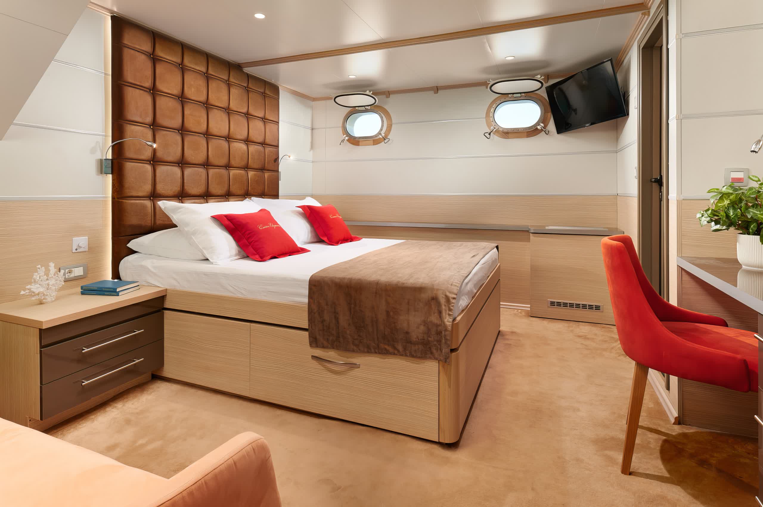 Queen Eleganza is a 49-meter motor yacht built in 2018 by Radez Shipyard and fully refitted in 2024. She features lavish accommodations for as many as 34 guests in 17 staterooms, making her a great choice for large groups looking for an outstanding cruise along the Adriatic coastline. Her exterior lines are a steel hull with aluminum superstructure providing her with very solid stability as well as large deck areas. “Her full-displacement hull provides more stability at anchor for socially distancing and kicking back. A new jacuzzi has been installed on the large sundeck, while an open air cinema provides the perfect way to relax and watch movies after dark. Extra points for the open kitchen featuring lava grill, great to see the action and for the interactive feeling. Queen Eleganza provides accommodations designed for the comfort and privacy of all guests on board. The 18 staterooms are tastefully decorated in neutral tones and contemporary design, with an en-suite bathroom in every space. Stateroom layout includes 7 double cabins with queen-sized beds, 11 twin cabins with single beds.