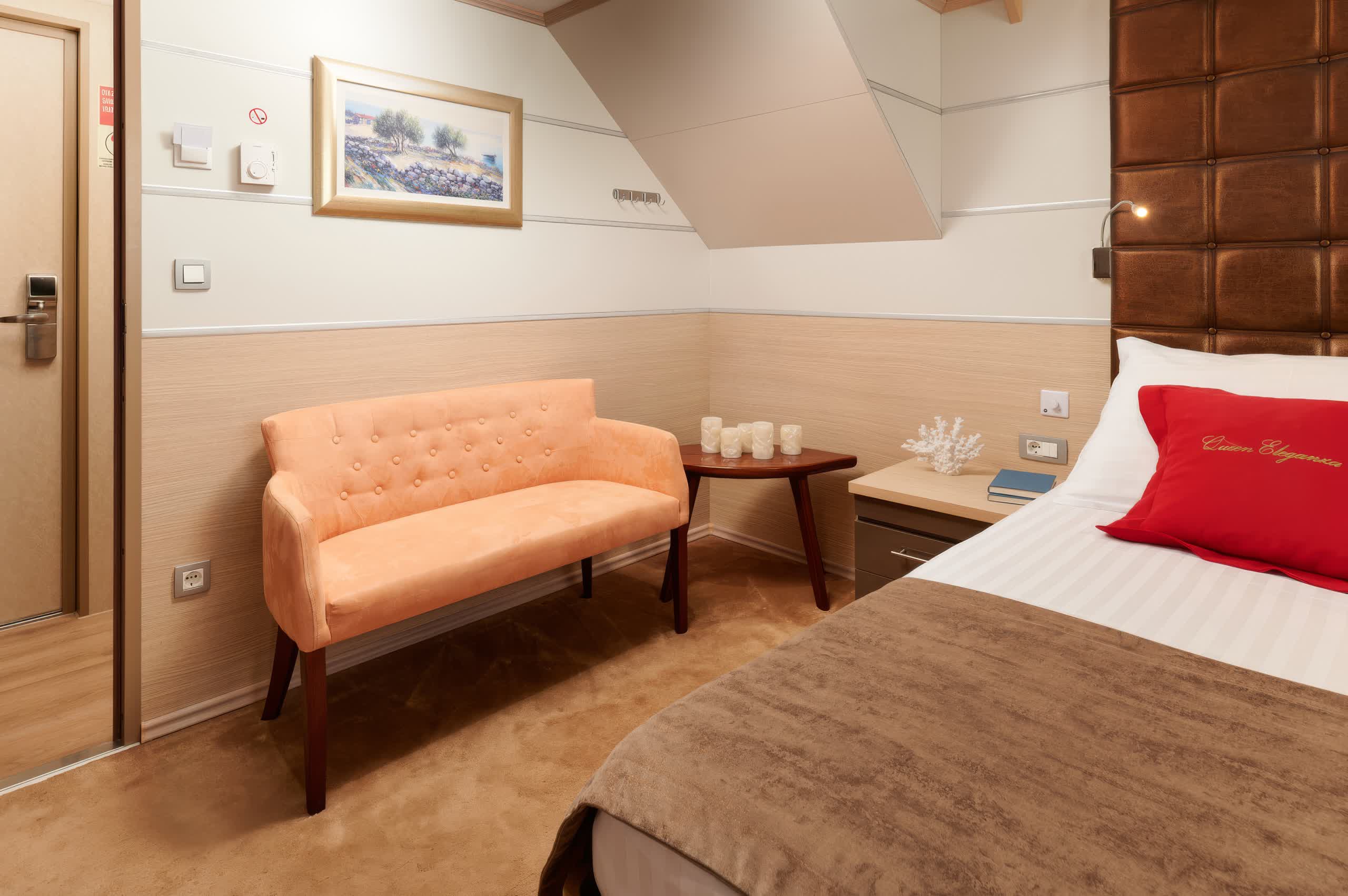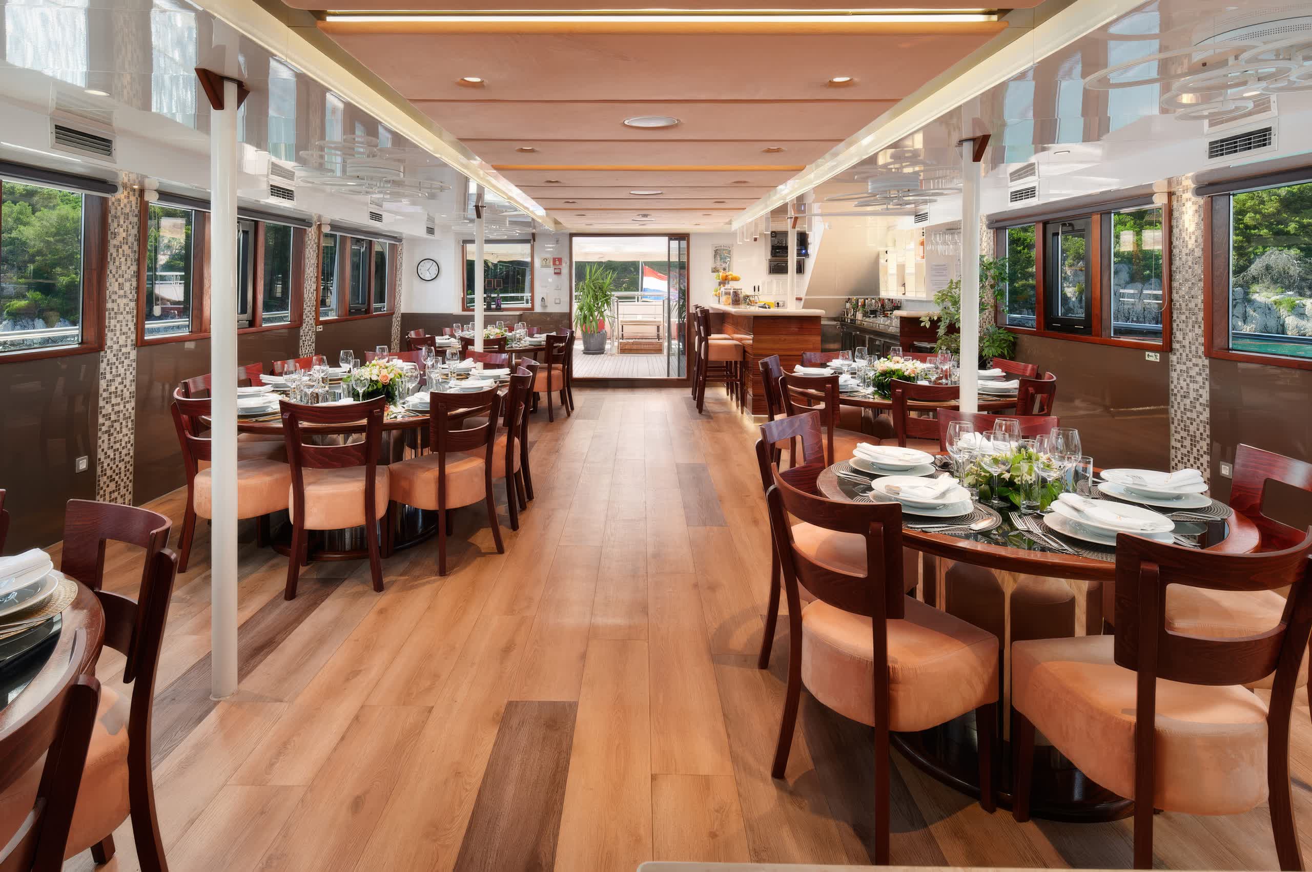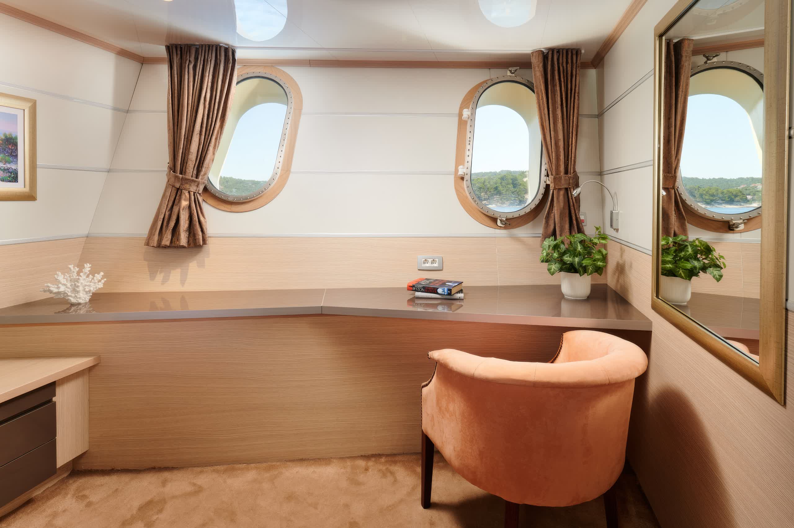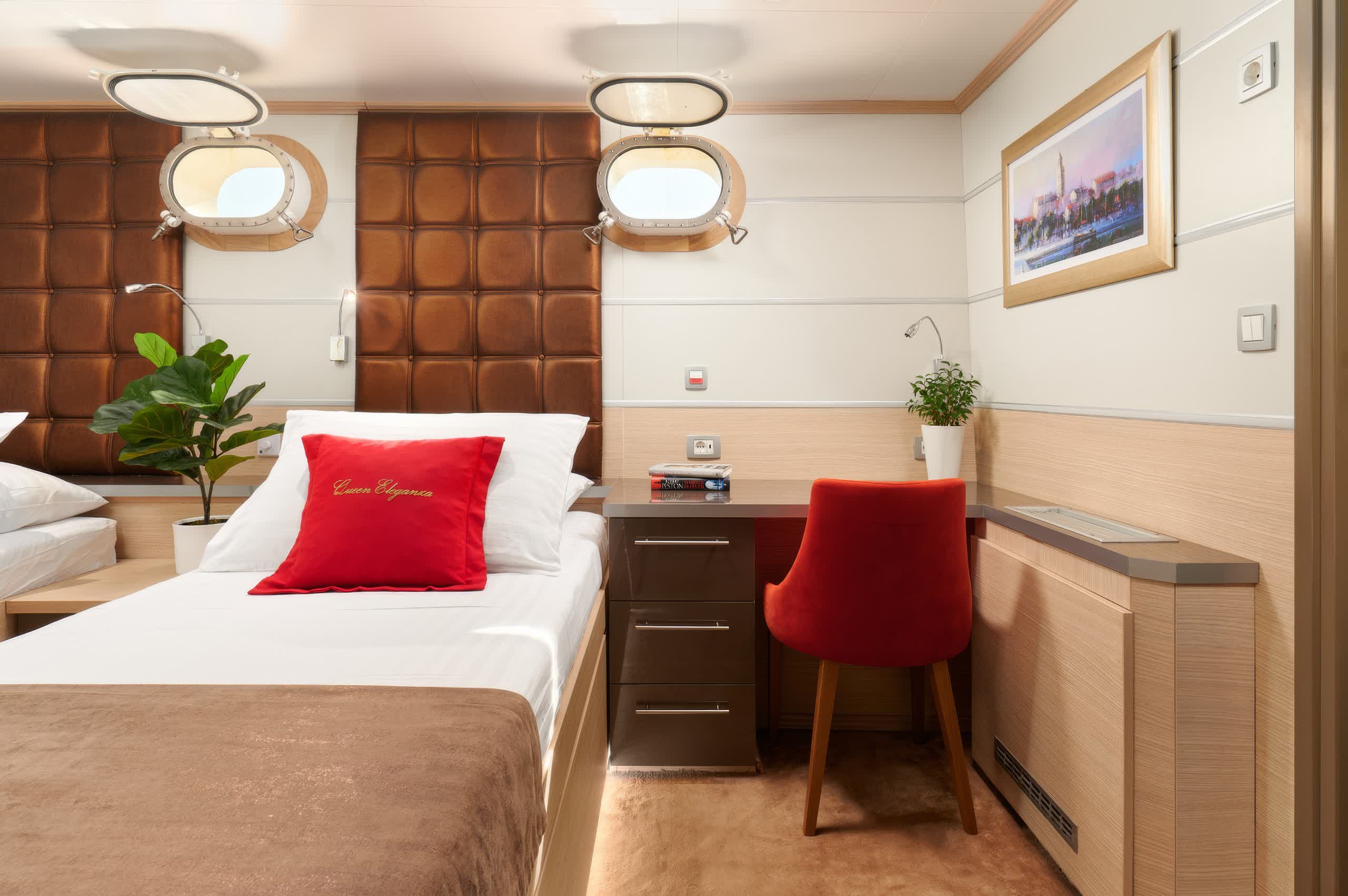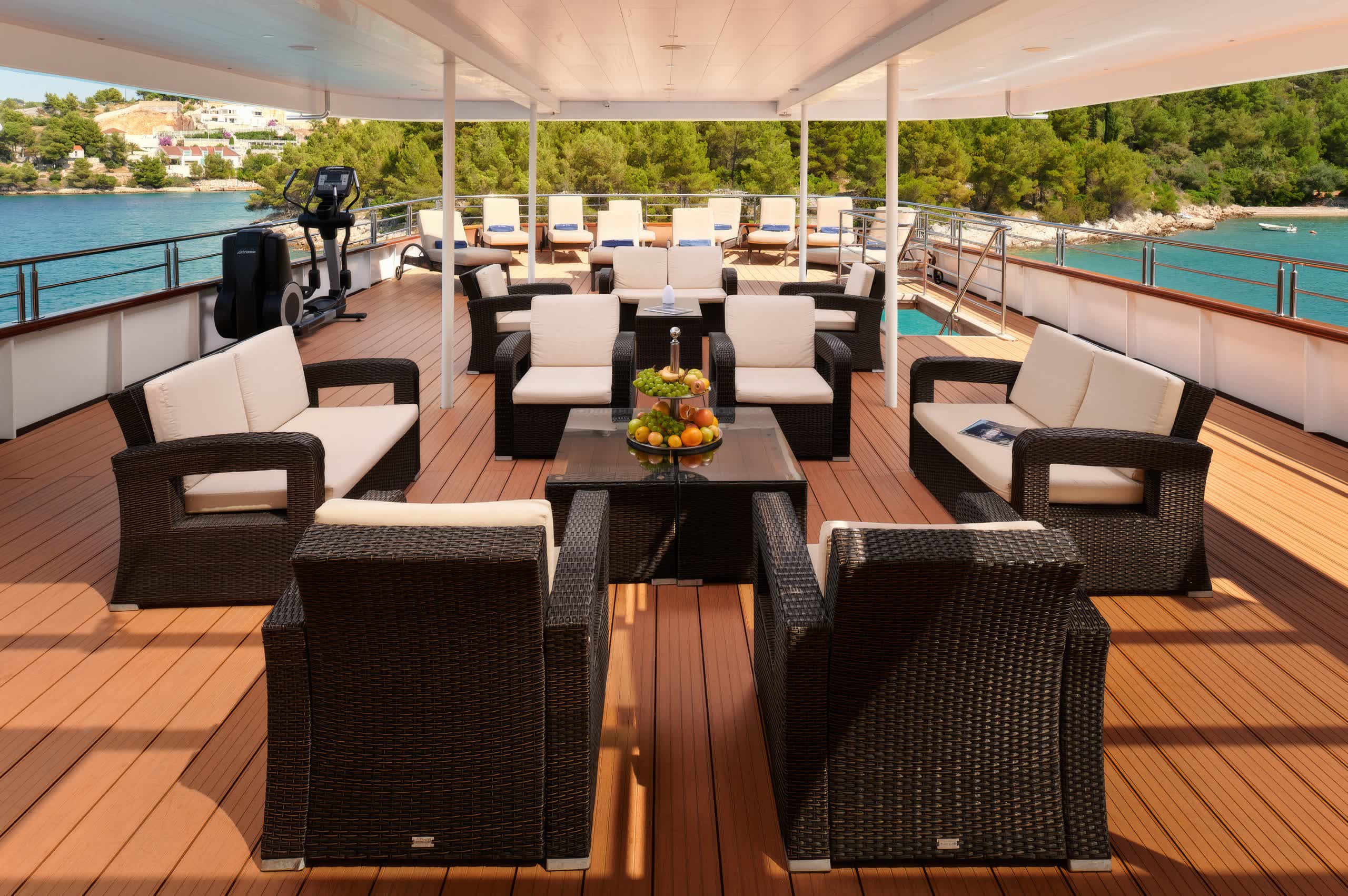 Queen Eleganza is a 49-meter motor yacht built in 2018 by Radez Shipyard and fully refitted in 2024. She features lavish accommodations for as many as 34 guests in 17 staterooms, making her a great choice for large groups looking for an outstanding cruise along the Adriatic coastline. Her exterior lines are a steel hull with aluminum superstructure providing her with very solid stability as well as large deck areas. “Her full-displacement hull provides more stability at anchor for socially distancing and kicking back. A new jacuzzi has been installed on the large sundeck, while an open air cinema provides the perfect way to relax and watch movies after dark. Extra points for the open kitchen featuring lava grill, great to see the action and for the interactive feeling. Queen Eleganza provides accommodations designed for the comfort and privacy of all guests on board. The 18 staterooms are tastefully decorated in neutral tones and contemporary design, with an en-suite bathroom in every space. Stateroom layout includes 7 double cabins with queen-sized beds, 11 twin cabins with single beds.