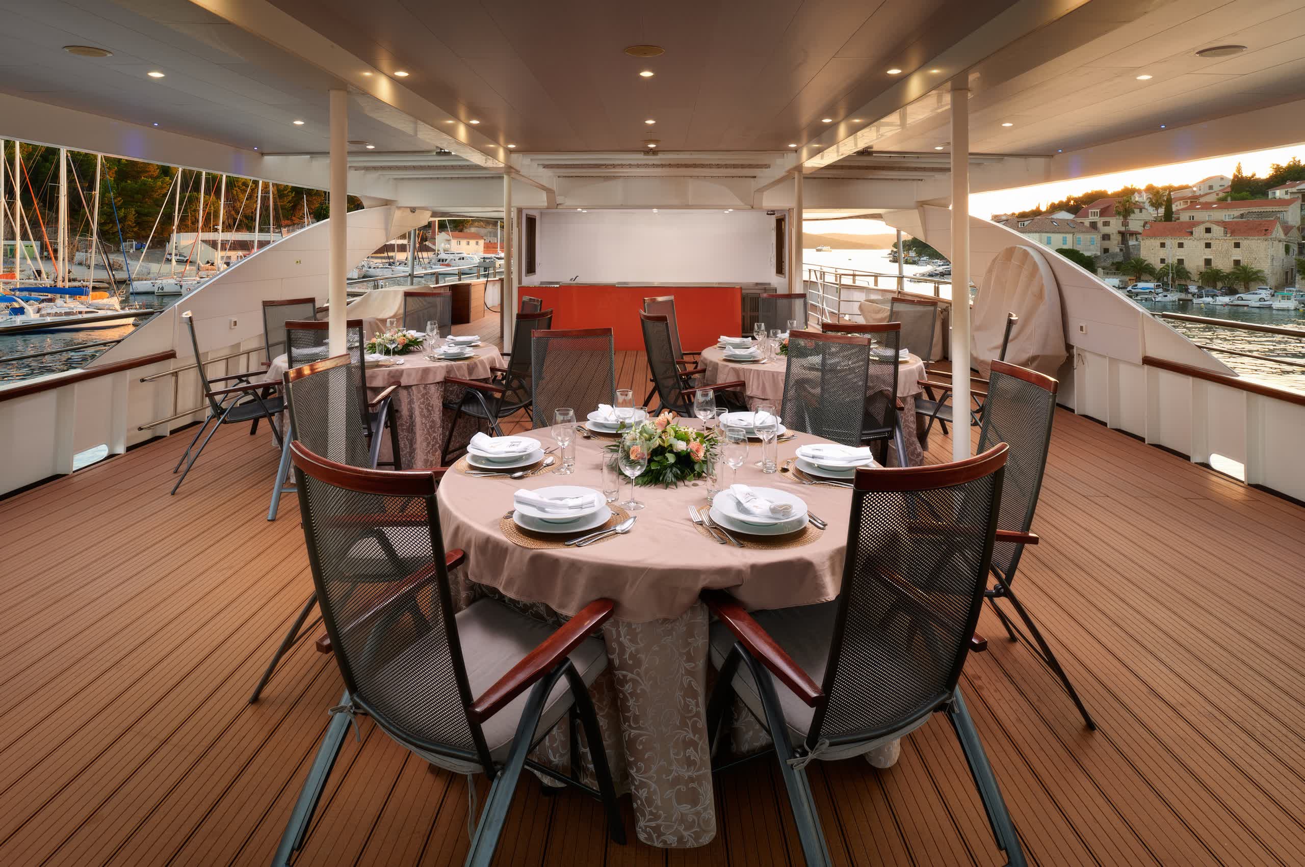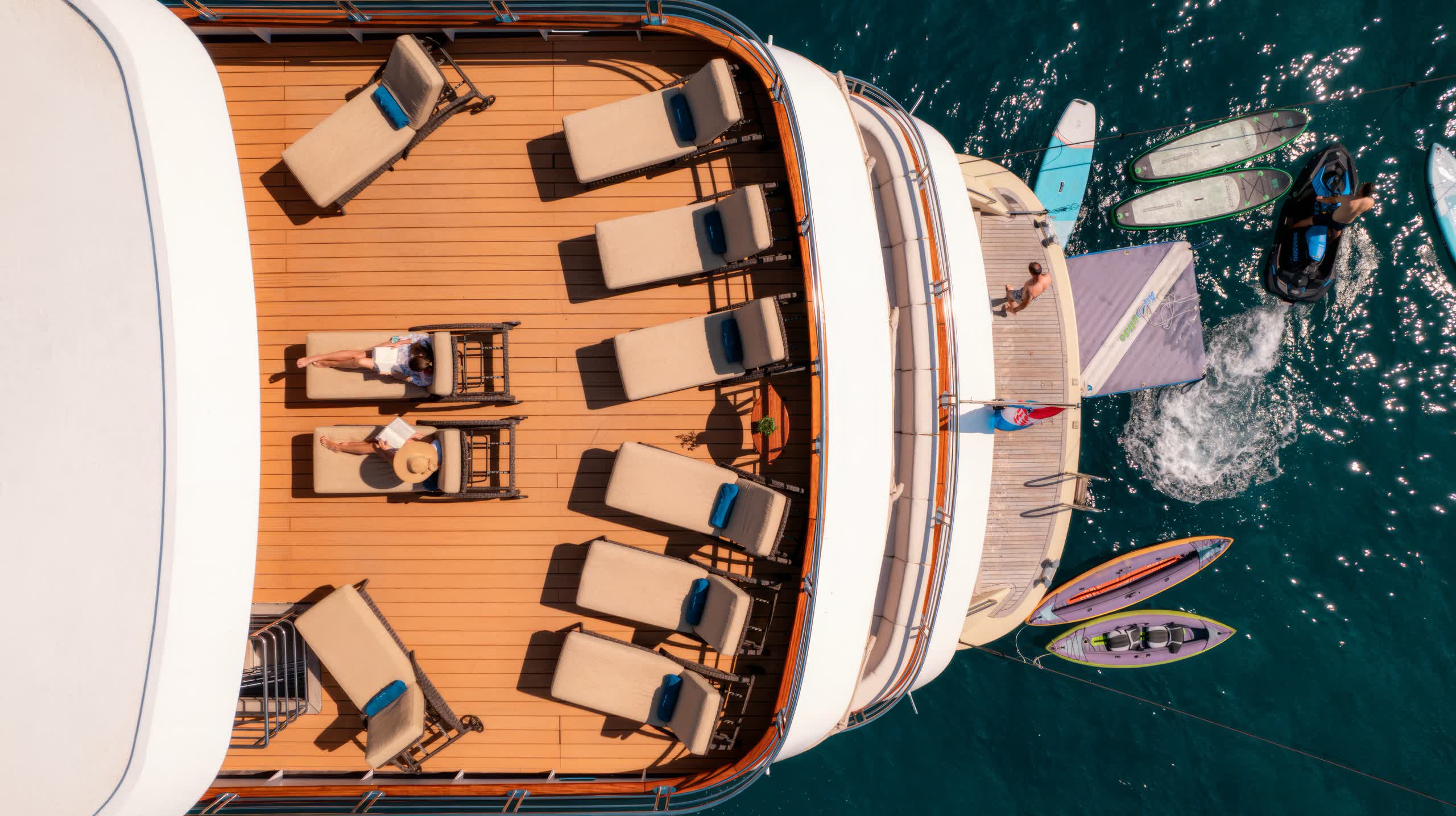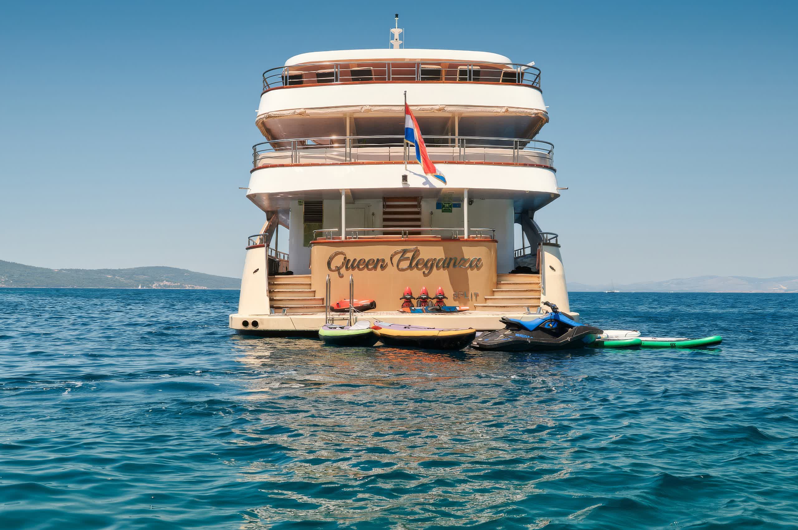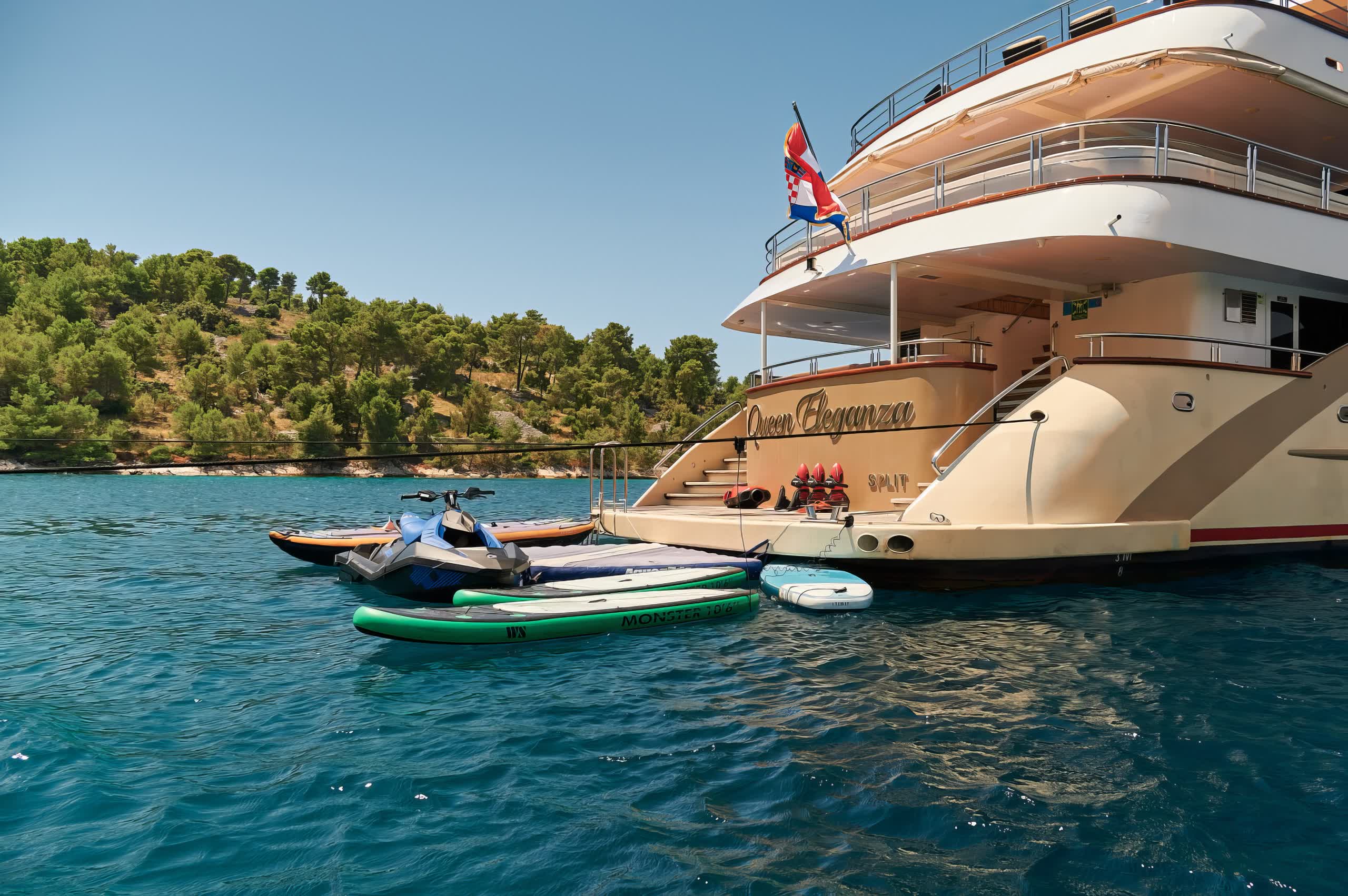 When it comes to entertainment and relaxation, Queen Eleganza offers an extensive selection of water toys and recreation amenities. Activities include jet skiing, water skiing, kayaking and paddleboarding. The yacht is also equipped with snorkelling gear, fishing rods, inflatable toys, and Yamaha sea scooters for younger guests, ensuring everyone on board stays entertained. A 60hp tender can be used for excursions and exploring nearby coastal sights. You are supported by a dedicated and skilled crew of up to ten, comprised of accomplished captains and chefs, they all strive to provide unmatched service as well as a trip to remember. Their in-depth understanding of the Croatian coast means they can showcase hidden gems and beautiful locations that enhance the overall charter experience. A standout feature is Queen Eleganza's access to VIP Noa Beach Bar in Zrće, where the yacht can rent the space for private parties with world-famous DJs, making it a bespoke addition to any event.