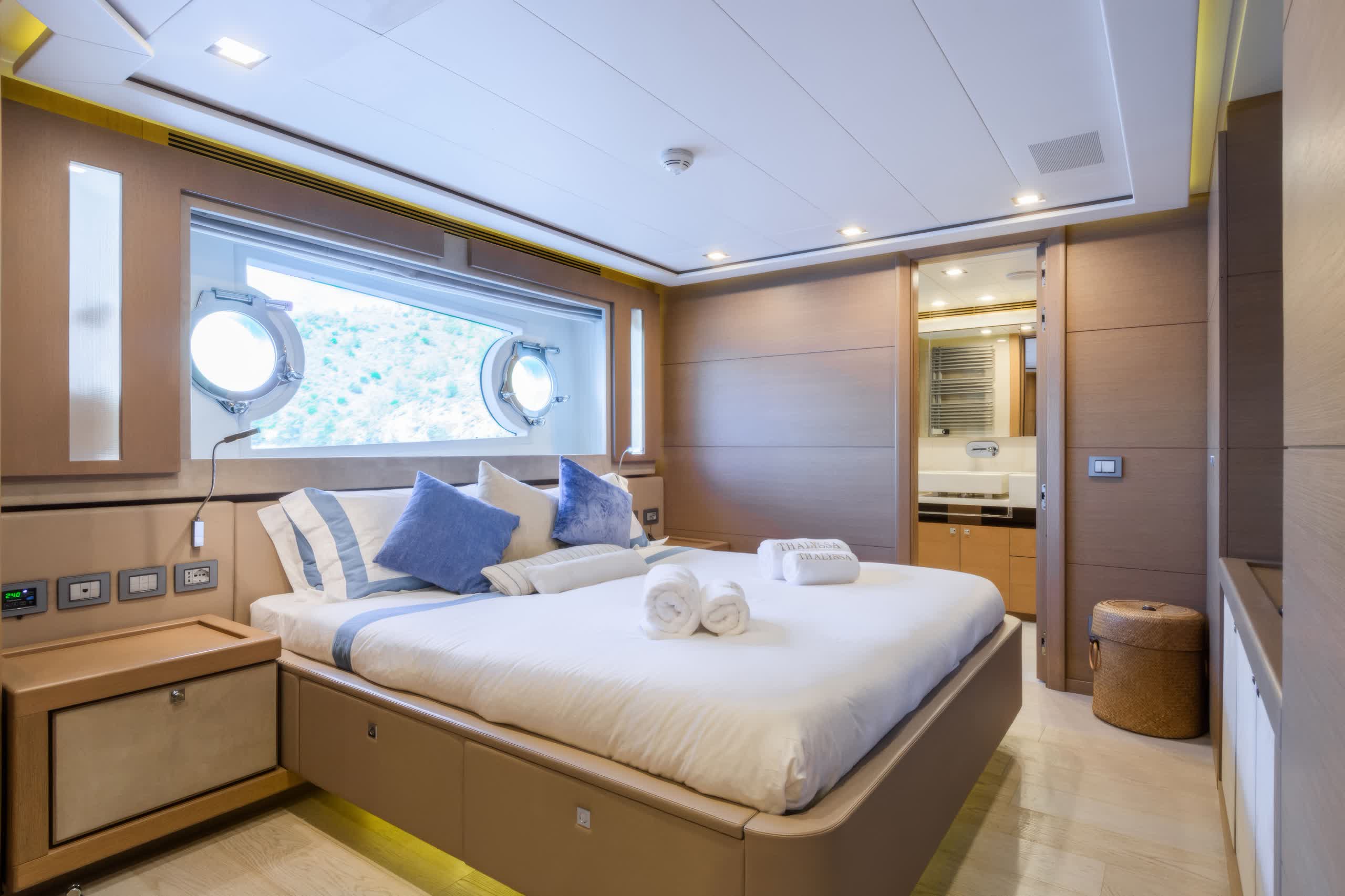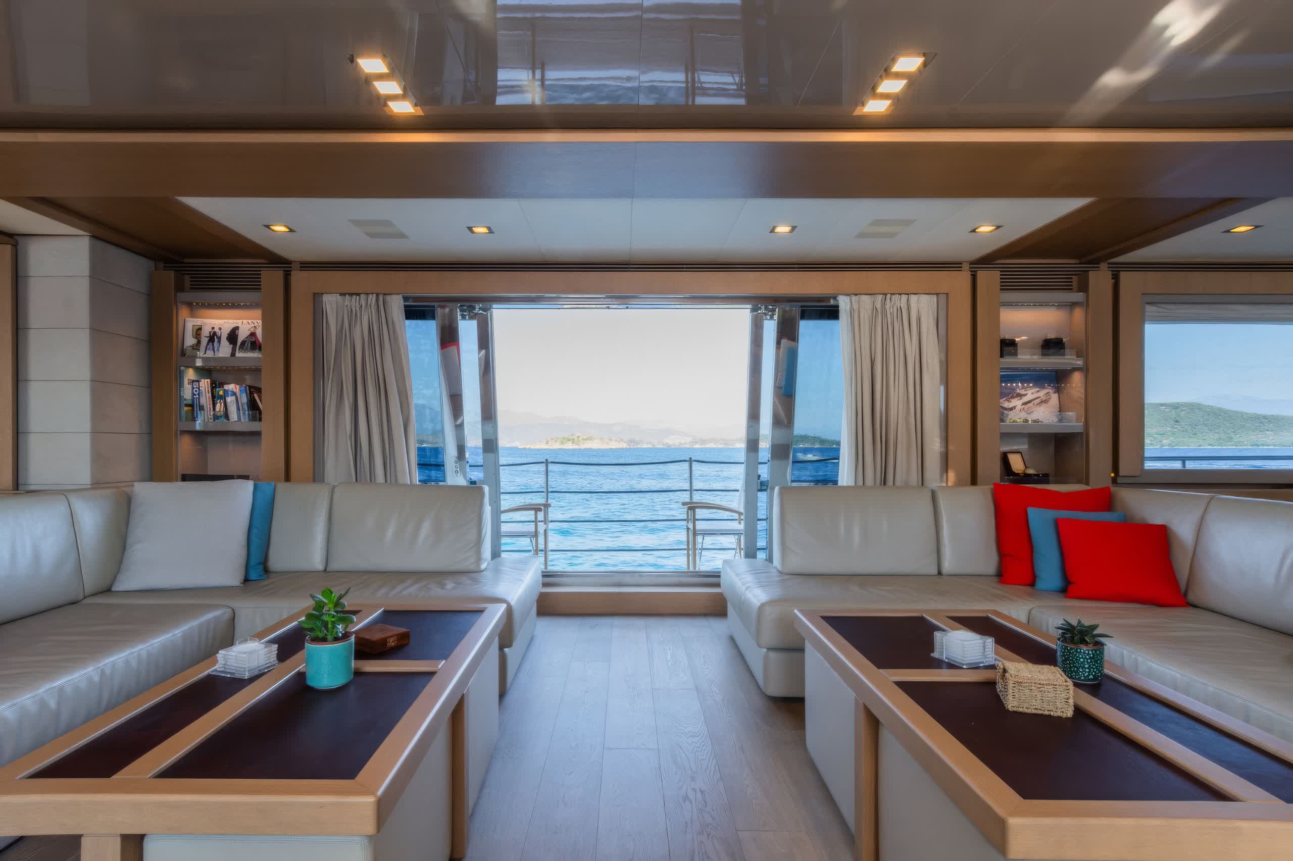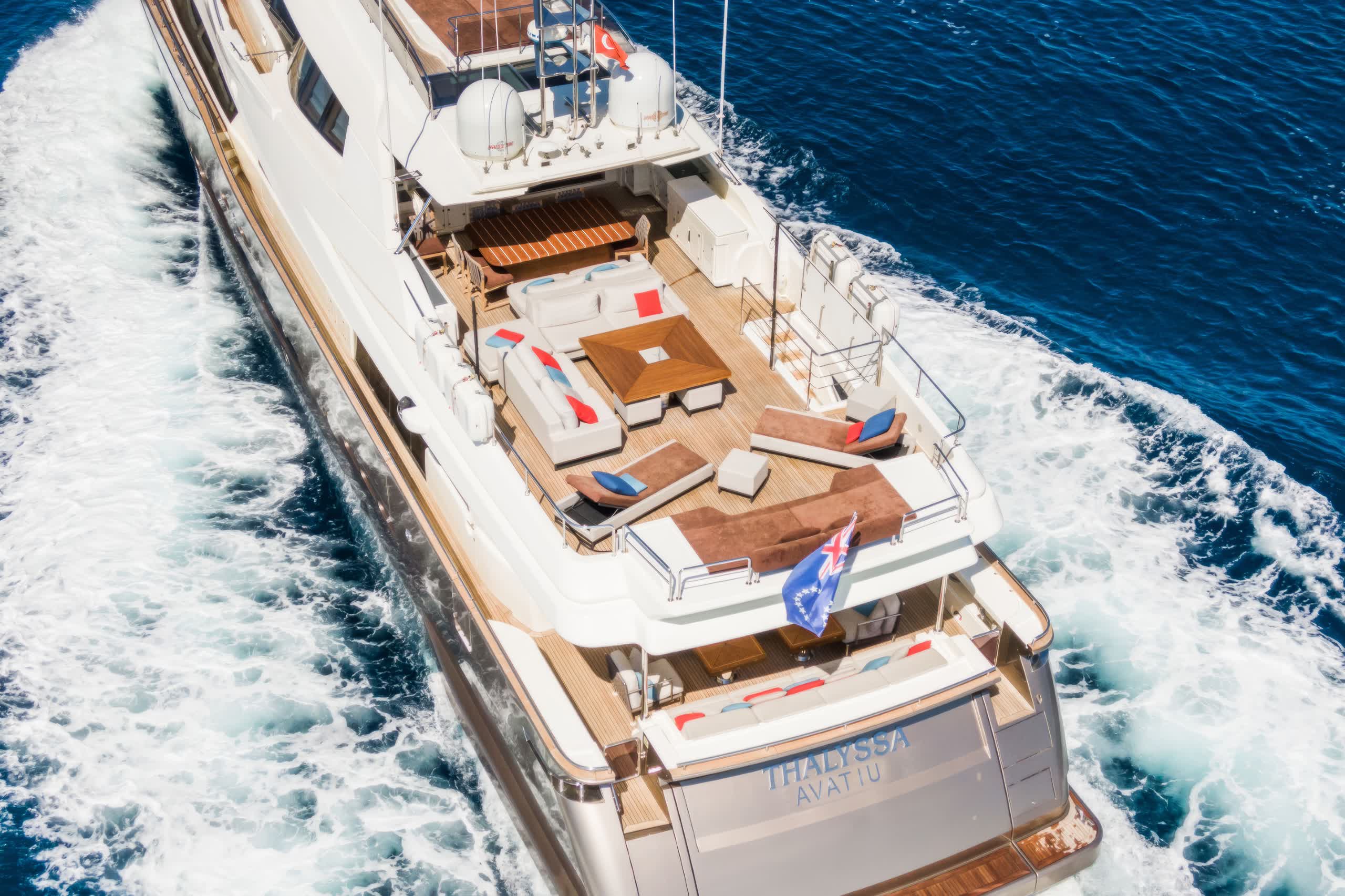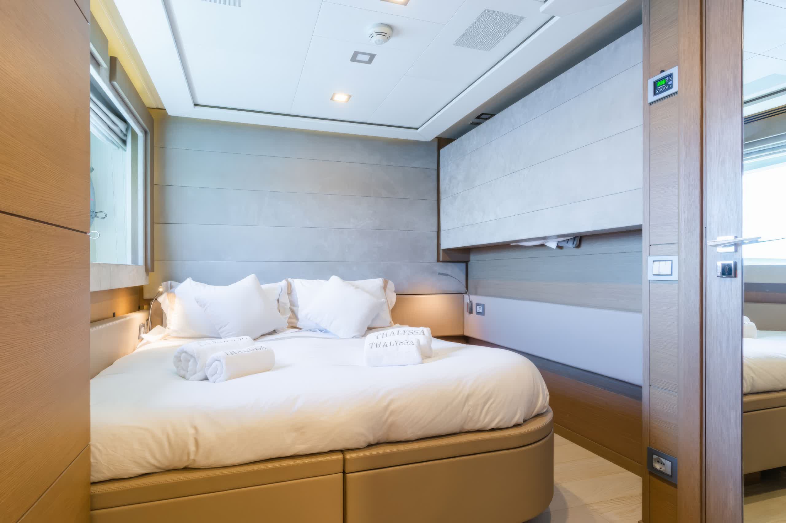 Thylassa is a 37 meter motor yacht that was built in 2012. She sleeps a maximum of twelve guests in five cabins: a master suite, two VIP cabins and two twin cabins. The layout of Thylassa's interior offers both comfort and sophistication. The large salon is perfect for socializing, with plenty of room to stretch out on comfy couches and watch TV. A formal dining area adjacent to the salon offers an elegant venue for meals prepared by the onboard chef. This attention to detail flows throughout the yacht as a variety of high-end materials and finishes are used to create uma of guest-friendly ambience.