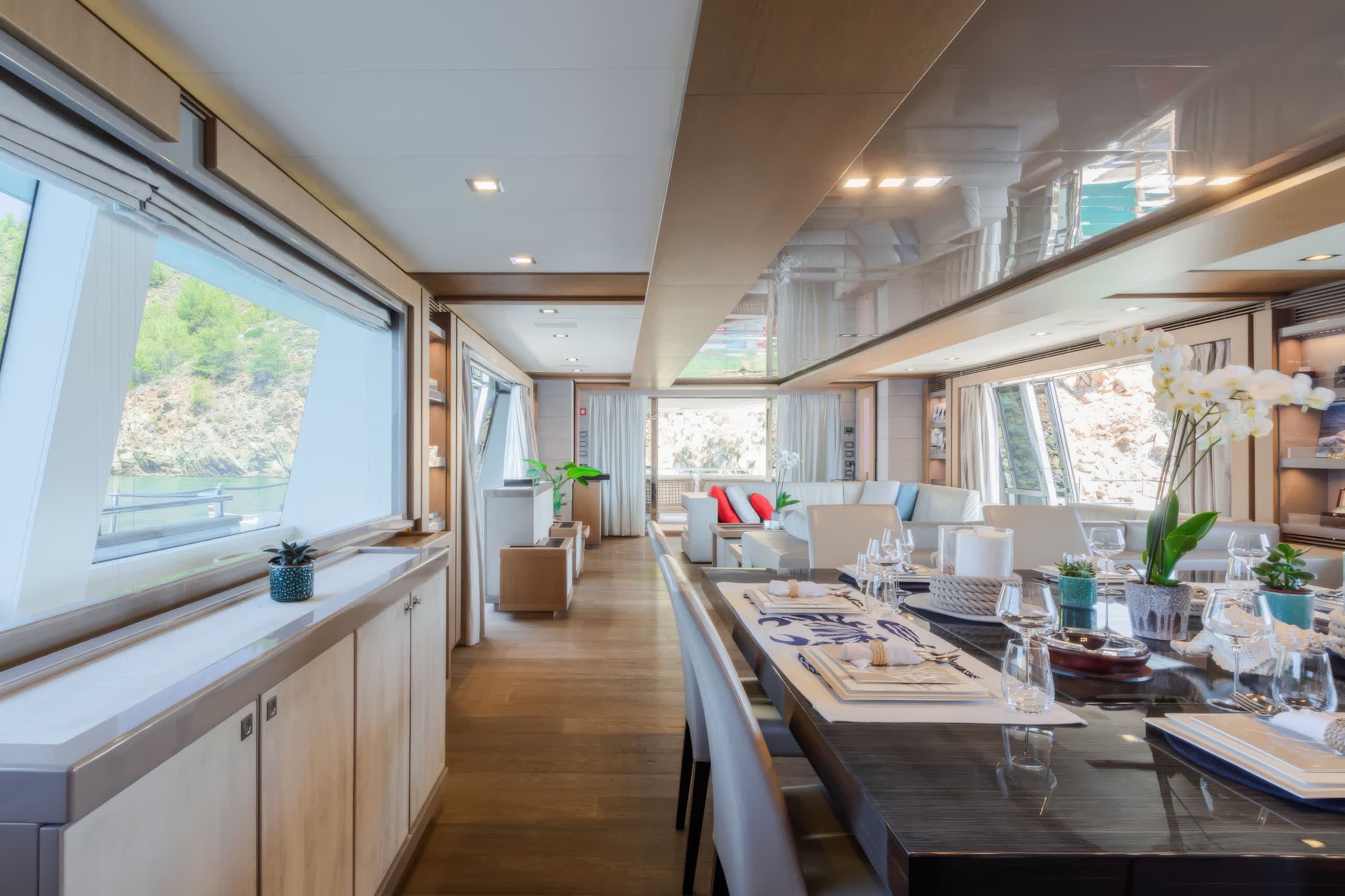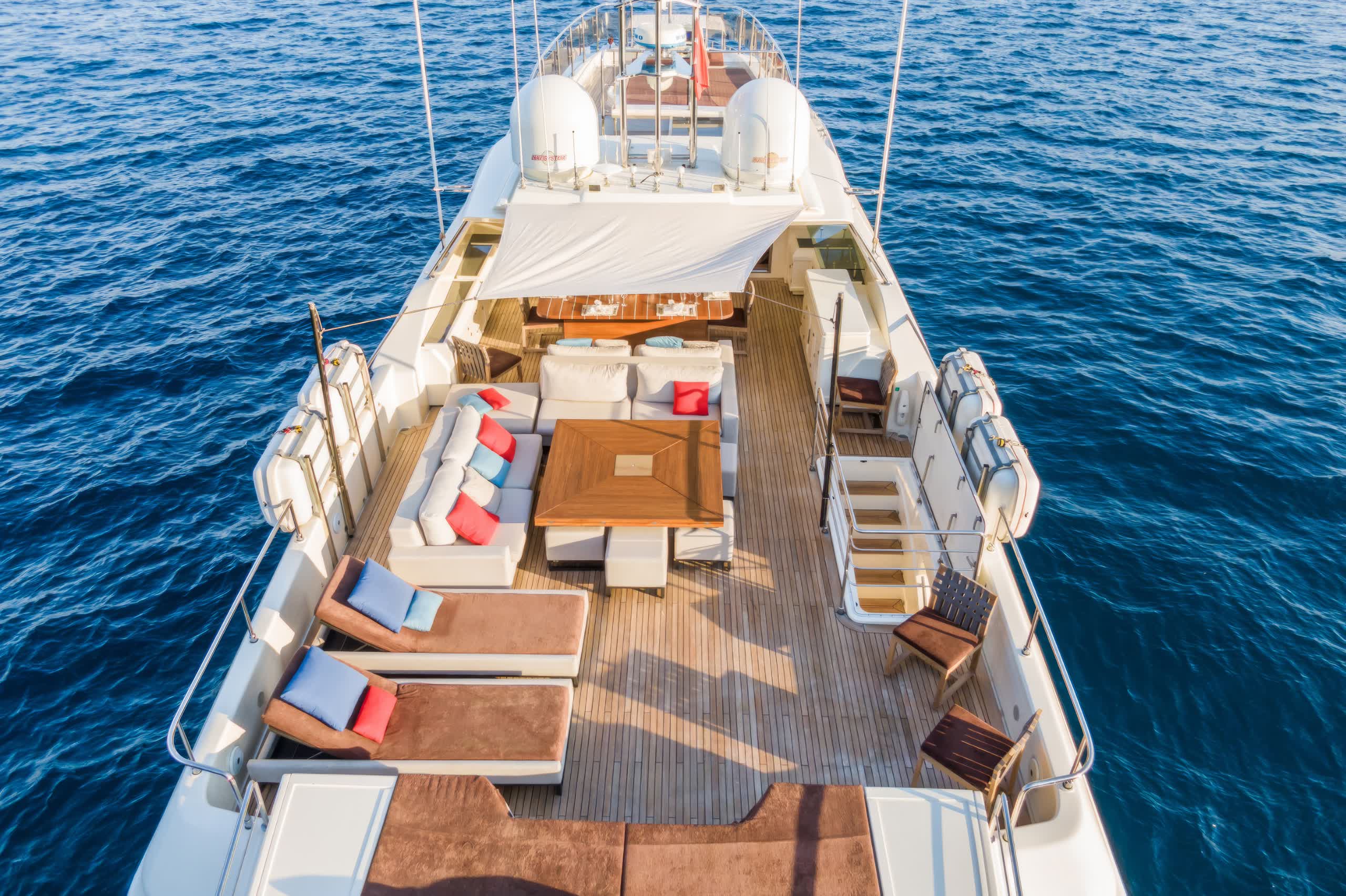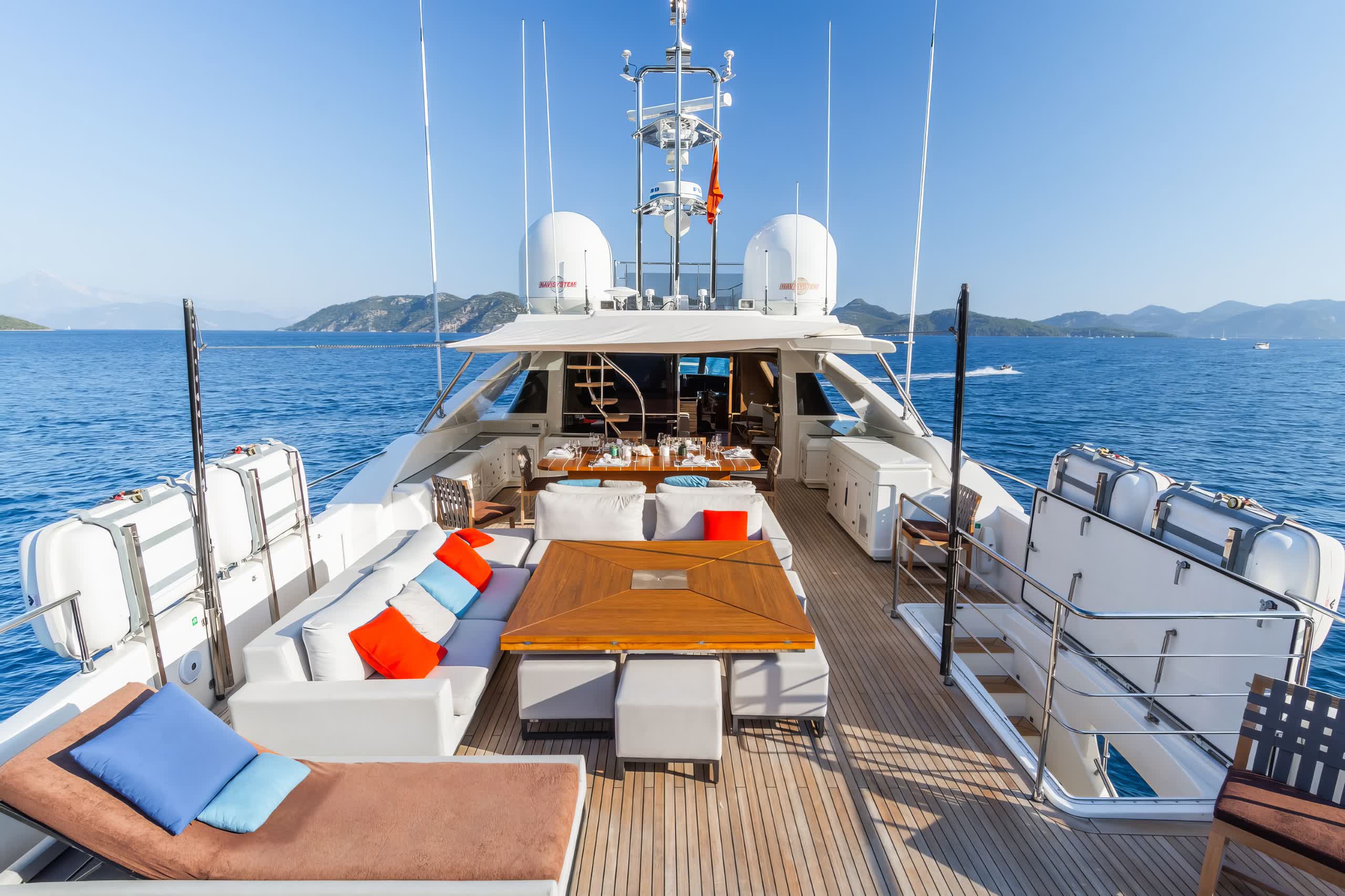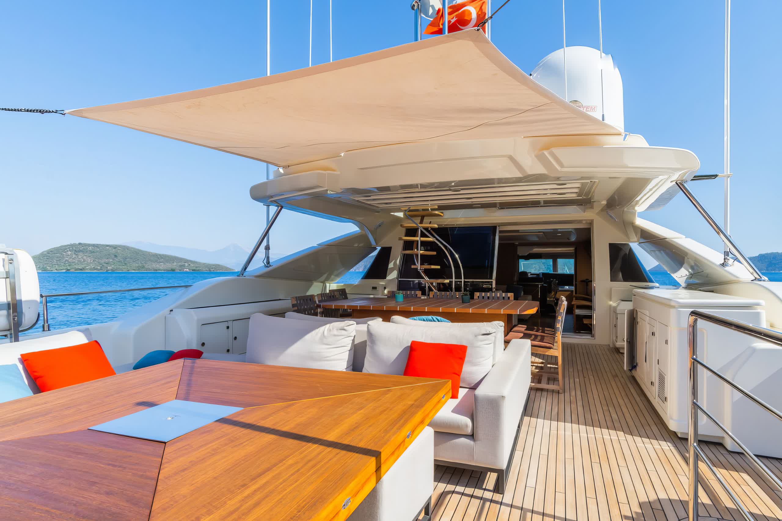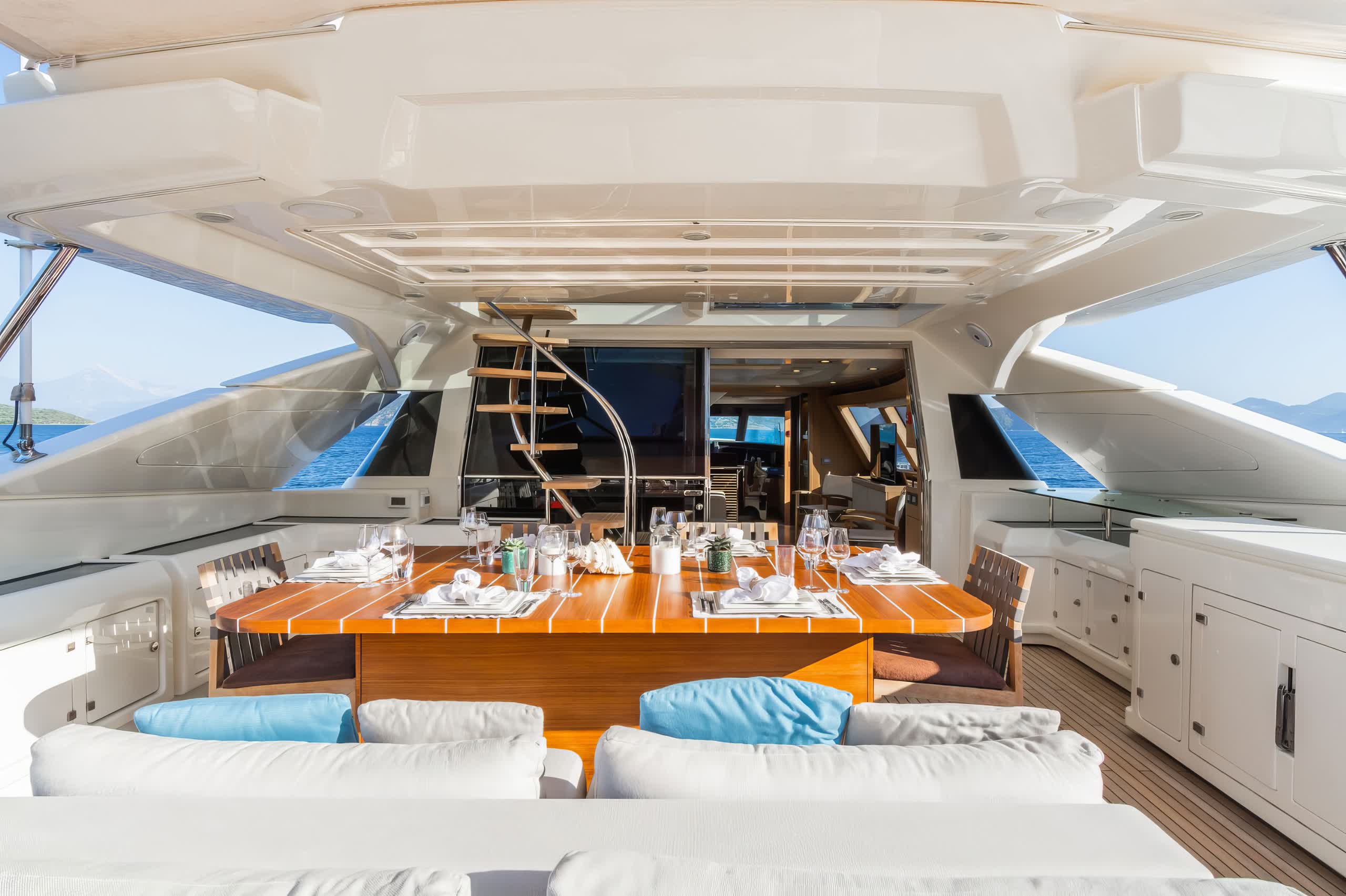 The outdoor spaces on Thylassa are just as impressive. The aft deck has a large table for alfresco dining, enabling the owners to dine in the open air. The yacht's design features a 1.5-meter (4-foot 11-inch) draft, allowing access to shallow bays and coves, and broadening cruising potential. Air conditioning is on board to keep guests comfortable during the charter. Her GRP hull and superstructure make her incredibly speedy and efficient. She has a cruising speed of 19 knots and top speed of 24 knots. Her design allows access to shallow areas, making her suitable for exploration of as wide a range of coastal areas as possible.